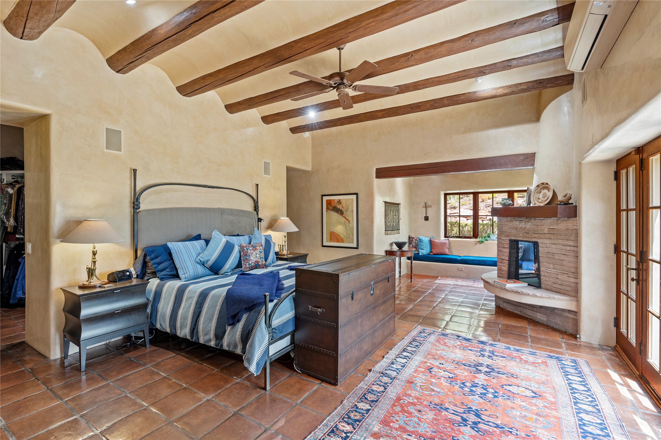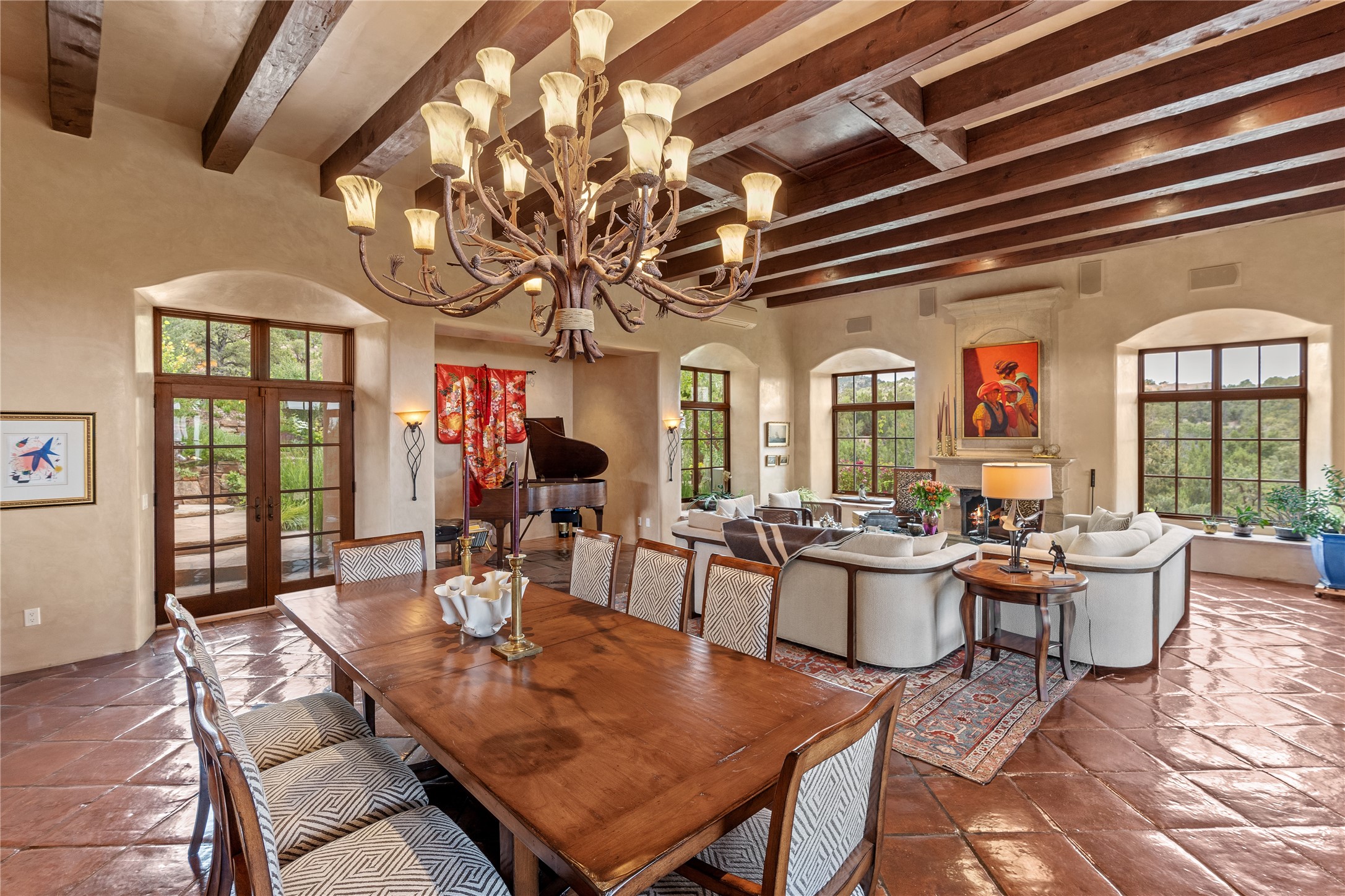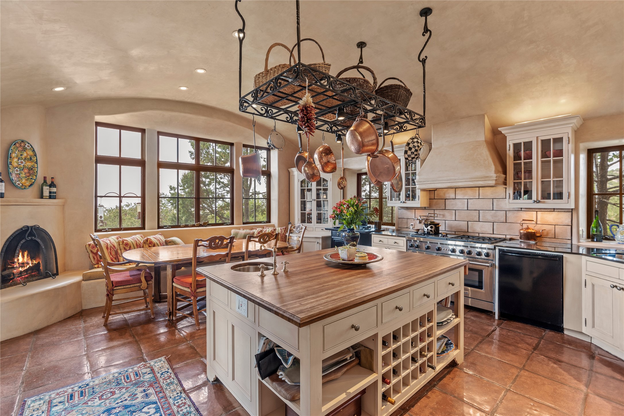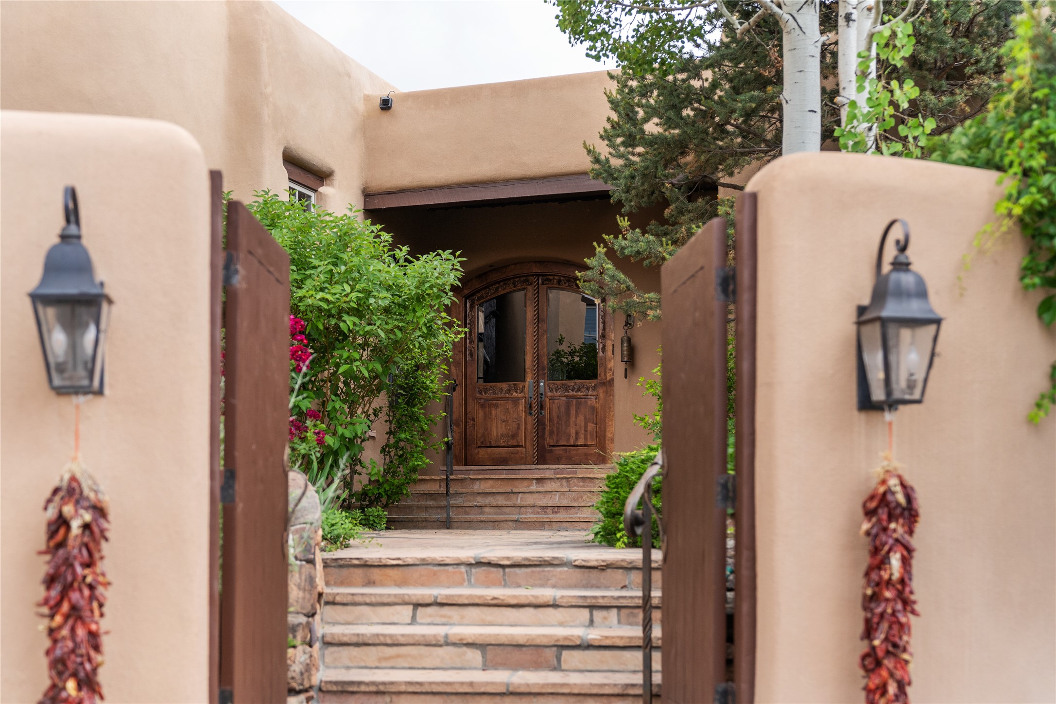 Welcome to a stunning Tesuque area compound in the prestigious gated Los Caminitos subdivision. On over 5 acres with a private well, fantastic Jemez and sunset views from main house built by Sharon Woods in 95'. The kitchen is stunning with doors to the portal with outdoor fireplace. Elegant living/dinning room surrounded on three sides by windows with upper end metal shades. Primary bedroom includes fireplace and access to rear patio. Two guest bedrooms have their own private deck with views of the Sangres. 3 car garage. Separate guest house with bath, as well as a large studio apartment and spacious studio with large north windows and new modern bathroom. Several owner upgrades including new entrance gate and septic field, new drip irrigation and pantry. Community pool and racquet courts. Lavender, roses, aspens, lilacs crab apple and peonies. 15 minutes from the plaza, adjacent to the Four Seasons resort, close to Tesuque Village Market and the world renowned Santa Fe Opera. If privacy, security and the New Mexico landscape is what you are looking for, come see.
