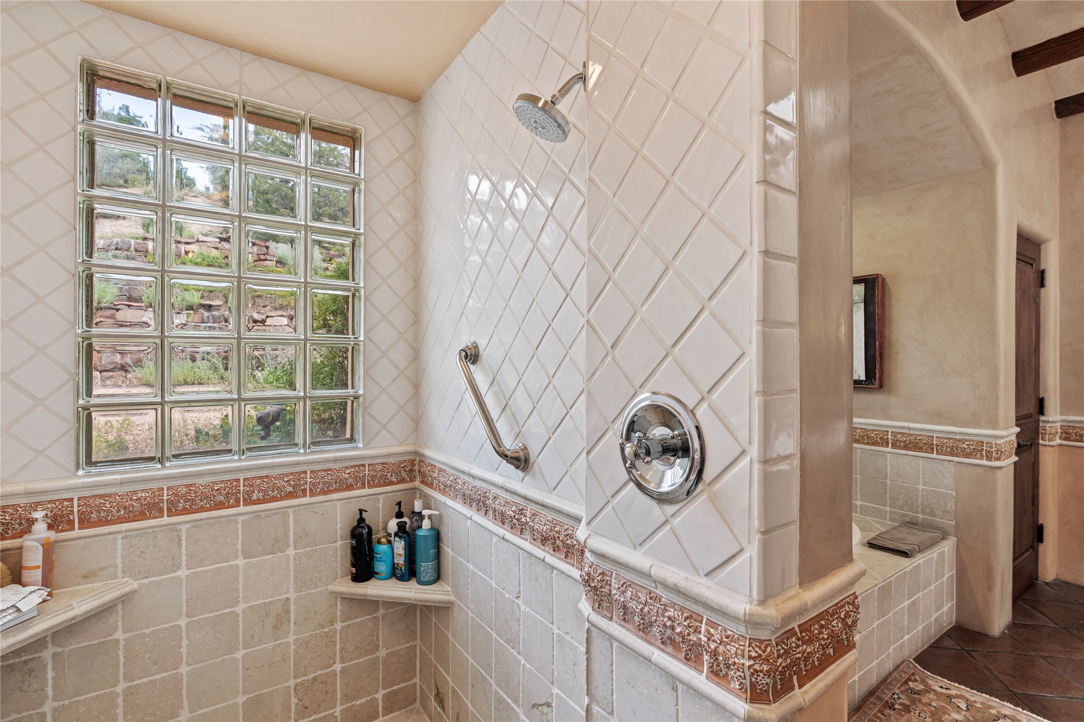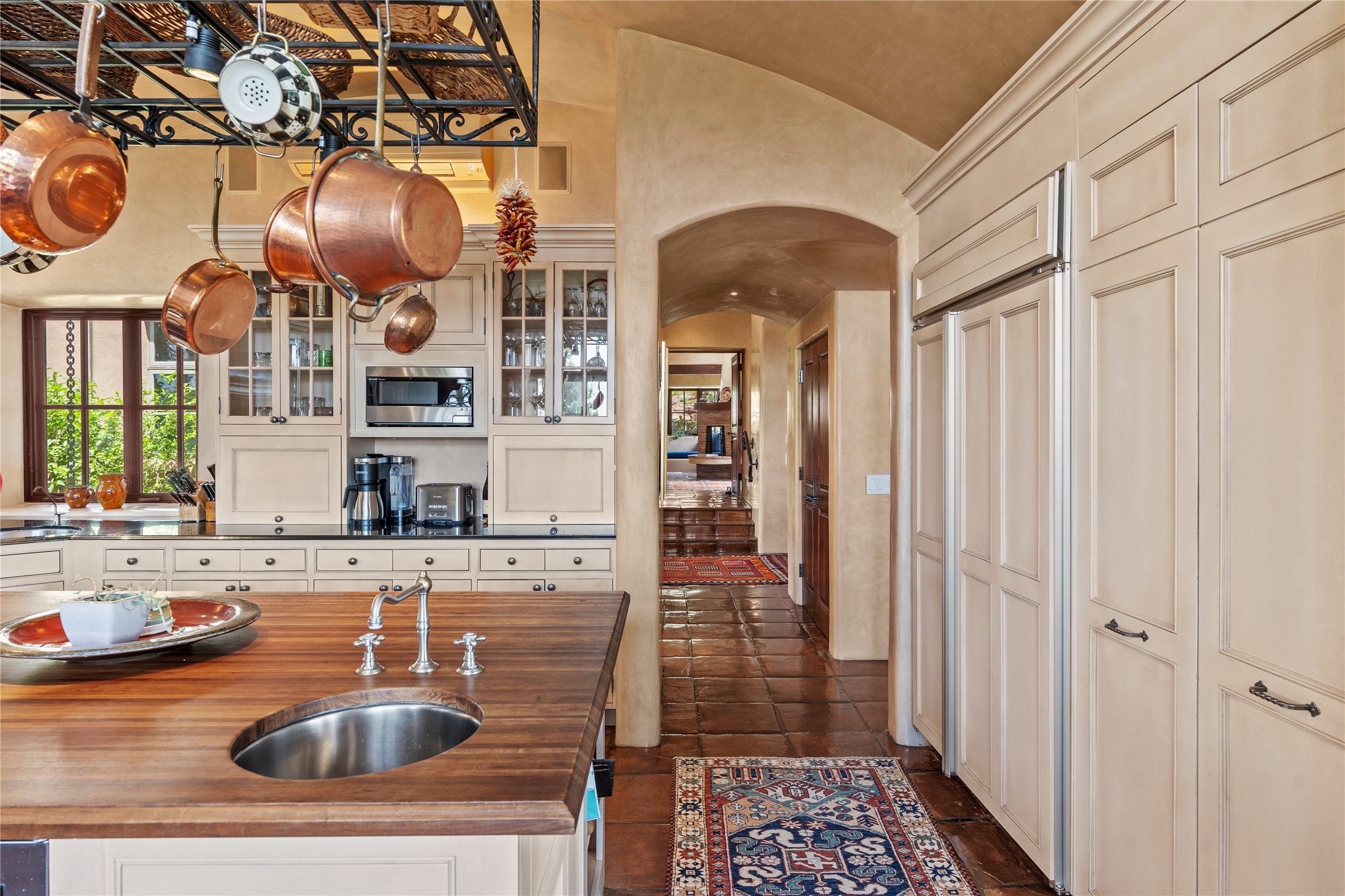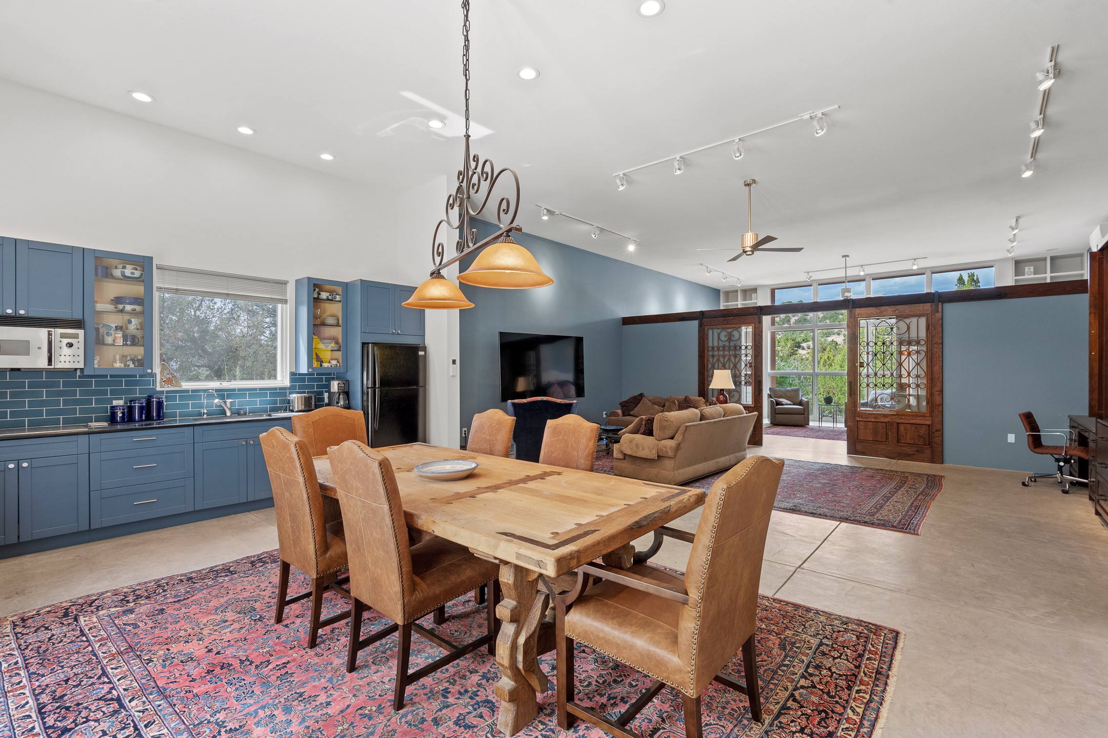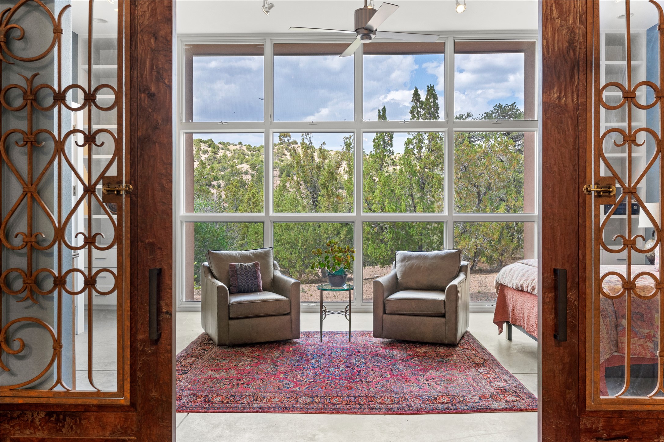 Welcome to a stunning Tesuque area compound in the prestigious gated Los Caminitos subdivision. On over 5 acres with a private well, fantastic Jemez and sunset views from main house built by Sharon Woods in 95'. The kitchen is stunning with doors to the portal with outdoor fireplace. Elegant living/dinning room surrounded on three sides by windows with upper end metal shades. Primary bedroom includes fireplace and access to rear patio. Two guest bedrooms have their own private deck with views of the Sangres. 3 car garage. Separate guest house with bath, as well as a large studio apartment and spacious studio with large north windows and new modern bathroom. Several owner upgrades including new entrance gate and septic field, new drip irrigation and pantry. Community pool and racquet courts. Lavender, roses, aspens, lilacs crab apple and peonies. 15 minutes from the plaza, adjacent to the Four Seasons resort, close to Tesuque Village Market and the world renowned Santa Fe Opera. If privacy, security and the New Mexico landscape is what you are looking for, come see.