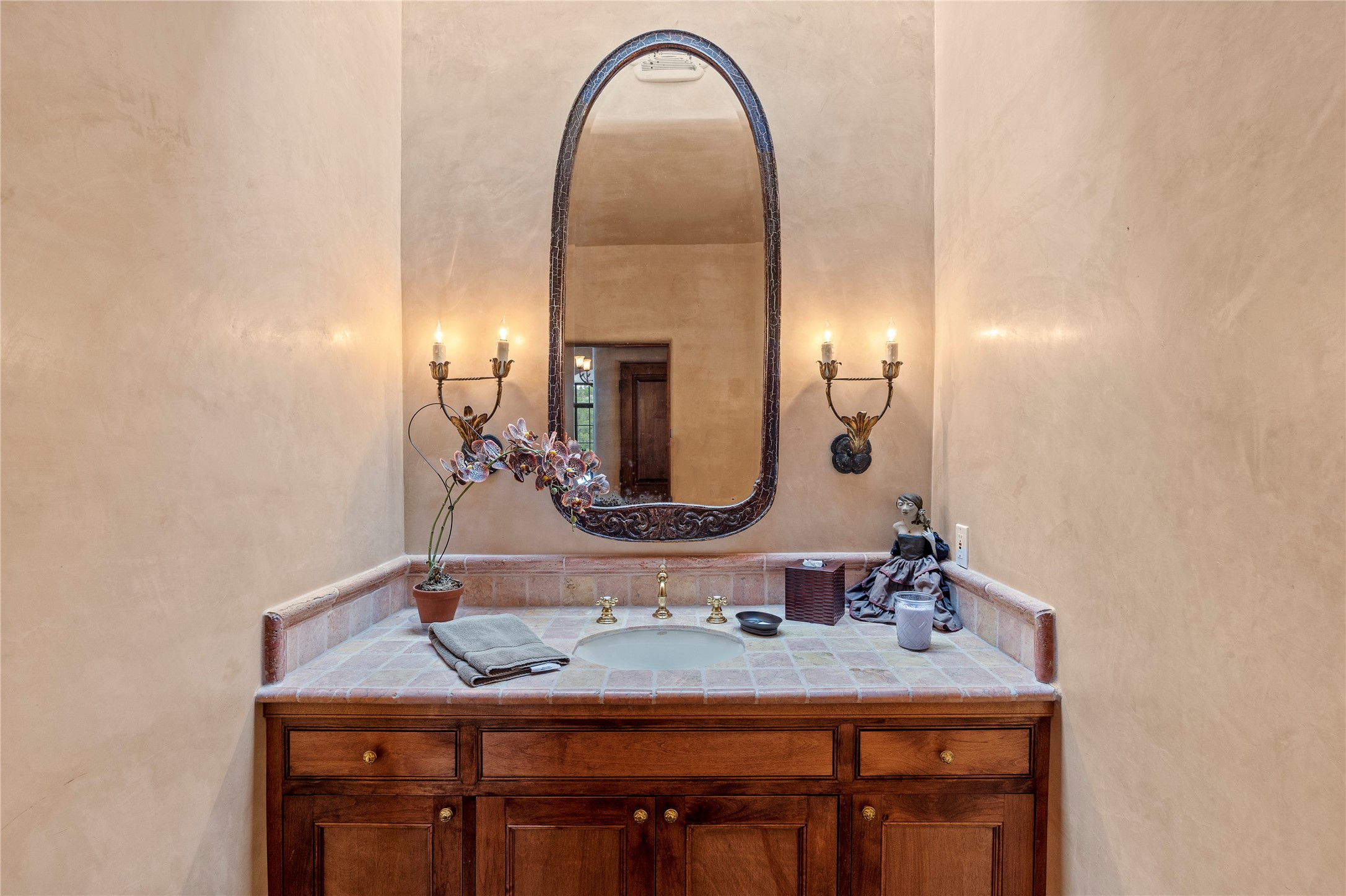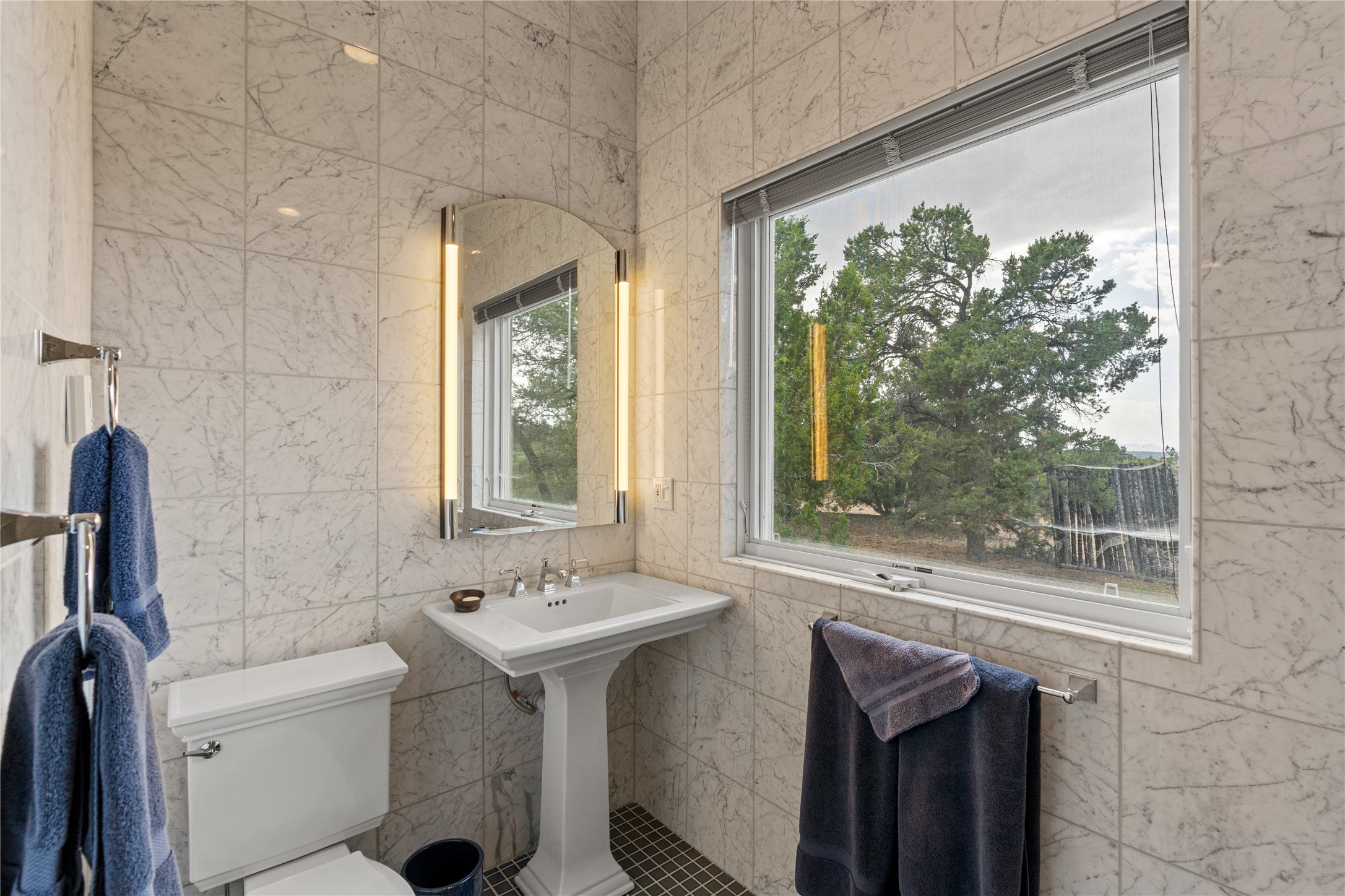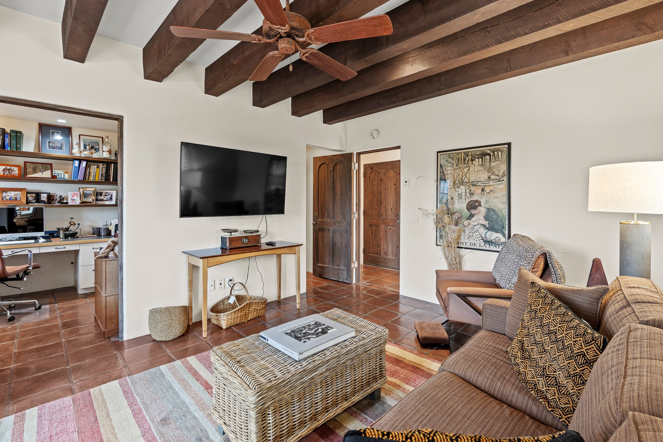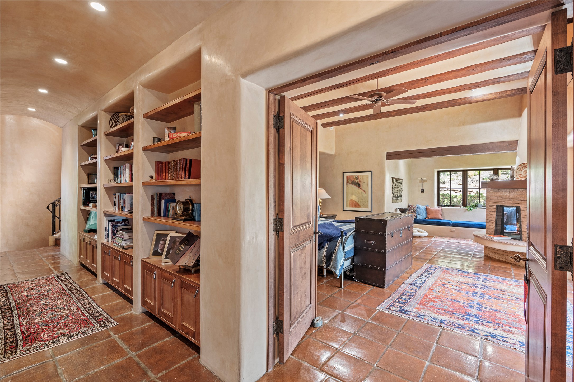Welcome to a stunning Tesuque area compound in the prestigious gated Los Caminitos subdivision. On over 5 acres with a private well, fantastic Jemez and sunset views from main house built by Sharon Woods in 95'. The kitchen is stunning with doors to the portal with outdoor fireplace. Elegant living/dinning room surrounded on three sides by windows with upper end metal shades. Primary bedroom includes fireplace and access to rear patio. Two guest bedrooms have their own private deck with views of the Sangres. 3 car garage. Separate guest house with bath, as well as a large studio apartment and spacious studio with large north windows and new modern bathroom. Several owner upgrades including new entrance gate and septic field, new drip irrigation and pantry. Community pool and racquet courts. Lavender, roses, aspens, lilacs crab apple and peonies. 15 minutes from the plaza, adjacent to the Four Seasons resort, close to Tesuque Village Market and the world renowned Santa Fe Opera. If privacy, security and the New Mexico landscape is what you are looking for, come see.