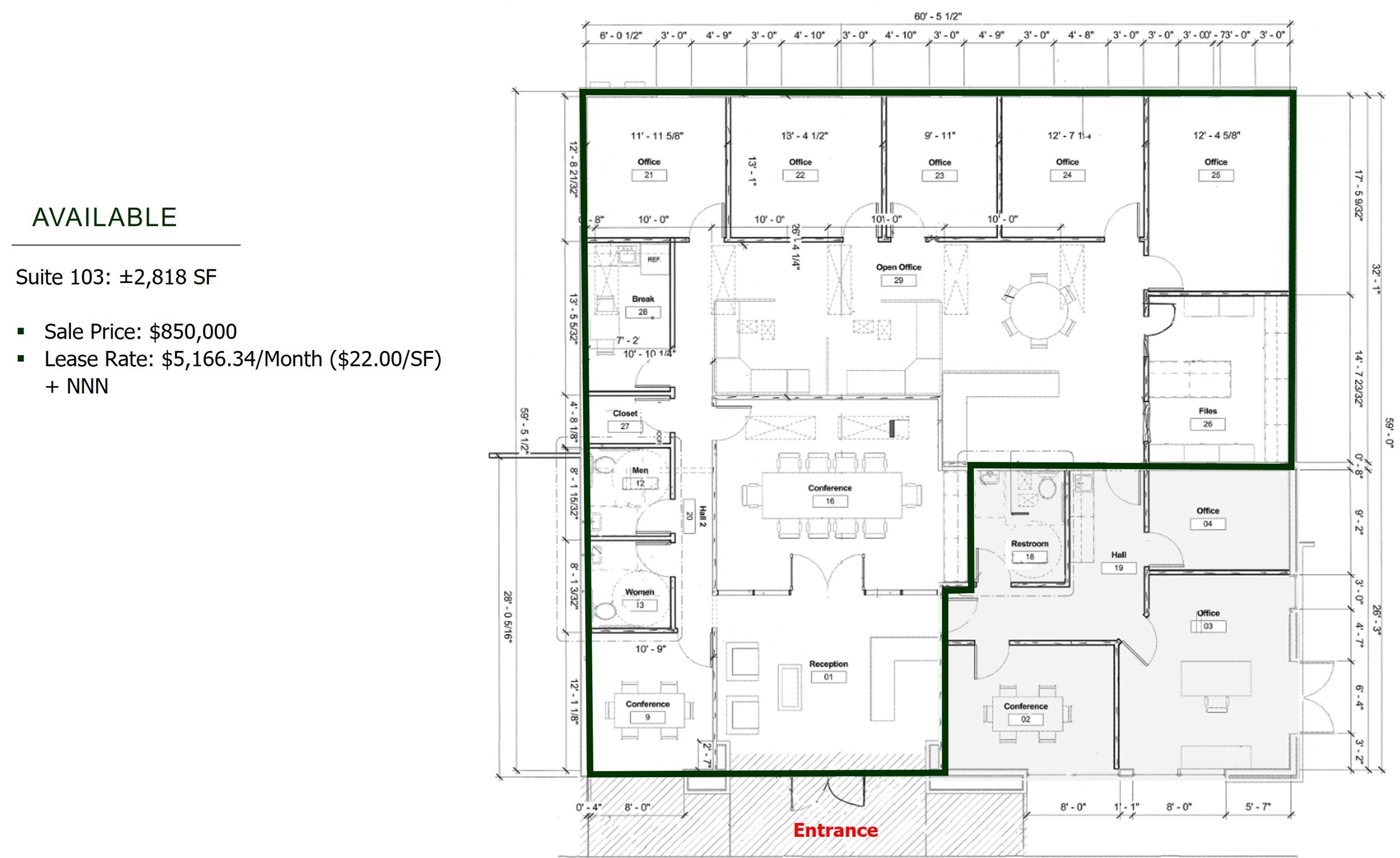 AVAILABLE: Suite 103: 2,818 SF | SALE PRICE: $850,000 | LEASE RATE: $5,166.34/Month ($22.00/SF) + NNN | ZONING: C-1 | Office & Related Commercial | HIGHLIGHTS: Located at 810 Plaza in the north side of Santa Fe - Close to Downtown & DeVargas Center, High quality finishes - Class A Office, High-speed internet capacity, Adequate parking (first come, first serve), Monument signage available, Sound-proof individual offices, Neighboring tenants include Edward Jones, Zia Insurance, Insurance del Norte, LAI Professional Insurance Programs, Shunay Skin
