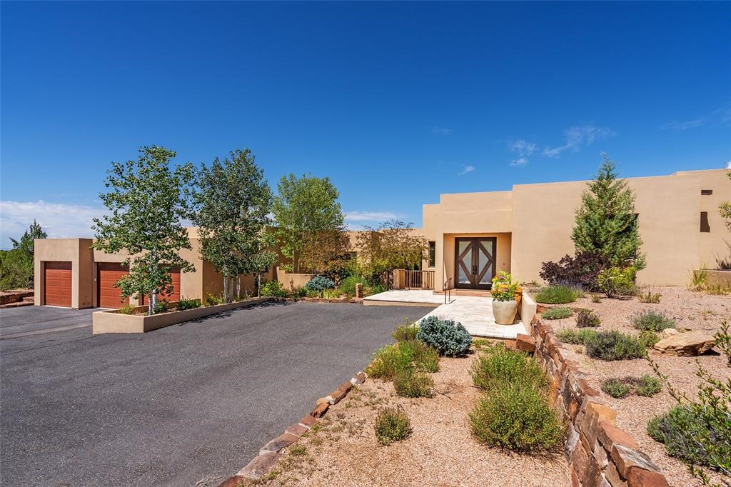 THIS STUNNING SANTA FE STYLE LAS CAMPANAS RESIDENCE CAPTURES SWEEPING WESTERN VIEWS OF THE JEMEZ MOUNTAINS AND SUNSET GOLF COURSE. The home's rich topography is felt throughout, blending beautifully with natural flagstone floors, stacked stone fireplaces, wooden beams, smooth plaster walls, and deep covered portals that epitomize indoor-outdoor New Mexico living and allows you to relax into the dazzling landscape. Designed with clean lines for privacy and flow, the thoughtfully tiered floor plan offers a well-separated two-suite guest wing - complete with art hanging system and laundry - opposite the luxurious primary suite. The heart of the home lies in the expansive living spaces and several large portals, perfect for entertaining or quiet reflection, all while enjoying framed views of nature and sky. Ascend past the office to the serene primary suite featuring its own fireplace, private patio with hot tub access, elegant built-ins, large walk-in closet, plenty of storage, and a spa-like bath with deep soaking tub and grand shower. The kitchen is warm, functional, and beautifully integrated within the undulating colorful mountain views. Here you will find a cook's kitchen with Viking appliances, a Wolf induction cooktop, informal gathering space, a walk-in pantry, and seamless access to both front and rear portals. A separate foyer with a wine fridge, powder room, and a flexible office or reading room adds thoughtful utility and charm. Outdoors, the portals extend the living experience with a kitchen, tranquil gardens, water features, even more storage, and complete privacy. Timeless Santa Fe design, executed to perfection.