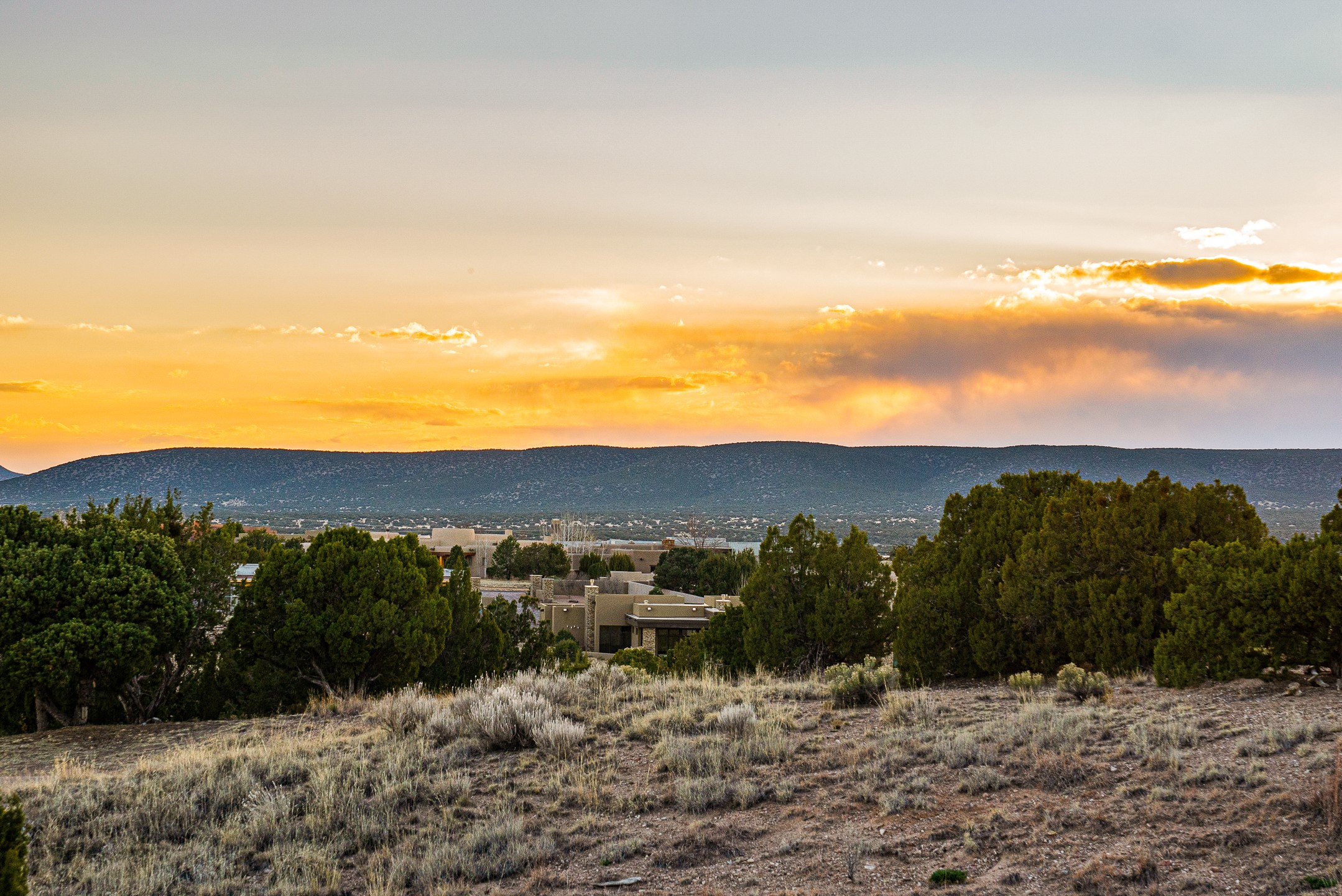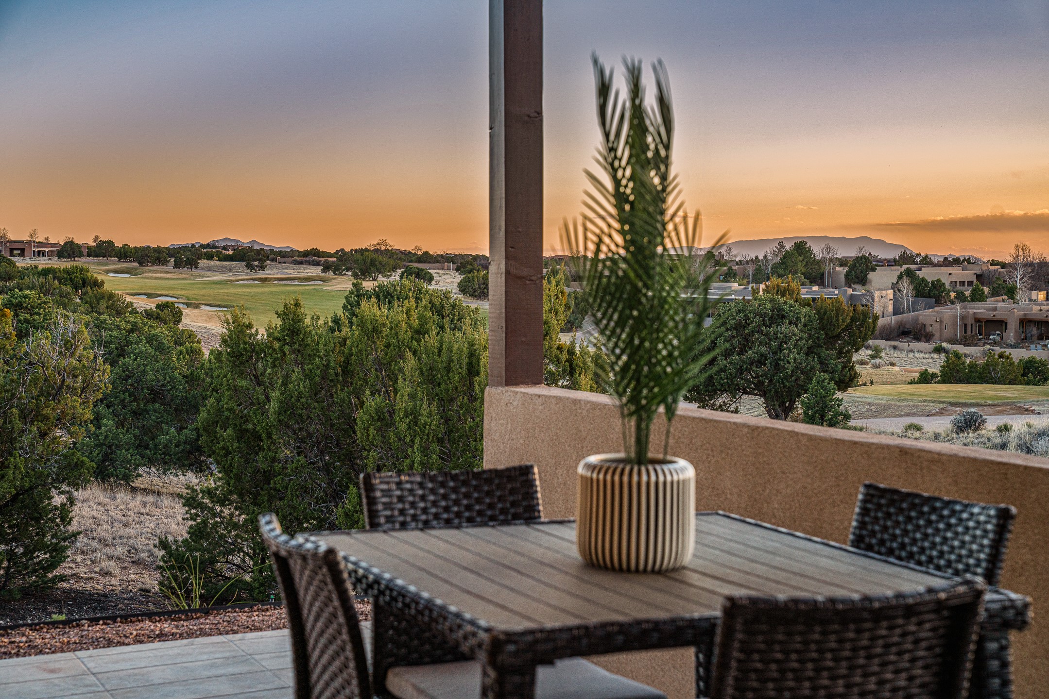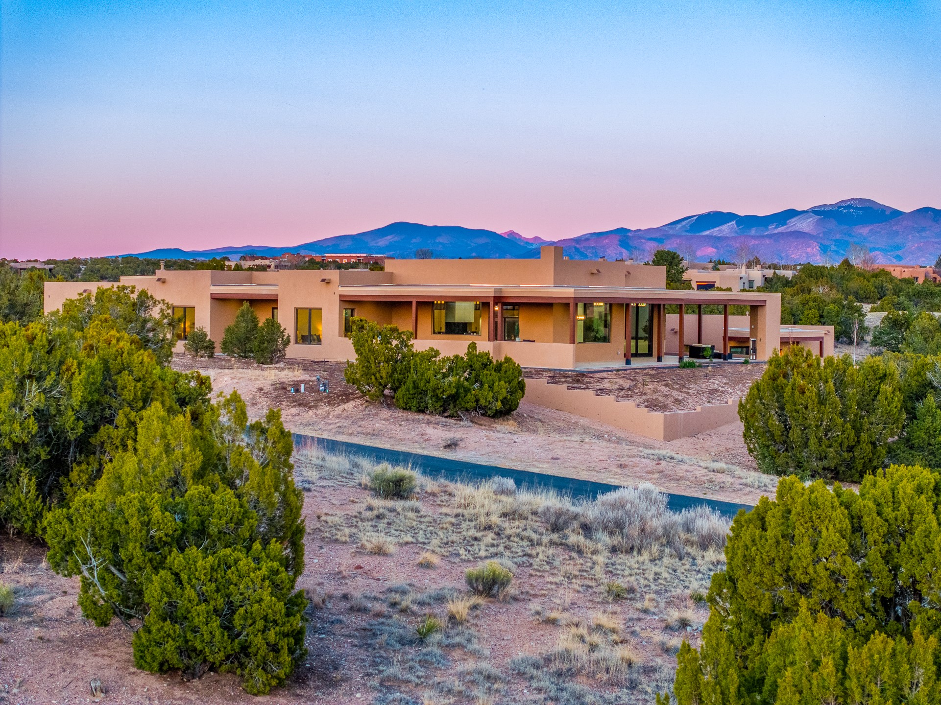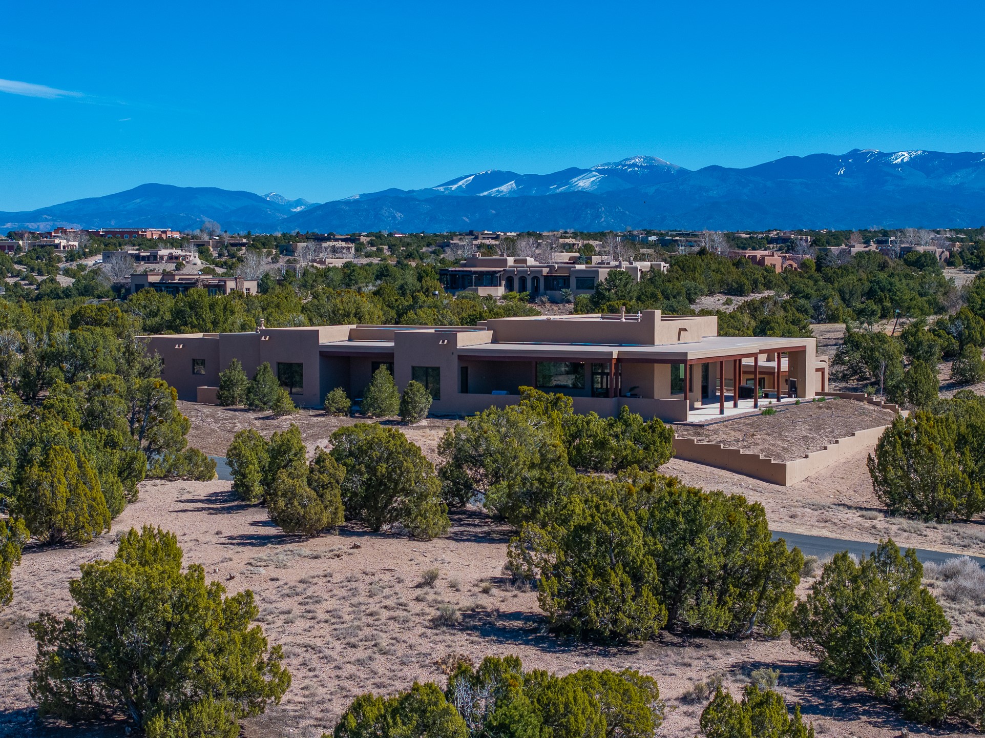 Defining Santa Fe luxury, this brand-new custom estate by renowned Candelaria Homes is ideally positioned on 1.64 acres within the prestigious Las Campanas community, commanding sweeping views of the 14th and 15th golf holes, championship fairways, and the Sangre de Cristo and Sandia Mountains. Showcasing a sophisticated blend of contemporary architecture and classic New Mexican design, this single-level residence offers effortless elegance and exceptional livability. The open-concept great room is designed for both grand entertaining and everyday comfort, with radiant heated floors extending through the main living areas. The gourmet kitchen features rich dark cabinetry, a striking center island, integrated high-end appliances, and an oversized butler's pantry. A detached one-bedroom casita offers luxurious guest accommodations or studio potential, while a flexible bonus room can serve as a media room, library, office, or guest retreat.Floor-to-ceiling picture windows capture Santa Fe's celebrated light and frame the dramatic desert landscape. Outdoor living is equally impressive, with an expansive portal featuring an above-ground spa, gas fireplace, and built-in grill.Membership at The Club at Las Campanas is available separately. An extraordinary Las Campanas offering that embodies refined desert living at its finest.