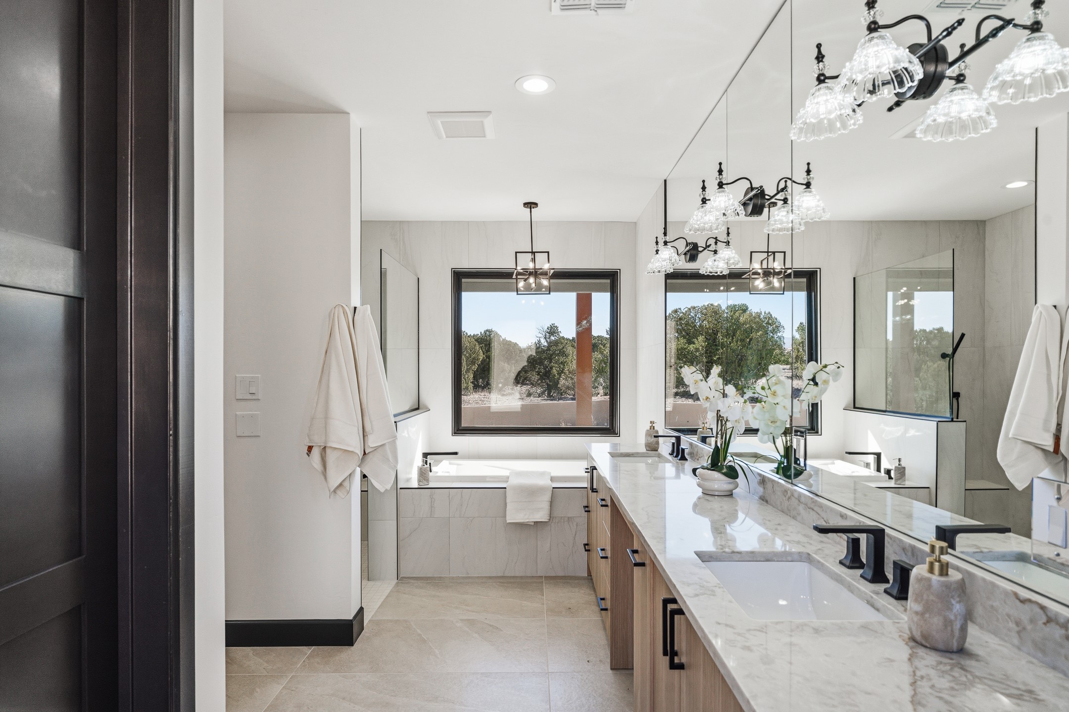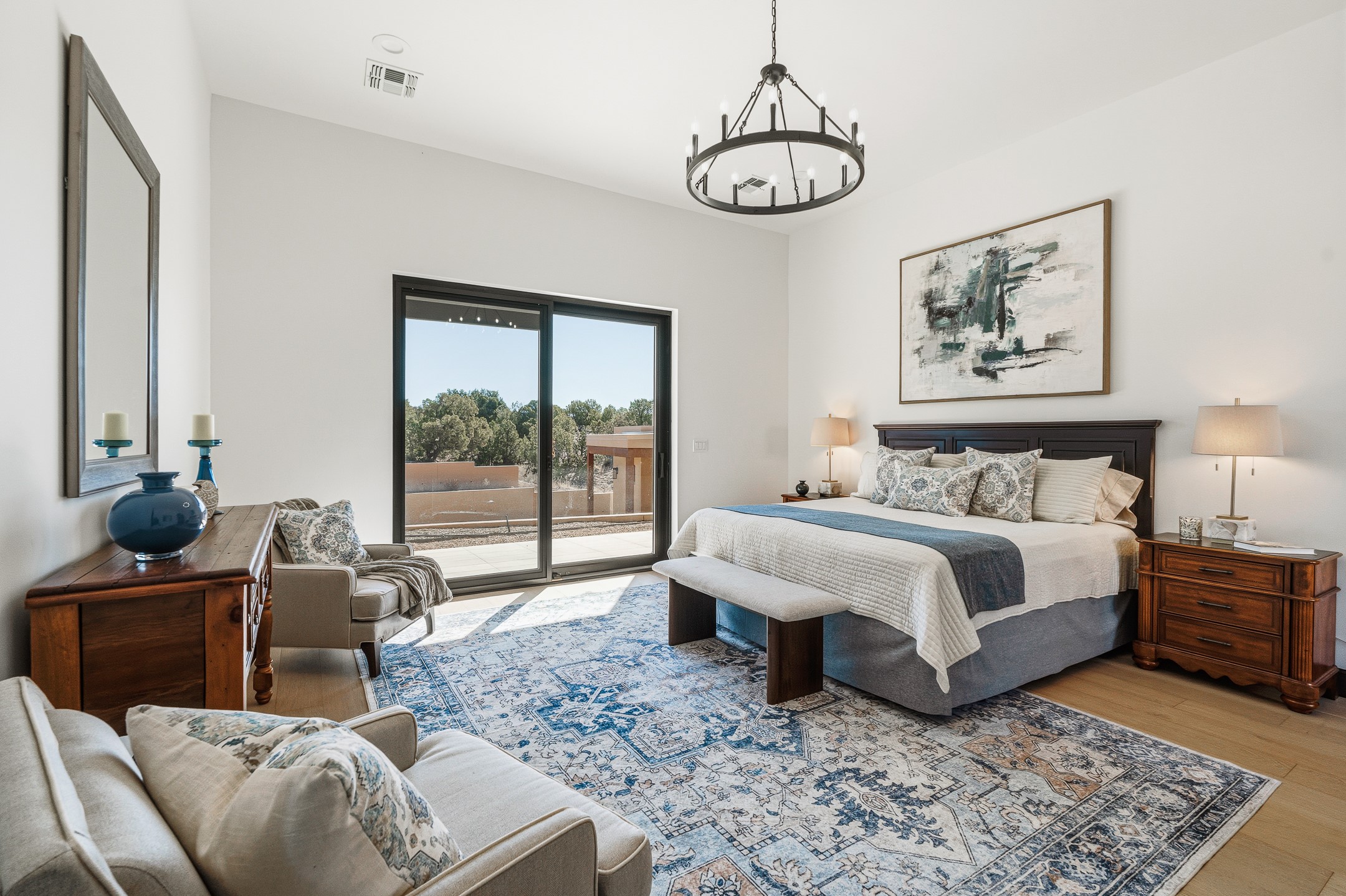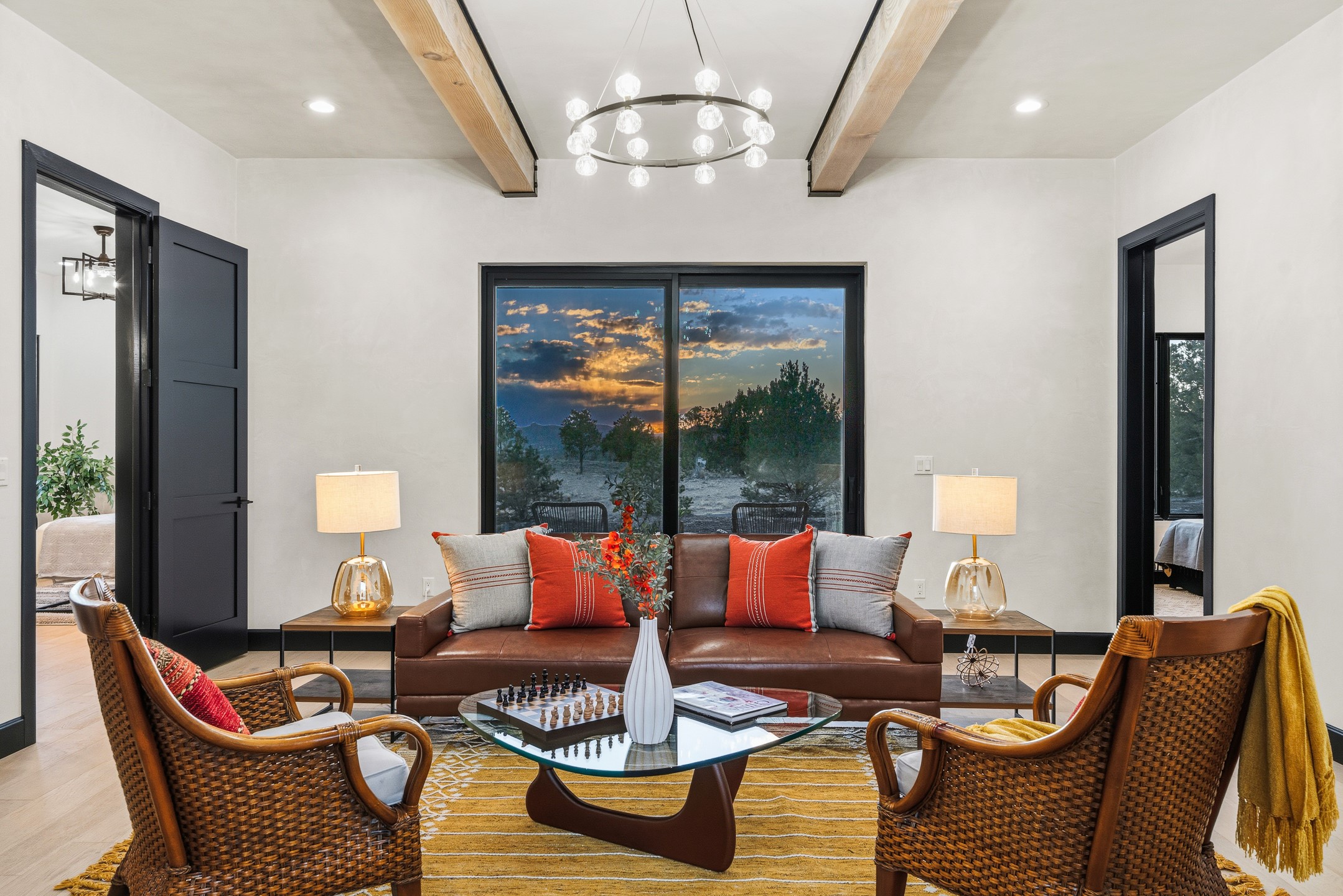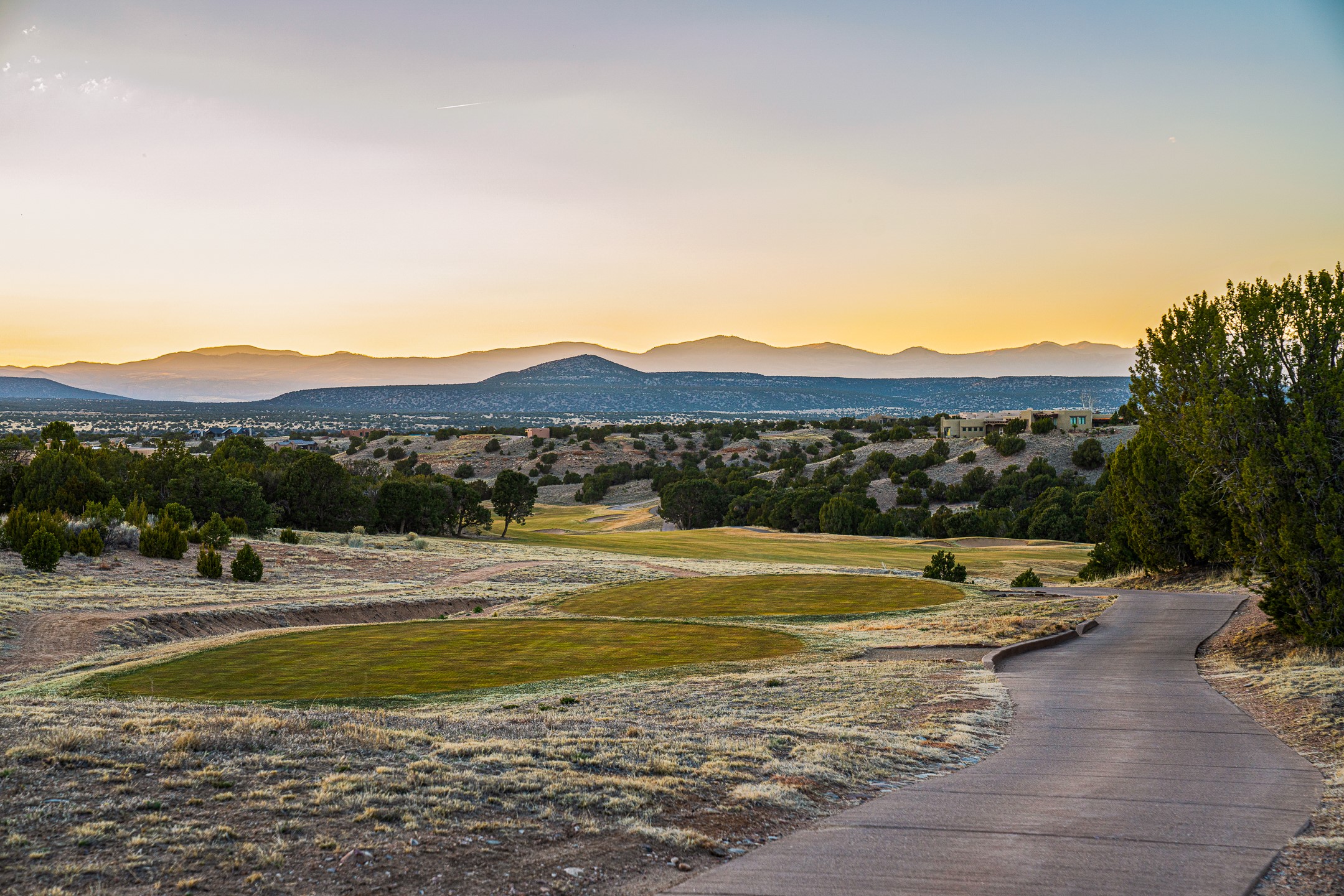 Defining Santa Fe luxury, this brand-new custom estate by renowned Candelaria Homes is ideally positioned on 1.64 acres within the prestigious Las Campanas community, commanding sweeping views of the 14th and 15th golf holes, championship fairways, and the Sangre de Cristo and Sandia Mountains. Showcasing a sophisticated blend of contemporary architecture and classic New Mexican design, this single-level residence offers effortless elegance and exceptional livability. The open-concept great room is designed for both grand entertaining and everyday comfort, with radiant heated floors extending through the main living areas. The gourmet kitchen features rich dark cabinetry, a striking center island, integrated high-end appliances, and an oversized butler's pantry. A detached one-bedroom casita offers luxurious guest accommodations or studio potential, while a flexible bonus room can serve as a media room, library, office, or guest retreat.Floor-to-ceiling picture windows capture Santa Fe's celebrated light and frame the dramatic desert landscape. Outdoor living is equally impressive, with an expansive portal featuring an above-ground spa, gas fireplace, and built-in grill.Membership at The Club at Las Campanas is available separately. An extraordinary Las Campanas offering that embodies refined desert living at its finest.