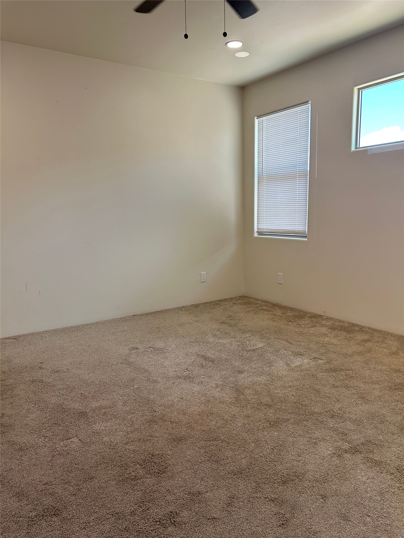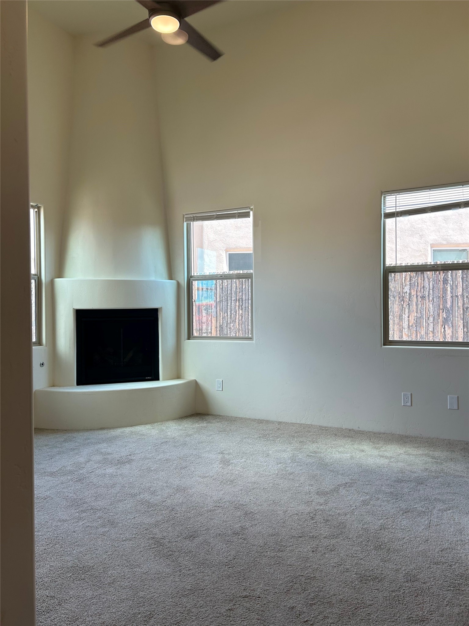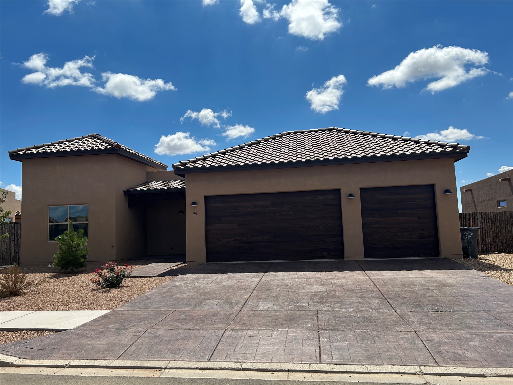 Located in the desirable La Pradera community and tucked away in the very back, this Santa Camila plan offers a seamless blend of comfort, style, and convenience. The pitched tile roof and stamped concrete driveway lead to a three-car garage, all framed by low-maintenance Santa Fe brown gravel landscaping.Step through the beautiful entry door into a foyer with a graceful barrel-vault ceiling. Just off the entry, a versatile room with 14-foot ceilings and a kiva-style fireplace serves perfectly as a home office or guest suite. On the opposite side, a powder room and spacious hall closet provide added functionality.The living area features wood beams and tongue-and-groove ceilings, opening to a covered portal with brick pavers--perfect for indoor-outdoor living. The adjacent kitchen includes double ovens, a walk-in pantry with skylight, and a utility room with a laundry sink and cabinetry.The owner's suite opens to the portal and includes a walk-in shower with rain head and handheld fixture, a soaking tub, and a spacious walk-in closet. The backyard is designed for easy enjoyment with zero-maintenance turf, a newer hot tub, and a dedicated dog run. A private gate leads directly to La Pradera's open space and miles of scenic trails--ideal for peaceful walks and stargazing.Commuting is easy with quick access to I-25 and Highway 599, and nearby dining favorites include local spots around the southside of Santa Fe.