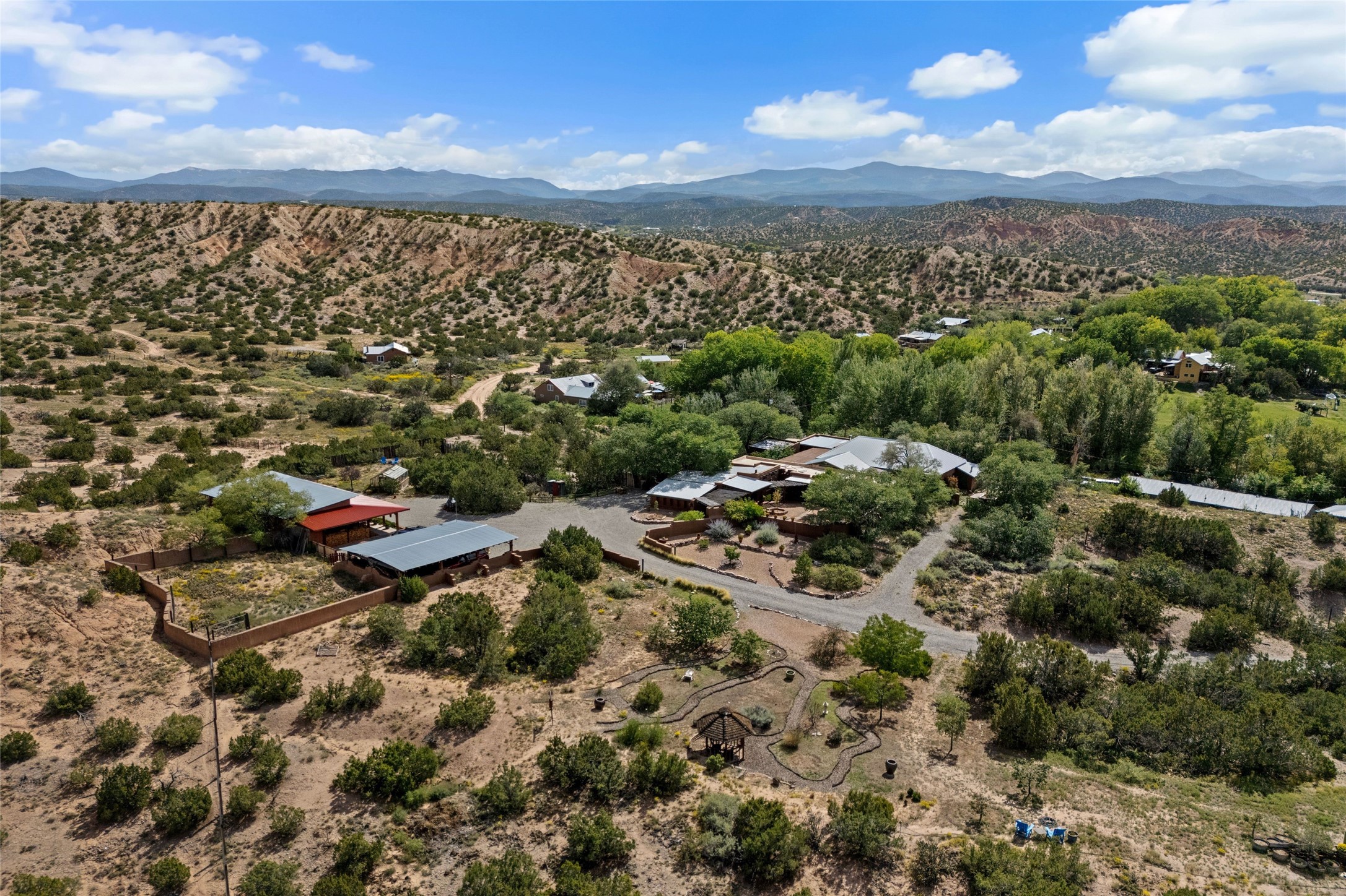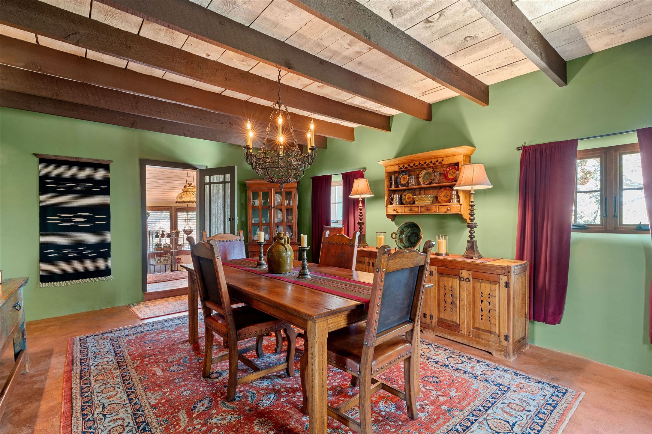 Rare opportunity to own your own private retreat and sanctuary on just under 7 acres in the historic village of Chimay. Nestled in the foothills of the Sangre de Cristo Mountains, within easy commuting distance to either Los Alamos or Santa Fe, this hilltop, gated hacienda is located on a tranquil tree-lined country road. The 3-bedroom, 2-bath property is surrounded by gardens, courtyards and a lovely orchard. Quality construction, utilities, and finishings throughout. Traditional Spanish and Pueblo design filled with vigas and beams, stone, tile and brick floors, 4 kiva fireplaces, nichos, bancos, and multiple portales. Two living areas provide room for both privacy and gatherings. Formal dining room for special occasion meals or cozy dinners at home. Chefs will enjoy the impressive kitchen with granite counters, wood and glass cabinets, and breakfast nook with banco. There is a studio/office with wine room in a detached building. Outdoor parties under the New Mexican sun and starlit nights? The extensive portal attached to the spacious shop building and adjacent firepit provide the perfect setting. Bonus features include a greenhouse for gardeners, carport, and new septic installed in 2025. Other features include combination subfloor and mini-split heating, top-quality Andersen windows throughout, Northern NM style peaked and silicon-sealed flat roofs, a community potable water system, and a brand new irrigation well. For those who are seeking a peaceful country home with authentic New Mexico character, this is a rare find. Chimay is a special place, known for the National Historic Landmark Santuario de Chimay, numerous weaving shops, and the famous Rancho de Chimay restaurant.