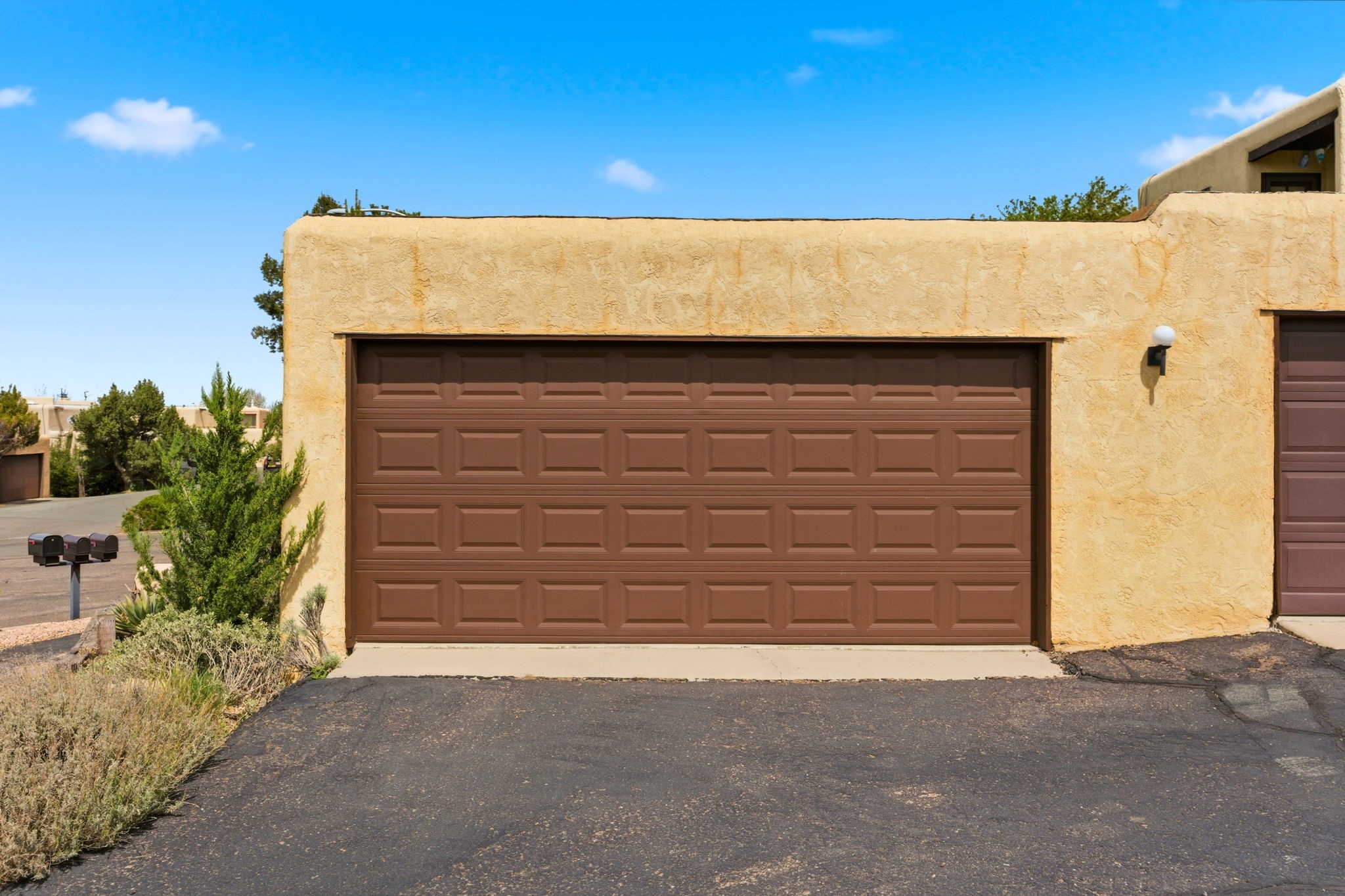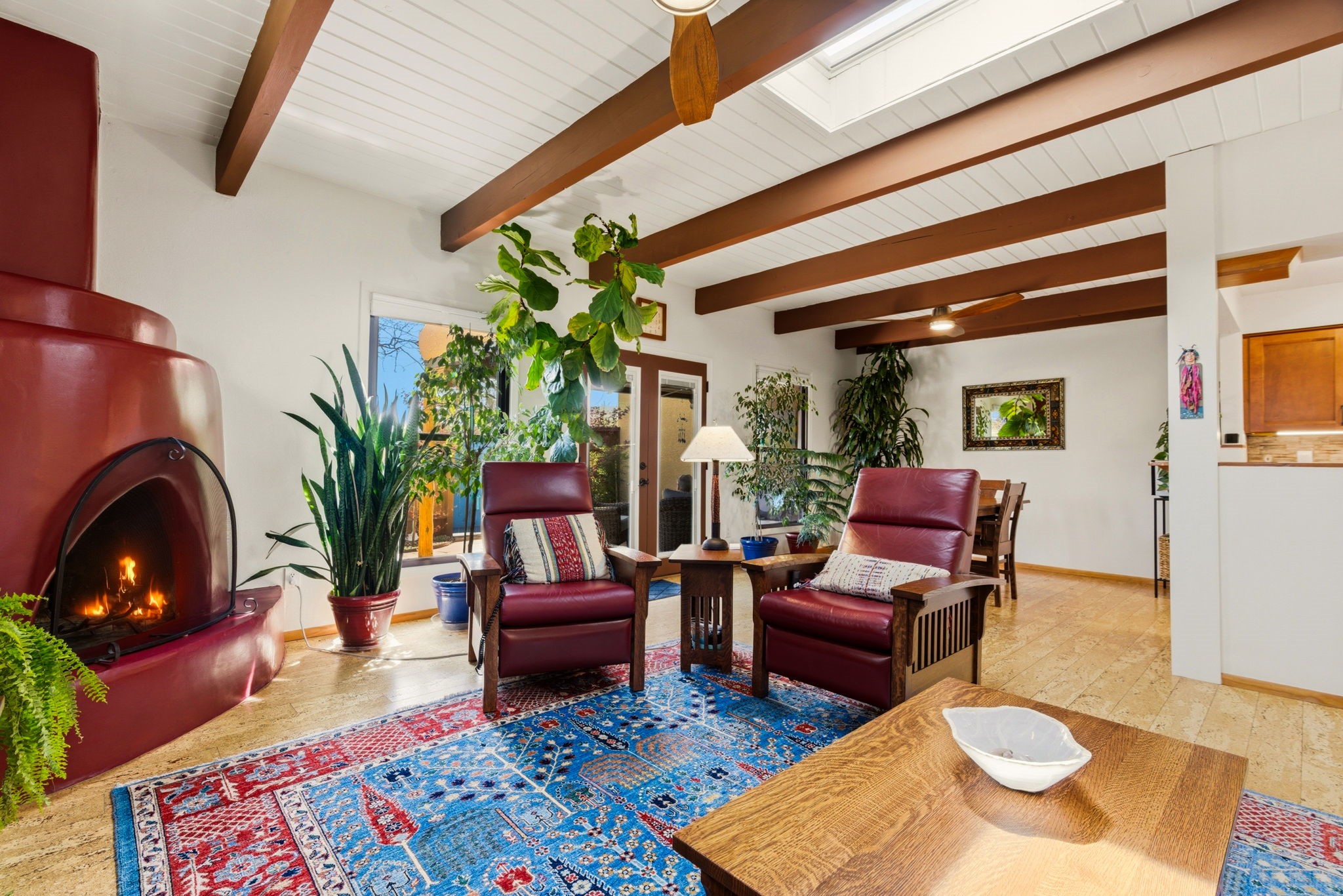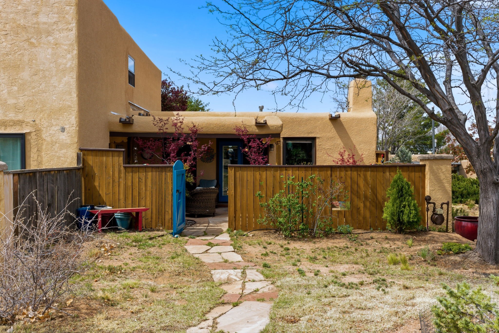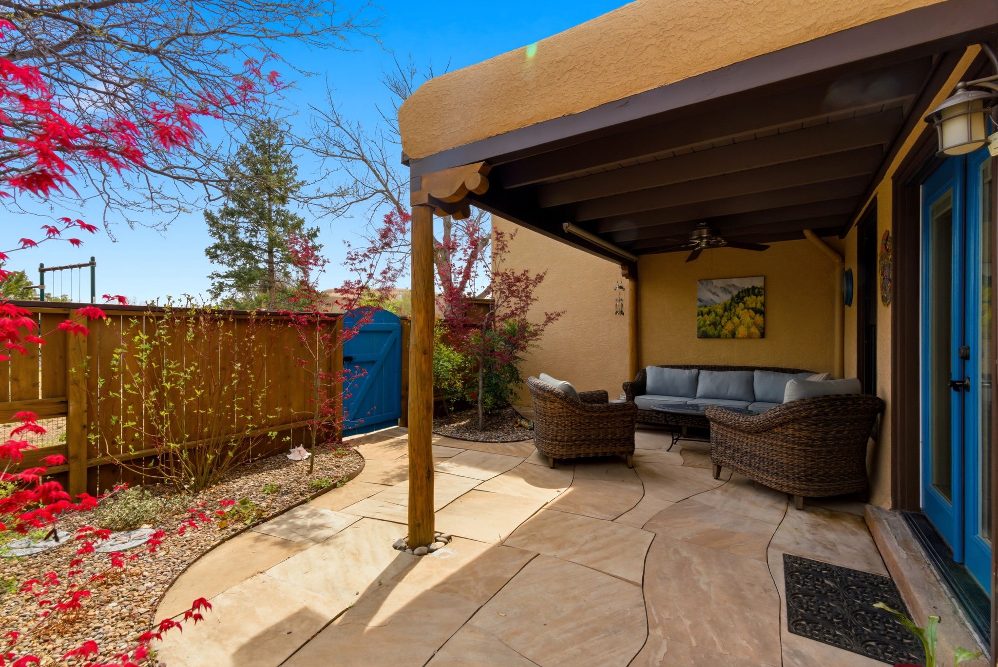 Impeccably maintained and filled with natural light, this single-story, end-unit townhouse offers the perfect blend of comfort, style, and Santa Fe charm. Featuring 2 bedrooms and 2 baths, the home has been thoughtfully updated throughout, including a newer 3-year-old roof, newer stucco, recently replaced and enlarged windows, and a newer furnace and A/C system.The stunning kitchen is a true centerpiece, boasting newer appliances with a gas range, a farmhouse sink, pantry with convenient pull-out drawers, beautiful tile backsplash, and elegant stone countertops--ideal for both everyday living and entertaining. The inviting living room showcases a classic corner kiva fireplace, warm beamed ceilings, and French doors that open to a beautifully landscaped flagstone patio, creating seamless indoor-outdoor living.Cork flooring adds warmth and durability to the main living areas, while both carpeted bedrooms feature oversized windows that bring in abundant light. The primary suite enjoys peaceful views of open space with glimpses of the Sangre de Cristo Mountains. The updated guest bathroom includes a laundry closet with a 2025 washer and dryer for added convenience.Completing the property is a detached two-car garage. Located in the desirable Park Plazas community, residents enjoy miles of walking trails, tennis courts, an off-leash dog park, a community garden, RV storage, and attentive HOA management--all just minutes from shopping, dining, and everything Santa Fe has to offer. This home is an absolute gem in a beautiful community.