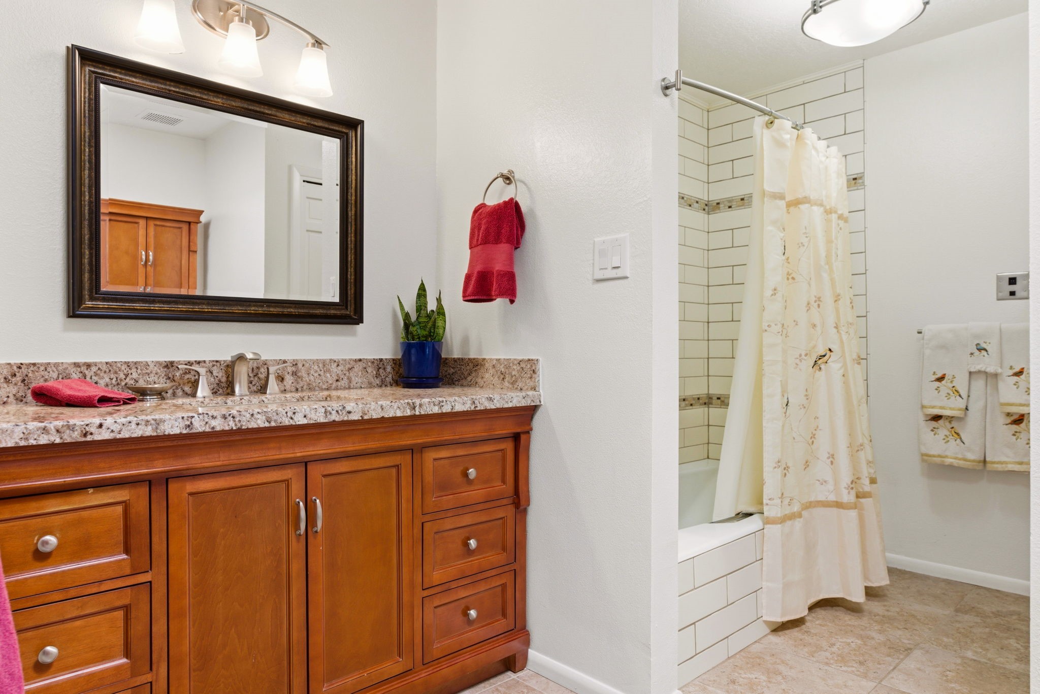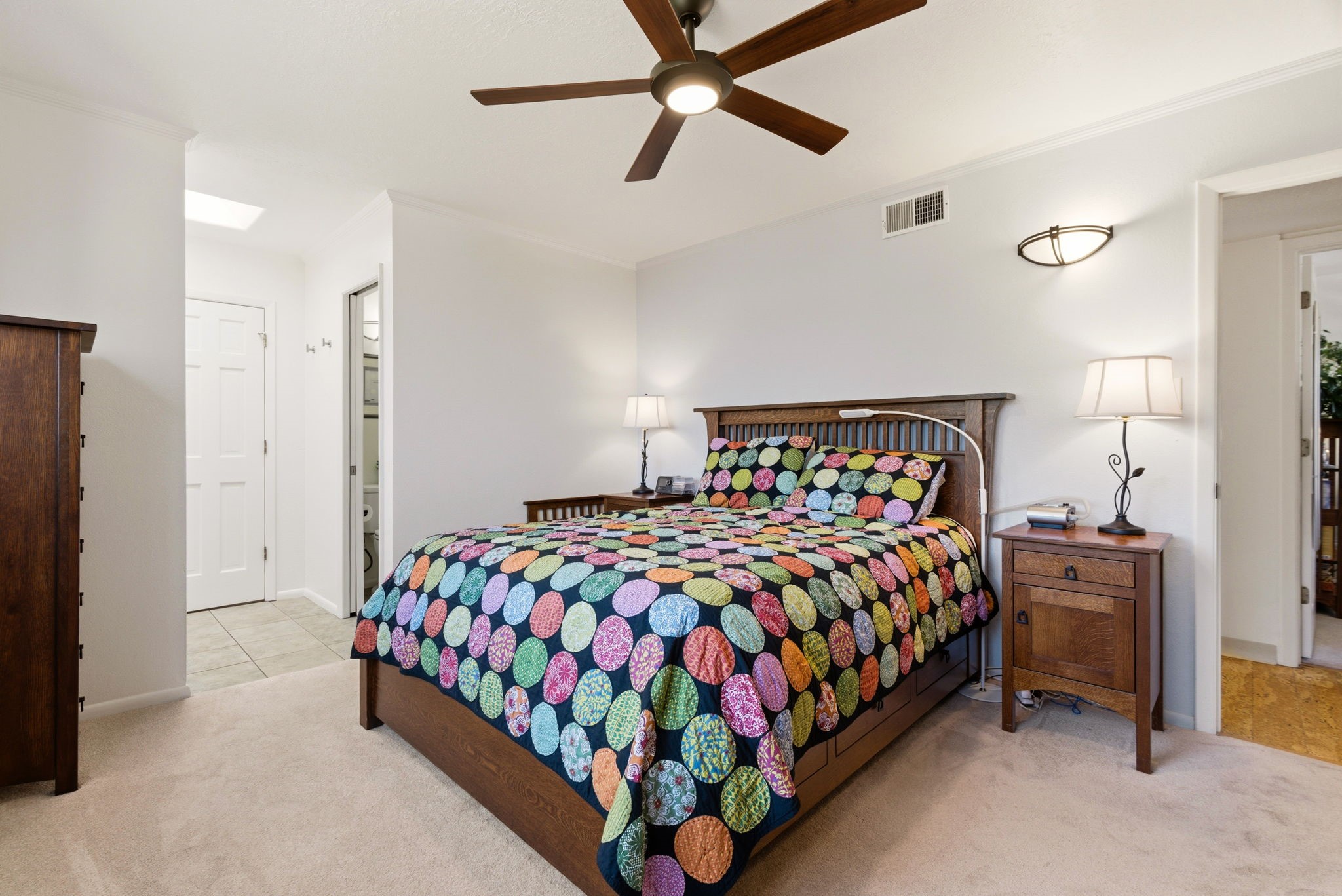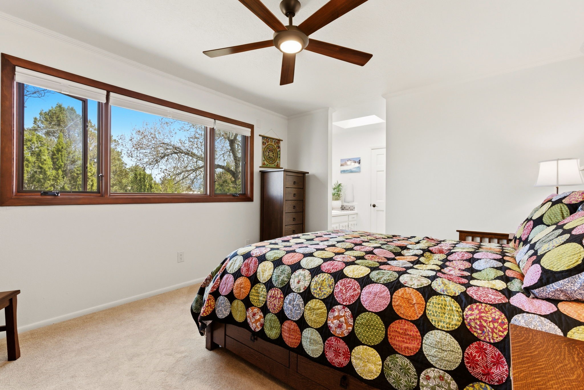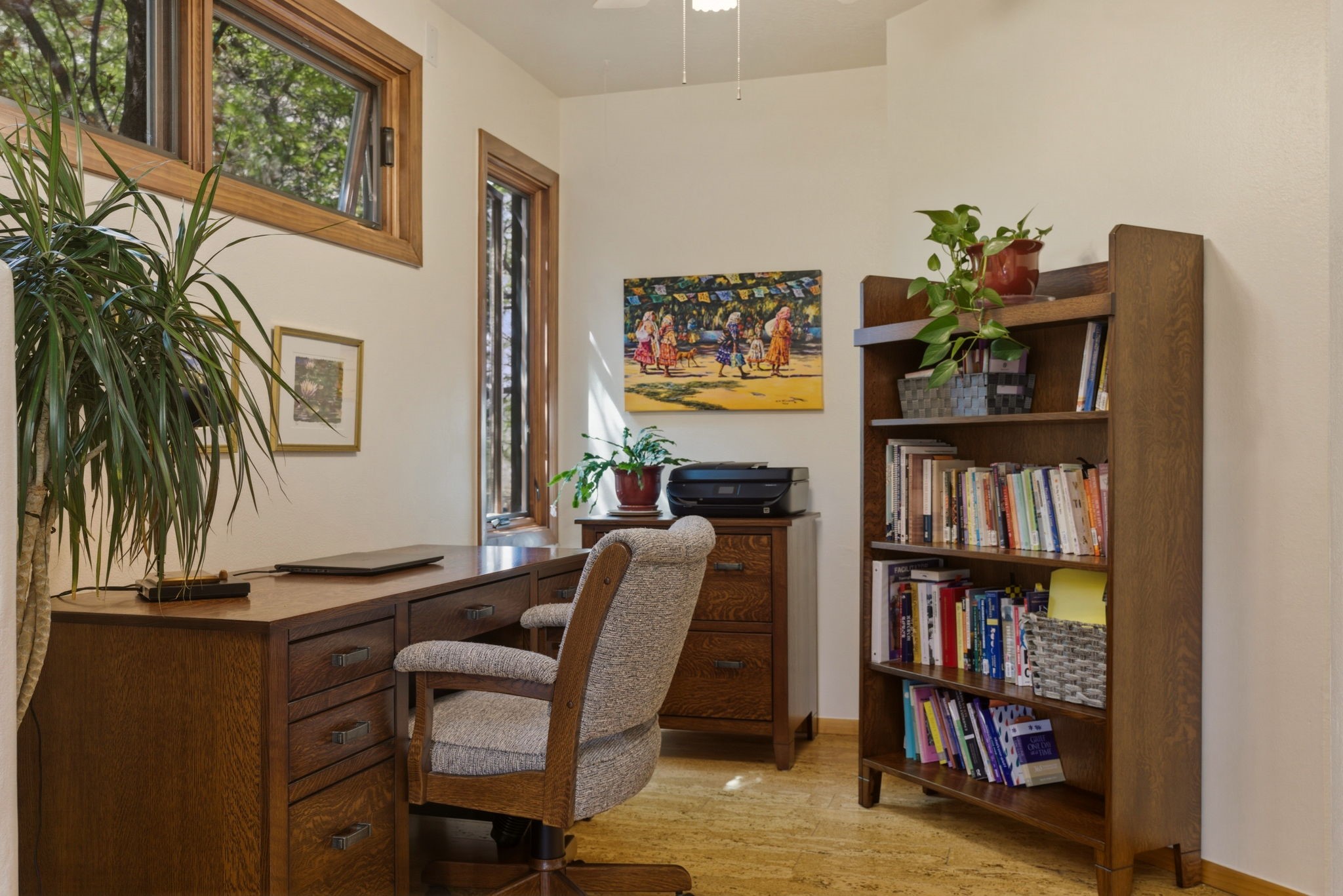 Impeccably maintained and filled with natural light, this single-story, end-unit townhouse offers the perfect blend of comfort, style, and Santa Fe charm. Featuring 2 bedrooms and 2 baths, the home has been thoughtfully updated throughout, including a newer 3-year-old roof, newer stucco, recently replaced and enlarged windows, and a newer furnace and A/C system.The stunning kitchen is a true centerpiece, boasting newer appliances with a gas range, a farmhouse sink, pantry with convenient pull-out drawers, beautiful tile backsplash, and elegant stone countertops--ideal for both everyday living and entertaining. The inviting living room showcases a classic corner kiva fireplace, warm beamed ceilings, and French doors that open to a beautifully landscaped flagstone patio, creating seamless indoor-outdoor living.Cork flooring adds warmth and durability to the main living areas, while both carpeted bedrooms feature oversized windows that bring in abundant light. The primary suite enjoys peaceful views of open space with glimpses of the Sangre de Cristo Mountains. The updated guest bathroom includes a laundry closet with a 2025 washer and dryer for added convenience.Completing the property is a detached two-car garage. Located in the desirable Park Plazas community, residents enjoy miles of walking trails, tennis courts, an off-leash dog park, a community garden, RV storage, and attentive HOA management--all just minutes from shopping, dining, and everything Santa Fe has to offer. This home is an absolute gem in a beautiful community.