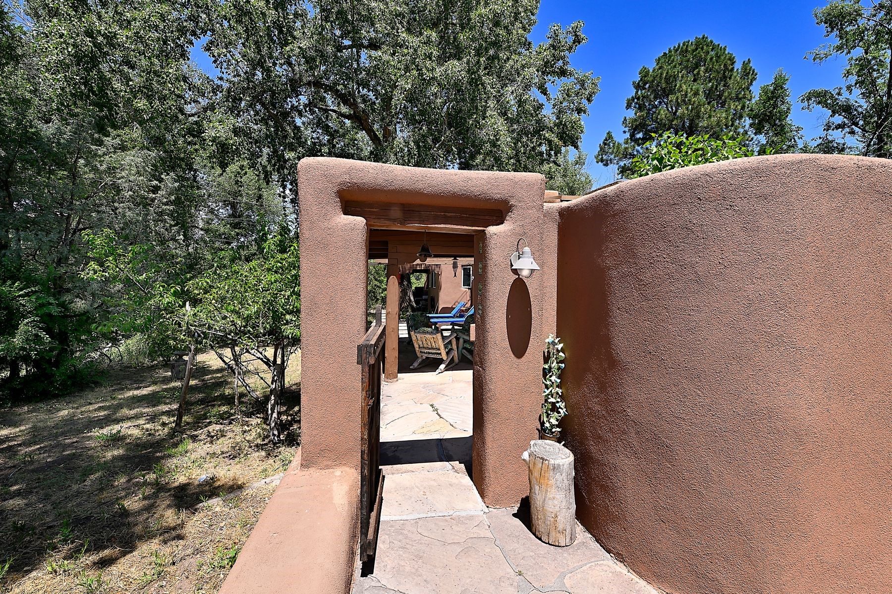 Beneath towering cottonwoods in the verdant Tesuque Valley, this two-bedroom home on the banks of the village's namesake river is filled with warm light, earth tones, and all the charm and whimsy of Santa Fe. A colorful courtyard garden with a lighted brick path and a portal introduce the home, which begins with a welcoming great room featuring hardwood floors, vigas, a corner kiva fireplace, and windows, skylights, and French doors admitting idyllic dappled sunlight. Enchanting skylit hallways lead to a formal dining room with nichos and a kiva fireplace; a delightful kitchen with stainless-steel appliances, stone tilework, warm wood cabinetry, and archways leading to a sunken breakfast nook or sitting area; a comfortable guest bedroom with an en suite bath bright with Talavera details; a discreet powder and laundry room; and a peaceful, luxurious owner's suite with an office area, a well-outfitted walk-in closet, and a spacious light-filled bath. Storage is offered throughout. An enviable portal off the kitchen and great room provides ideal space for outdoor living, dining, and entertaining amid eye-catching tilework, a kiva fireplace, and lush greenery. To the south is a breezy pergola--adjoined by a second flourishing garden area--perfect for birdwatching and appreciating the serene setting. The gravel drive and parking area is just off one of the village's main thoroughfares, and the fabled Tesuque Village Market is only a half mile away.