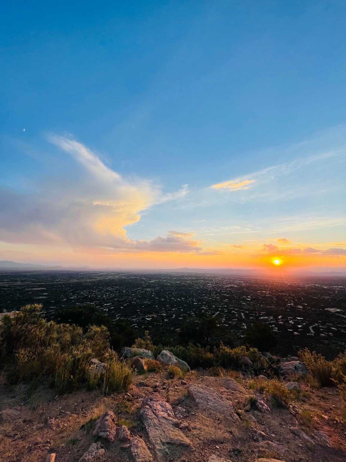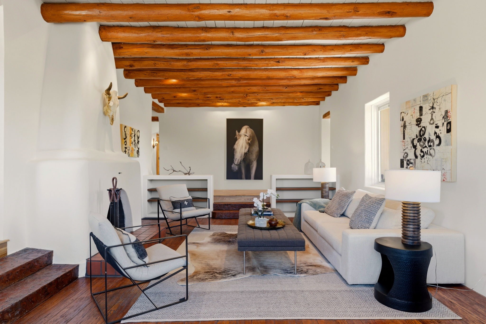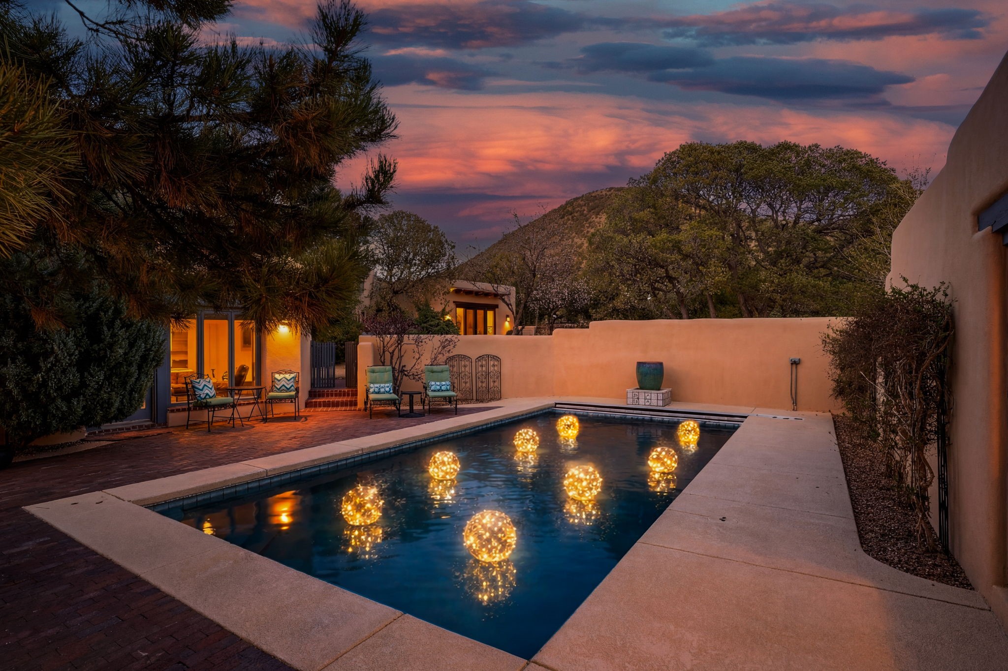 Set on approximately 2 private acres in one of Santa Fe's most coveted foothill enclaves, just a few quick minutes from Museum Hill and the Eastside, this exceptional compound unfolds as a beautifully composed private retreat defined by space, light, and remarkable natural surroundings. The property encompasses apx 3,610 sqft with a 3 BR / 4 BA configuration. The main residence spans roughly 3,040 sqft with 2 BR / 3 BA filled with natural light from skylights and expansive windows that frame Santa Fe's legendary deep blue skies, brilliant pink sunsets, and luminous night skies. Authentic Santa Fe elements are abundant throughout, including vigas, latillas, nichos, and 3 kiva fireplaces. Luxurious wood, brick, and tile flooring and a streamlined elegant chef's kitchen with stainless appliances anchor the home's inviting living spaces. Historic elements from its original 1947 construction lend character and warmth throughout, though recently and thoroughly updated and completely renovated and modernized. A separate guest house of approximately 570 sqft completely reimagined offers a beautifully stunning and private 1 BR / 1 BA retreat. Distinctive Moroccan-imported doors and hardware open to interiors highlighted by striking oversized invisible pocket doors and diagonal blonde wood floors with a steam shower, creating an inviting and stylish sanctuary for guests, creative pursuits, or quiet retreat. Air-conditioning cools in the height of summer's hottest days. At the center of its outdoor experience is a newly redone walled and private saltwater lap pool with an automatic retractable cover - an elegant retreat for quiet morning swims, sun-drenched afternoons, or moonlit evenings. Surrounding the pool are rare, lush grass lawns - an extraordinary luxury in Santa Fe - along with generous outdoor spaces and private patios designed for spontaneous entertaining and languid moments. This gated paradise provides exceptional privacy and abundant parking with direct, close access from the property to the Sun Mountain trail system - offering the rare privilege of stepping right from your backyard into one of Santa Fe's most beloved hiking landscapes. Here, expansive skies, breathtaking sunsets, and a deep sense of privacy create a lifestyle that is both rare and deeply restorative, Santa Fe itself truly embodied in an exceptional estate.