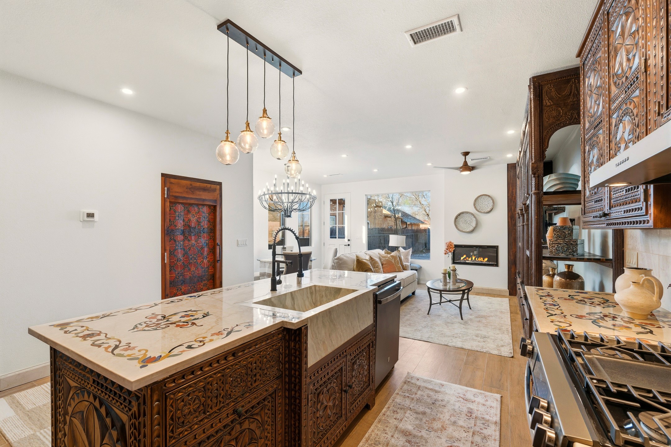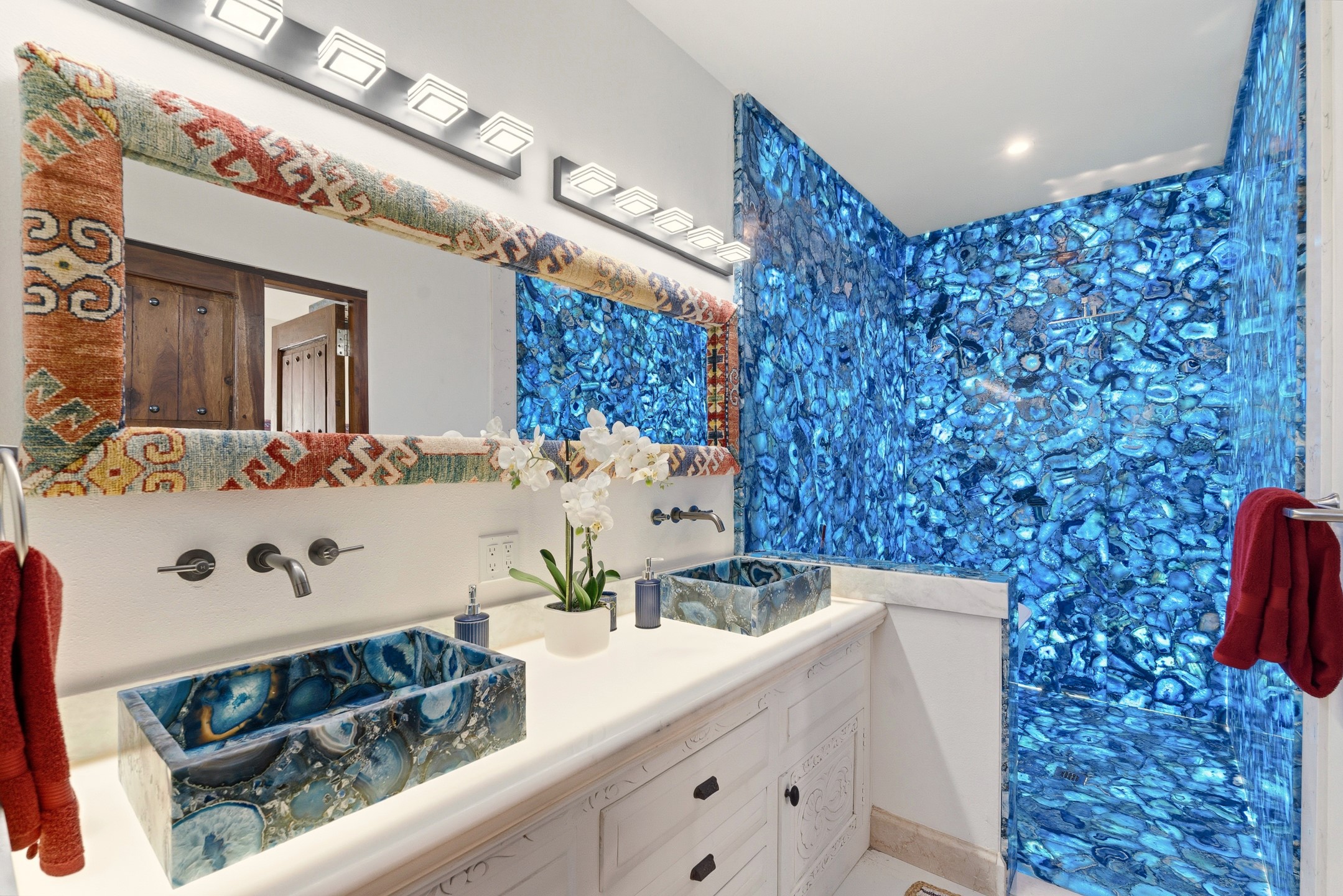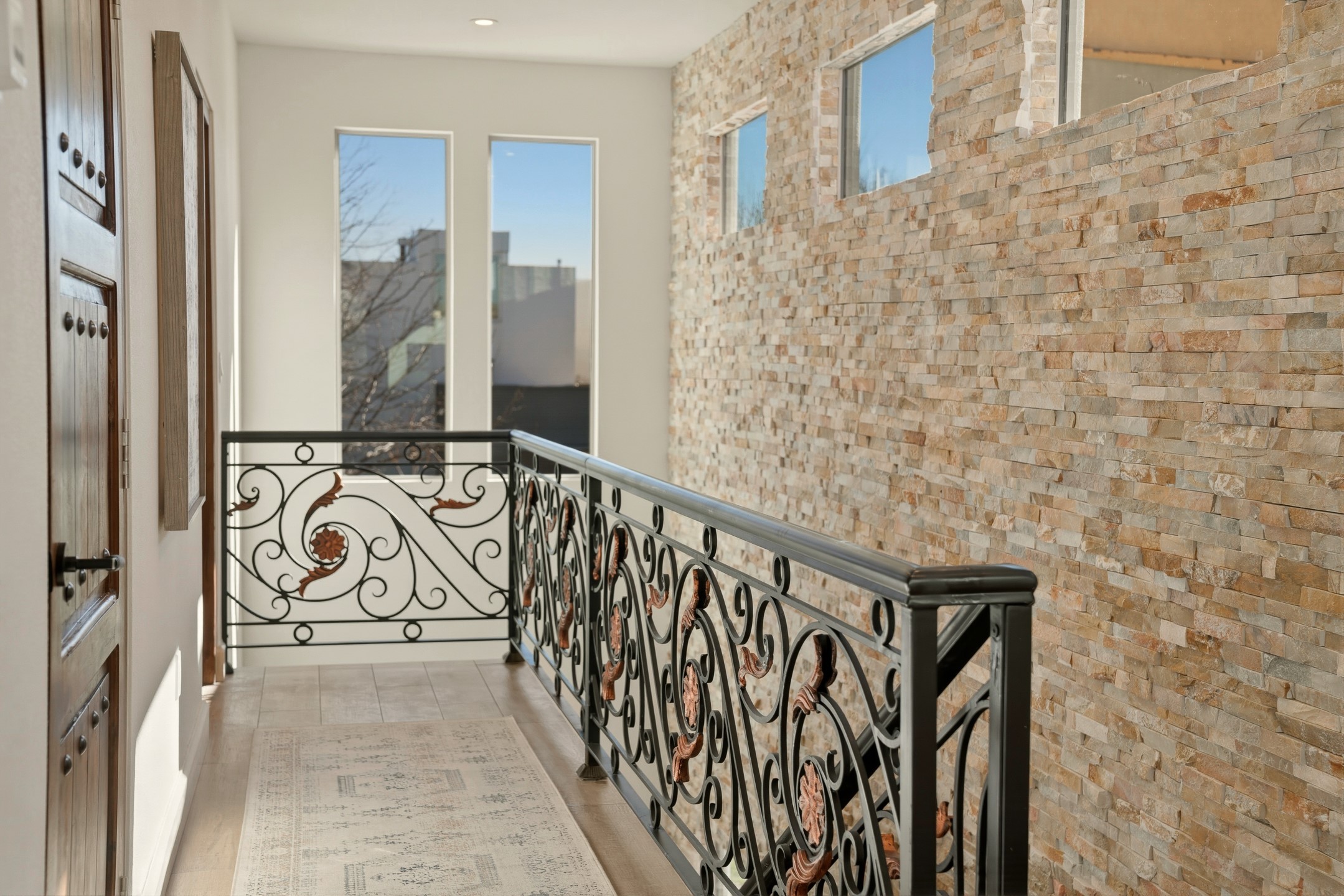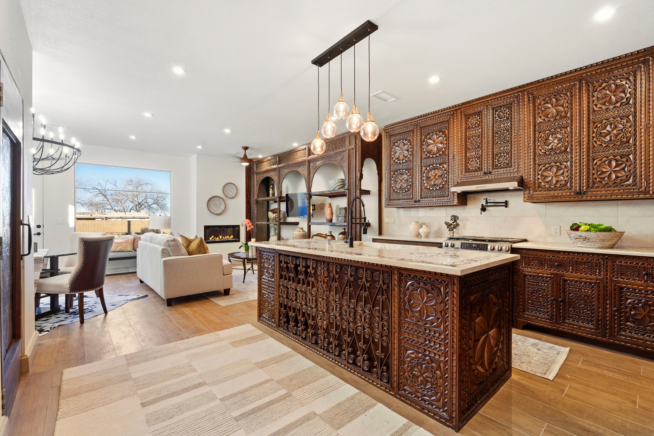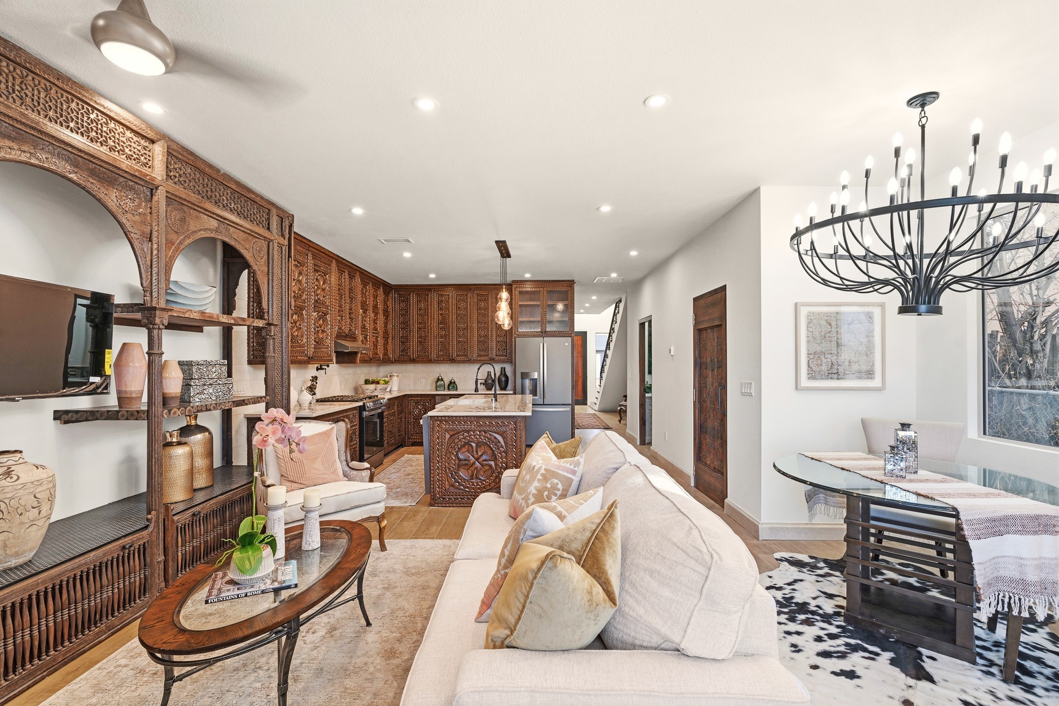 Old world craftsmanship blends seamlessly with modern luxury at the Estancia Collection, a unique compound located in the Baca Railyard District, minutes from Santa Fe's top galleries and restaurants. This latest vision of renowned developer Mitch Menaker, is where every room becomes a work of living art. Curated by artisans from around the world, using hand cut semi-precious stone, tiles, iron, and rare wood finishes creates a truly immersive and peaceful experience, as if being hugged by nature. As you enter the sanctuary, a profound sensory experience awaits: a 20-foot Anasazi-style wall creates awe and naturally anchors the home. Inside are hand-carved teak doors, alder kitchen cabinets artisan-crafted in Mexico, and Italian marble countertops inlaid with semi-precious stone, creating a fine art masterpiece. The open concept living area features a 250-year-old triple-arch entertainment center that mimics the arcade of an ancient palace. Ascending the staircase is like gliding through a canyon of stone to the bedroom suites above. The primary bedroom greets you through a charming speakeasy door. This light-filled sanctuary features a fireplace, an antique carved wooden ceiling, a wet bar and a one of a kind spa-like bathroom with blue agate sinks, set on backlit white onyx countertops. The tub/shower, surrounded by stunning backlit blue agate panels, creates a luxurious and luminous retreat. The second light-filled bedroom features a bathroom with a hand-carved Mexican vanity and petrified wood sink atop a white onyx counter. The museum-quality shower/tub is framed in petrified wood squares, hand-assembled to create a puzzle pattern.The laundry room, located on the 2nd floor includes a dog shower covered with "happy dog" faces on each hand cut tile. Blending ancient techniques with the expert hands that brought them to life, the developer's vision has created the most unique visual and artistic sanctuary Santa Fe has seen in years.