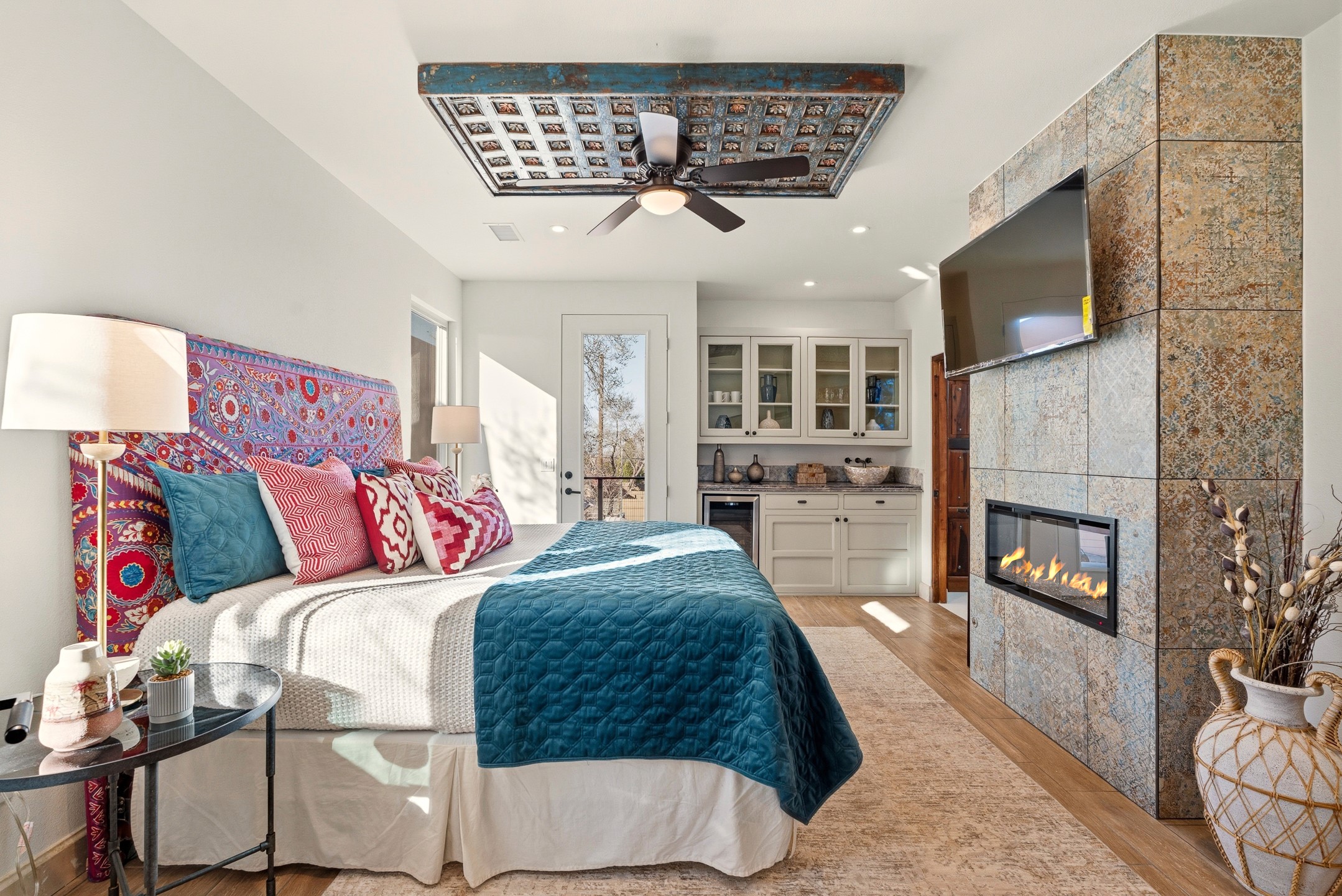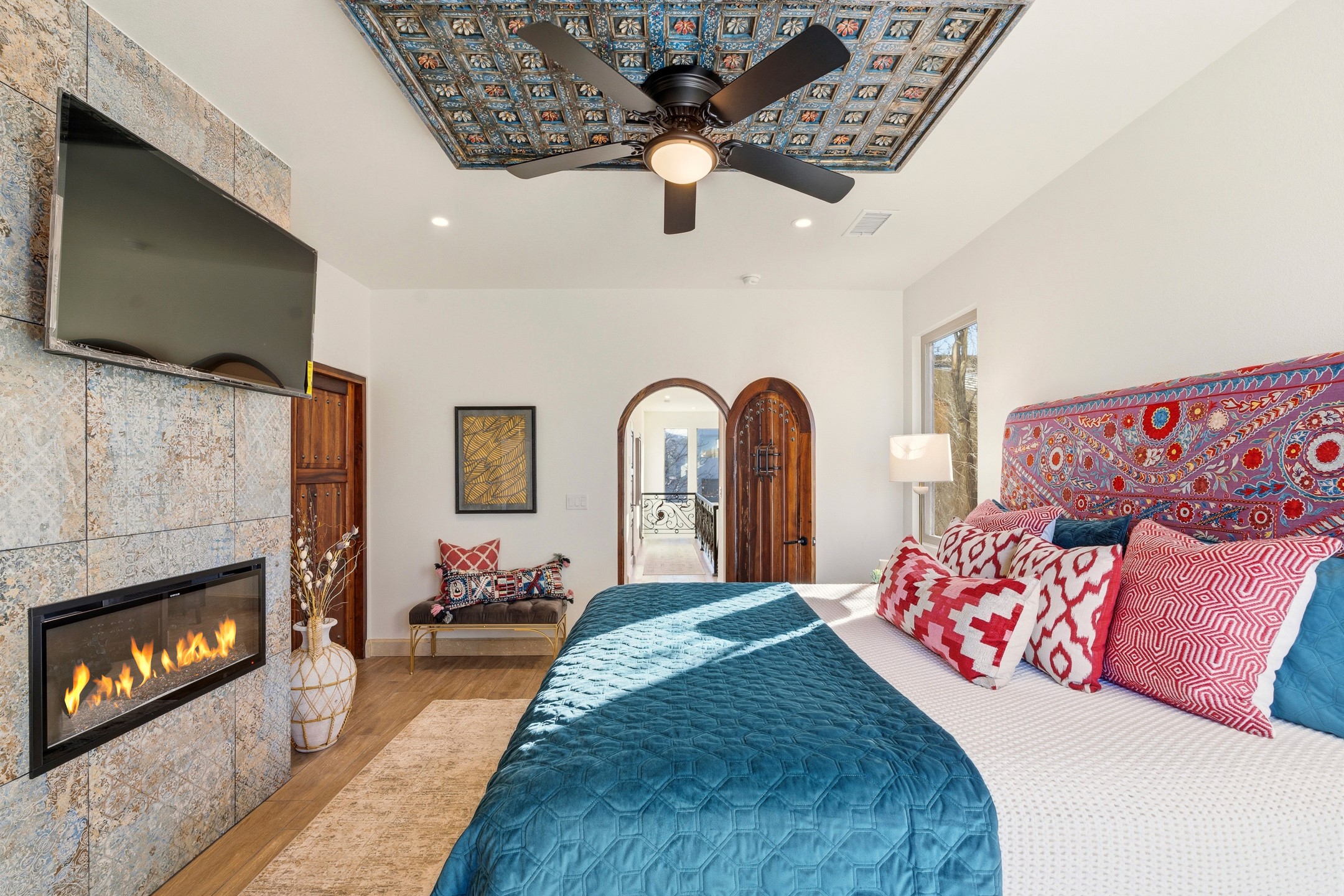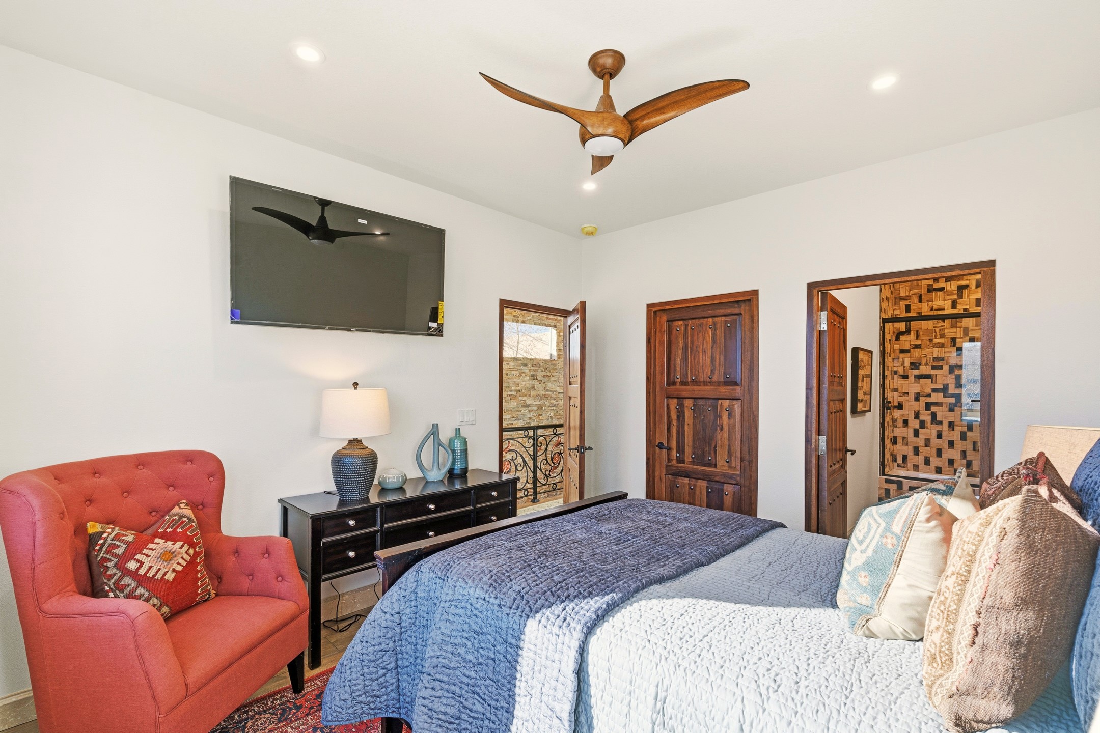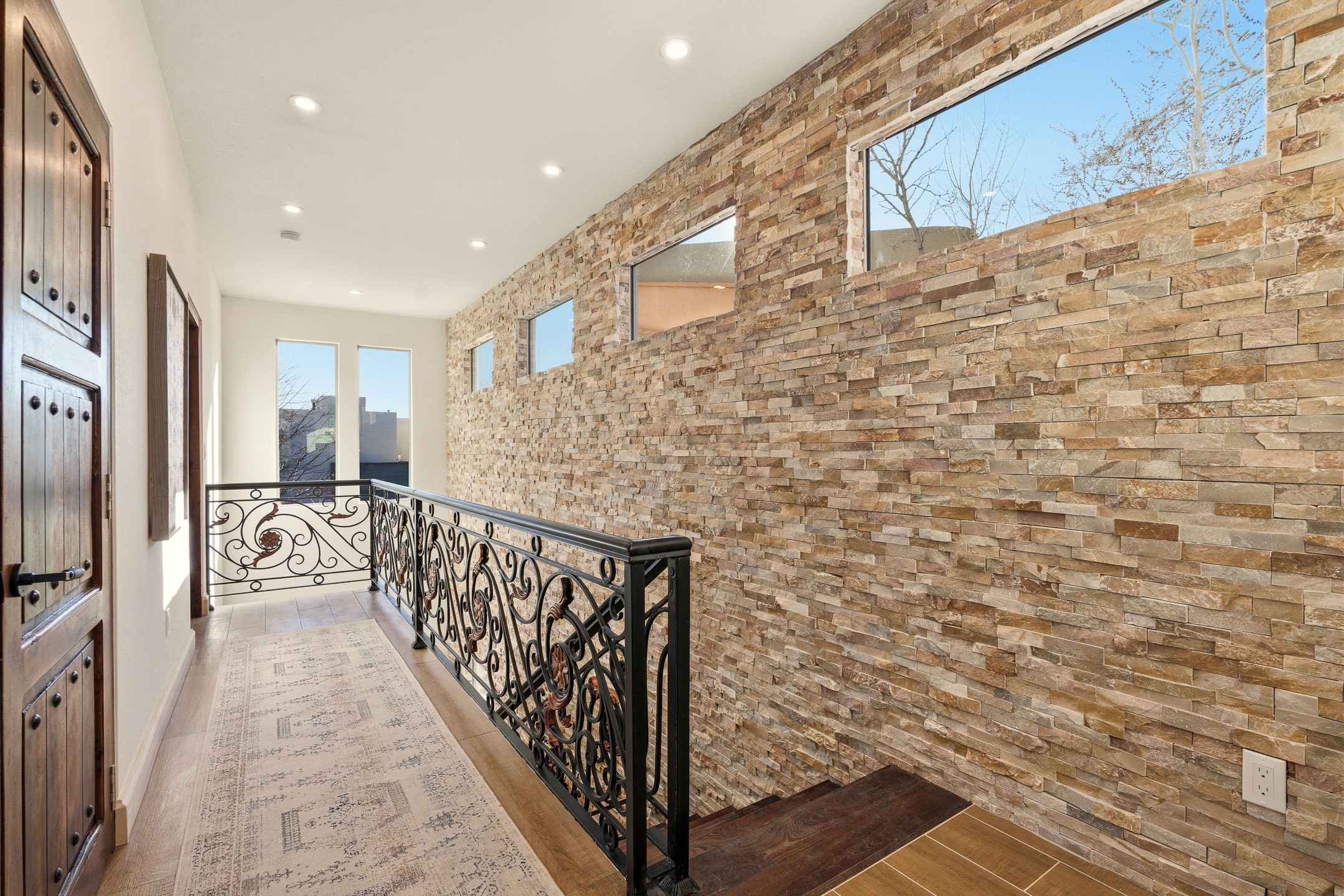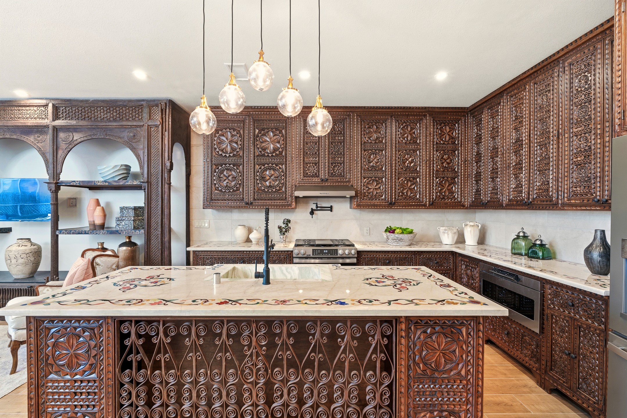 Old world craftsmanship blends seamlessly with modern luxury at the Estancia Collection, a unique compound located in the Baca Railyard District, minutes from Santa Fe's top galleries and restaurants. This latest vision of renowned developer Mitch Menaker, is where every room becomes a work of living art. Curated by artisans from around the world, using hand cut semi-precious stone, tiles, iron, and rare wood finishes creates a truly immersive and peaceful experience, as if being hugged by nature. As you enter the sanctuary, a profound sensory experience awaits: a 20-foot Anasazi-style wall creates awe and naturally anchors the home. Inside are hand-carved teak doors, alder kitchen cabinets artisan-crafted in Mexico, and Italian marble countertops inlaid with semi-precious stone, creating a fine art masterpiece. The open concept living area features a 250-year-old triple-arch entertainment center that mimics the arcade of an ancient palace. Ascending the staircase is like gliding through a canyon of stone to the bedroom suites above. The primary bedroom greets you through a charming speakeasy door. This light-filled sanctuary features a fireplace, an antique carved wooden ceiling, a wet bar and a one of a kind spa-like bathroom with blue agate sinks, set on backlit white onyx countertops. The tub/shower, surrounded by stunning backlit blue agate panels, creates a luxurious and luminous retreat. The second light-filled bedroom features a bathroom with a hand-carved Mexican vanity and petrified wood sink atop a white onyx counter. The museum-quality shower/tub is framed in petrified wood squares, hand-assembled to create a puzzle pattern.The laundry room, located on the 2nd floor includes a dog shower covered with "happy dog" faces on each hand cut tile. Blending ancient techniques with the expert hands that brought them to life, the developer's vision has created the most unique visual and artistic sanctuary Santa Fe has seen in years.