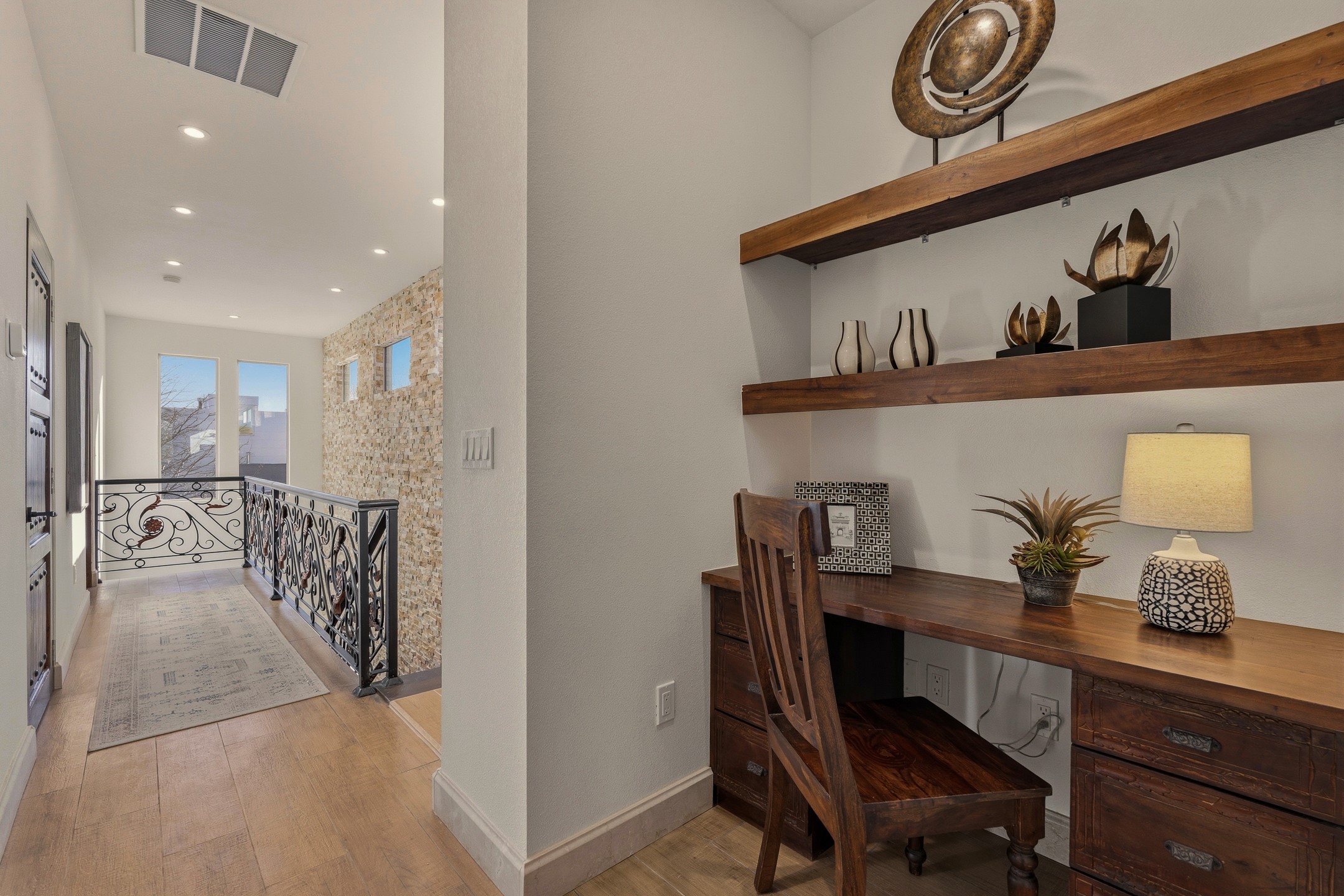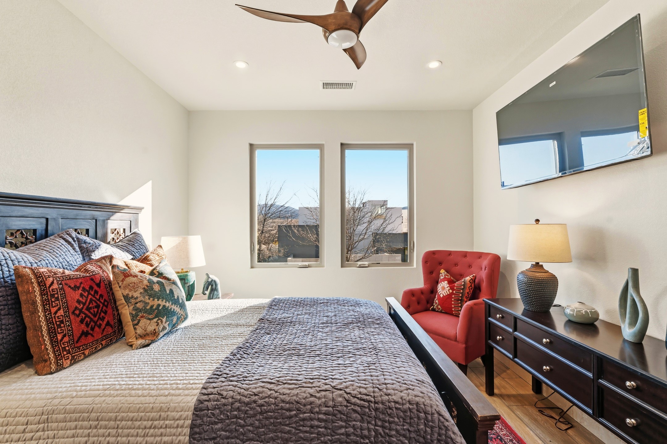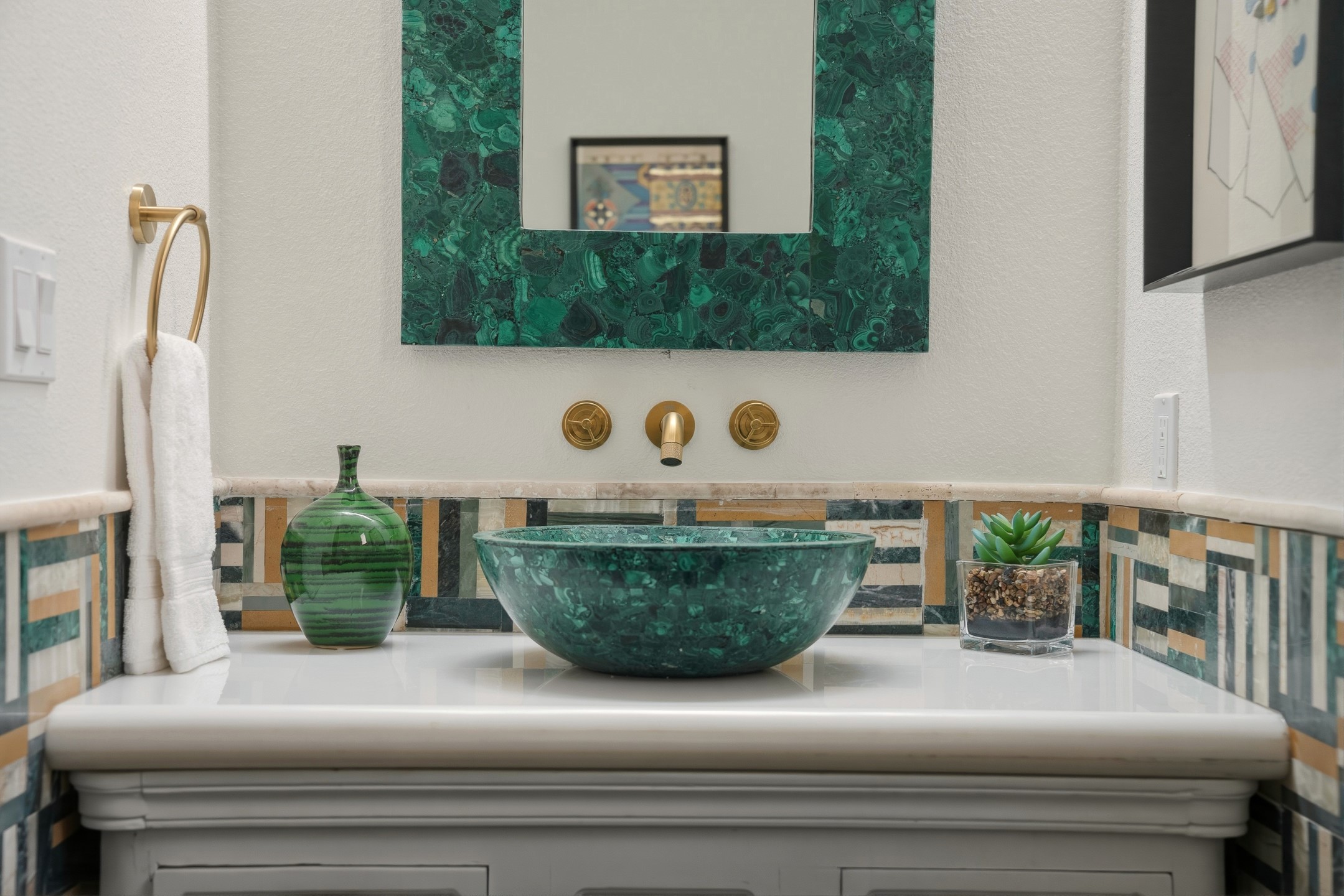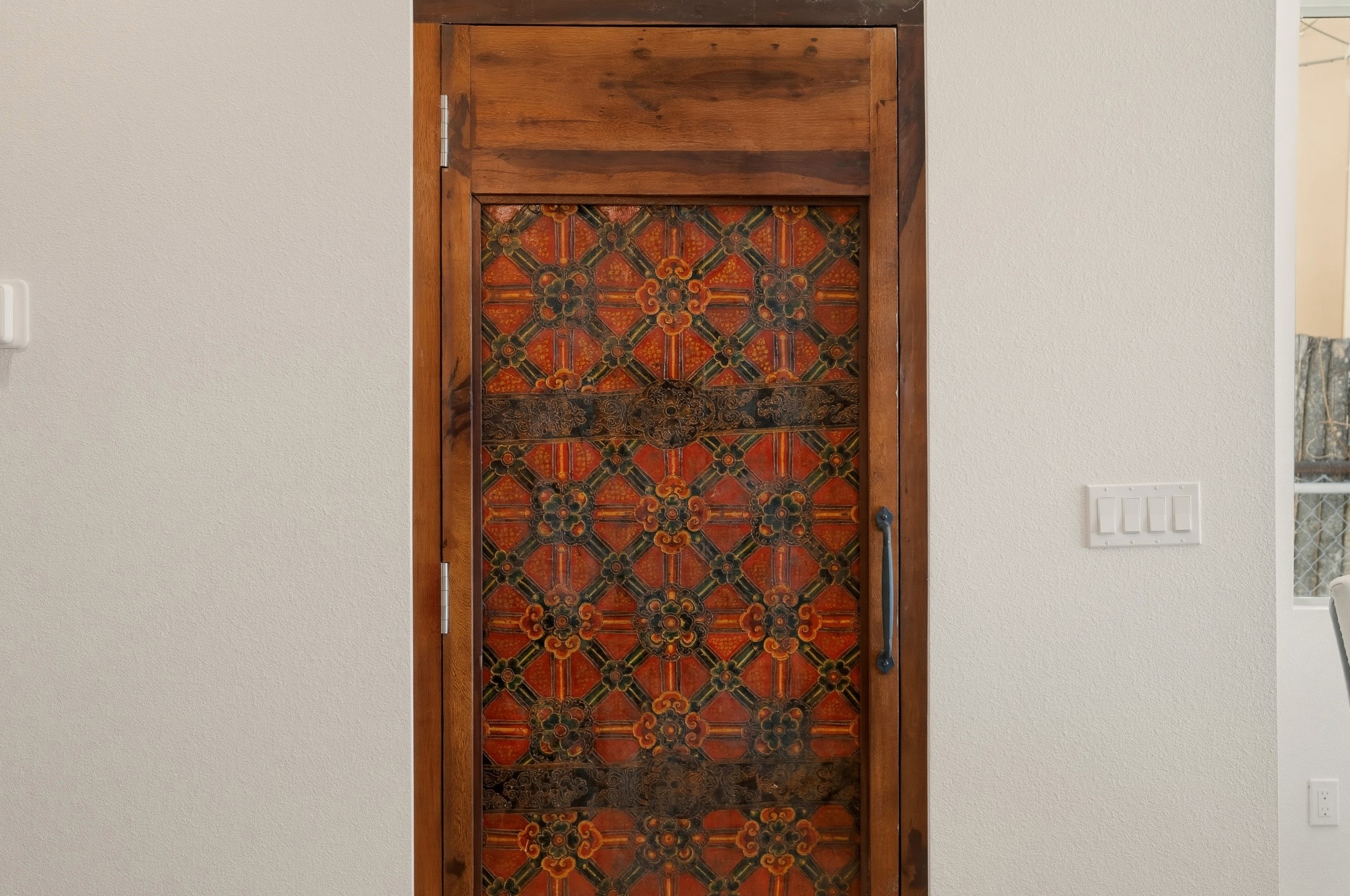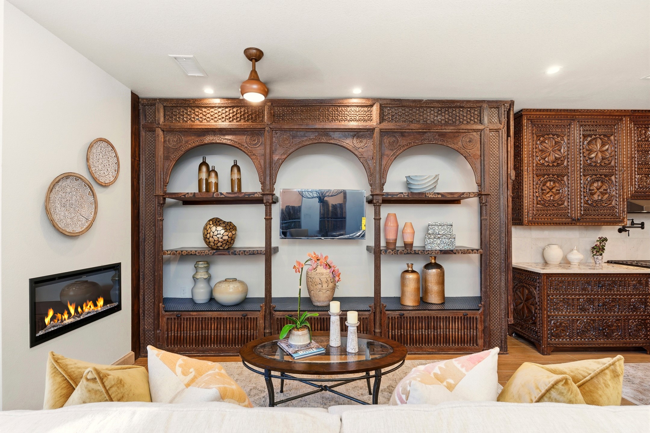Old world craftsmanship blends seamlessly with modern luxury at the Estancia Collection, a unique compound located in the Baca Railyard District, minutes from Santa Fe's top galleries and restaurants. This latest vision of renowned developer Mitch Menaker, is where every room becomes a work of living art. Curated by artisans from around the world, using hand cut semi-precious stone, tiles, iron, and rare wood finishes creates a truly immersive and peaceful experience, as if being hugged by nature. As you enter the sanctuary, a profound sensory experience awaits: a 20-foot Anasazi-style wall creates awe and naturally anchors the home. Inside are hand-carved teak doors, alder kitchen cabinets artisan-crafted in Mexico, and Italian marble countertops inlaid with semi-precious stone, creating a fine art masterpiece. The open concept living area features a 250-year-old triple-arch entertainment center that mimics the arcade of an ancient palace. Ascending the staircase is like gliding through a canyon of stone to the bedroom suites above. The primary bedroom greets you through a charming speakeasy door. This light-filled sanctuary features a fireplace, an antique carved wooden ceiling, a wet bar and a one of a kind spa-like bathroom with blue agate sinks, set on backlit white onyx countertops. The tub/shower, surrounded by stunning backlit blue agate panels, creates a luxurious and luminous retreat. The second light-filled bedroom features a bathroom with a hand-carved Mexican vanity and petrified wood sink atop a white onyx counter. The museum-quality shower/tub is framed in petrified wood squares, hand-assembled to create a puzzle pattern.The laundry room, located on the 2nd floor includes a dog shower covered with "happy dog" faces on each hand cut tile. Blending ancient techniques with the expert hands that brought them to life, the developer's vision has created the most unique visual and artistic sanctuary Santa Fe has seen in years.