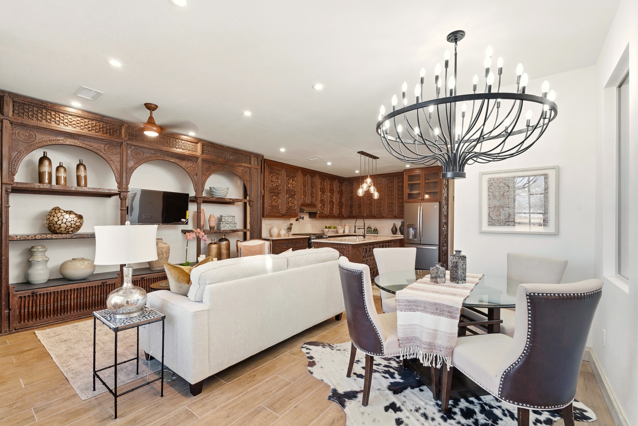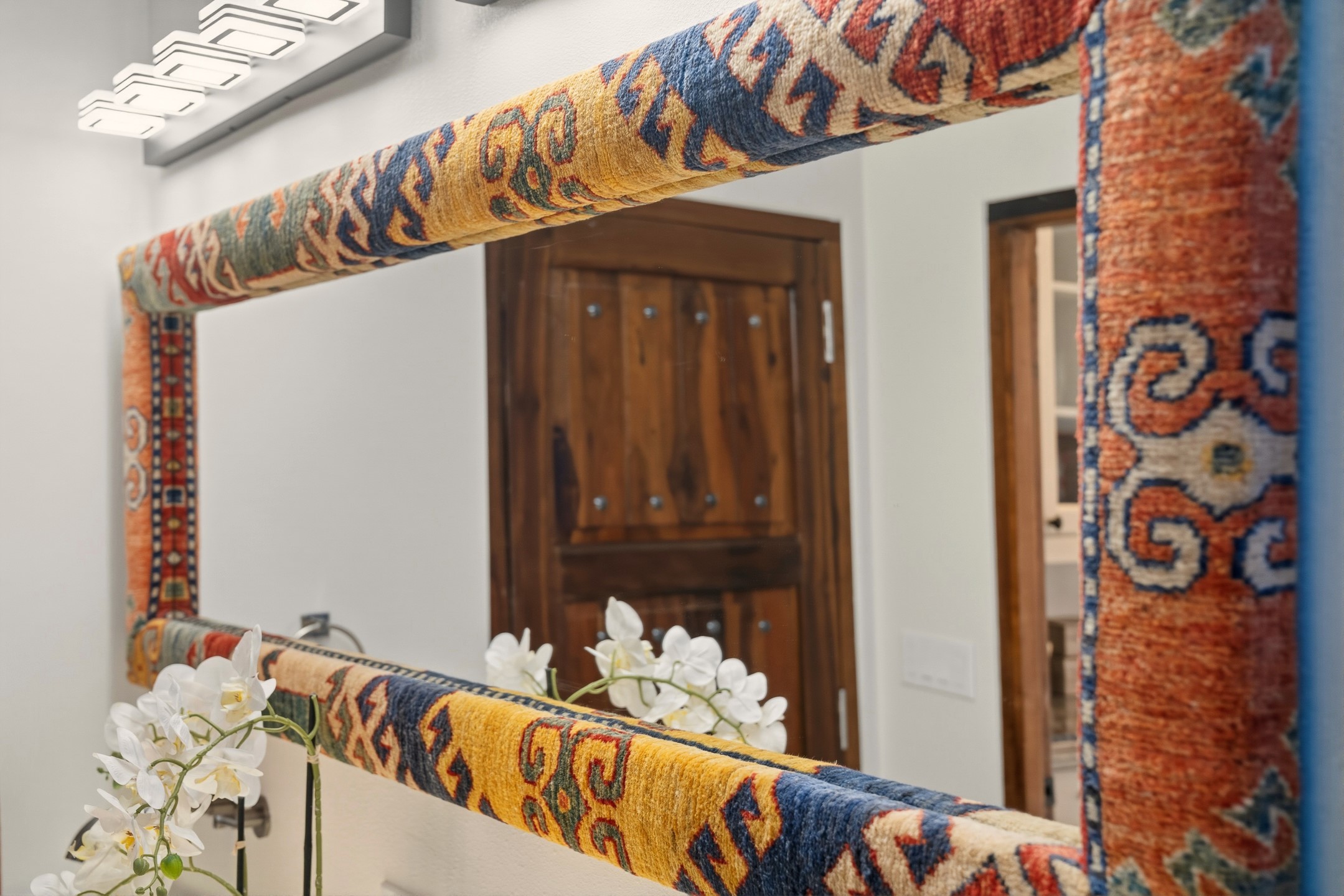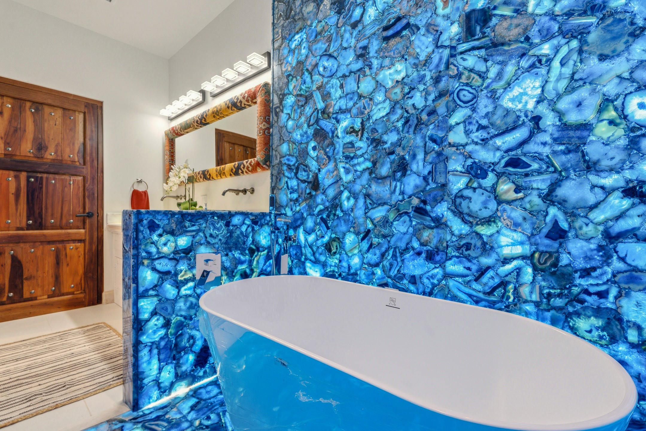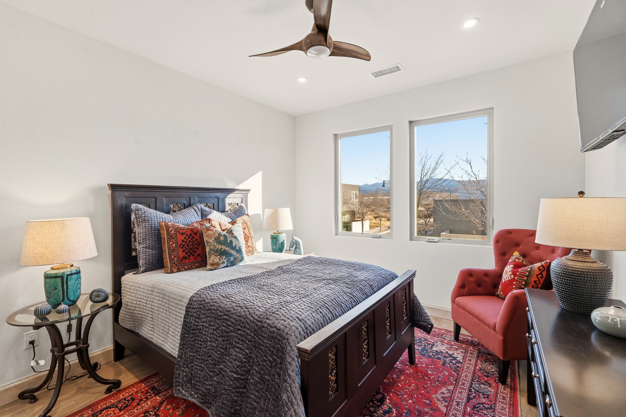 Old world craftsmanship blends seamlessly with modern luxury at the Estancia Collection, a unique compound located in the Baca Railyard District, minutes from Santa Fe's top galleries and restaurants. This latest vision of renowned developer Mitch Menaker, is where every room becomes a work of living art. Curated by artisans from around the world, using hand cut semi-precious stone, tiles, iron, and rare wood finishes creates a truly immersive and peaceful experience, as if being hugged by nature. As you enter the sanctuary, a profound sensory experience awaits: a 20-foot Anasazi-style wall creates awe and naturally anchors the home. Inside are hand-carved teak doors, alder kitchen cabinets artisan-crafted in Mexico, and Italian marble countertops inlaid with semi-precious stone, creating a fine art masterpiece. The open concept living area features a 250-year-old triple-arch entertainment center that mimics the arcade of an ancient palace. Ascending the staircase is like gliding through a canyon of stone to the bedroom suites above. The primary bedroom greets you through a charming speakeasy door. This light-filled sanctuary features a fireplace, an antique carved wooden ceiling, a wet bar and a one of a kind spa-like bathroom with blue agate sinks, set on backlit white onyx countertops. The tub/shower, surrounded by stunning backlit blue agate panels, creates a luxurious and luminous retreat. The second light-filled bedroom features a bathroom with a hand-carved Mexican vanity and petrified wood sink atop a white onyx counter. The museum-quality shower/tub is framed in petrified wood squares, hand-assembled to create a puzzle pattern.The laundry room, located on the 2nd floor includes a dog shower covered with "happy dog" faces on each hand cut tile. Blending ancient techniques with the expert hands that brought them to life, the developer's vision has created the most unique visual and artistic sanctuary Santa Fe has seen in years.