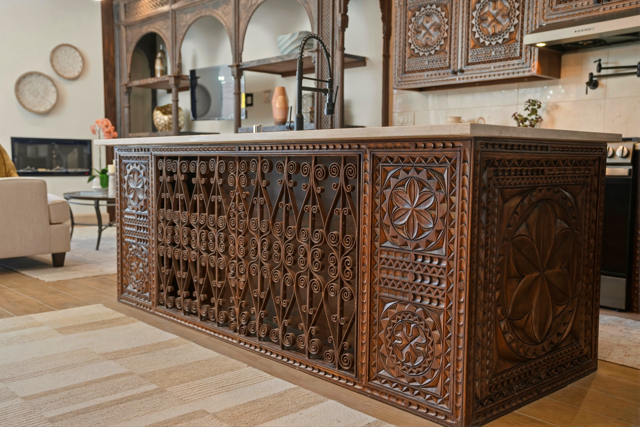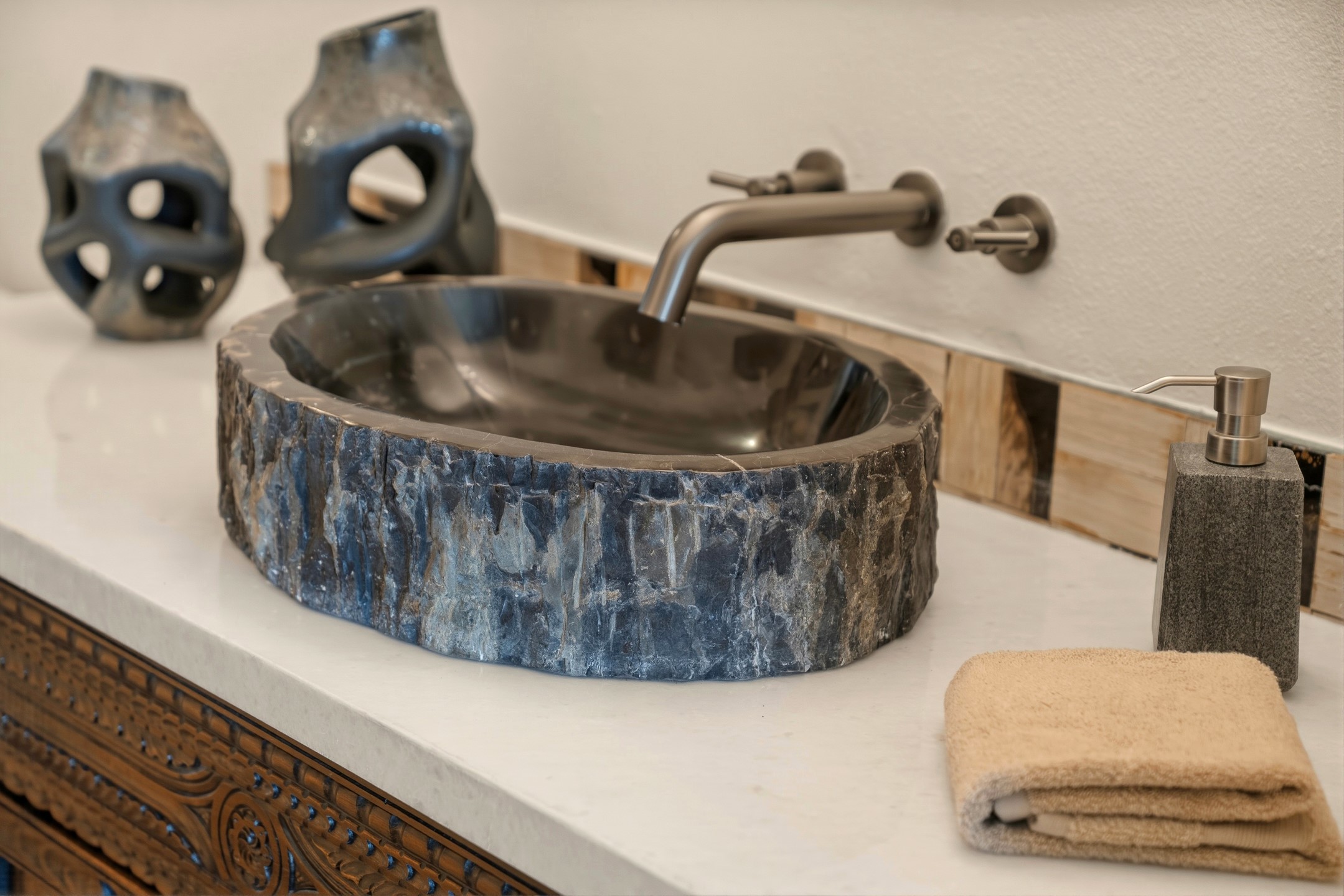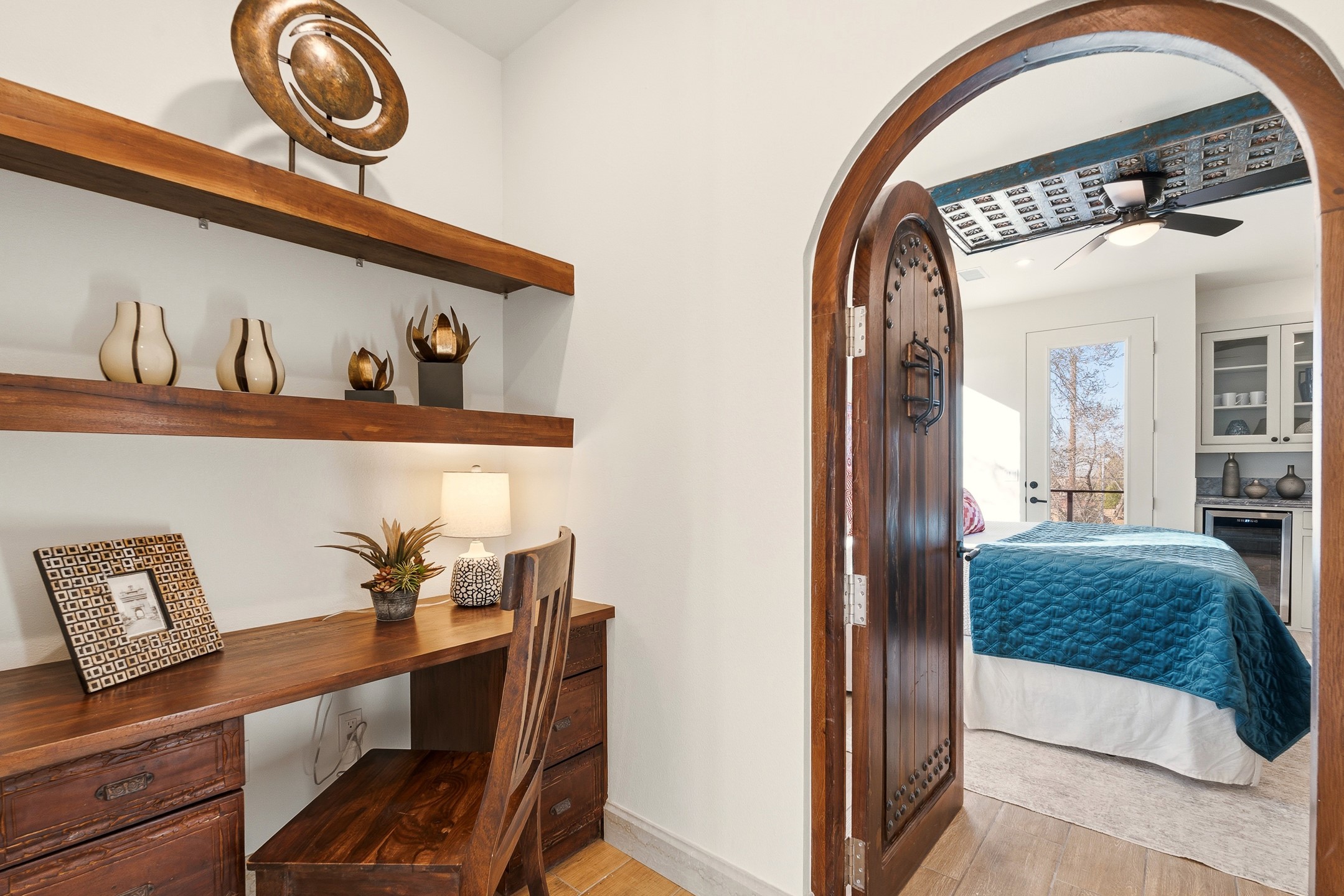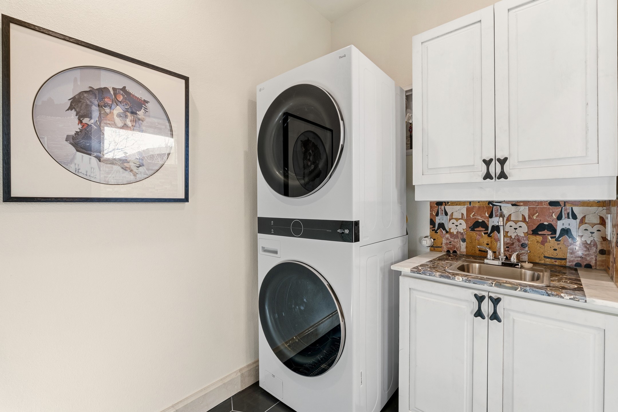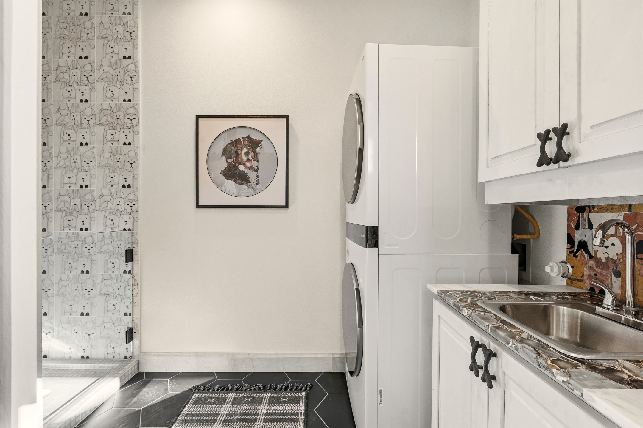 Old world craftsmanship blends seamlessly with modern luxury at the Estancia Collection, a unique compound located in the Baca Railyard District, minutes from Santa Fe's top galleries and restaurants. This latest vision of renowned developer Mitch Menaker, is where every room becomes a work of living art. Curated by artisans from around the world, using hand cut semi-precious stone, tiles, iron, and rare wood finishes creates a truly immersive and peaceful experience, as if being hugged by nature. As you enter the sanctuary, a profound sensory experience awaits: a 20-foot Anasazi-style wall creates awe and naturally anchors the home. Inside are hand-carved teak doors, alder kitchen cabinets artisan-crafted in Mexico, and Italian marble countertops inlaid with semi-precious stone, creating a fine art masterpiece. The open concept living area features a 250-year-old triple-arch entertainment center that mimics the arcade of an ancient palace. Ascending the staircase is like gliding through a canyon of stone to the bedroom suites above. The primary bedroom greets you through a charming speakeasy door. This light-filled sanctuary features a fireplace, an antique carved wooden ceiling, a wet bar and a one of a kind spa-like bathroom with blue agate sinks, set on backlit white onyx countertops. The tub/shower, surrounded by stunning backlit blue agate panels, creates a luxurious and luminous retreat. The second light-filled bedroom features a bathroom with a hand-carved Mexican vanity and petrified wood sink atop a white onyx counter. The museum-quality shower/tub is framed in petrified wood squares, hand-assembled to create a puzzle pattern.The laundry room, located on the 2nd floor includes a dog shower covered with "happy dog" faces on each hand cut tile. Blending ancient techniques with the expert hands that brought them to life, the developer's vision has created the most unique visual and artistic sanctuary Santa Fe has seen in years.