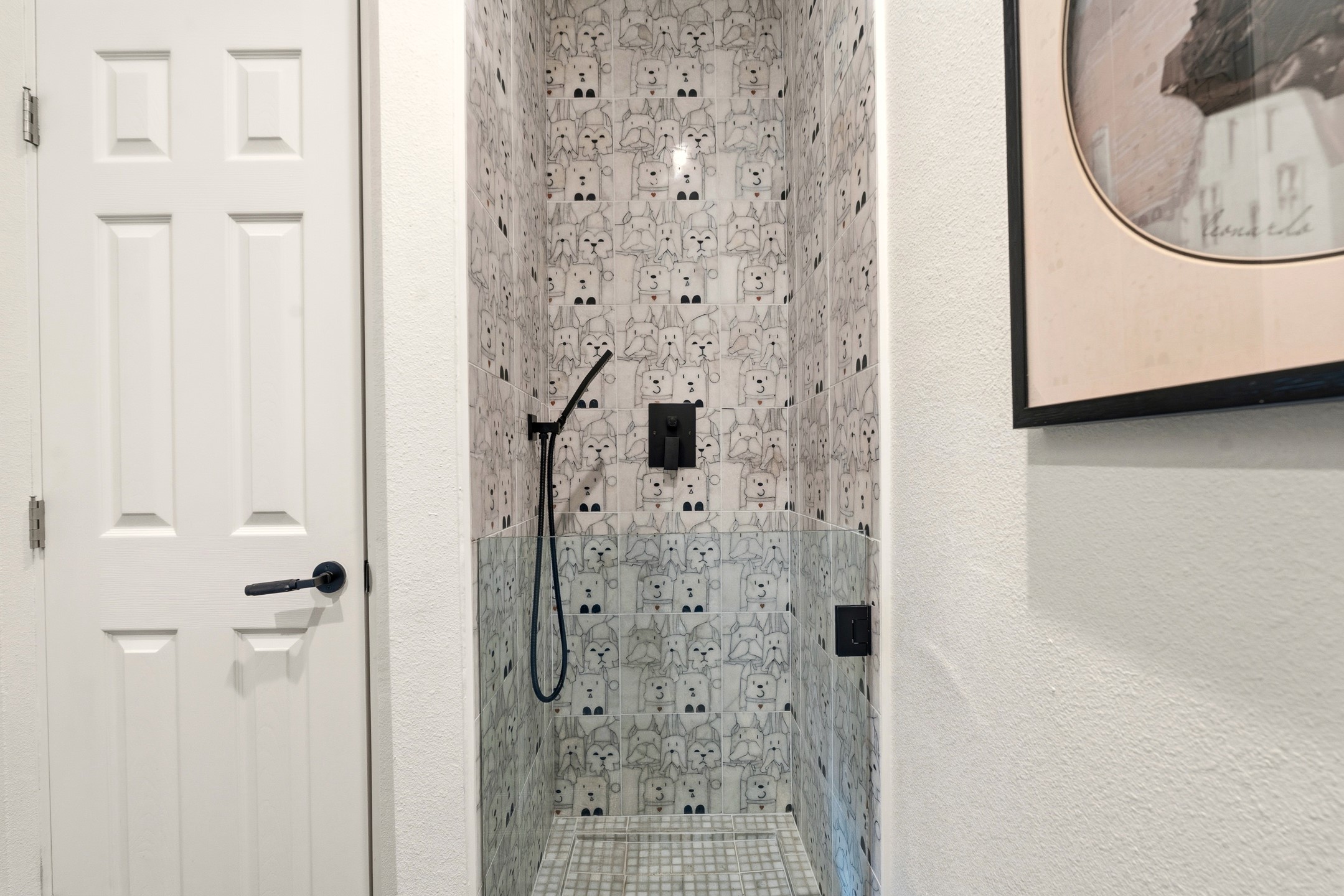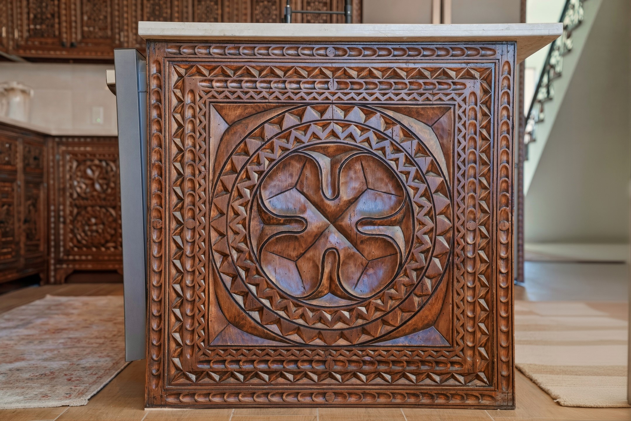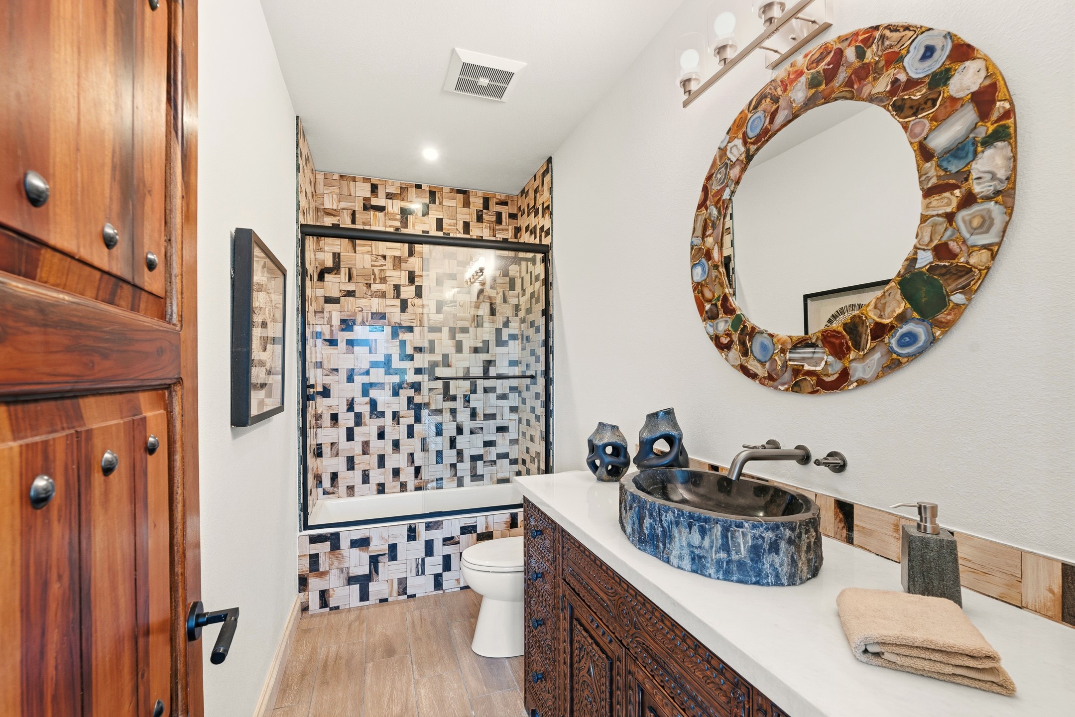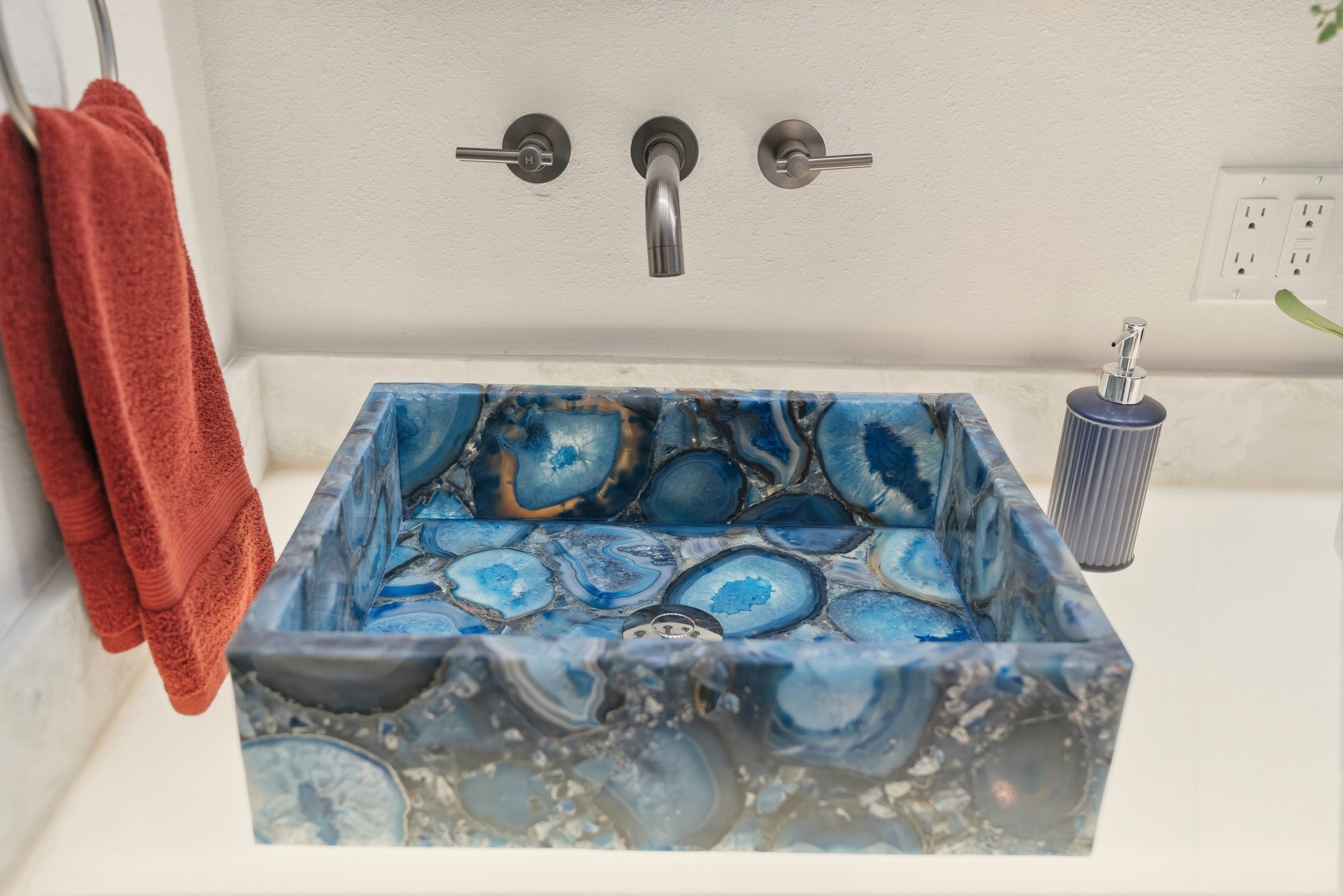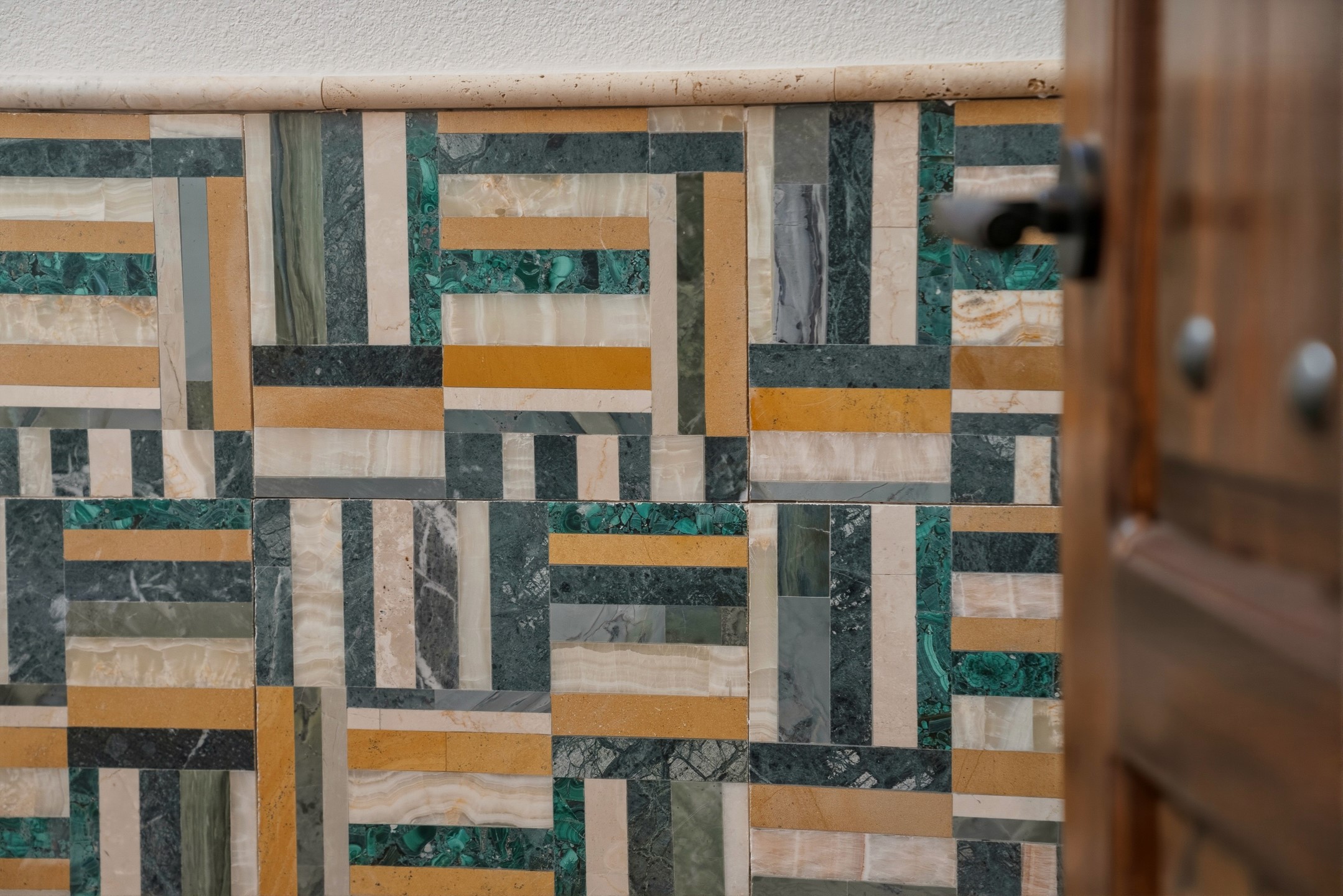 Old world craftsmanship blends seamlessly with modern luxury at the Estancia Collection, a unique compound located in the Baca Railyard District, minutes from Santa Fe's top galleries and restaurants. This latest vision of renowned developer Mitch Menaker, is where every room becomes a work of living art. Curated by artisans from around the world, using hand cut semi-precious stone, tiles, iron, and rare wood finishes creates a truly immersive and peaceful experience, as if being hugged by nature. As you enter the sanctuary, a profound sensory experience awaits: a 20-foot Anasazi-style wall creates awe and naturally anchors the home. Inside are hand-carved teak doors, alder kitchen cabinets artisan-crafted in Mexico, and Italian marble countertops inlaid with semi-precious stone, creating a fine art masterpiece. The open concept living area features a 250-year-old triple-arch entertainment center that mimics the arcade of an ancient palace. Ascending the staircase is like gliding through a canyon of stone to the bedroom suites above. The primary bedroom greets you through a charming speakeasy door. This light-filled sanctuary features a fireplace, an antique carved wooden ceiling, a wet bar and a one of a kind spa-like bathroom with blue agate sinks, set on backlit white onyx countertops. The tub/shower, surrounded by stunning backlit blue agate panels, creates a luxurious and luminous retreat. The second light-filled bedroom features a bathroom with a hand-carved Mexican vanity and petrified wood sink atop a white onyx counter. The museum-quality shower/tub is framed in petrified wood squares, hand-assembled to create a puzzle pattern.The laundry room, located on the 2nd floor includes a dog shower covered with "happy dog" faces on each hand cut tile. Blending ancient techniques with the expert hands that brought them to life, the developer's vision has created the most unique visual and artistic sanctuary Santa Fe has seen in years.
