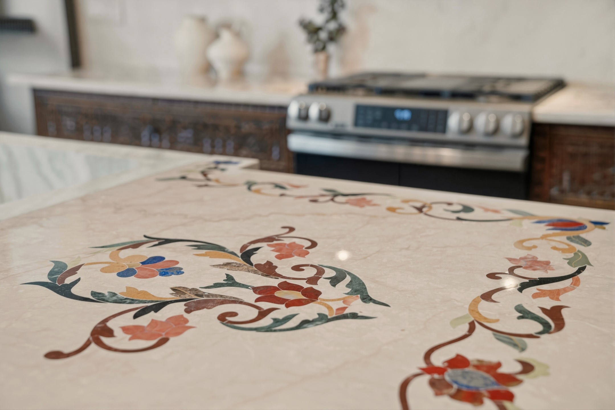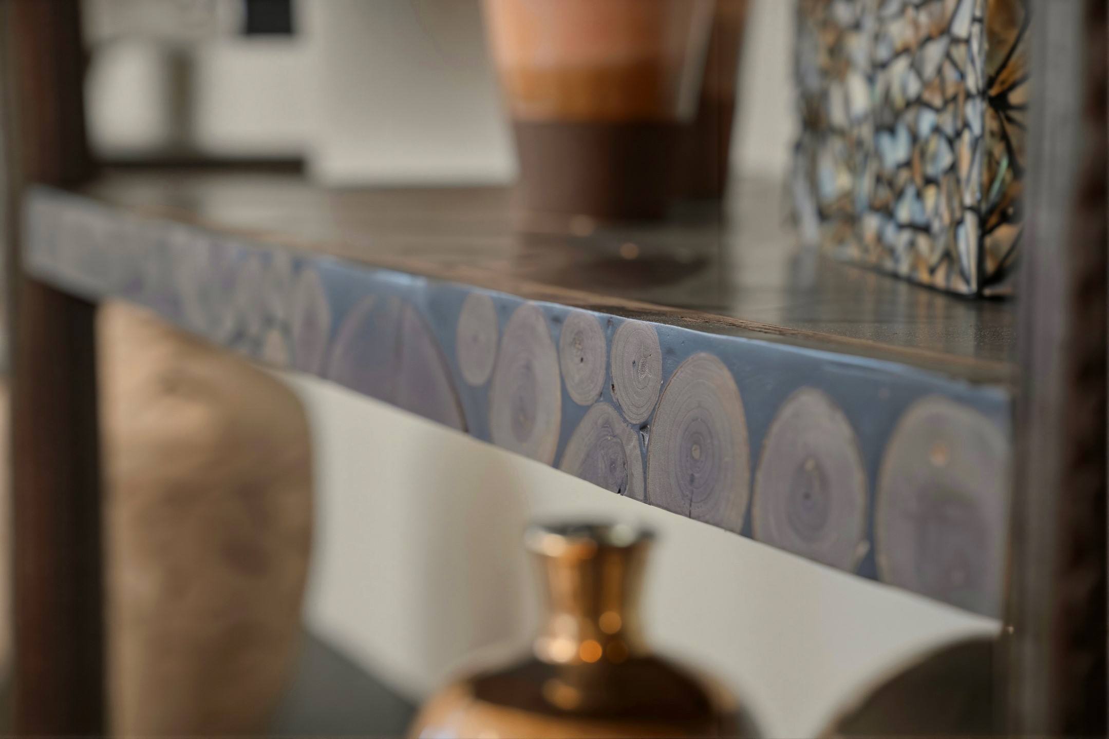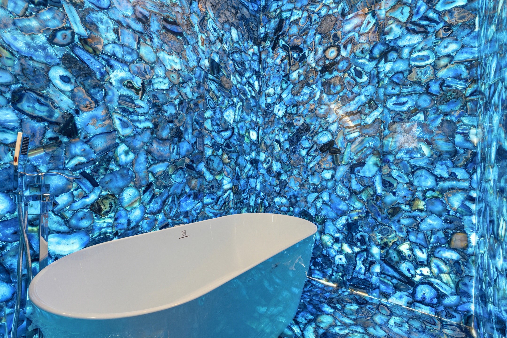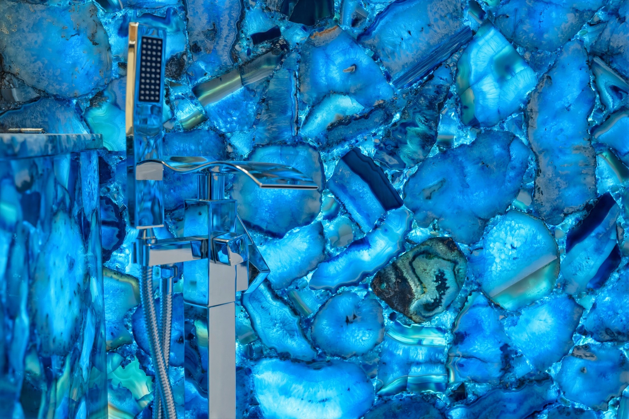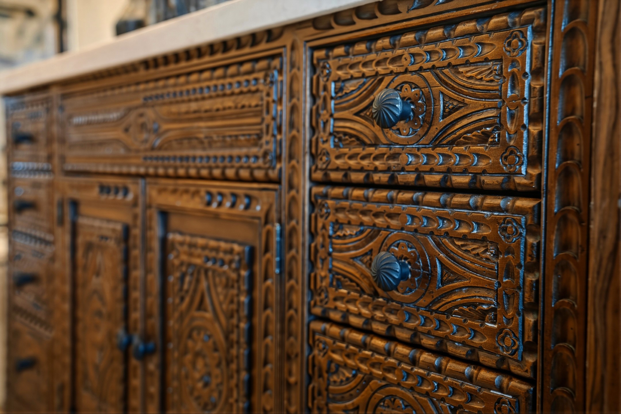 Old world craftsmanship blends seamlessly with modern luxury at the Estancia Collection, a unique compound located in the Baca Railyard District, minutes from Santa Fe's top galleries and restaurants. This latest vision of renowned developer Mitch Menaker, is where every room becomes a work of living art. Curated by artisans from around the world, using hand cut semi-precious stone, tiles, iron, and rare wood finishes creates a truly immersive and peaceful experience, as if being hugged by nature. As you enter the sanctuary, a profound sensory experience awaits: a 20-foot Anasazi-style wall creates awe and naturally anchors the home. Inside are hand-carved teak doors, alder kitchen cabinets artisan-crafted in Mexico, and Italian marble countertops inlaid with semi-precious stone, creating a fine art masterpiece. The open concept living area features a 250-year-old triple-arch entertainment center that mimics the arcade of an ancient palace. Ascending the staircase is like gliding through a canyon of stone to the bedroom suites above. The primary bedroom greets you through a charming speakeasy door. This light-filled sanctuary features a fireplace, an antique carved wooden ceiling, a wet bar and a one of a kind spa-like bathroom with blue agate sinks, set on backlit white onyx countertops. The tub/shower, surrounded by stunning backlit blue agate panels, creates a luxurious and luminous retreat. The second light-filled bedroom features a bathroom with a hand-carved Mexican vanity and petrified wood sink atop a white onyx counter. The museum-quality shower/tub is framed in petrified wood squares, hand-assembled to create a puzzle pattern.The laundry room, located on the 2nd floor includes a dog shower covered with "happy dog" faces on each hand cut tile. Blending ancient techniques with the expert hands that brought them to life, the developer's vision has created the most unique visual and artistic sanctuary Santa Fe has seen in years.
