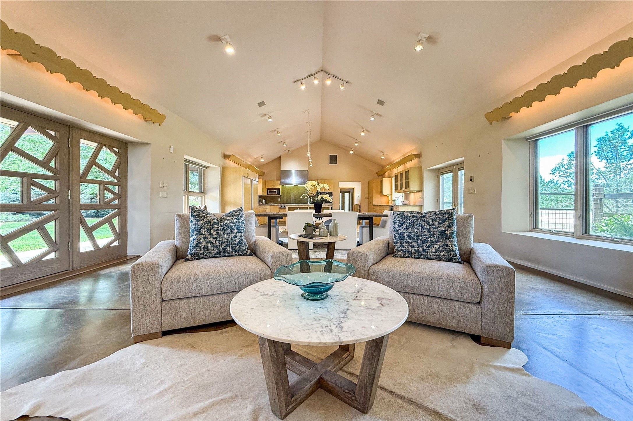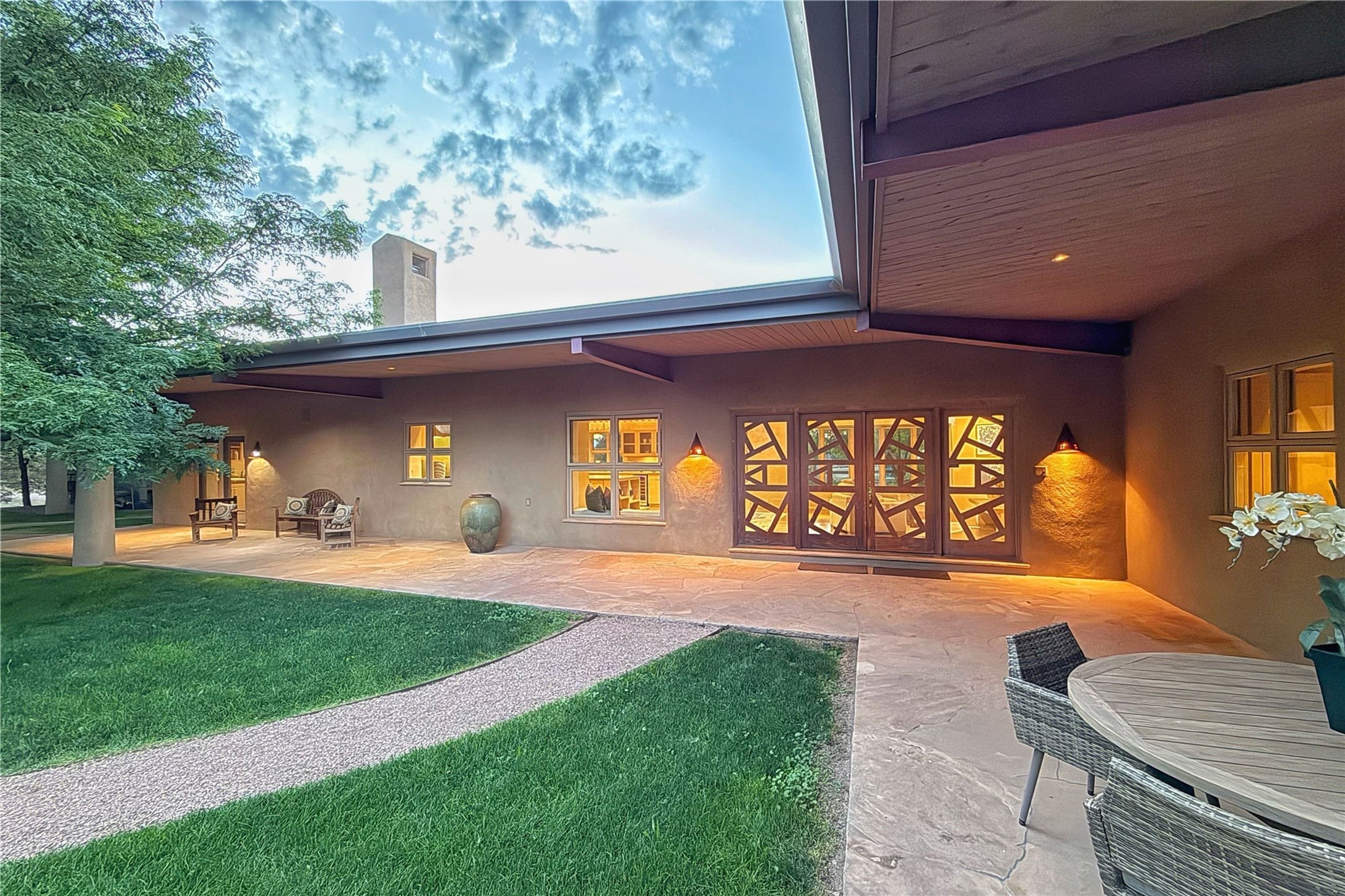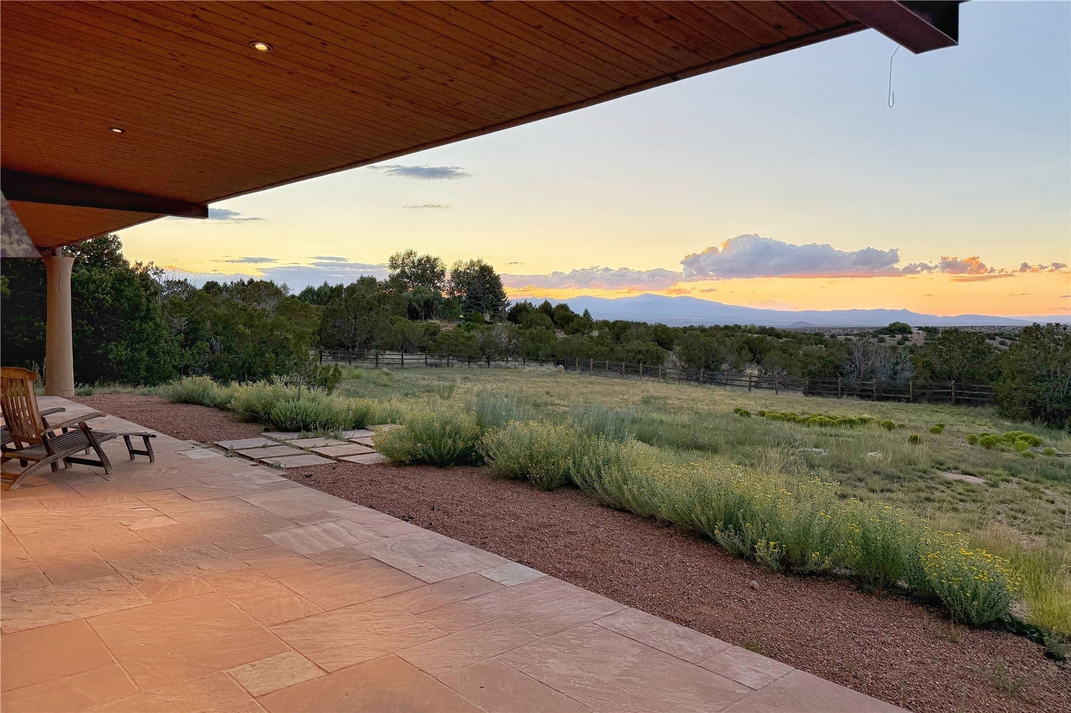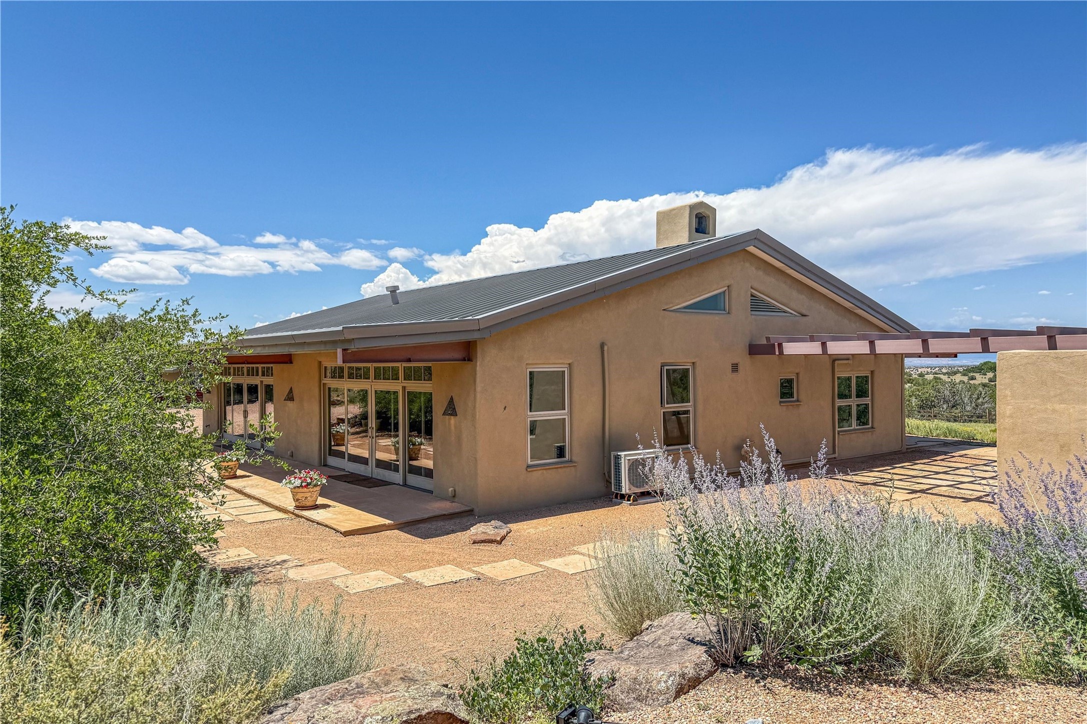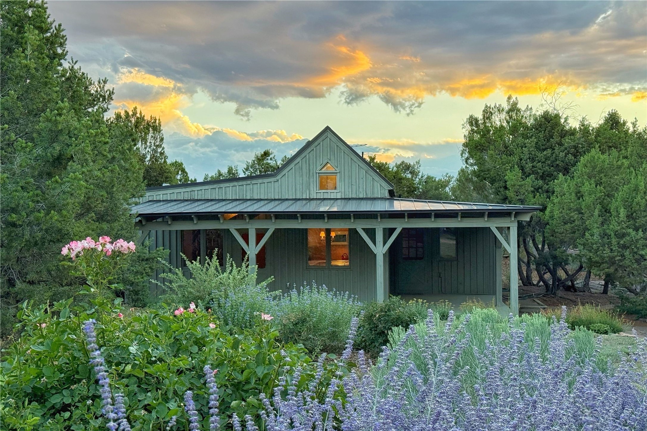 This serene La Tierra Nueva compound, with three distinct residences totaling 7,341 sq. feet of living space. Designed by renowned architect, Lila DeWindt, this lush oasis boasts mature landscaping in a serene, country-like setting with Sangre and Jemez mountain views, 11.85 acres, and vegetable and perennial gardens. The 3,982 sq. foot single level main residence features a blend of timeless Northern NM and modern design, a dramatic high-pitched roof, double-sided stone fireplace, copious natural light, and large windows that capture breathtaking Sangre views. With a casual sitting area open to the kitchen, a separate living room with a huge picture window facing the Sangres, a media room/library and bedrooms that also boast mountain views, this residence is truly stunning. The primary suite's tub overlooks a flower garden. An open-concept kitchen is centered around a large island, perfect for hosting. The home enjoys an expansive front portal and multiple patio spaces. The charming 1,334 sq. foot, two bedroom guest house includes a chef's kitchen, Saltillo tile flooring, a wood-burning stove, and wrap-around porch. The impressive 2,025 sq. foot modern 1-bedroom studio has an open living/dining/kitchen area, and portal. The adult rec-room, with built-in bar, is ideal as live/work space, artist studio/music room, car enthusiast or conversion to a barn, perfect for large gatherings and relaxing with sunset Jemez views. Beneath the studio, lays a remarkable walk-in wine cellar for approx. 5000 bottles with wine tasting area. The property also includes a generous fenced dog area and room for horses. A truly peaceful, secluded atmosphere just 18 minutes from the heart of Santa Fe or the airport, and 8 minutes to The Club at Las Campanas. La Tierra Nueva is a coveted, gated, equestrian-friendly community with access to over 60,000 acres BLM land, and tennis/pickleball court. Ideal for multigenerational living, wine lover, workshop, or patron of the arts. 7 Goodnight Trail West is a true hidden gem.