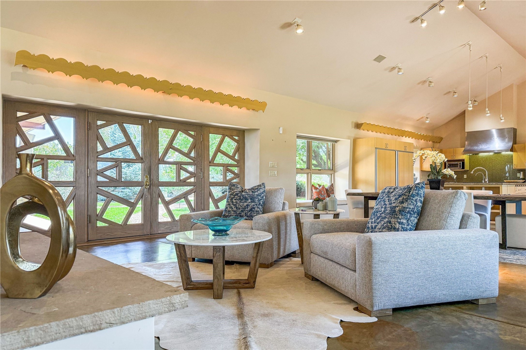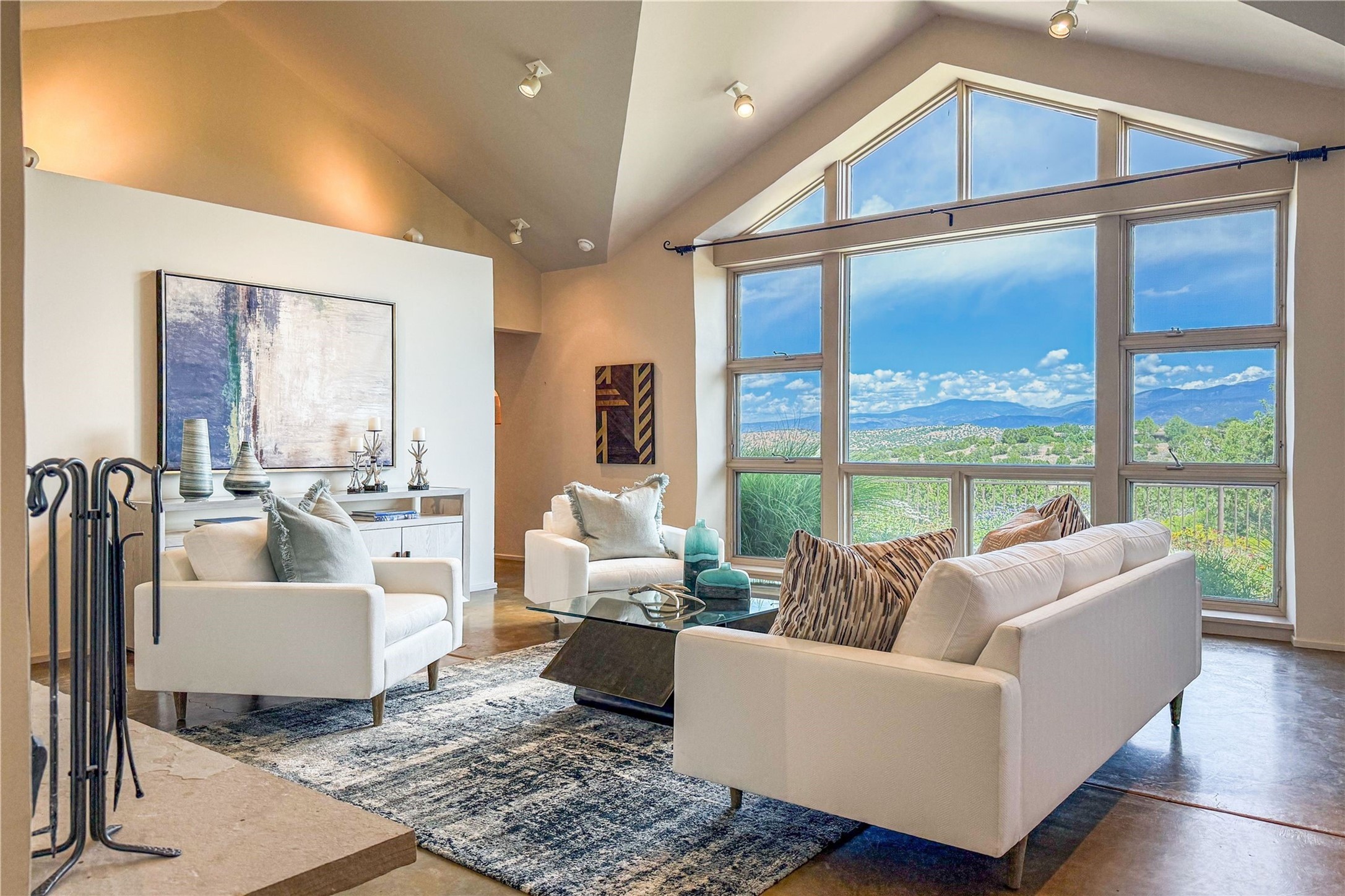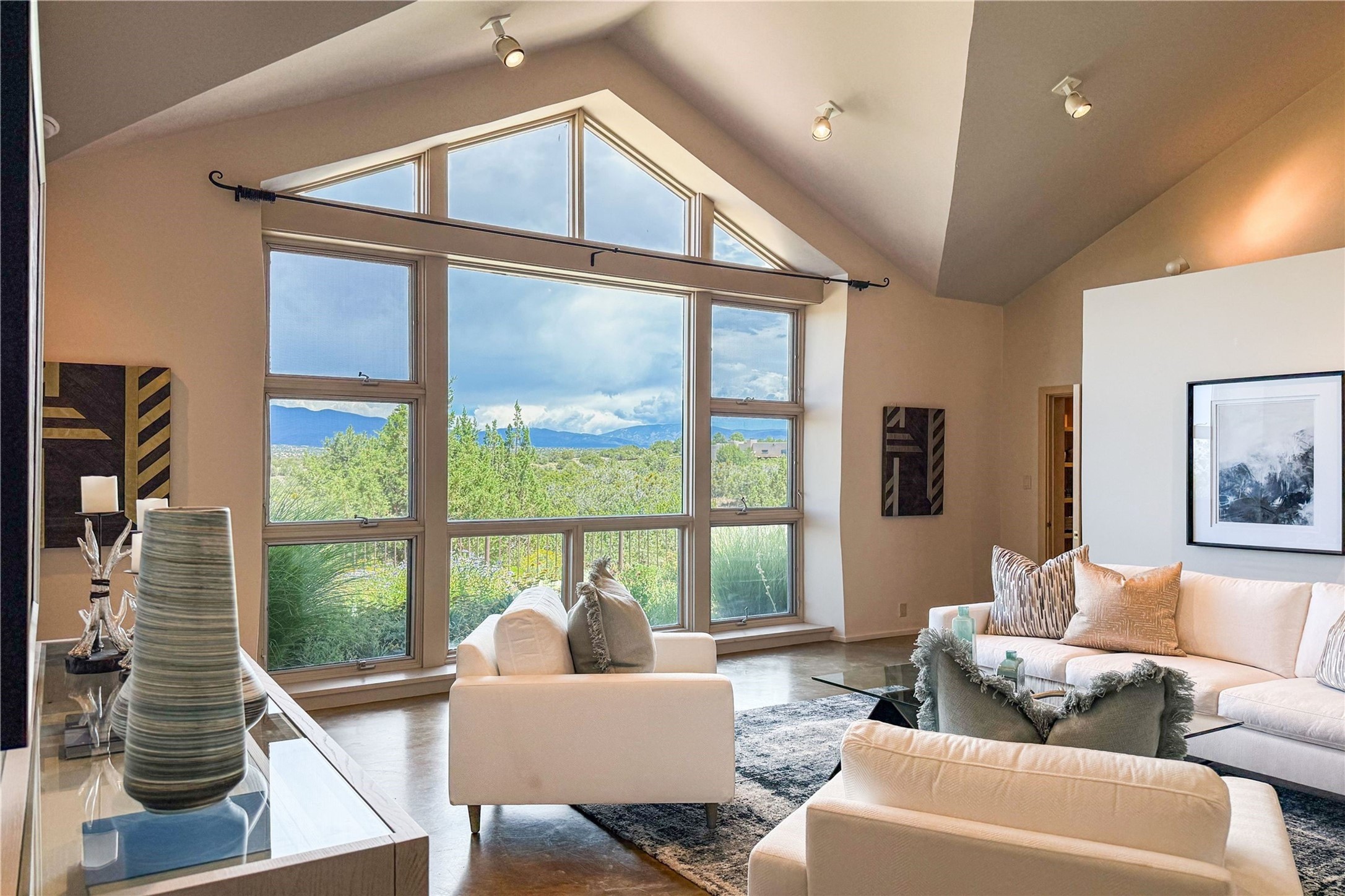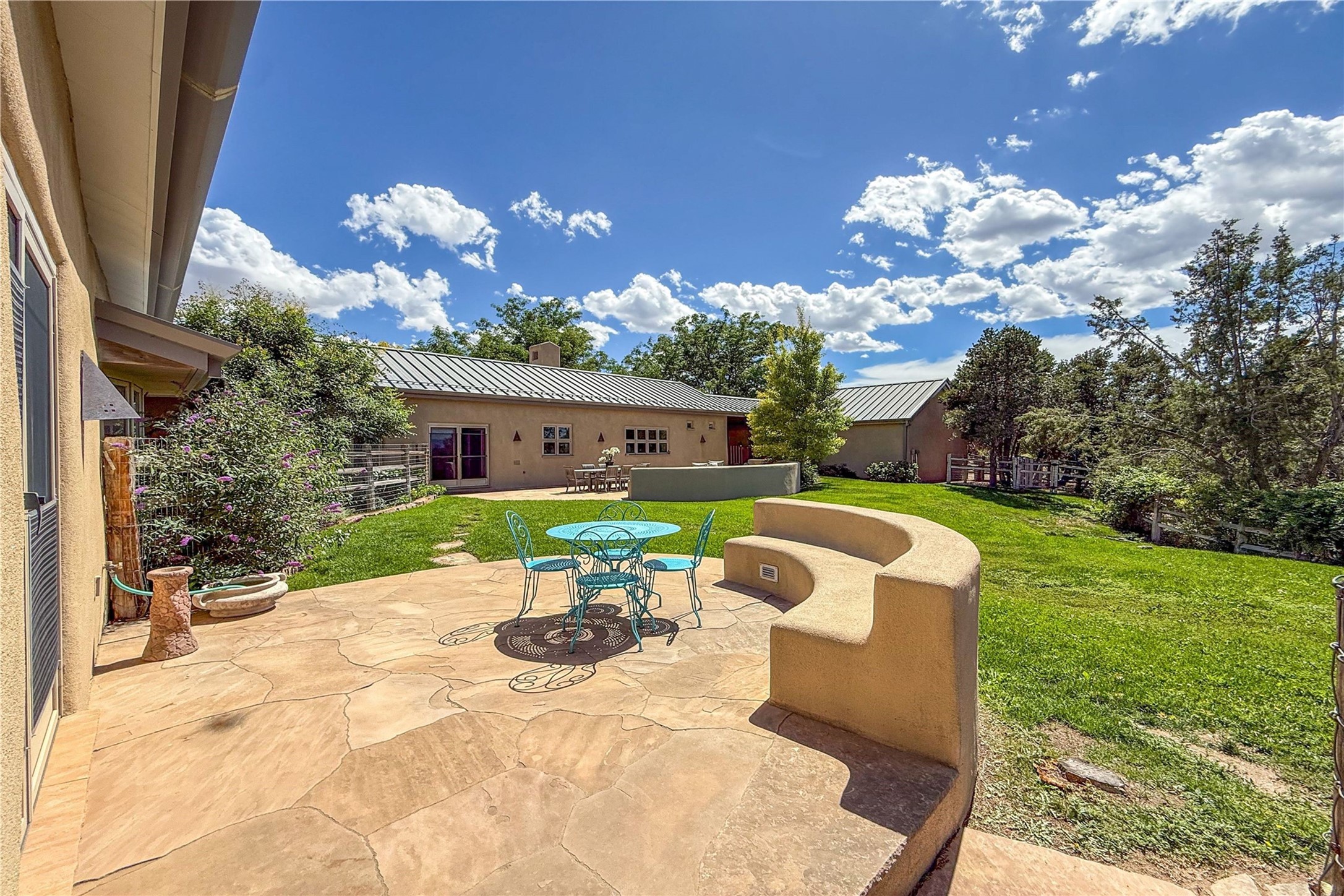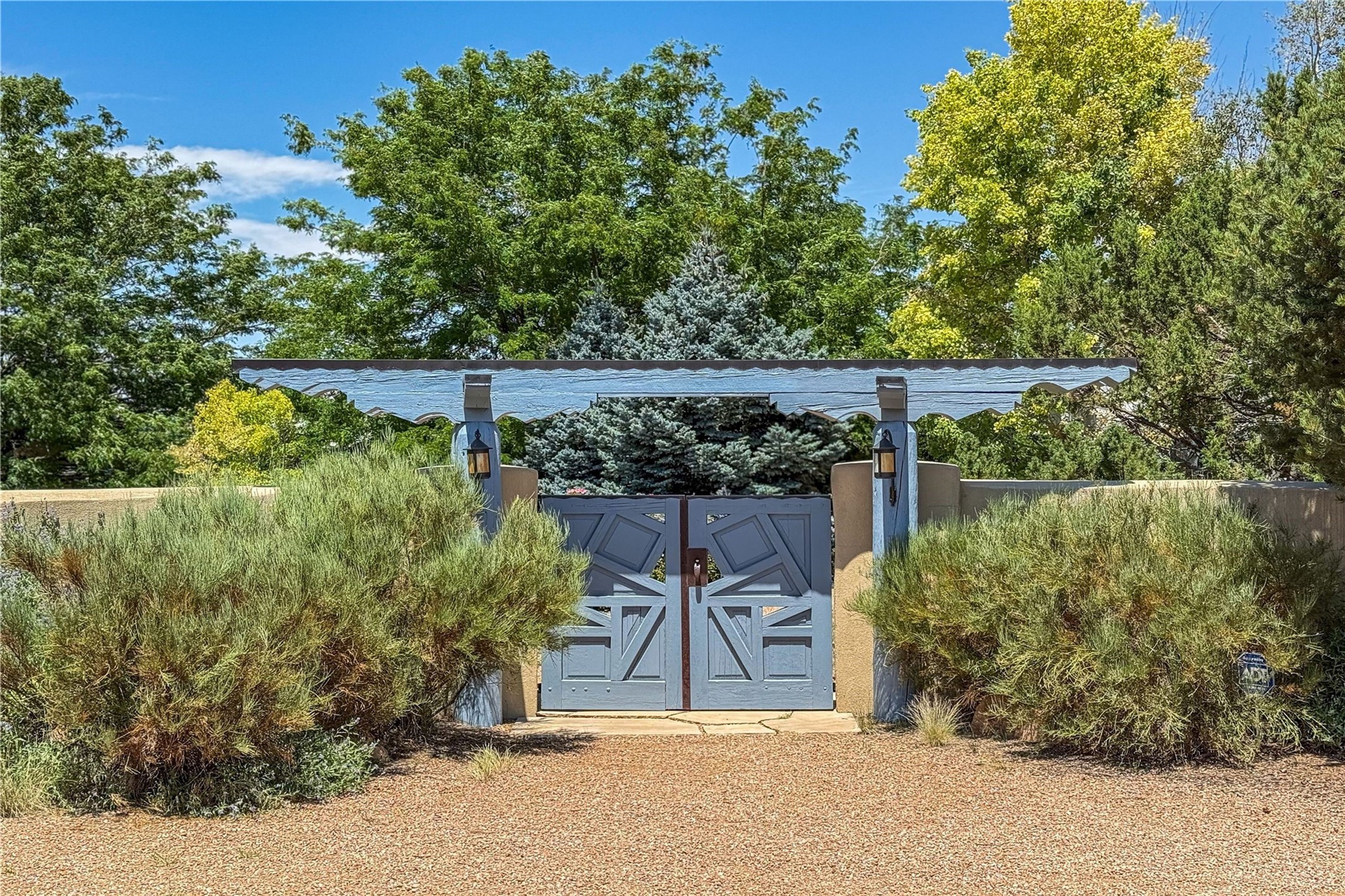 This serene La Tierra Nueva compound, with three distinct residences totaling 7,341 sq. feet of living space. Designed by renowned architect, Lila DeWindt, this lush oasis boasts mature landscaping in a serene, country-like setting with Sangre and Jemez mountain views, 11.85 acres, and vegetable and perennial gardens. The 3,982 sq. foot single level main residence features a blend of timeless Northern NM and modern design, a dramatic high-pitched roof, double-sided stone fireplace, copious natural light, and large windows that capture breathtaking Sangre views. With a casual sitting area open to the kitchen, a separate living room with a huge picture window facing the Sangres, a media room/library and bedrooms that also boast mountain views, this residence is truly stunning. The primary suite's tub overlooks a flower garden. An open-concept kitchen is centered around a large island, perfect for hosting. The home enjoys an expansive front portal and multiple patio spaces. The charming 1,334 sq. foot, two bedroom guest house includes a chef's kitchen, Saltillo tile flooring, a wood-burning stove, and wrap-around porch. The impressive 2,025 sq. foot modern 1-bedroom studio has an open living/dining/kitchen area, and portal. The adult rec-room, with built-in bar, is ideal as live/work space, artist studio/music room, car enthusiast or conversion to a barn, perfect for large gatherings and relaxing with sunset Jemez views. Beneath the studio, lays a remarkable walk-in wine cellar for approx. 5000 bottles with wine tasting area. The property also includes a generous fenced dog area and room for horses. A truly peaceful, secluded atmosphere just 18 minutes from the heart of Santa Fe or the airport, and 8 minutes to The Club at Las Campanas. La Tierra Nueva is a coveted, gated, equestrian-friendly community with access to over 60,000 acres BLM land, and tennis/pickleball court. Ideal for multigenerational living, wine lover, workshop, or patron of the arts. 7 Goodnight Trail West is a true hidden gem.
