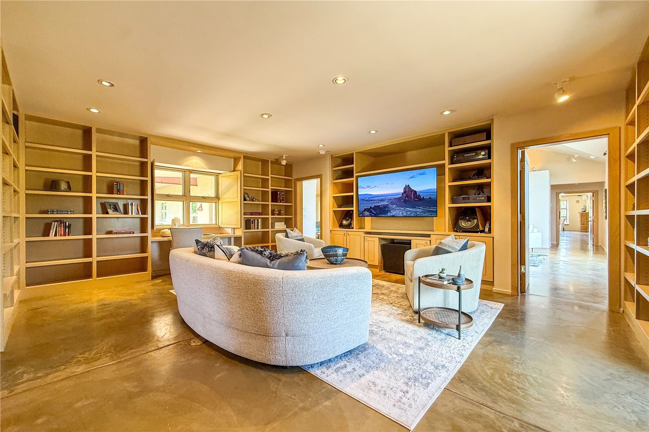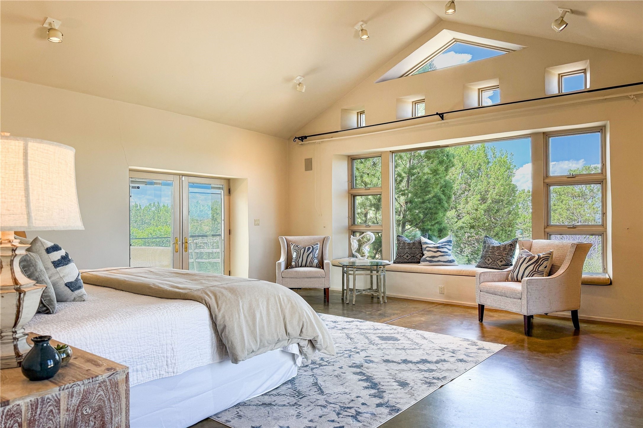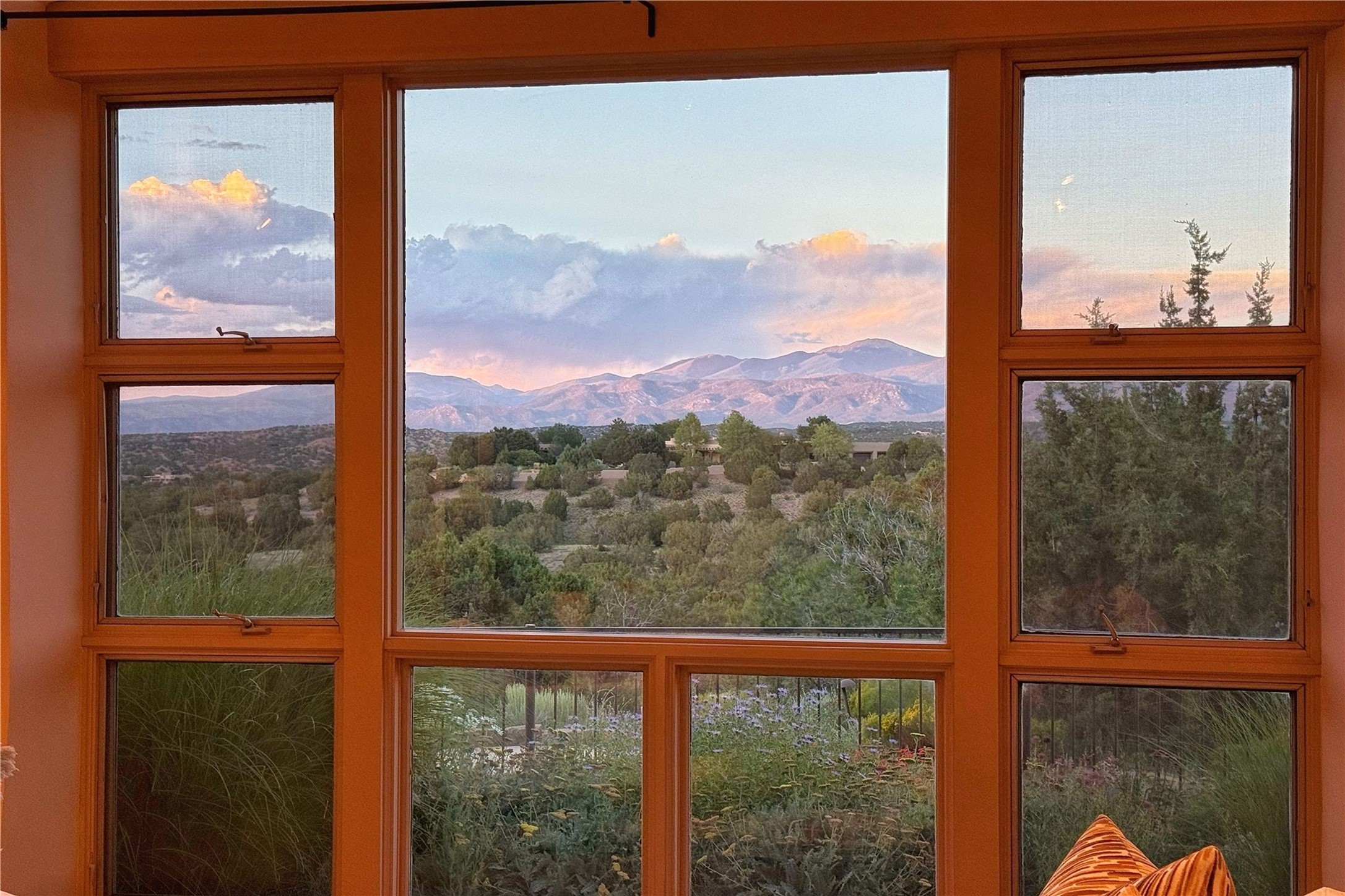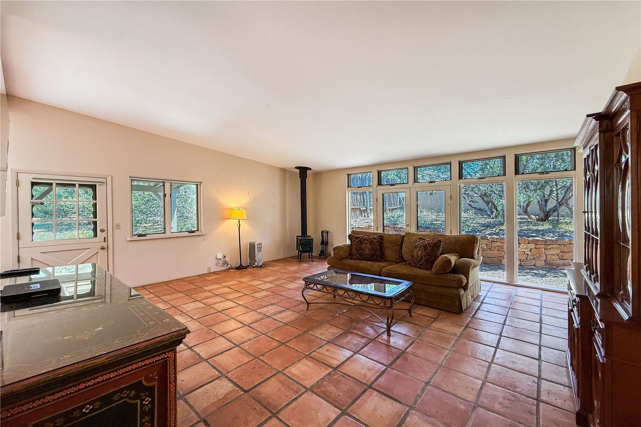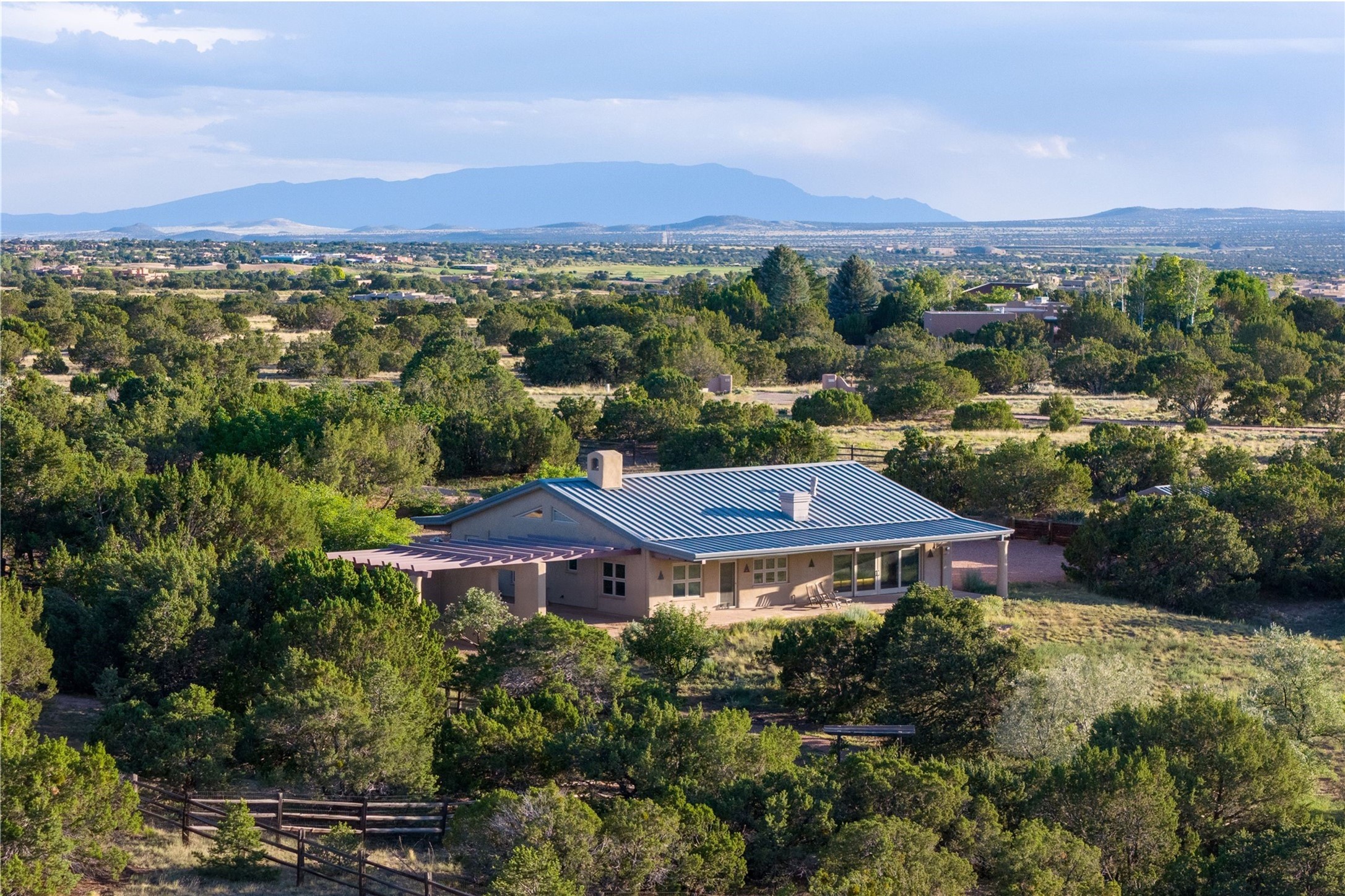 This serene La Tierra Nueva compound, with three distinct residences totaling 7,341 sq. feet of living space. Designed by renowned architect, Lila DeWindt, this lush oasis boasts mature landscaping in a serene, country-like setting with Sangre and Jemez mountain views, 11.85 acres, and vegetable and perennial gardens. The 3,982 sq. foot single level main residence features a blend of timeless Northern NM and modern design, a dramatic high-pitched roof, double-sided stone fireplace, copious natural light, and large windows that capture breathtaking Sangre views. With a casual sitting area open to the kitchen, a separate living room with a huge picture window facing the Sangres, a media room/library and bedrooms that also boast mountain views, this residence is truly stunning. The primary suite's tub overlooks a flower garden. An open-concept kitchen is centered around a large island, perfect for hosting. The home enjoys an expansive front portal and multiple patio spaces. The charming 1,334 sq. foot, two bedroom guest house includes a chef's kitchen, Saltillo tile flooring, a wood-burning stove, and wrap-around porch. The impressive 2,025 sq. foot modern 1-bedroom studio has an open living/dining/kitchen area, and portal. The adult rec-room, with built-in bar, is ideal as live/work space, artist studio/music room, car enthusiast or conversion to a barn, perfect for large gatherings and relaxing with sunset Jemez views. Beneath the studio, lays a remarkable walk-in wine cellar for approx. 5000 bottles with wine tasting area. The property also includes a generous fenced dog area and room for horses. A truly peaceful, secluded atmosphere just 18 minutes from the heart of Santa Fe or the airport, and 8 minutes to The Club at Las Campanas. La Tierra Nueva is a coveted, gated, equestrian-friendly community with access to over 60,000 acres BLM land, and tennis/pickleball court. Ideal for multigenerational living, wine lover, workshop, or patron of the arts. 7 Goodnight Trail West is a true hidden gem.