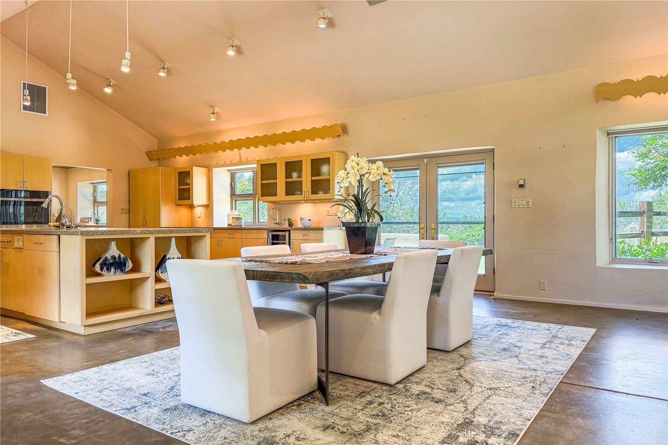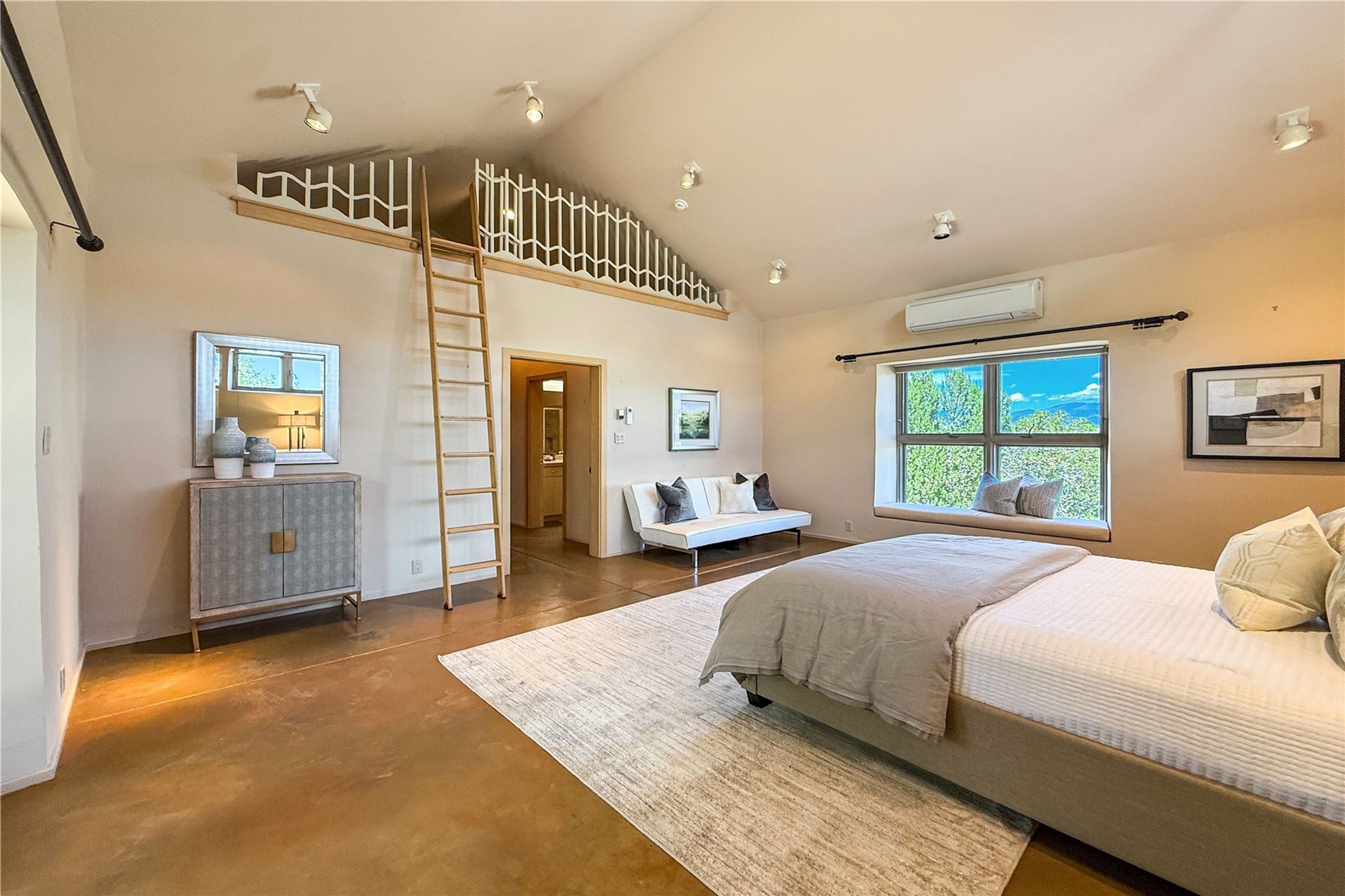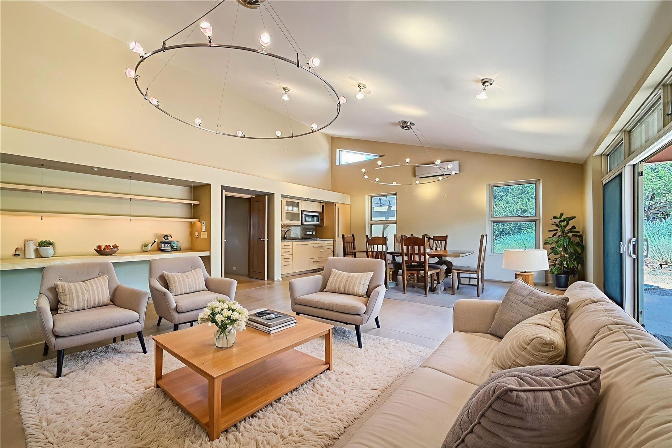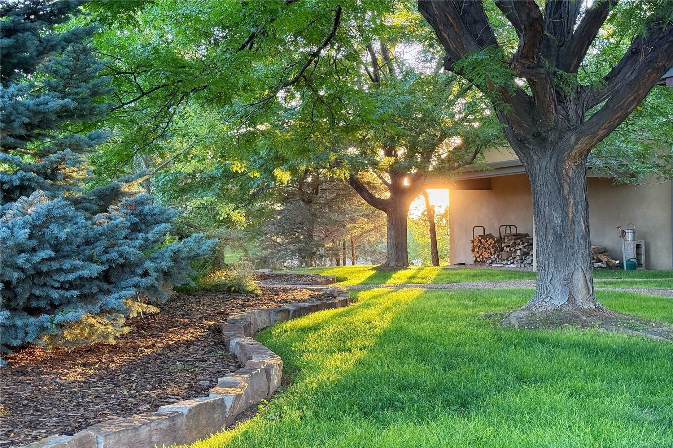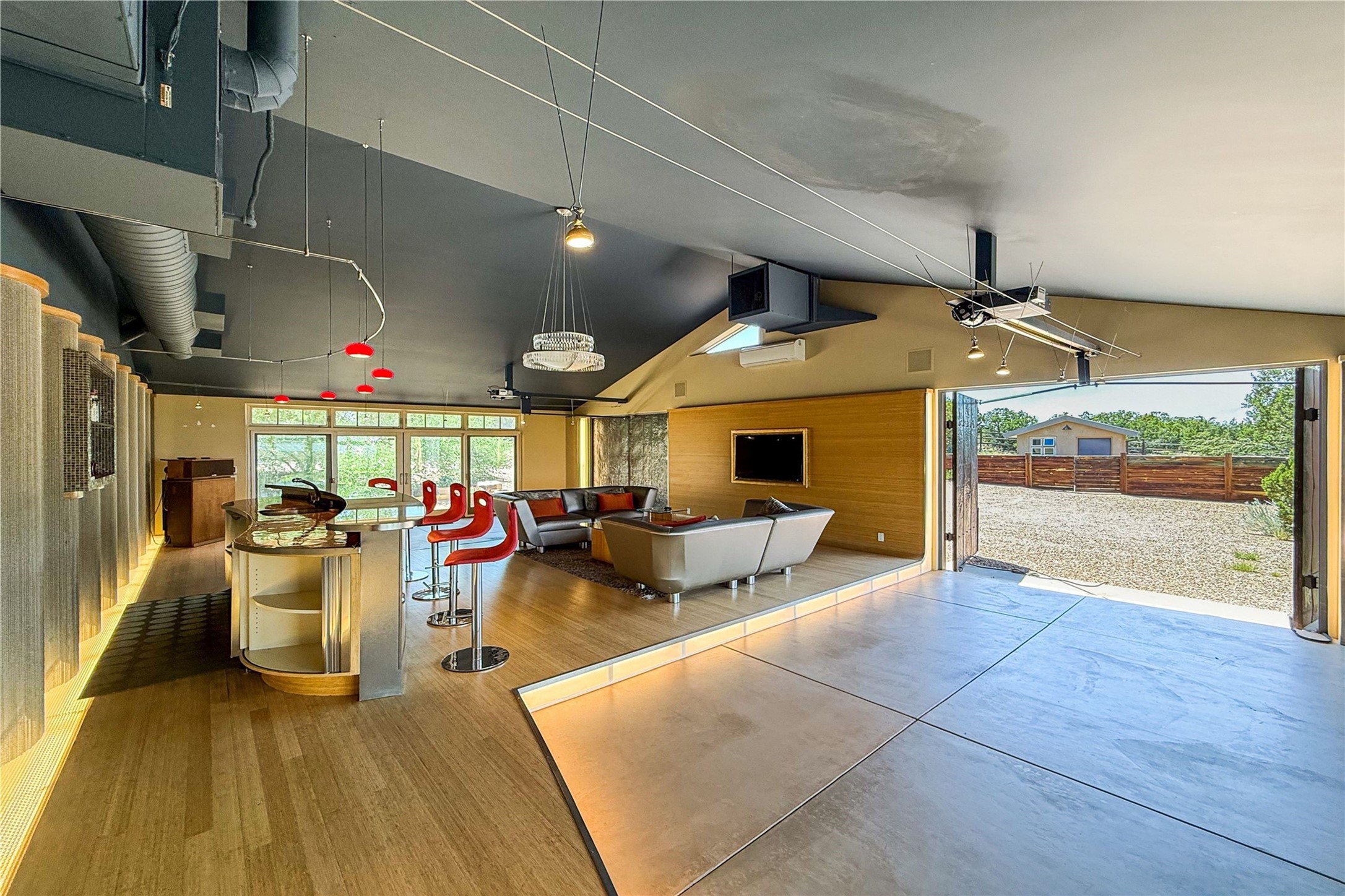 This serene La Tierra Nueva compound, with three distinct residences totaling 7,341 sq. feet of living space. Designed by renowned architect, Lila DeWindt, this lush oasis boasts mature landscaping in a serene, country-like setting with Sangre and Jemez mountain views, 11.85 acres, and vegetable and perennial gardens. The 3,982 sq. foot single level main residence features a blend of timeless Northern NM and modern design, a dramatic high-pitched roof, double-sided stone fireplace, copious natural light, and large windows that capture breathtaking Sangre views. With a casual sitting area open to the kitchen, a separate living room with a huge picture window facing the Sangres, a media room/library and bedrooms that also boast mountain views, this residence is truly stunning. The primary suite's tub overlooks a flower garden. An open-concept kitchen is centered around a large island, perfect for hosting. The home enjoys an expansive front portal and multiple patio spaces. The charming 1,334 sq. foot, two bedroom guest house includes a chef's kitchen, Saltillo tile flooring, a wood-burning stove, and wrap-around porch. The impressive 2,025 sq. foot modern 1-bedroom studio has an open living/dining/kitchen area, and portal. The adult rec-room, with built-in bar, is ideal as live/work space, artist studio/music room, car enthusiast or conversion to a barn, perfect for large gatherings and relaxing with sunset Jemez views. Beneath the studio, lays a remarkable walk-in wine cellar for approx. 5000 bottles with wine tasting area. The property also includes a generous fenced dog area and room for horses. A truly peaceful, secluded atmosphere just 18 minutes from the heart of Santa Fe or the airport, and 8 minutes to The Club at Las Campanas. La Tierra Nueva is a coveted, gated, equestrian-friendly community with access to over 60,000 acres BLM land, and tennis/pickleball court. Ideal for multigenerational living, wine lover, workshop, or patron of the arts. 7 Goodnight Trail West is a true hidden gem.