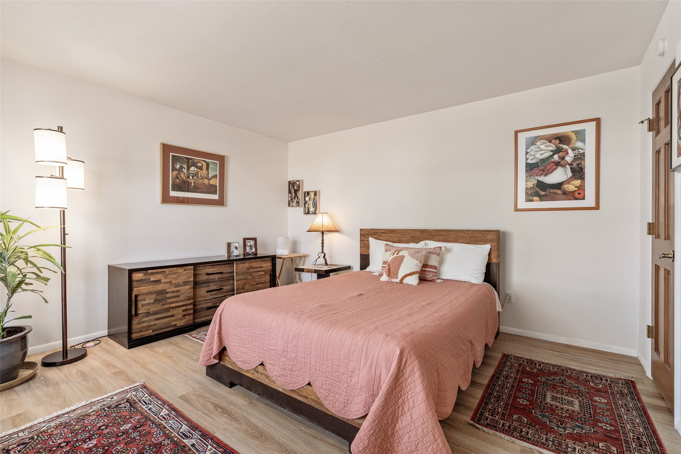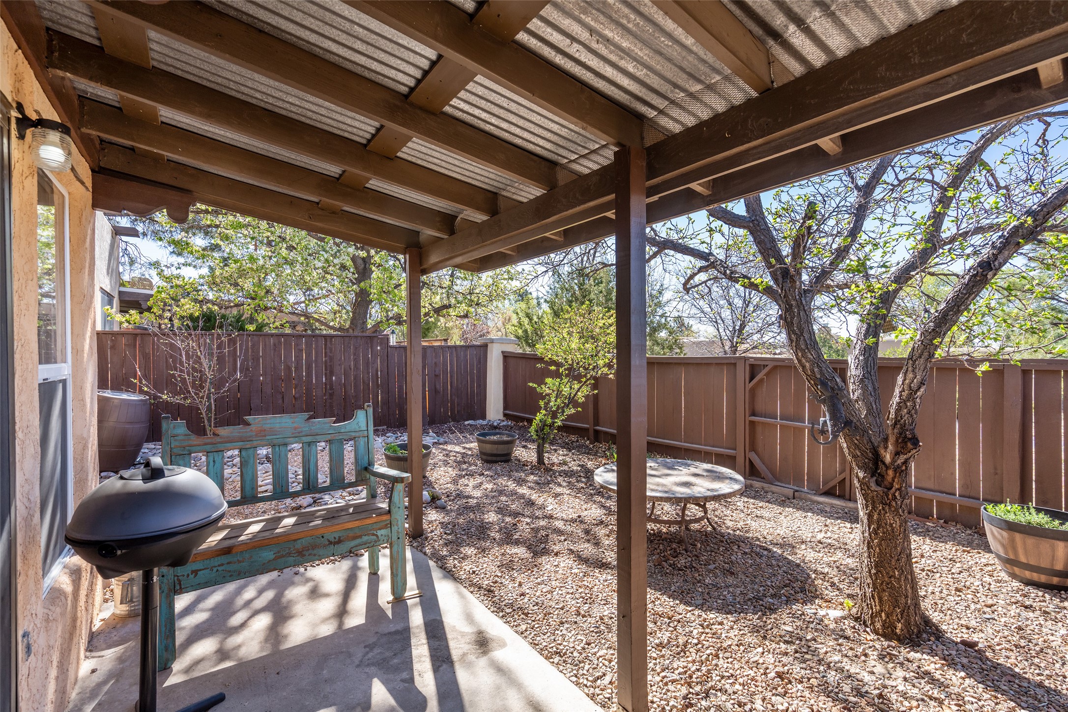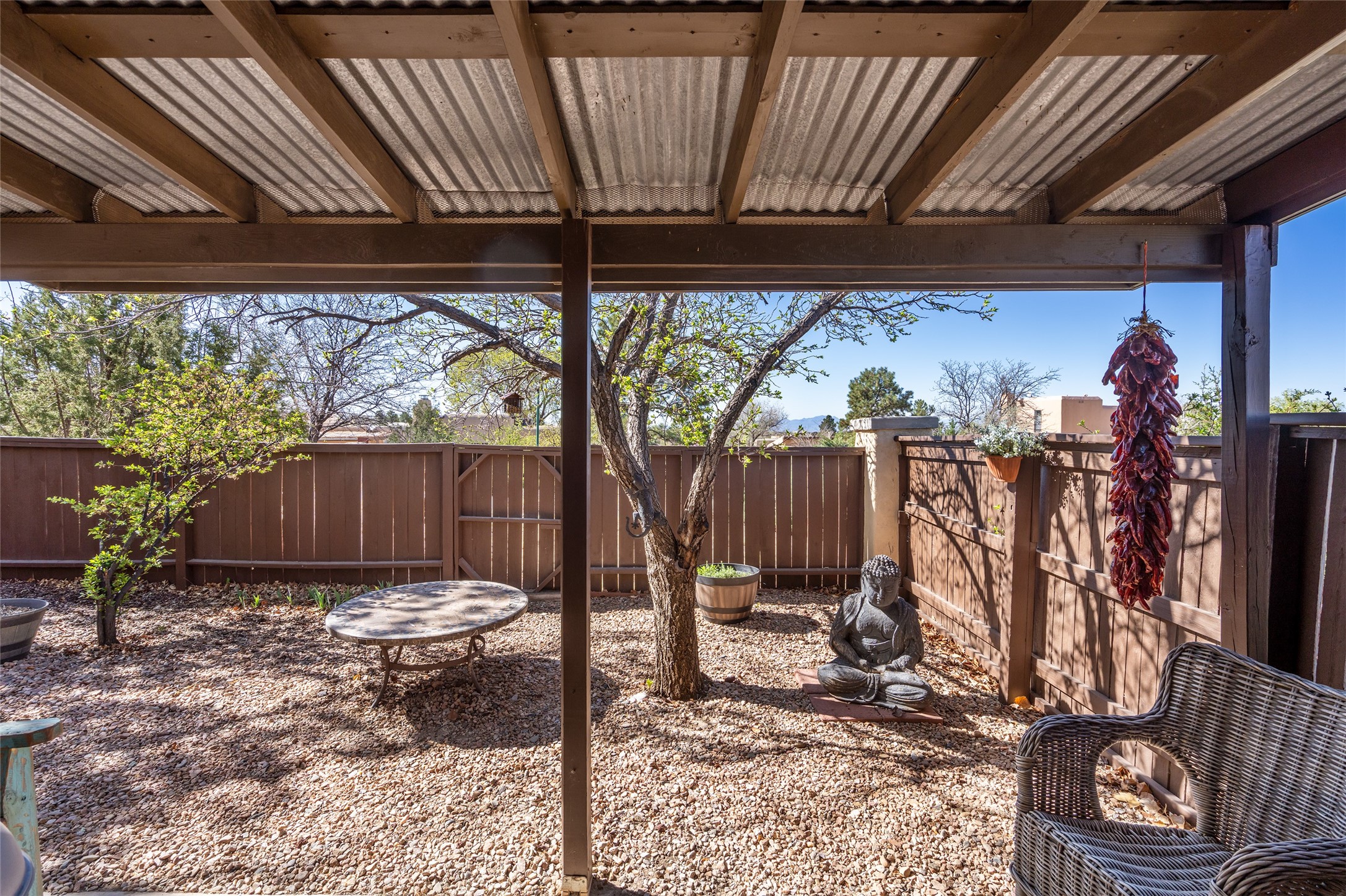 Enjoy your morning coffee or tea in the charming south-facing sunroom of this beautifully updated Park Plazas end-unit gem. This single-level Santa Fe home features recently installed wood-laminate flooring, a brand-new A/C system, and a modernized walk-in shower. The home offers two spacious bedrooms and a fully updated kitchen with all new appliances. Stay cozy during the colder months with the inviting wood-burning stove, perfect to warm winter days and nights. Additional highlights include a two-car garage and community open space beside the fenced backyard. This property truly has so much to offer--Come See!