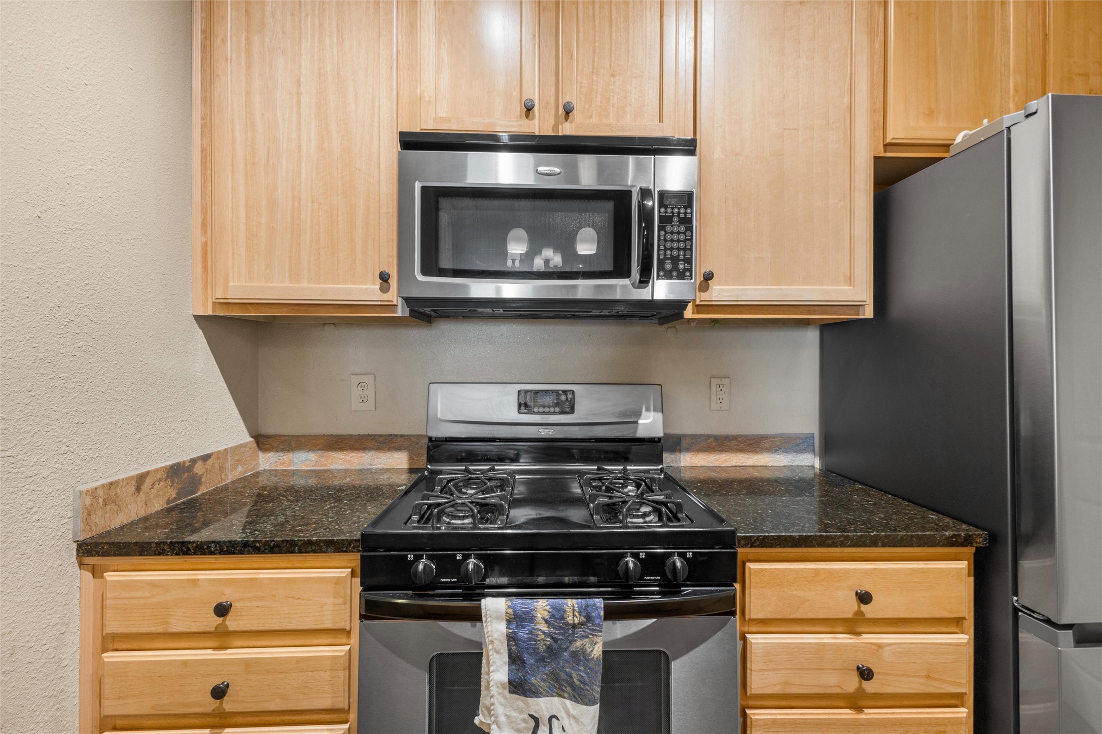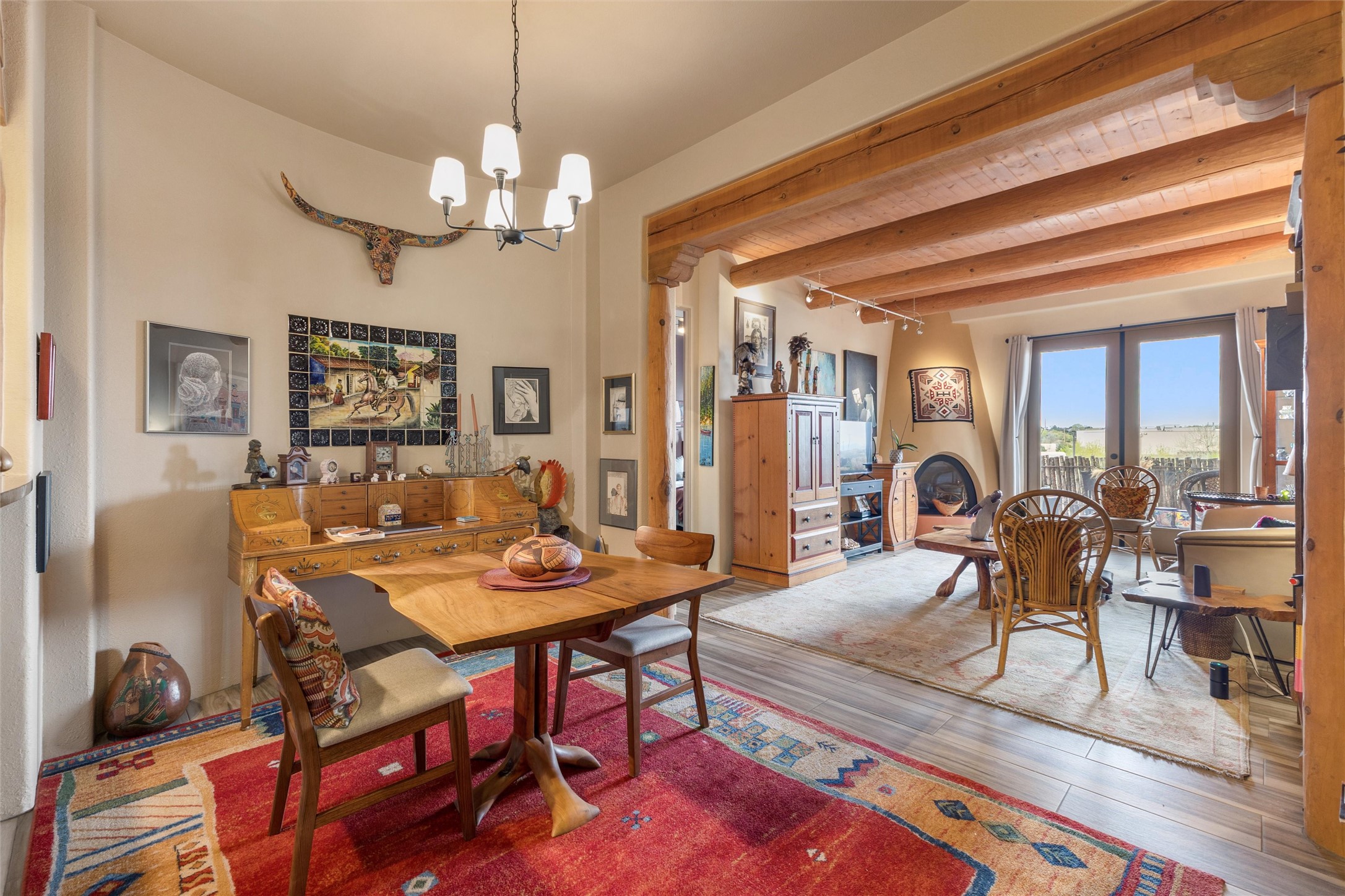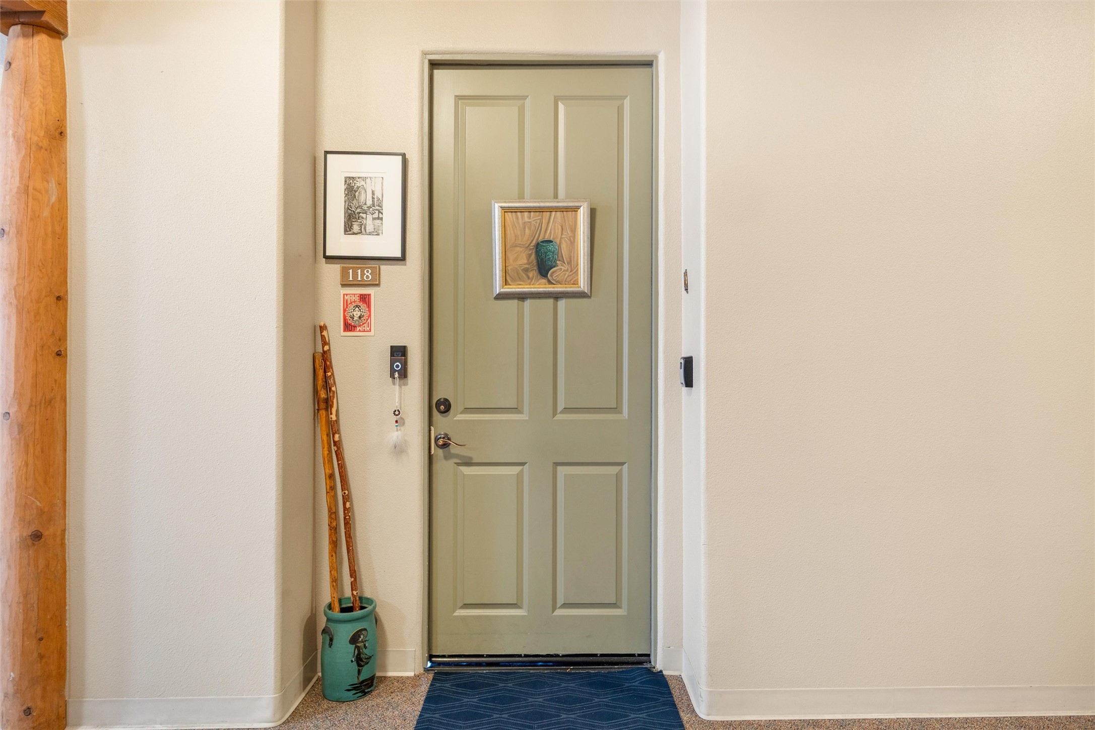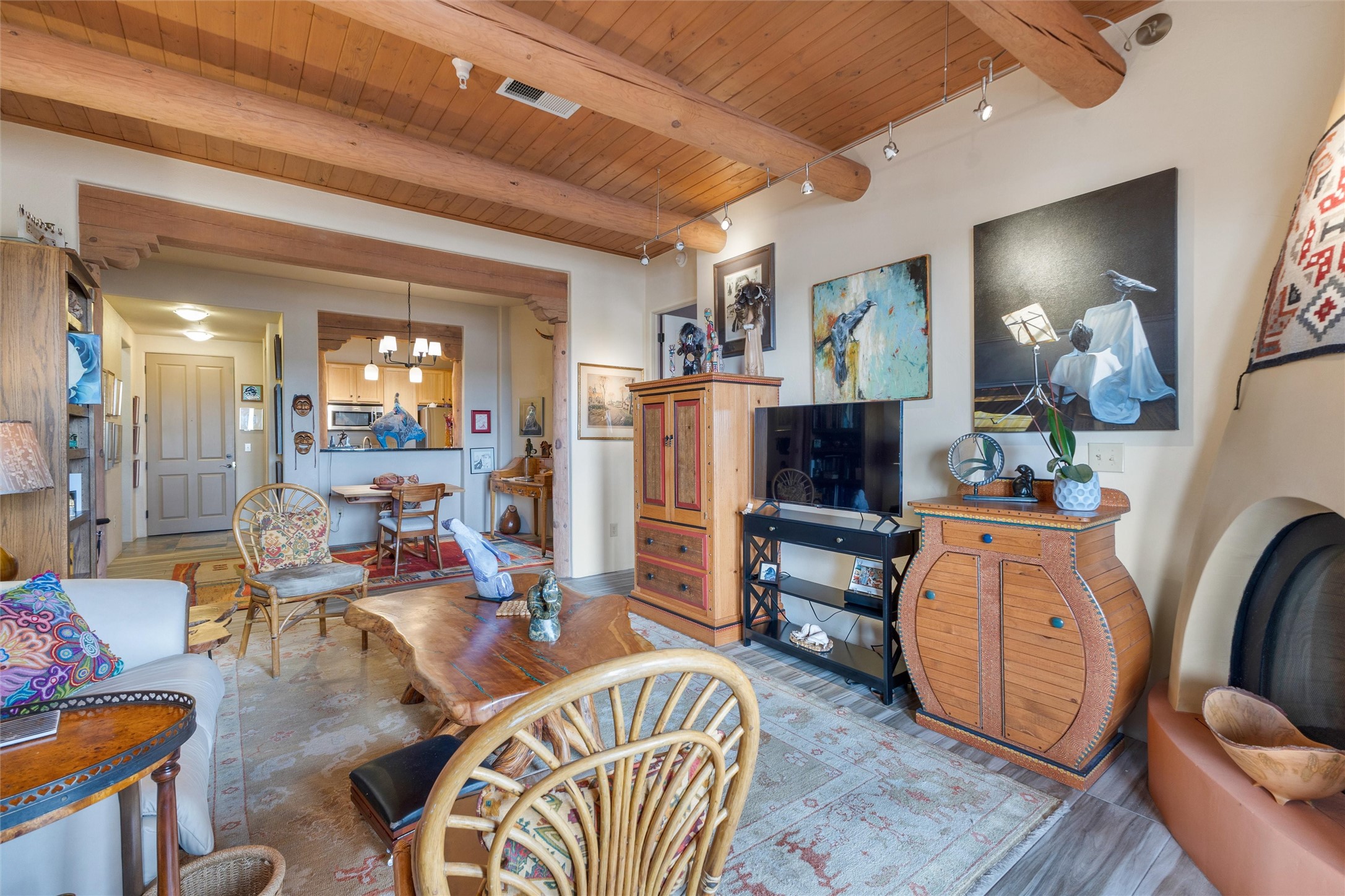 This corner, ground-floor condo at The Alameda offers a rare blend of privacy, natural light, and effortless living. Positioned at the edge of the building, the unit feels open and quiet, with a large, private, shaded balcony, creating a peaceful setting to relax, read, or work from home.Inside, the living space is warm and inviting, filled with soft natural light and centered around a gas kiva fireplace. French doors connect the indoor and outdoor spaces, while the updated kitchen features stainless steel appliances and granite countertops, designed for both everyday use and easy entertaining.The primary suite is well-appointed with California Closets for thoughtful organization, along with a soaking tub and separate shower. The second bedroom offers great light, a generous closet, and its own bathroom with a walk-in shower, providing comfort and separation for guests.A direct-entry storage unit accessed through the office nook adds a practical and hard-to-find convenience. The ground-floor location allows for easy access to parking.The Alameda is known for its well-maintained grounds and amenities, including gated parking, a pool, fitness center, BBQ areas, and a reservable community space for gatherings. A low-maintenance option that allows you to enjoy Santa Fe without the upkeep.