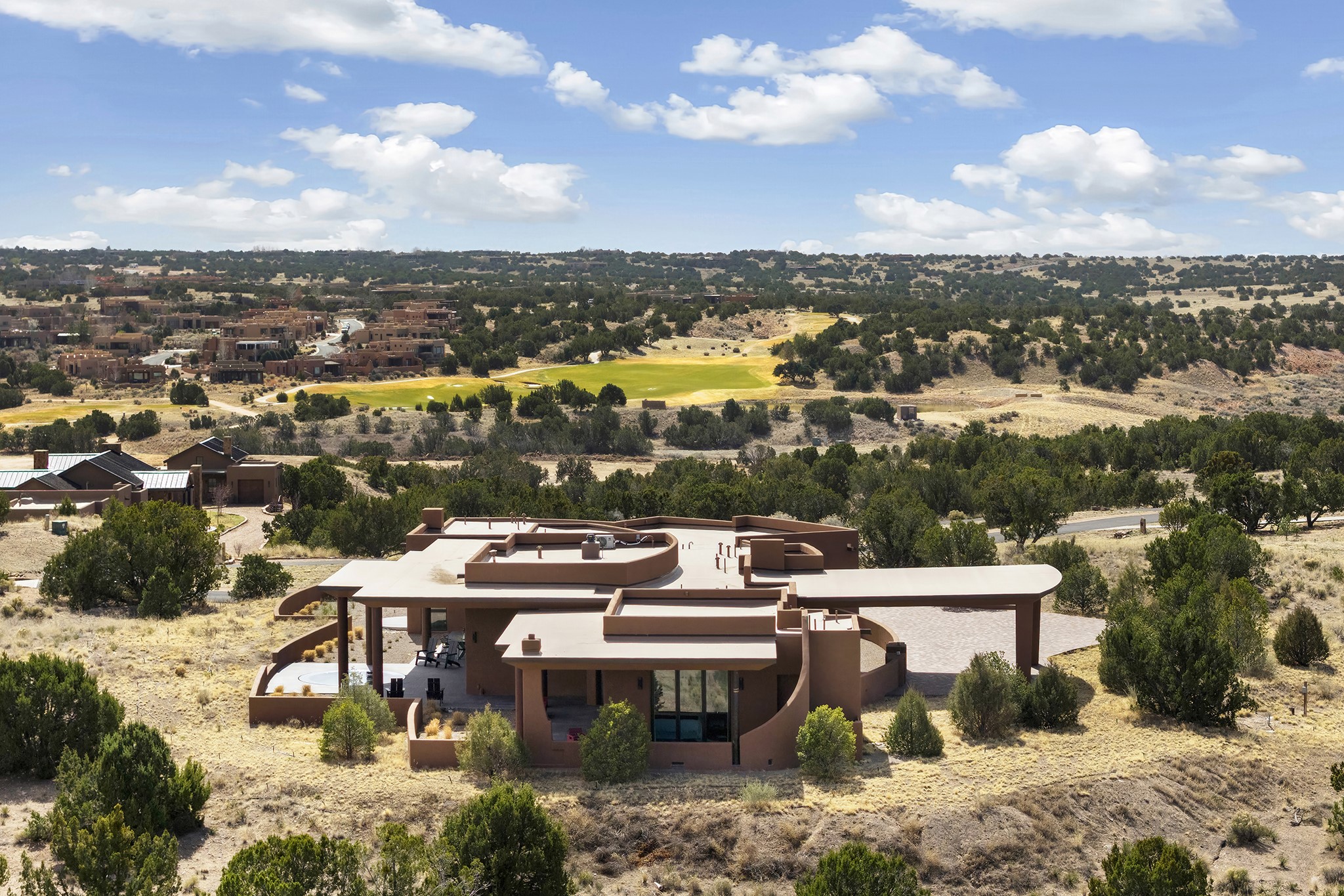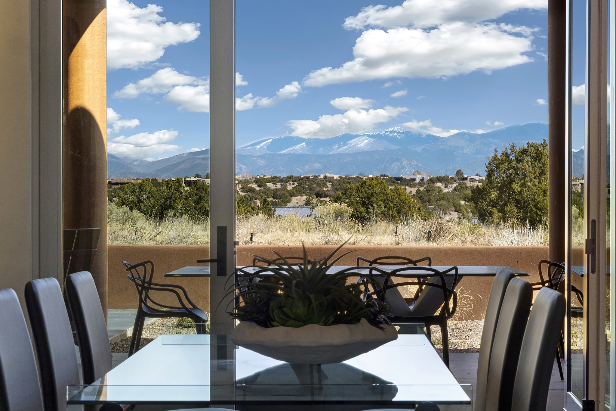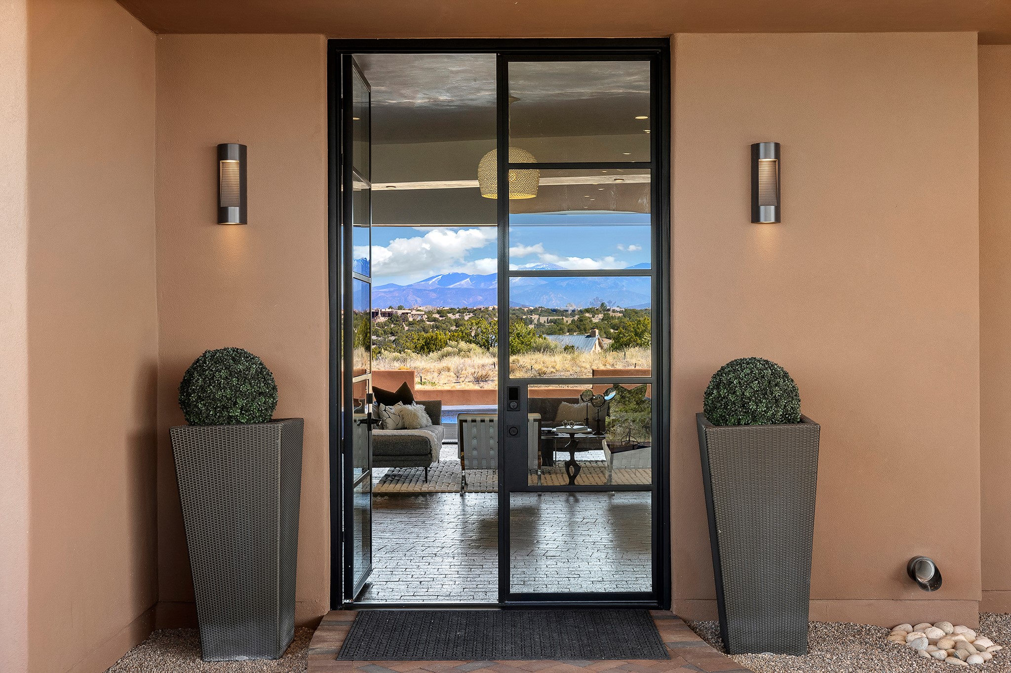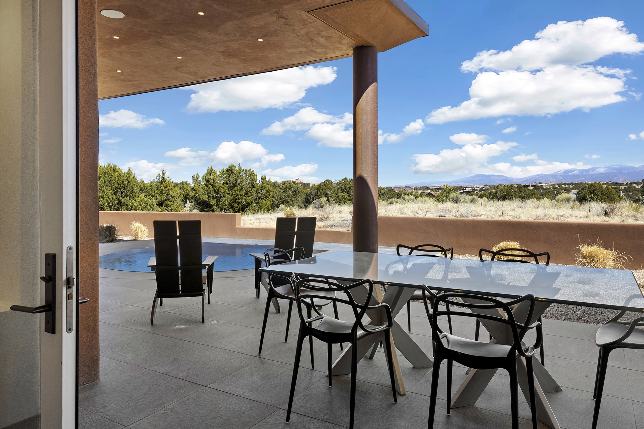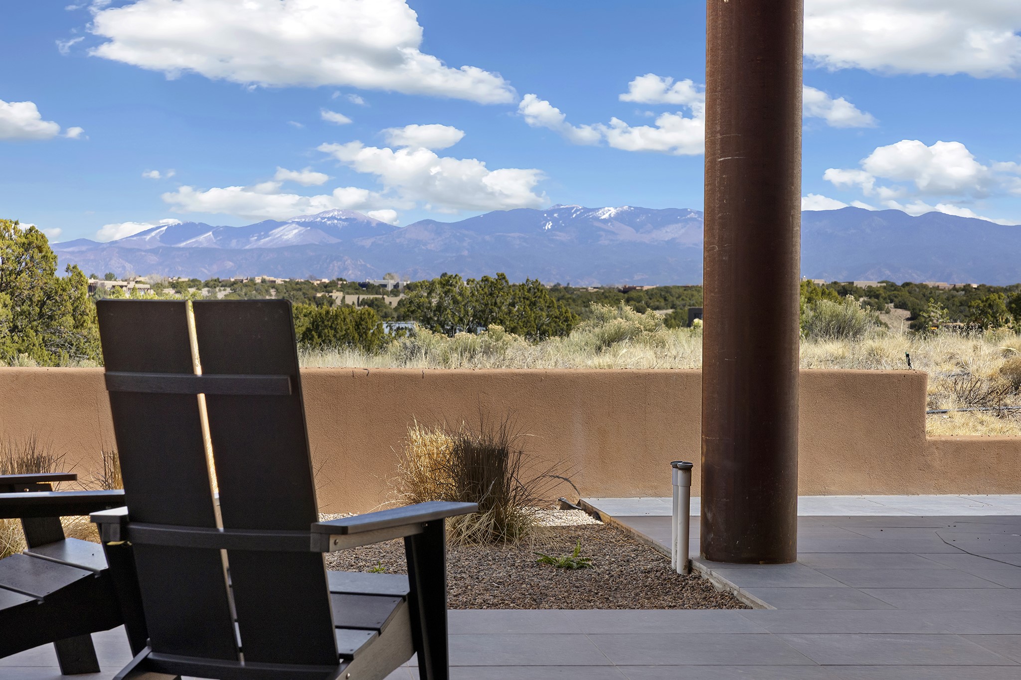 An experience with no parallel - relaxed but elegant living at its best. Unstoppable sunrise and sunset views stretch across the Sangre de Cristo and Jemez Mountains, uninterrupted and ever-changing, with no distractions to take away from privacy, the exclusivity, and the quality of this property. 17 Hacienda Vaquero is a Contemporary Pueblo by Native Son Builders, set within the Estancias of Las Campanas. More than 4,200 square feet of refined interior space pairs with over 1,600 square feet of outdoor living, where covered portals, a kiva fireplace, and an in ground spa with waterfall--and infinity edge--create a seamless connection to the landscape. The great room centers on a custom gas fireplace and opens effortlessly through motorized sliding walls to brick floors that continue outdoors, blurring the line between inside and out. The kitchen is appointed with Wolf appliances, a Sub-Zero refrigerator and freezer, two Asko dishwashers, a walk-in pantry, and a refrigerated wine display. A mudroom and laundry area sit just off the three-car garage, while a porte-cochere offers covered arrival. A private attached casita includes a kitchenette, living area, and its own portal, ideal for guests or extended stays. Just minutes from downtown Santa Fe this home is set in the exclusive Estancias area of Las Campanas, a private club offering two Jack Nicklaus golf courses, a world-class equestrian center, fitness center, and spa. Optional membership provides access to dining, pools, racquet sports, and more, along with 24-hour security and on-site paramedics and EMTs.