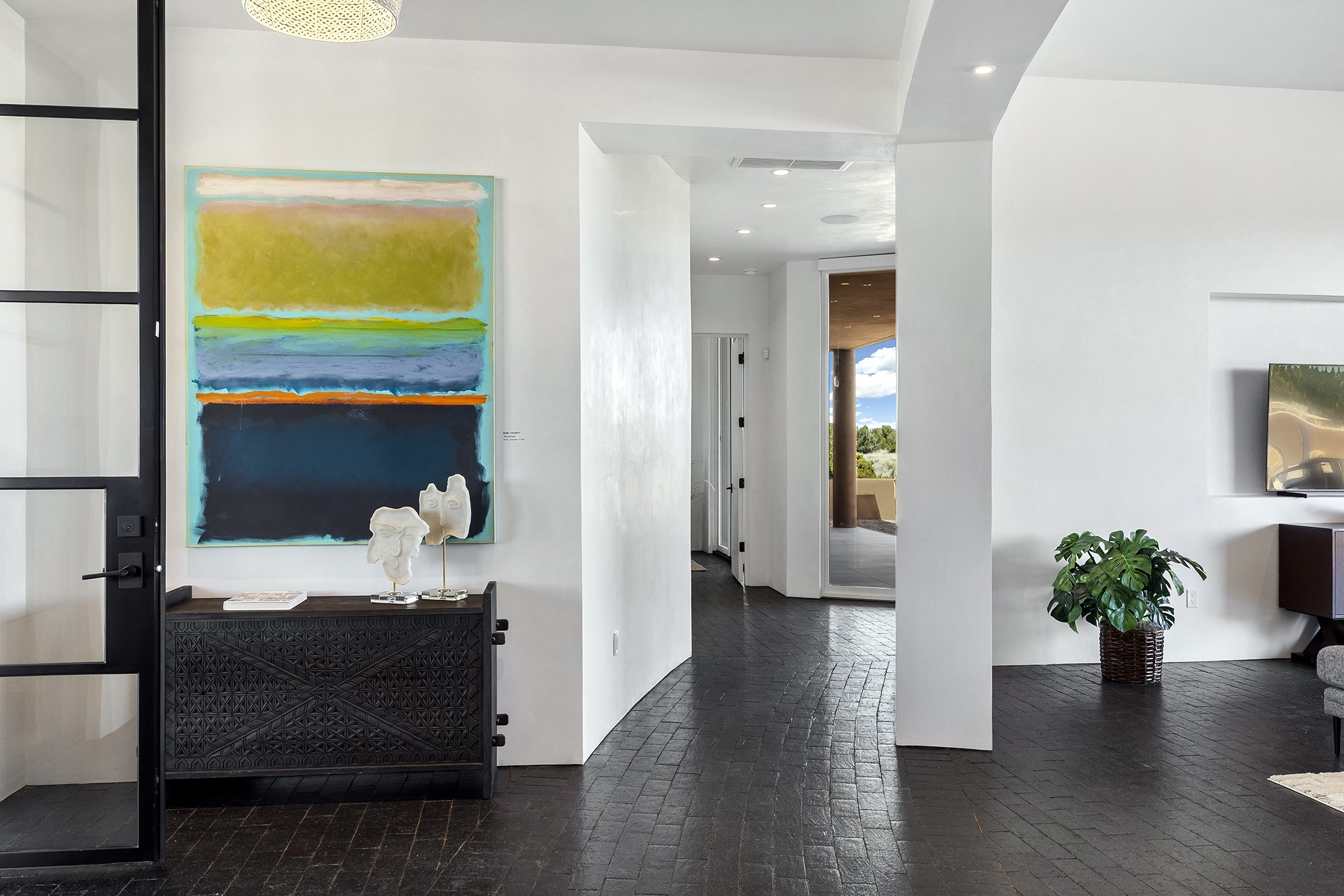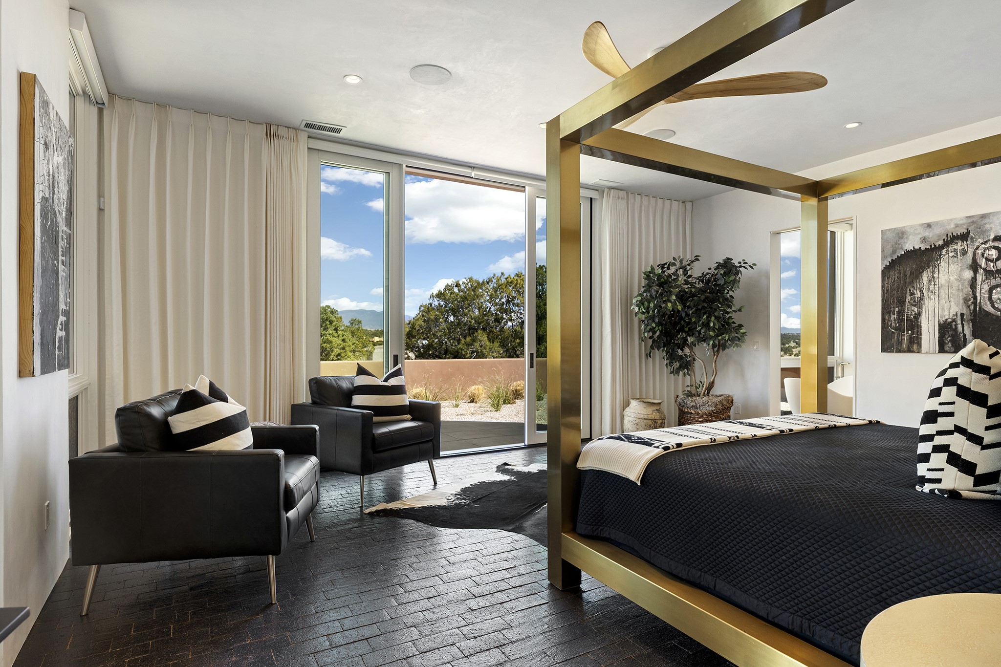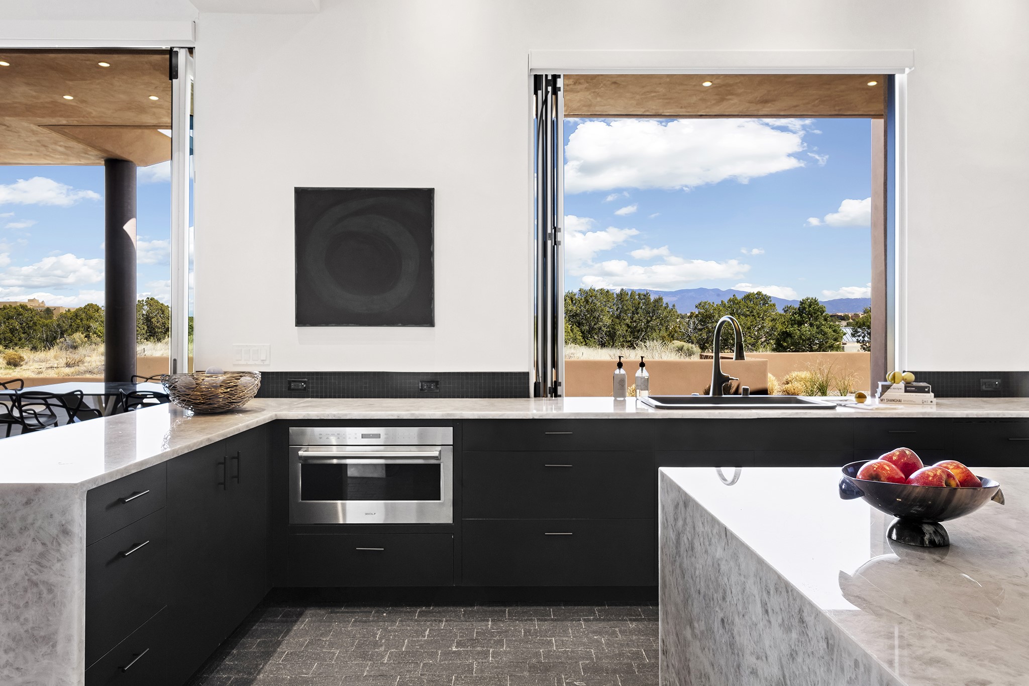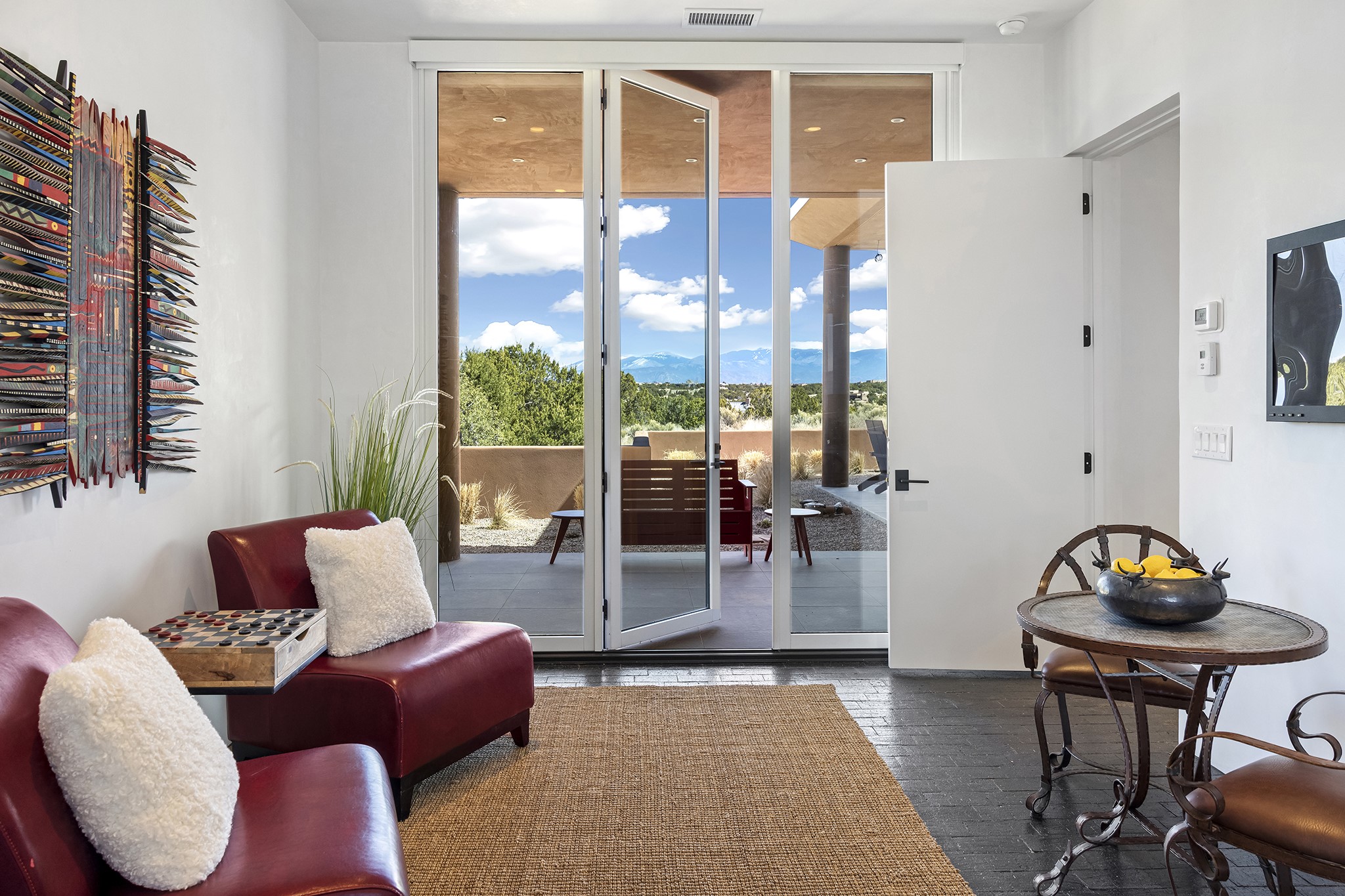 An experience with no parallel - relaxed but elegant living at its best. Unstoppable sunrise and sunset views stretch across the Sangre de Cristo and Jemez Mountains, uninterrupted and ever-changing, with no distractions to take away from privacy, the exclusivity, and the quality of this property. 17 Hacienda Vaquero is a Contemporary Pueblo by Native Son Builders, set within the Estancias of Las Campanas. More than 4,200 square feet of refined interior space pairs with over 1,600 square feet of outdoor living, where covered portals, a kiva fireplace, and an in ground spa with waterfall--and infinity edge--create a seamless connection to the landscape. The great room centers on a custom gas fireplace and opens effortlessly through motorized sliding walls to brick floors that continue outdoors, blurring the line between inside and out. The kitchen is appointed with Wolf appliances, a Sub-Zero refrigerator and freezer, two Asko dishwashers, a walk-in pantry, and a refrigerated wine display. A mudroom and laundry area sit just off the three-car garage, while a porte-cochere offers covered arrival. A private attached casita includes a kitchenette, living area, and its own portal, ideal for guests or extended stays. Just minutes from downtown Santa Fe this home is set in the exclusive Estancias area of Las Campanas, a private club offering two Jack Nicklaus golf courses, a world-class equestrian center, fitness center, and spa. Optional membership provides access to dining, pools, racquet sports, and more, along with 24-hour security and on-site paramedics and EMTs.