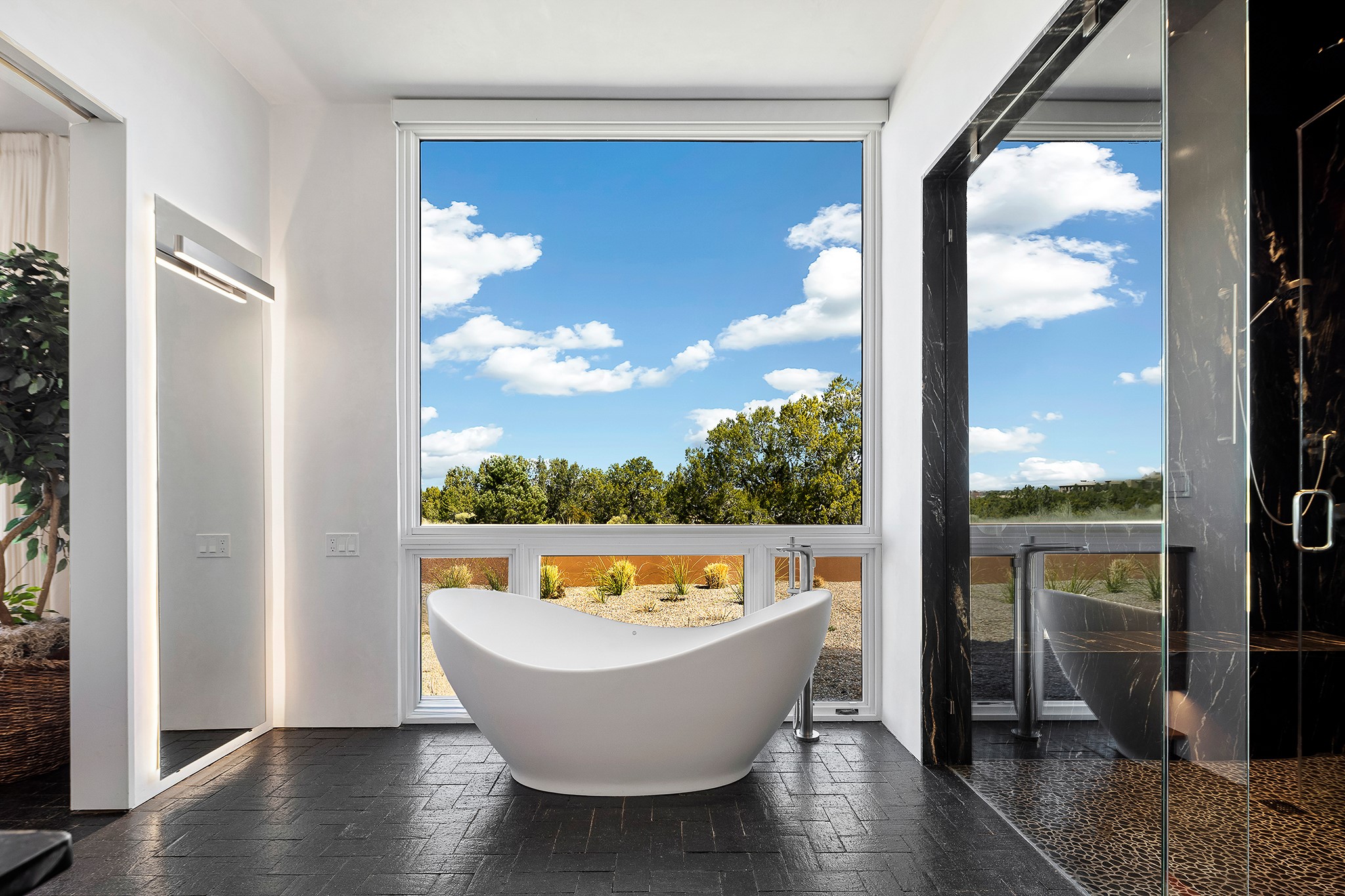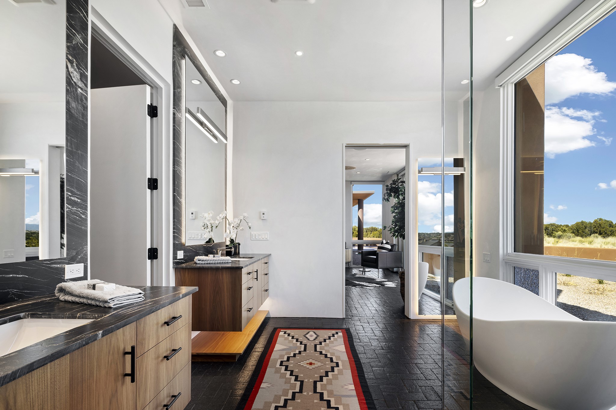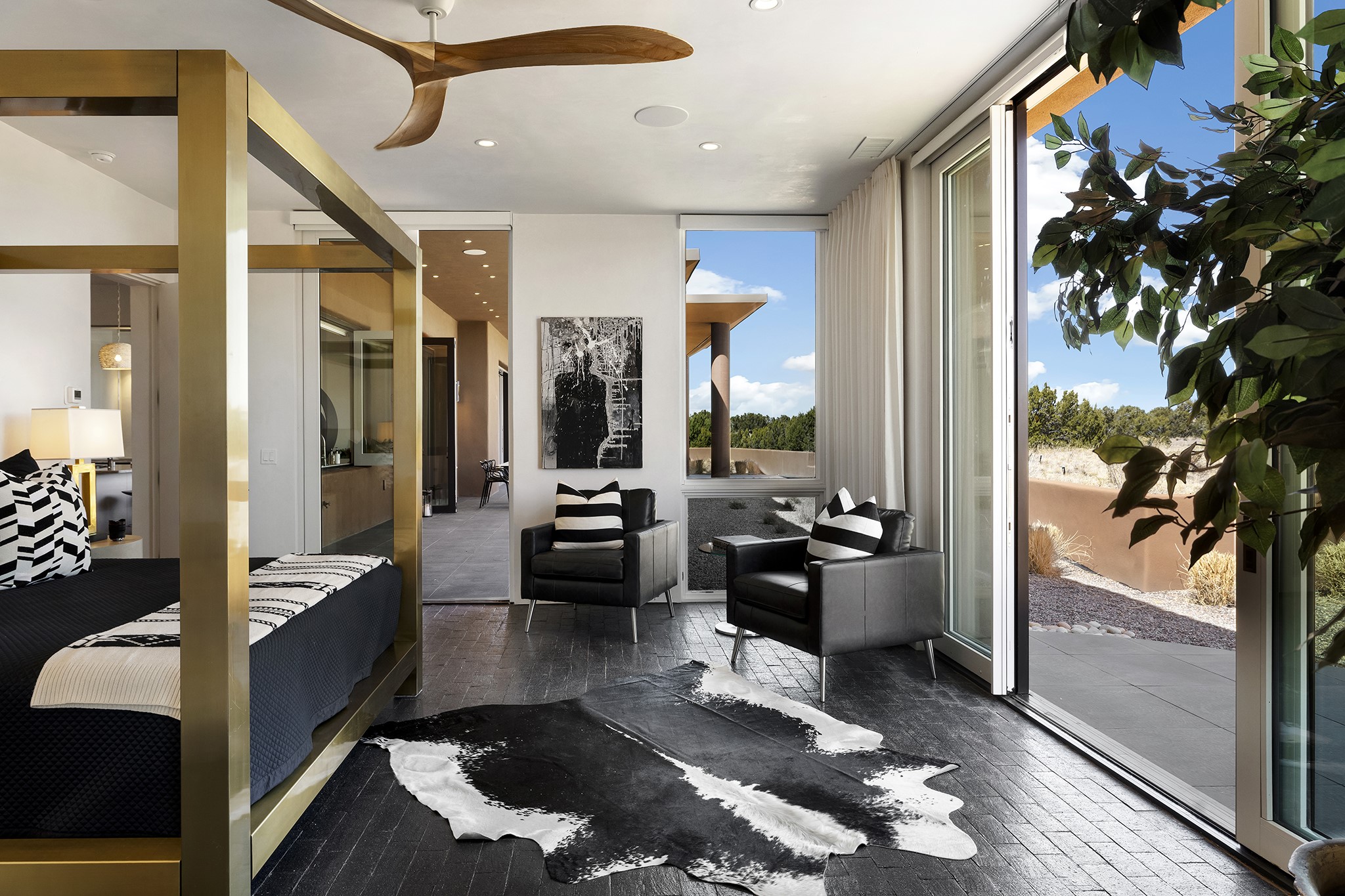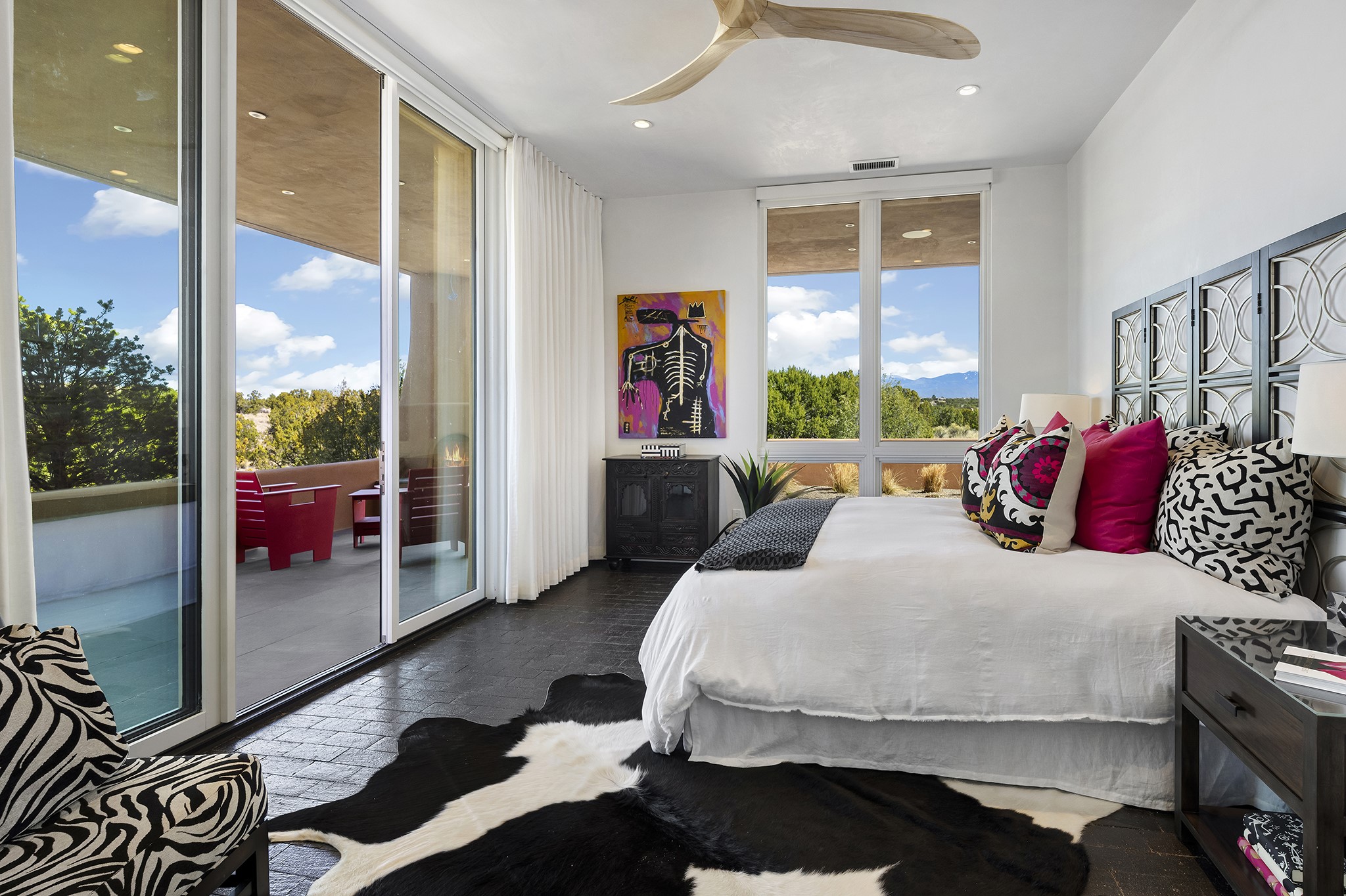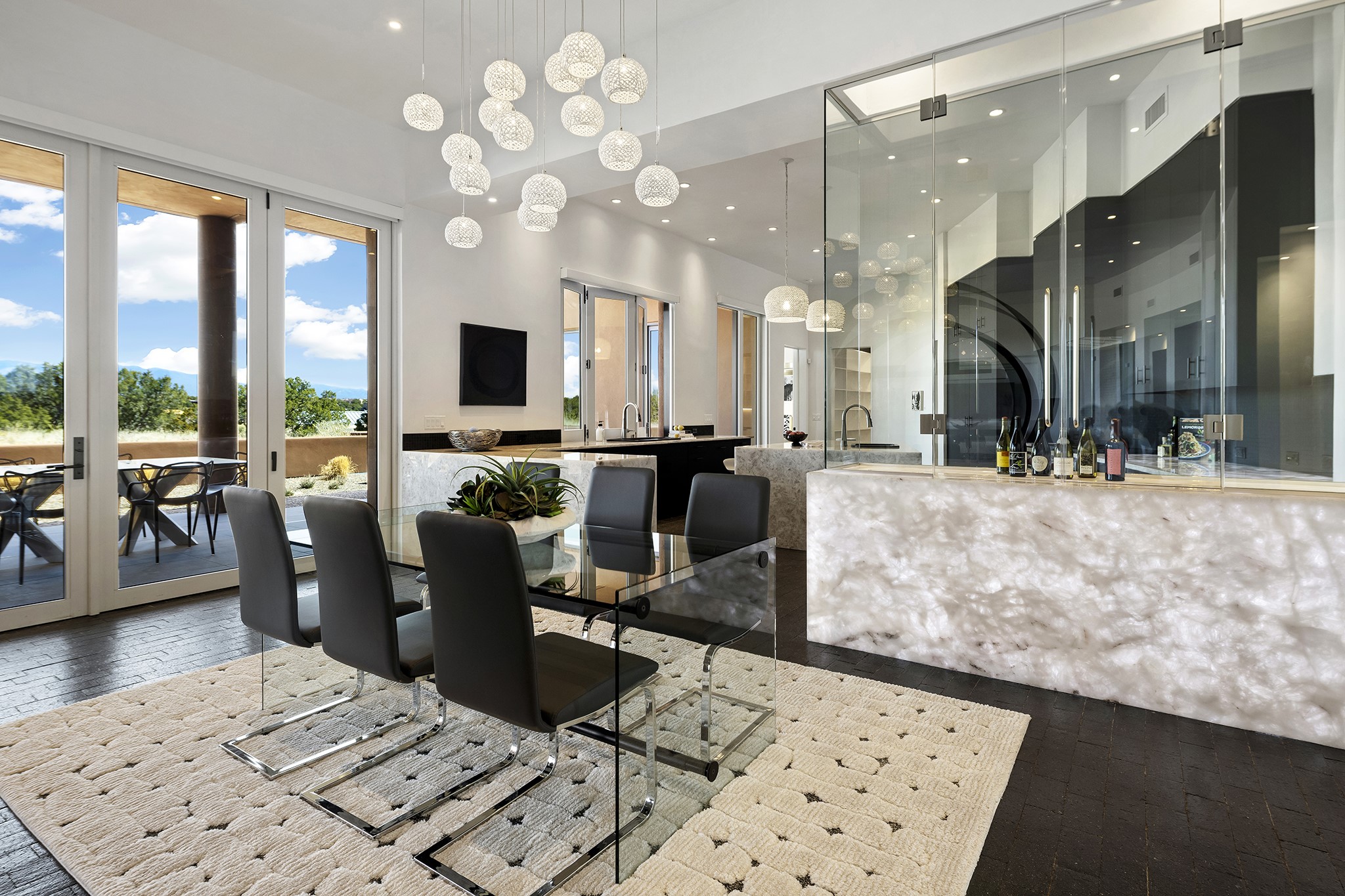 An experience with no parallel - relaxed but elegant living at its best. Unstoppable sunrise and sunset views stretch across the Sangre de Cristo and Jemez Mountains, uninterrupted and ever-changing, with no distractions to take away from privacy, the exclusivity, and the quality of this property. 17 Hacienda Vaquero is a Contemporary Pueblo by Native Son Builders, set within the Estancias of Las Campanas. More than 4,200 square feet of refined interior space pairs with over 1,600 square feet of outdoor living, where covered portals, a kiva fireplace, and an in ground spa with waterfall--and infinity edge--create a seamless connection to the landscape. The great room centers on a custom gas fireplace and opens effortlessly through motorized sliding walls to brick floors that continue outdoors, blurring the line between inside and out. The kitchen is appointed with Wolf appliances, a Sub-Zero refrigerator and freezer, two Asko dishwashers, a walk-in pantry, and a refrigerated wine display. A mudroom and laundry area sit just off the three-car garage, while a porte-cochere offers covered arrival. A private attached casita includes a kitchenette, living area, and its own portal, ideal for guests or extended stays. Just minutes from downtown Santa Fe this home is set in the exclusive Estancias area of Las Campanas, a private club offering two Jack Nicklaus golf courses, a world-class equestrian center, fitness center, and spa. Optional membership provides access to dining, pools, racquet sports, and more, along with 24-hour security and on-site paramedics and EMTs.