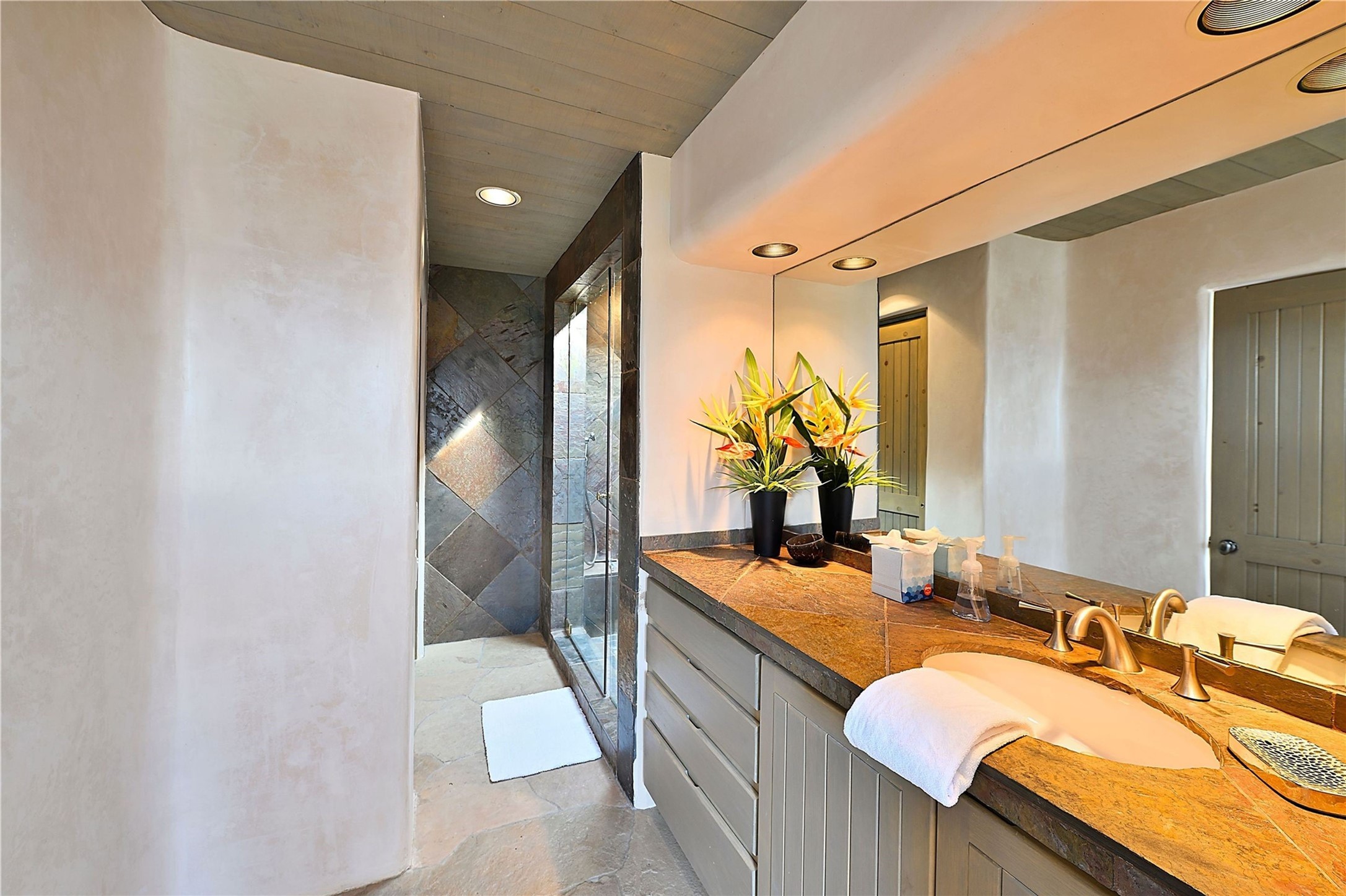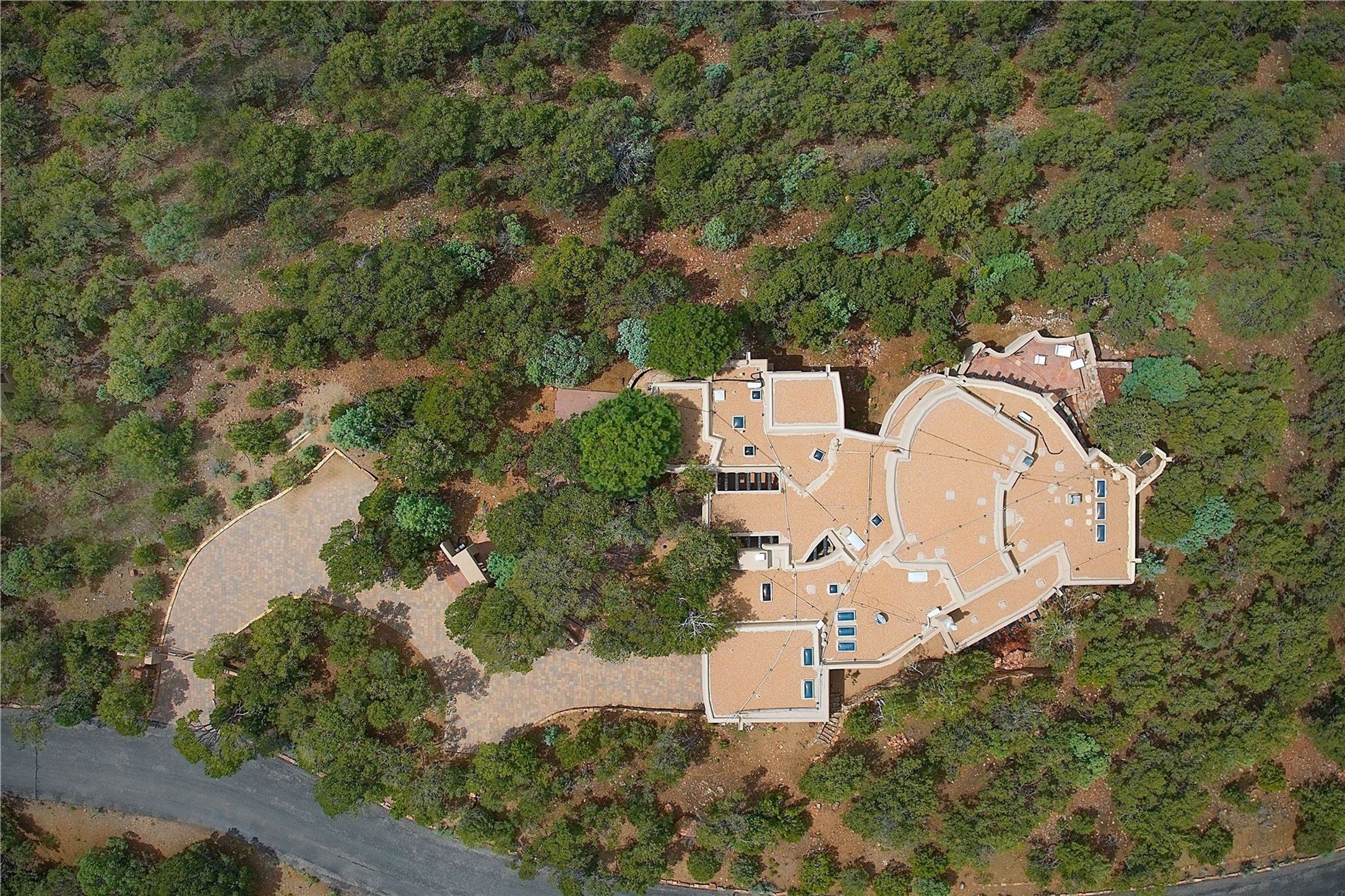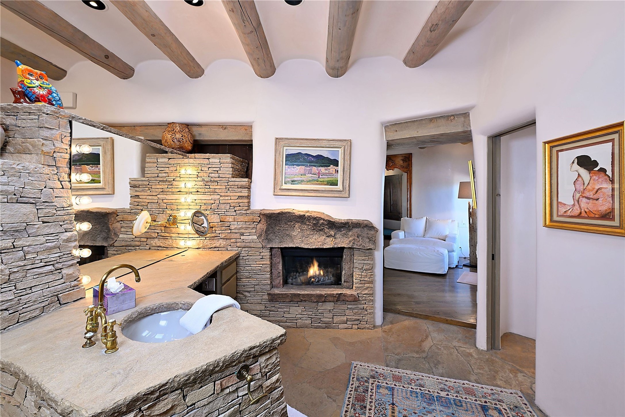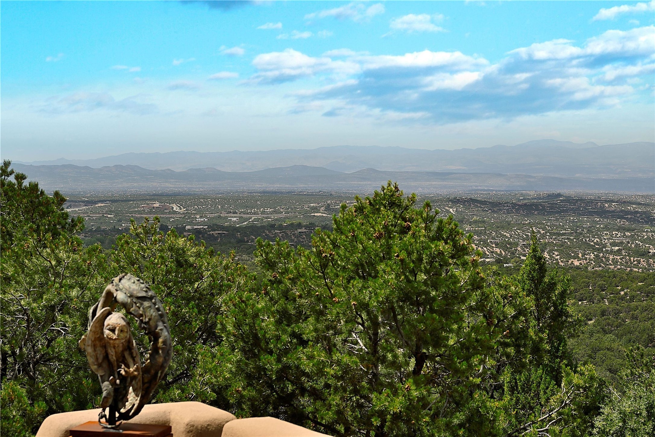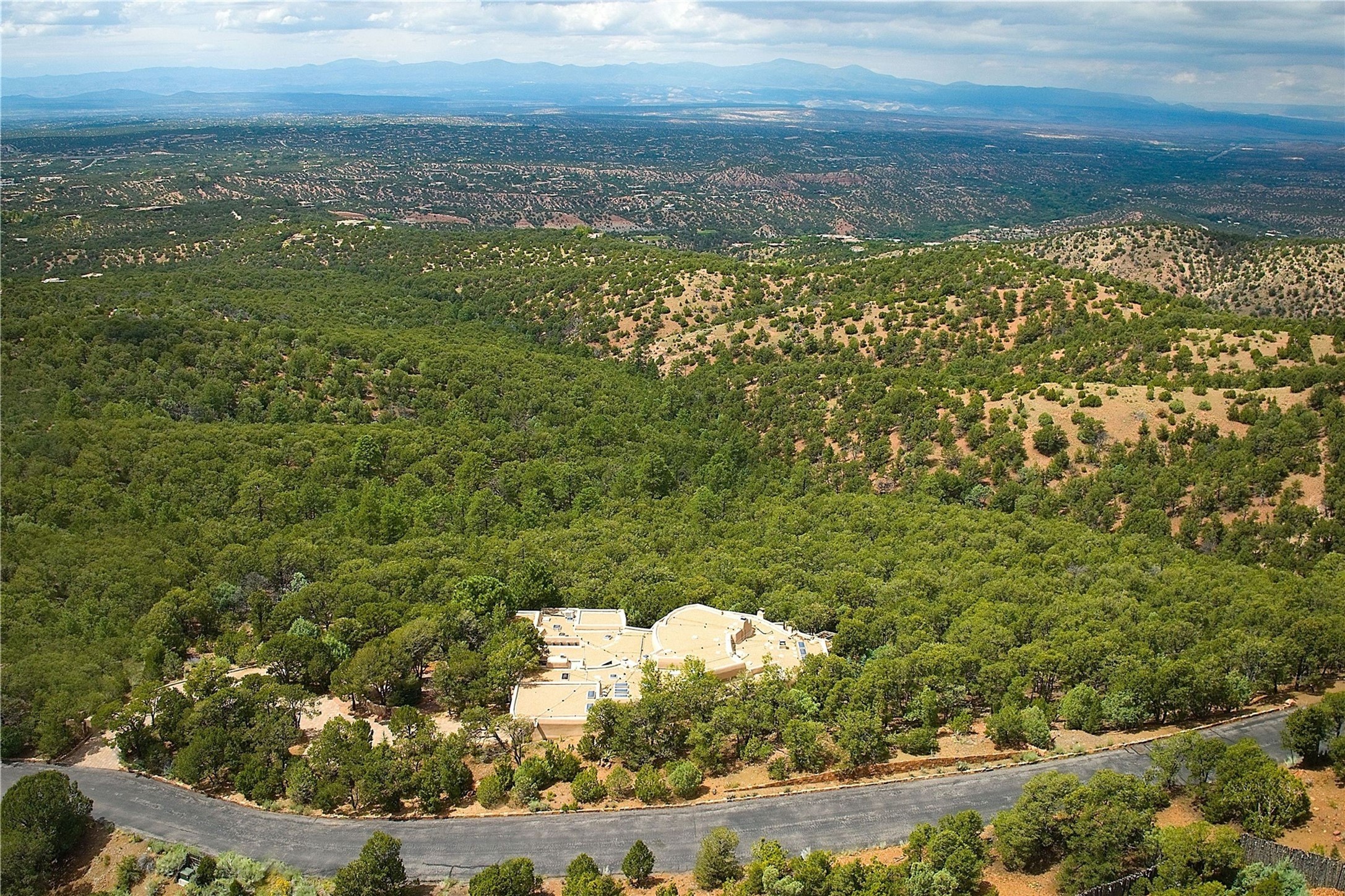 This striking 5-bedroom, 5.5-bath residence, set on 1.19 forested acres in High Summit, offers commanding views of the Jemez Mountains and Santa Fe city lights, creating a mesmerizing backdrop that transforms with the setting sun. Designed with the essence of Santa Fe style, this home includes soaring ceilings framed by rustic beams, a harmonious blend of hardwood and flagstone floors, and unique banco seating areas. Step into the grand living room, where an oversized fireplace makes a bold statement, effortlessly flowing into an elegant dining area that invites gatherings and celebrations. The outside portal calls to those who enjoy alfresco living, featuring an outdoor kiva and a hot tub that promise evenings of relaxation and stargazing. The kitchen, complete with a Wolf range and a Subzero refrigerator, seamlessly connect to a den/media room with its own kiva fireplace. The primary suite features a fireplace, sitting area that opens to the outdoor portal and a gorgeous spa-like bathroom, showcasing a soaking tub, a fireplace for those chilly evenings, and an expansive walk-in shower with double shower heads. In addition, there is a detached 2-bedroom, 2-bath guesthouse. Recent enhancements, including new pine trees and a new driveway, alongside a newer roof with a 10-year warranty. Located just minutes away from the renowned Ten Thousand Waves Spa, the Santa Fe Ski Basin, Dale Ball Trails, and the downtown Plaza