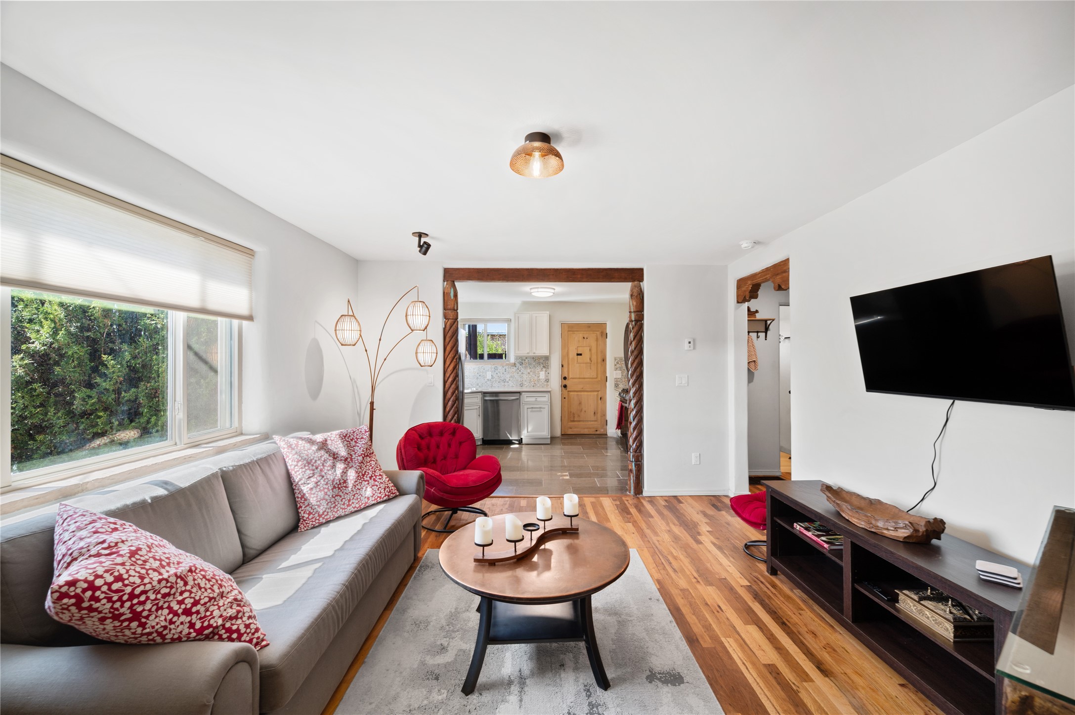 Remodeled with love and options. Single home, second home, duplex, multi generational easily done by opening/closing one interior door. Everything was completely updated 2023 including electric, plumbing, roof, stucco, windows, doors, insulation, 2 new fully equipped kitchens, baths, finishes and landscaping. The lot is large enough for adding a guest house or studio. Other features include privacy walls, abundant parking, edible landscaping like fruit and nut trees, storage, and a partial basement. There is a very good rental history as a furnished duplex. Furniture and amenities are included for a turnkey property. This location is ideal for walking and biking with near by parks, the Santa Fe River trail, restaurants and shops near by and .9 of a mile walk to the railyard for Farmers Market, restaurants, or the movies. Other businesses are within a couple blocks.