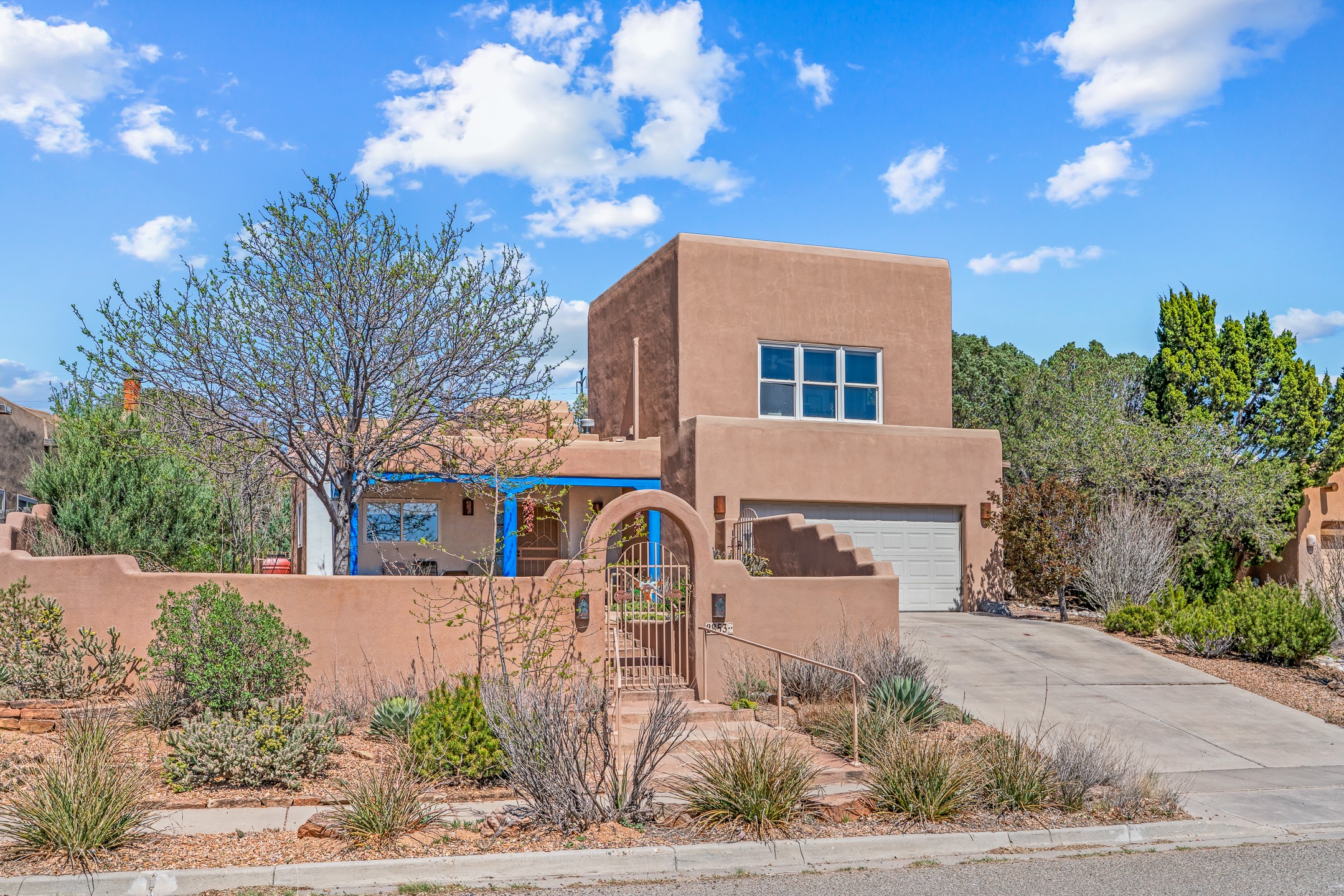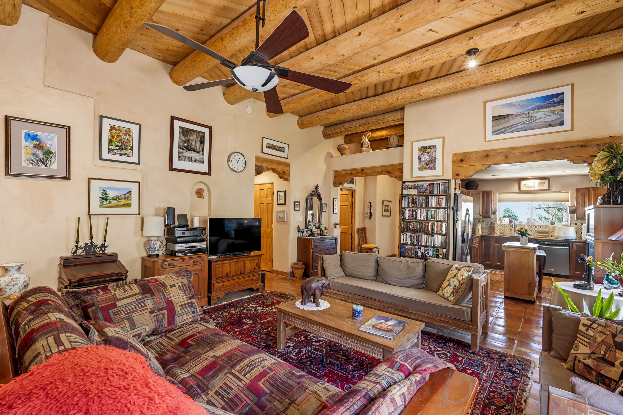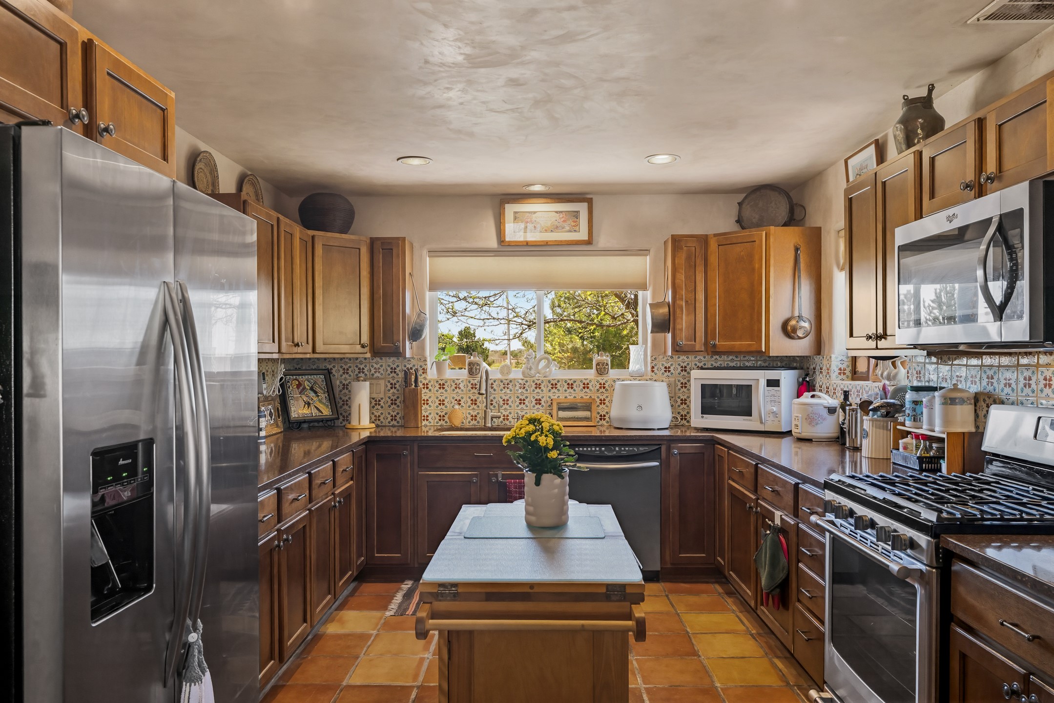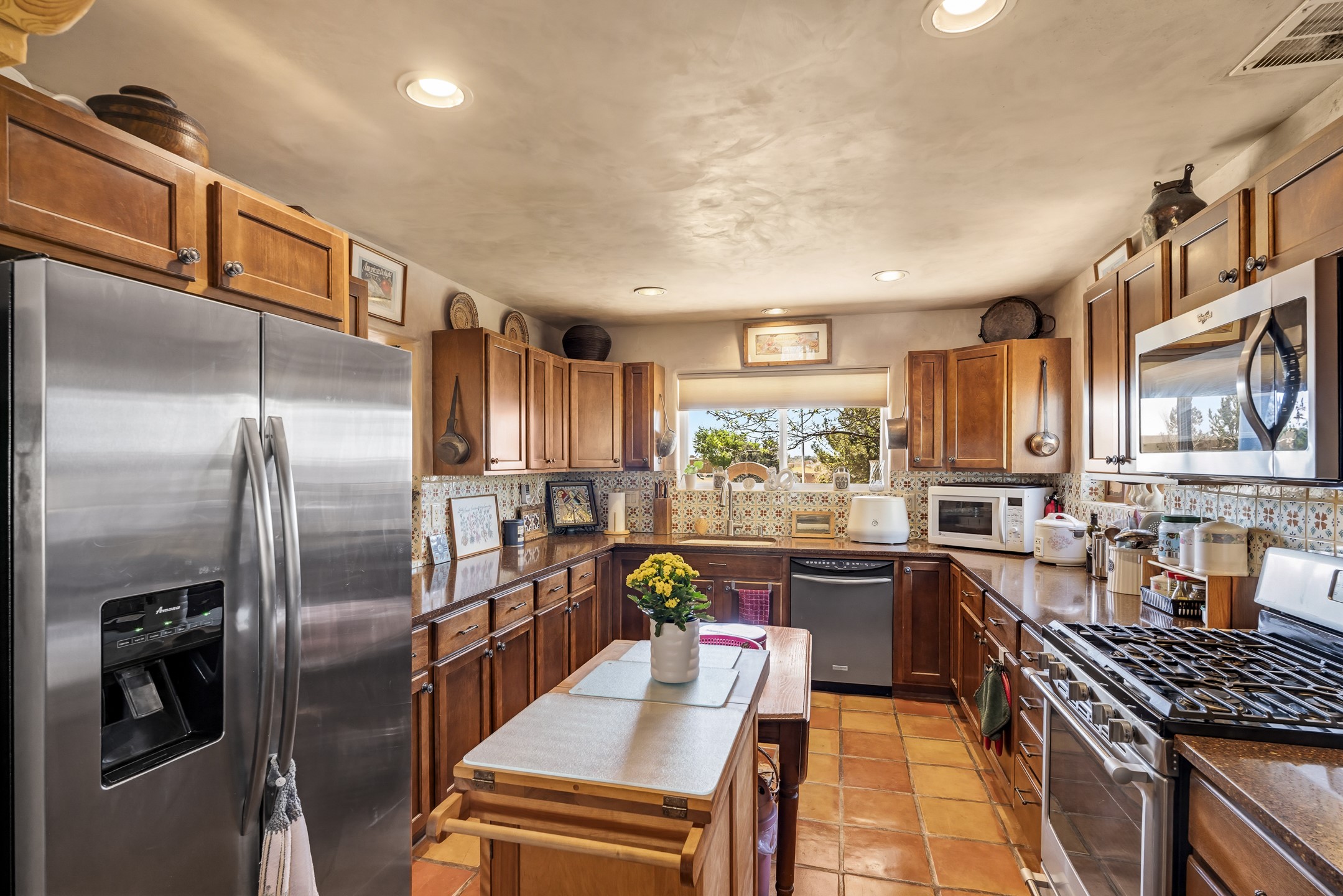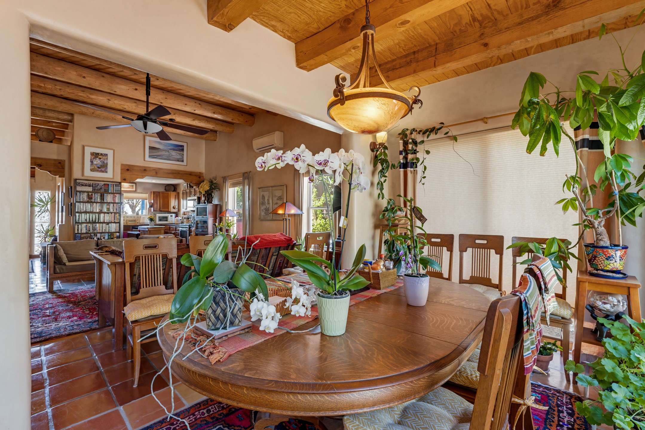 Santa Fe-style home in Pueblos del Sol with 3 bedrooms, 2 baths, and a separate studio above the garage. Built in 2004, the main residence offers approximately 1,625 sq ft, the studio is 425 sq ft, the entire living space is 2,050 sq ft. The layout is practical and consistent, with Saltillo tile flooring throughout and diamond plaster wall finishes. Exposed beams carry through the main living areas, where a wood-burning kiva fireplace anchors the space. A sunroom extends off the living area and opens to the backyard. The kitchen is arranged in a U-shape, allowing for continuous workspace, with Silestone countertops, stainless steel appliances, gas range, and backsplash of hand-painted tile. Storage is distributed across multiple cabinets and work zones. The primary suite includes direct outdoor access and a bath with dual sinks, separate jetted tub and shower. Two additional bedrooms are located near a bath with a walk-in shower. Heating is provided by radiant floor systems via a natural gas boiler, with mini-split units in the living/dining area, primary bedroom, and studio for targeted climate control. The studio above the two-car garage has a separate access point, its own 3/4 bath, and good natural light, supporting use as workspace, guest quarters, or rental. The roof was completely replaced and the parapets reconstructed in 2023; the radiant heat boiler was replaced in 2022, and the gas-fired water heater was replaced in 2021. Located within a neighborhood with established walking paths and access to community amenities, the property is positioned for convenient access to shopping, schools, and main routes across Santa Fe. The combination of solid construction, consistent materials, and flexible auxiliary space supports a range of use scenarios and long-term value.