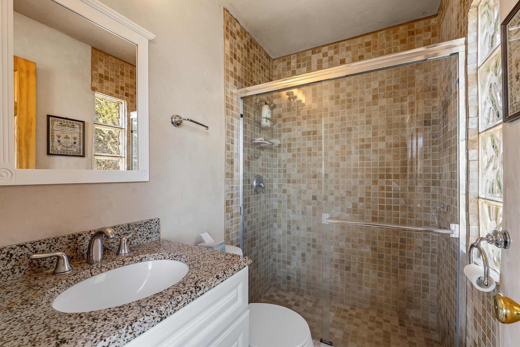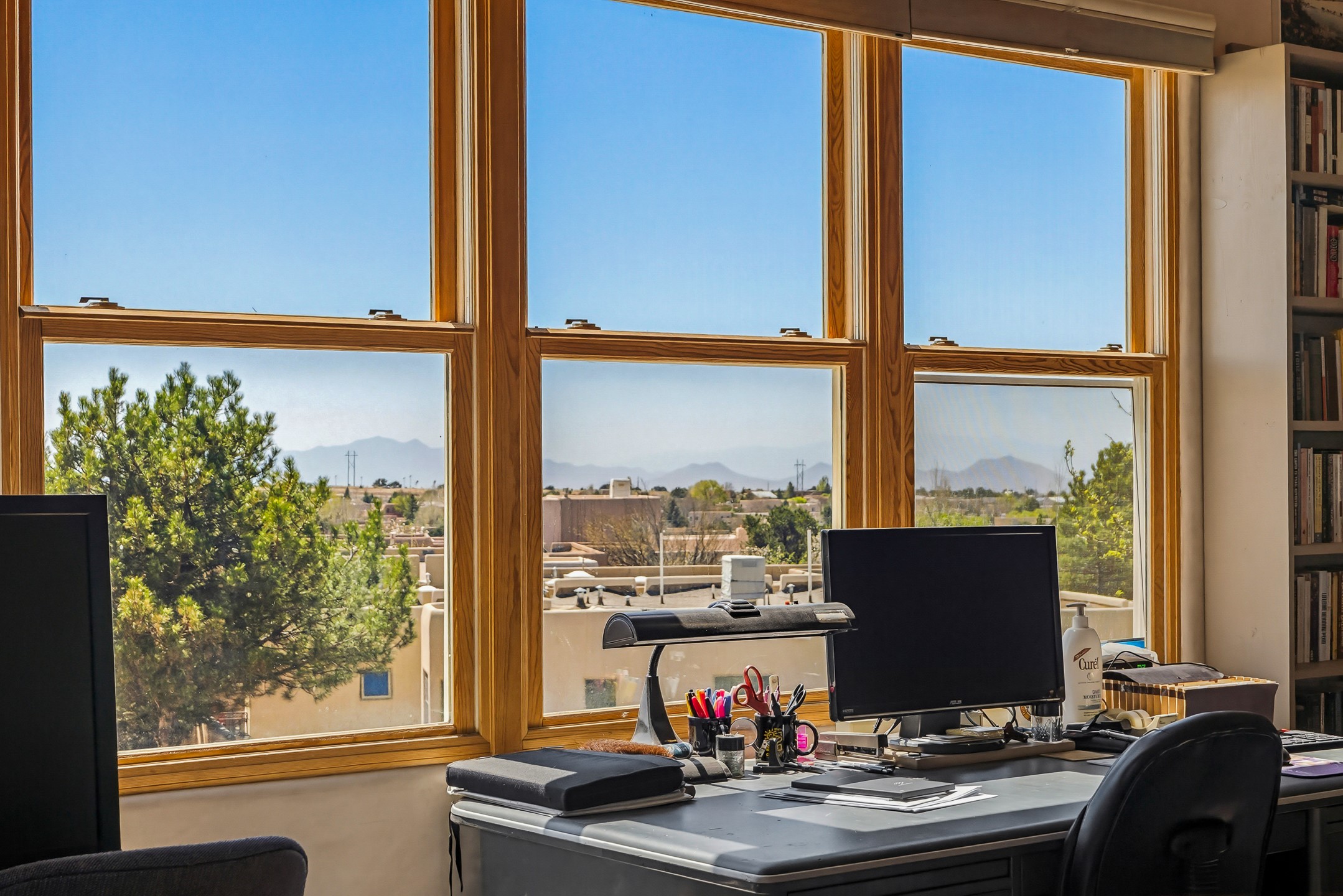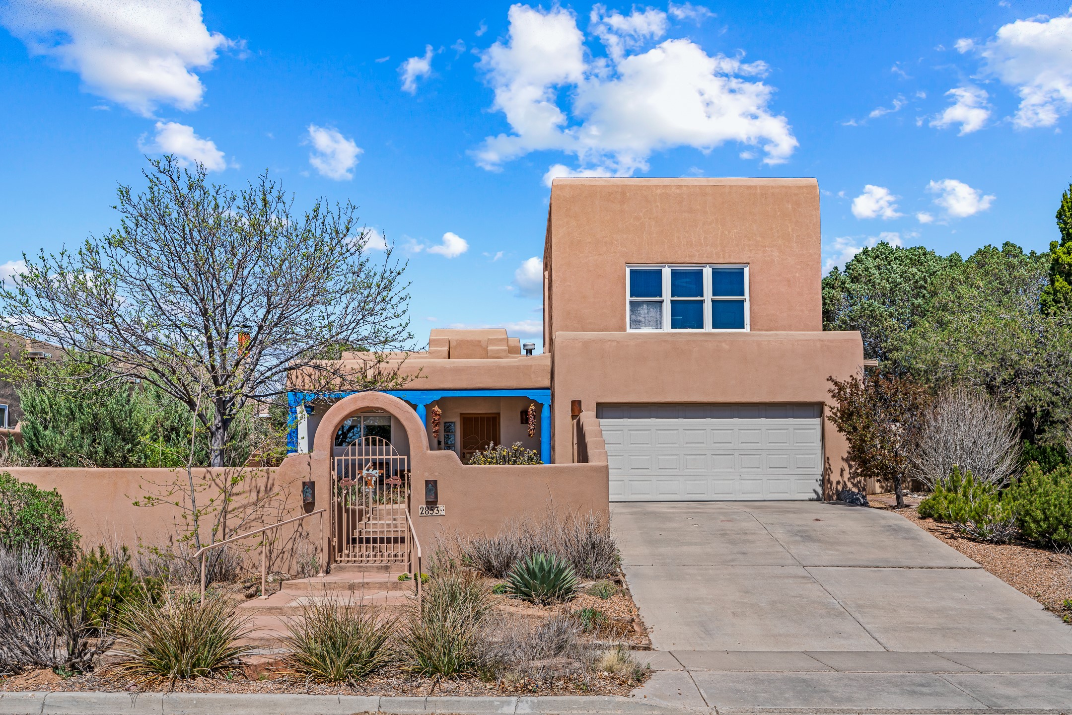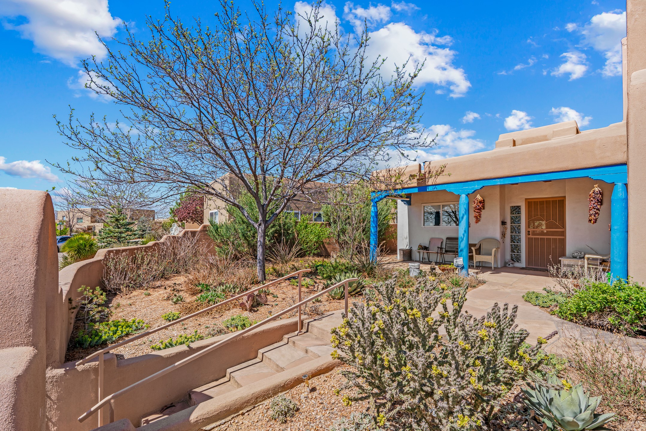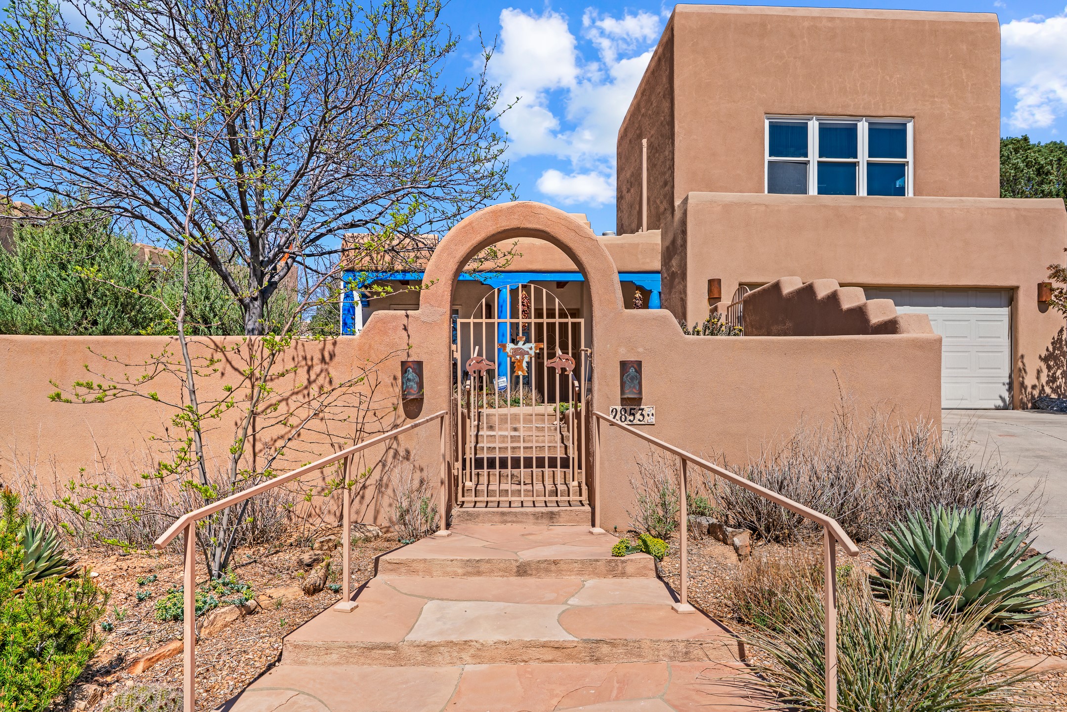 Santa Fe-style home in Pueblos del Sol with 3 bedrooms, 2 baths, and a separate studio above the garage. Built in 2004, the main residence offers approximately 1,625 sq ft, the studio is 425 sq ft, the entire living space is 2,050 sq ft. The layout is practical and consistent, with Saltillo tile flooring throughout and diamond plaster wall finishes. Exposed beams carry through the main living areas, where a wood-burning kiva fireplace anchors the space. A sunroom extends off the living area and opens to the backyard. The kitchen is arranged in a U-shape, allowing for continuous workspace, with Silestone countertops, stainless steel appliances, gas range, and backsplash of hand-painted tile. Storage is distributed across multiple cabinets and work zones. The primary suite includes direct outdoor access and a bath with dual sinks, separate jetted tub and shower. Two additional bedrooms are located near a bath with a walk-in shower. Heating is provided by radiant floor systems via a natural gas boiler, with mini-split units in the living/dining area, primary bedroom, and studio for targeted climate control. The studio above the two-car garage has a separate access point, its own 3/4 bath, and good natural light, supporting use as workspace, guest quarters, or rental. The roof was completely replaced and the parapets reconstructed in 2023; the radiant heat boiler was replaced in 2022, and the gas-fired water heater was replaced in 2021. Located within a neighborhood with established walking paths and access to community amenities, the property is positioned for convenient access to shopping, schools, and main routes across Santa Fe. The combination of solid construction, consistent materials, and flexible auxiliary space supports a range of use scenarios and long-term value.