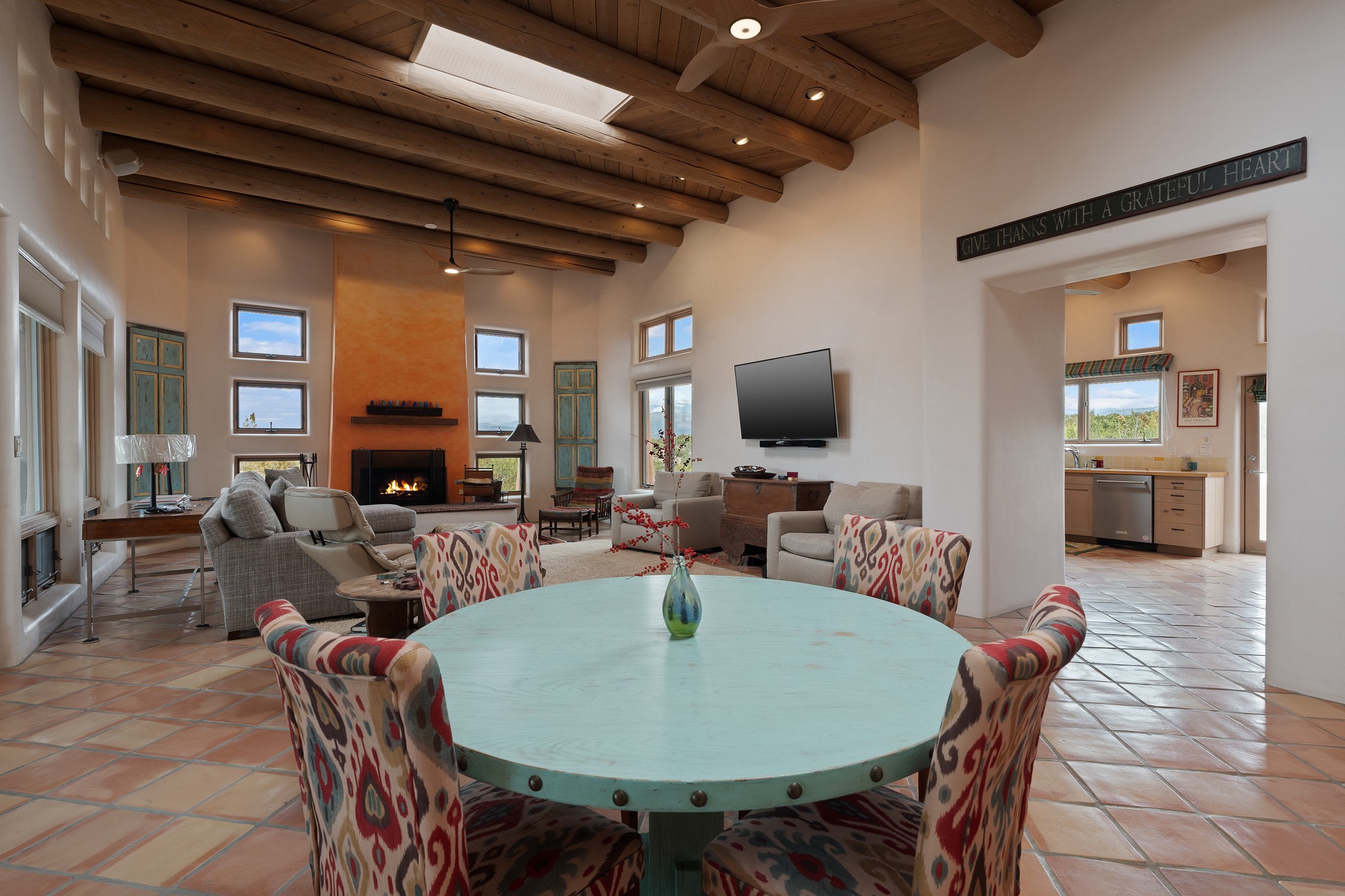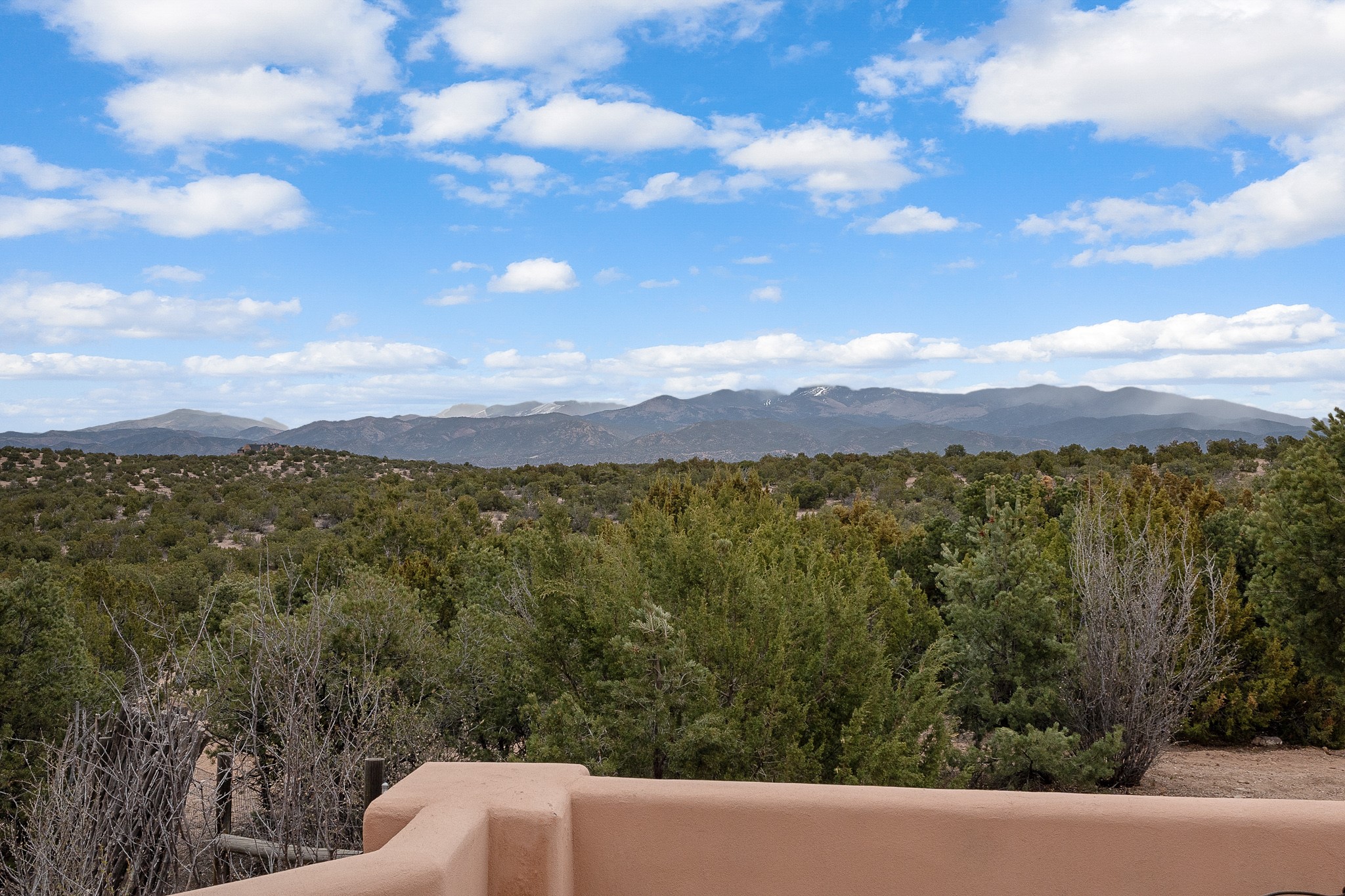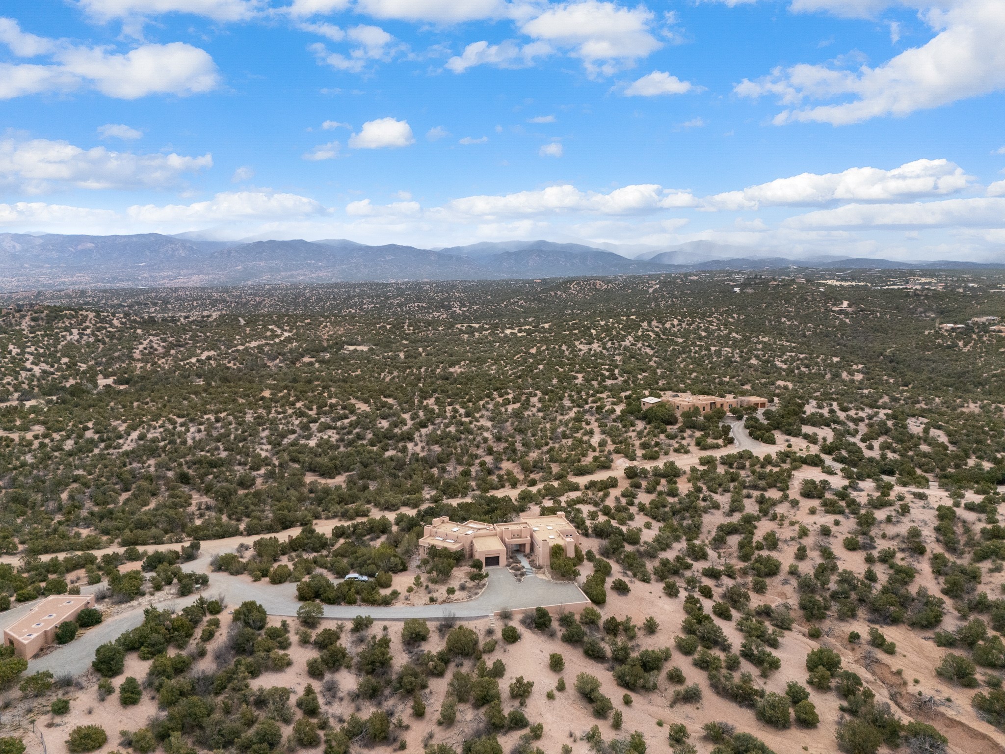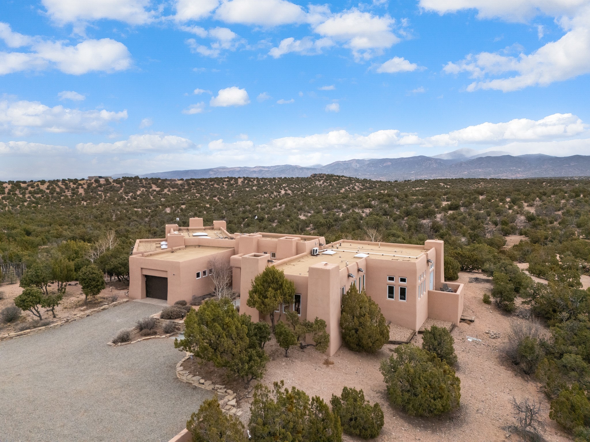 Single-level Pueblo Revival home built by Doug McDowell on 5.93 acres with sweeping mountain and sunset views, located just 8 miles (about 15 minutes) from the Santa Fe Plaza with convenient access to the 599 bypass. Set back on a private drive, this 4-bedroom, 3-bath residence offers 3,106 square feet of light-filled living space and strong indoor-outdoor flow in a peaceful setting. Classic Santa Fe details define the home, including viga and latilla ceilings, Saltillo tile floors, kiva fireplaces, and expansive windows that frame surrounding mountain views. The main living area centers around a dramatic fireplace wall and opens to a generous dining space and deep covered portal designed for entertaining and everyday living. The kitchen features a professional-grade Viking gas range, butcher-block counters, colorful tile backsplash, and mountain views from the sink. The primary suite includes a private balcony, kiva fireplace, soaking tub, walk-in closet, and separation from guest bedrooms. Three additional bedrooms provide flexibility for guests, home office, or studio use. Outdoor spaces include portals and patios oriented to the north, east, and south, capturing both sunrise and sunset light. The acreage offers room for gardens, outdoor living, and future improvements, with surrounding natural landscape and open sky views. Recent updates include 6 new minisplits in 2026 and a new septic system in January 2025. Comfort systems include in-floor radiant heat and ductless mini-split systems for cooling and supplemental heating. Additional features include a one-car garage and shared well. Located in a quiet area with proximity to shopping, dining, and downtown Santa Fe, this property combines privacy, usable acreage, and classic Southwestern architecture.