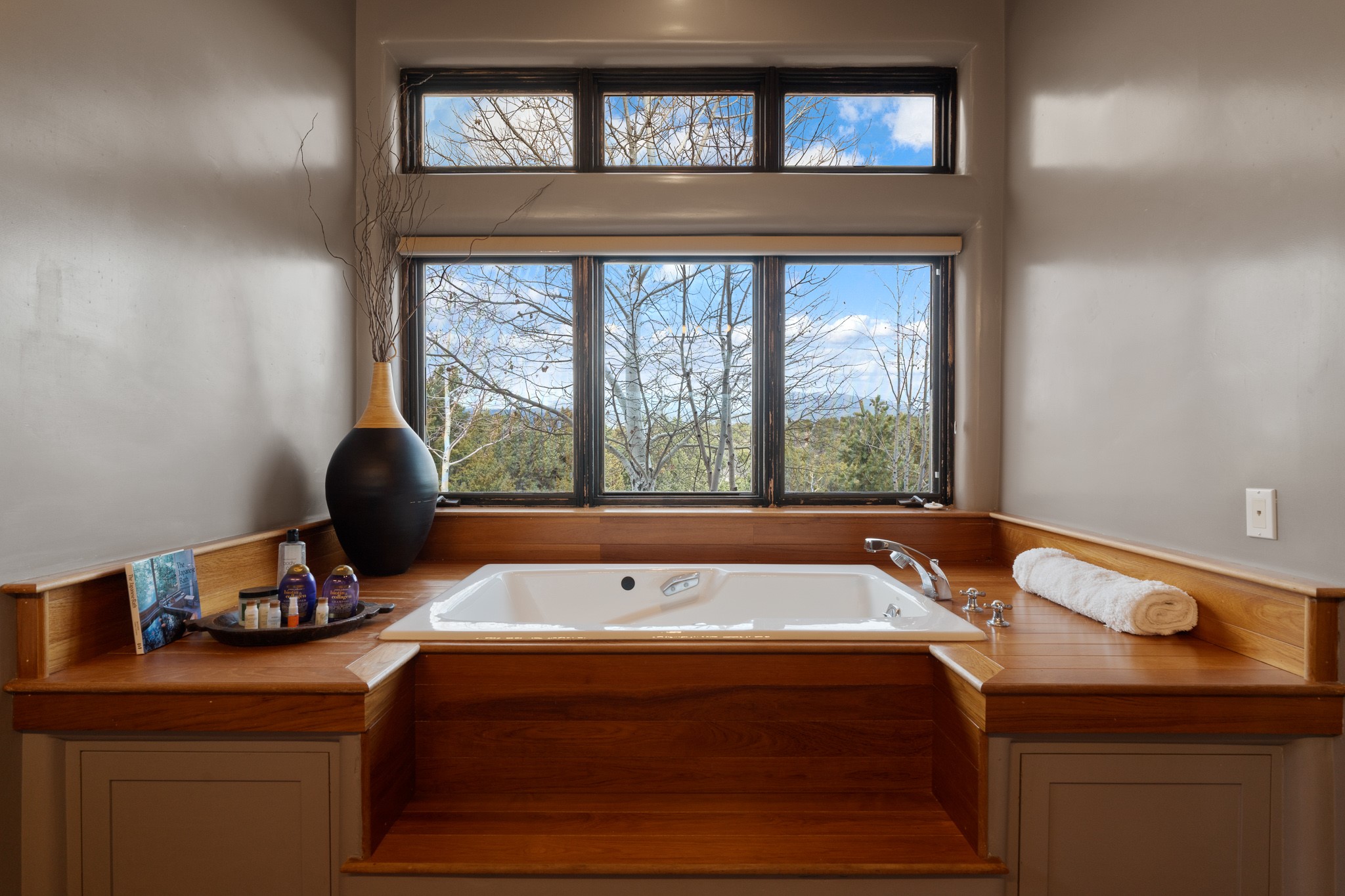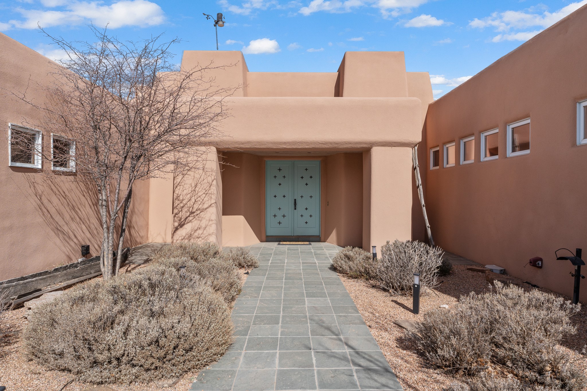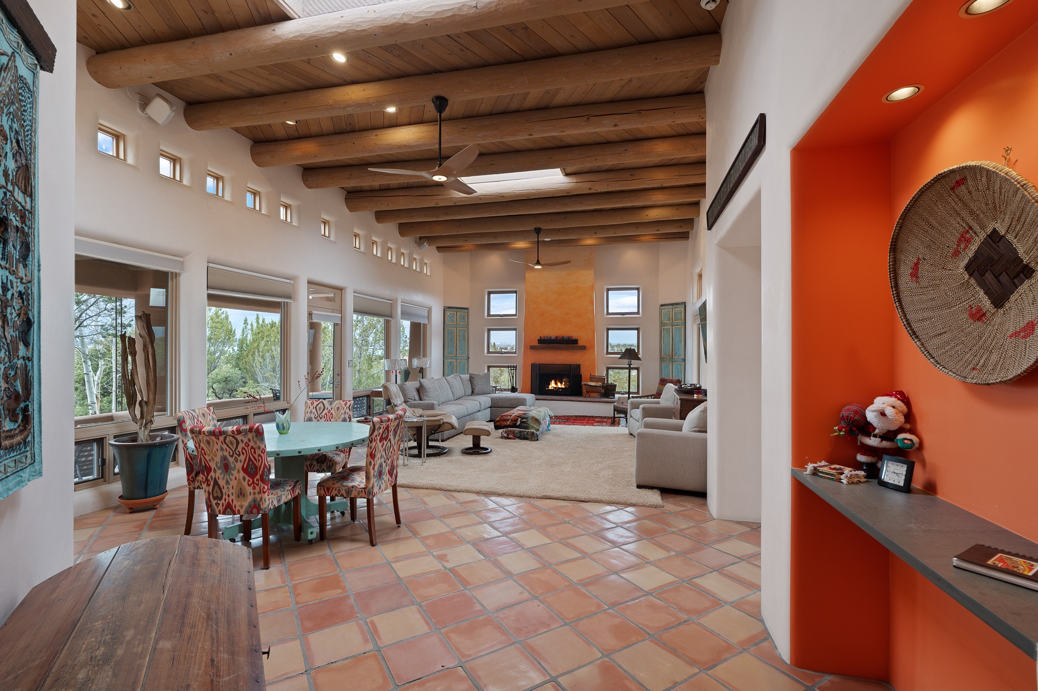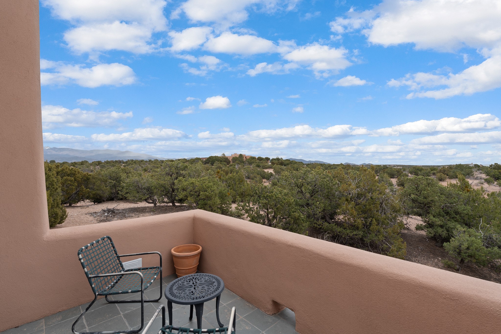 Single-level Pueblo Revival home built by Doug McDowell on 5.93 acres with sweeping mountain and sunset views, located just 8 miles (about 15 minutes) from the Santa Fe Plaza with convenient access to the 599 bypass. Set back on a private drive, this 4-bedroom, 3-bath residence offers 3,106 square feet of light-filled living space and strong indoor-outdoor flow in a peaceful setting. Classic Santa Fe details define the home, including viga and latilla ceilings, Saltillo tile floors, kiva fireplaces, and expansive windows that frame surrounding mountain views. The main living area centers around a dramatic fireplace wall and opens to a generous dining space and deep covered portal designed for entertaining and everyday living. The kitchen features a professional-grade Viking gas range, butcher-block counters, colorful tile backsplash, and mountain views from the sink. The primary suite includes a private balcony, kiva fireplace, soaking tub, walk-in closet, and separation from guest bedrooms. Three additional bedrooms provide flexibility for guests, home office, or studio use. Outdoor spaces include portals and patios oriented to the north, east, and south, capturing both sunrise and sunset light. The acreage offers room for gardens, outdoor living, and future improvements, with surrounding natural landscape and open sky views. Recent updates include 6 new minisplits in 2026 and a new septic system in January 2025. Comfort systems include in-floor radiant heat and ductless mini-split systems for cooling and supplemental heating. Additional features include a one-car garage and shared well. Located in a quiet area with proximity to shopping, dining, and downtown Santa Fe, this property combines privacy, usable acreage, and classic Southwestern architecture.