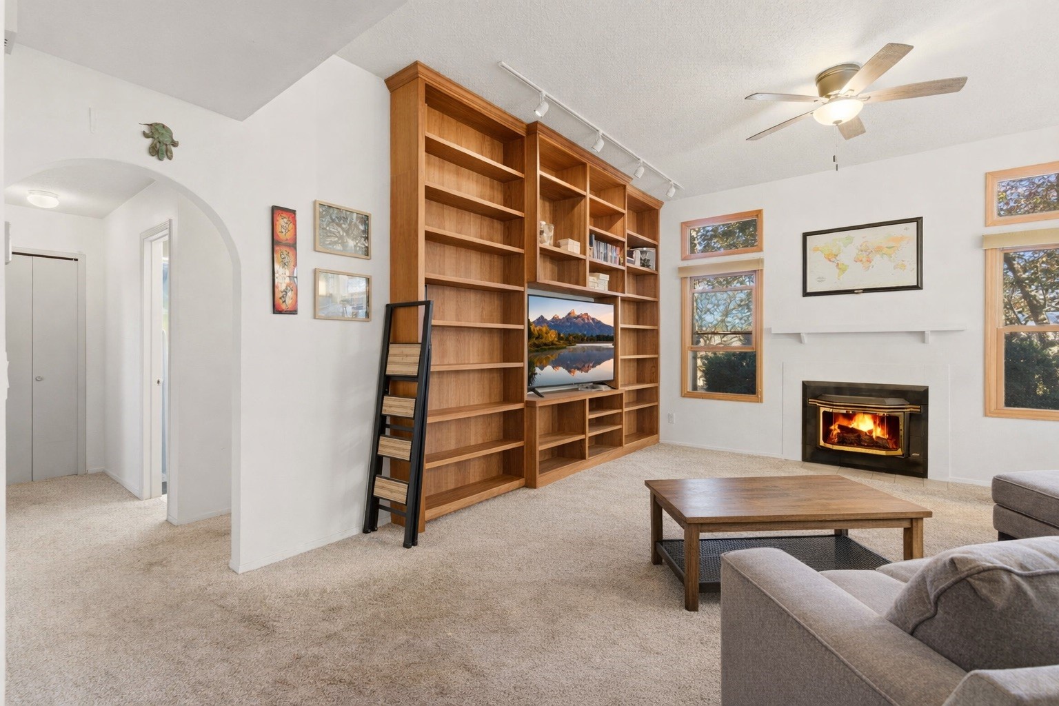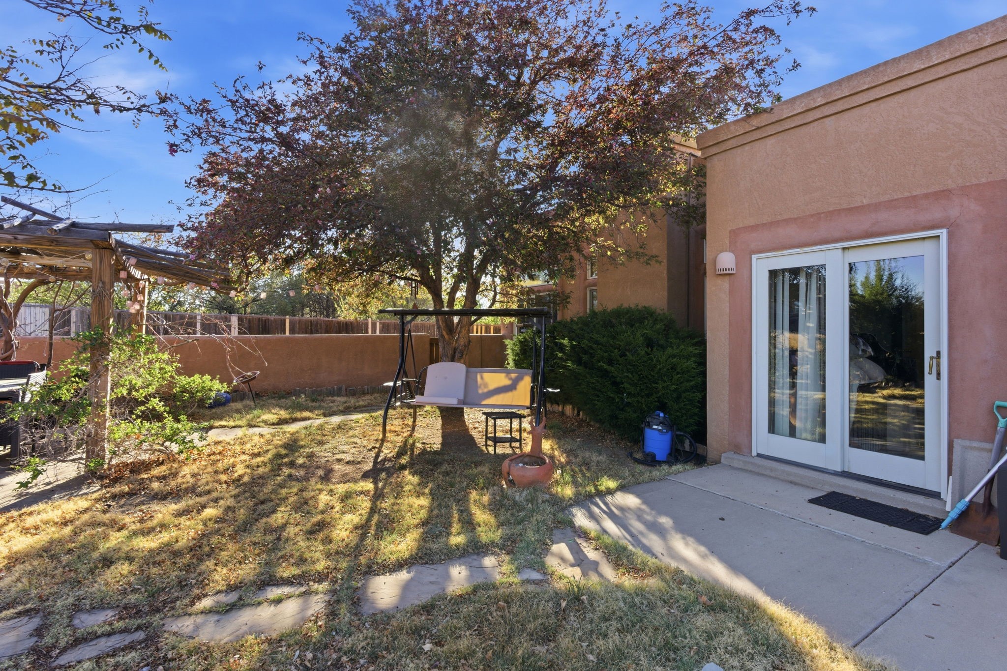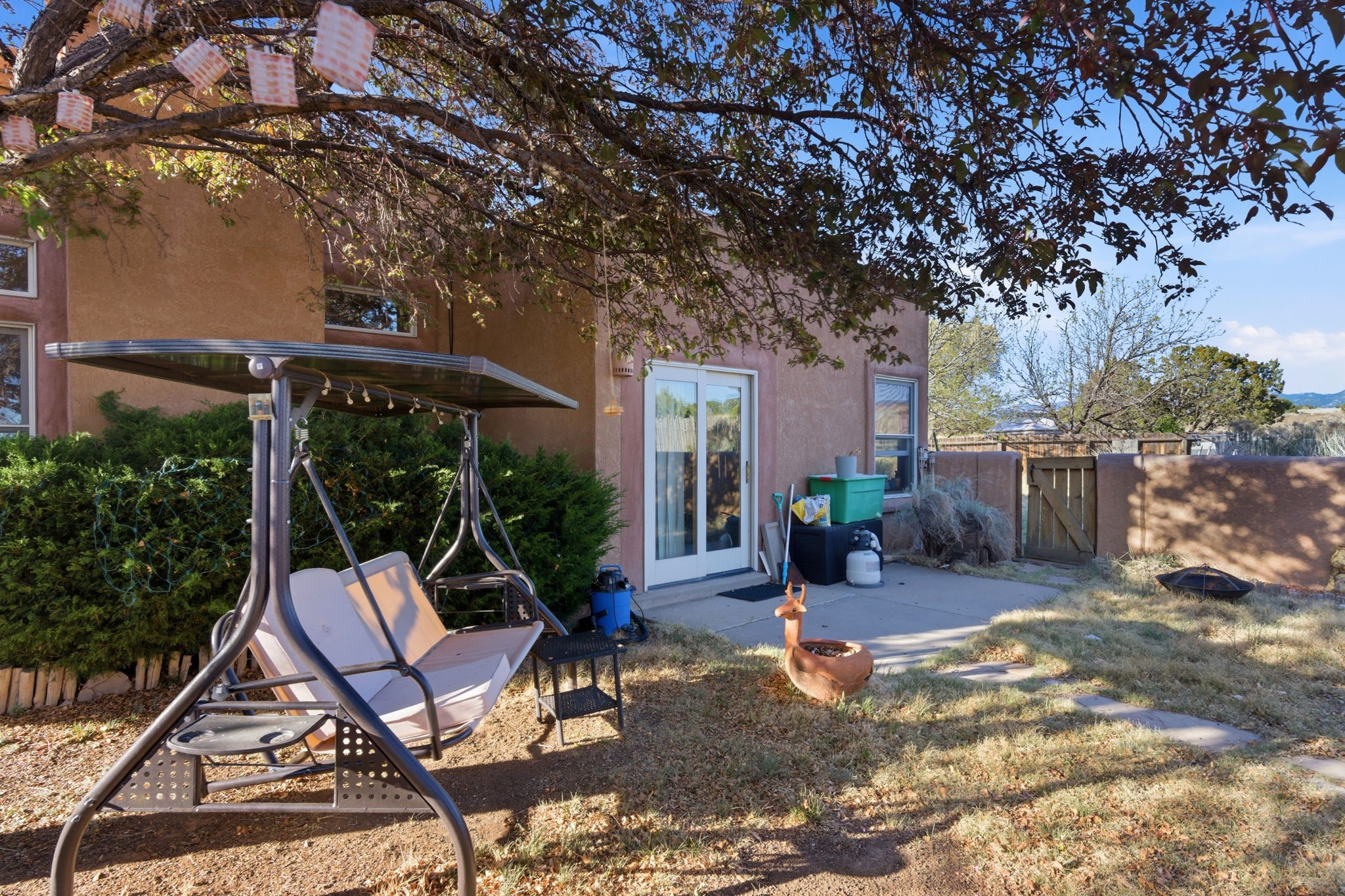 Great starter home or investment opportunity! This 3-bedroom, 2-bathroom home in the desirable Las Estancias neighborhood offers the perfect blend of convenience and comfort, located just a short drive from the Plaza and Southside shopping. The inviting living area and kitchen boast high ceilings, a cozy fireplace, and a wall of custom built-in bookshelves, creating the ultimate retreat. The primary suite serves as a true sanctuary, featuring a spacious bathroom with a walk-in closet, dual sinks, and a walk-in shower. This home also includes a two-car garage and a separate shed for added convenience and storage. Outside, the large backyard comes complete with a play structure, storage shed and offers plenty of room to garden, play, or relax in the sunshine. Priced to sell, this home is the complete package!