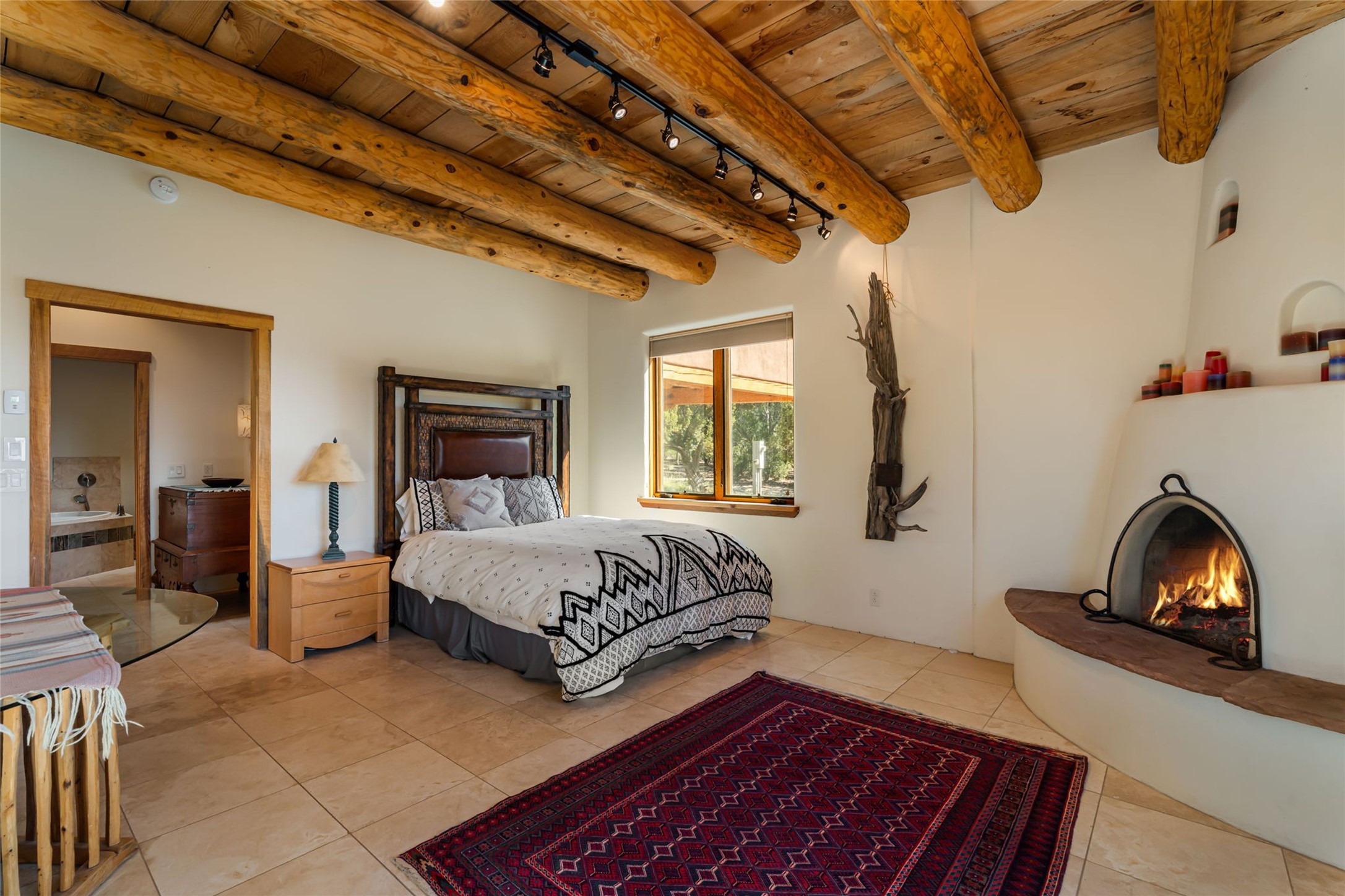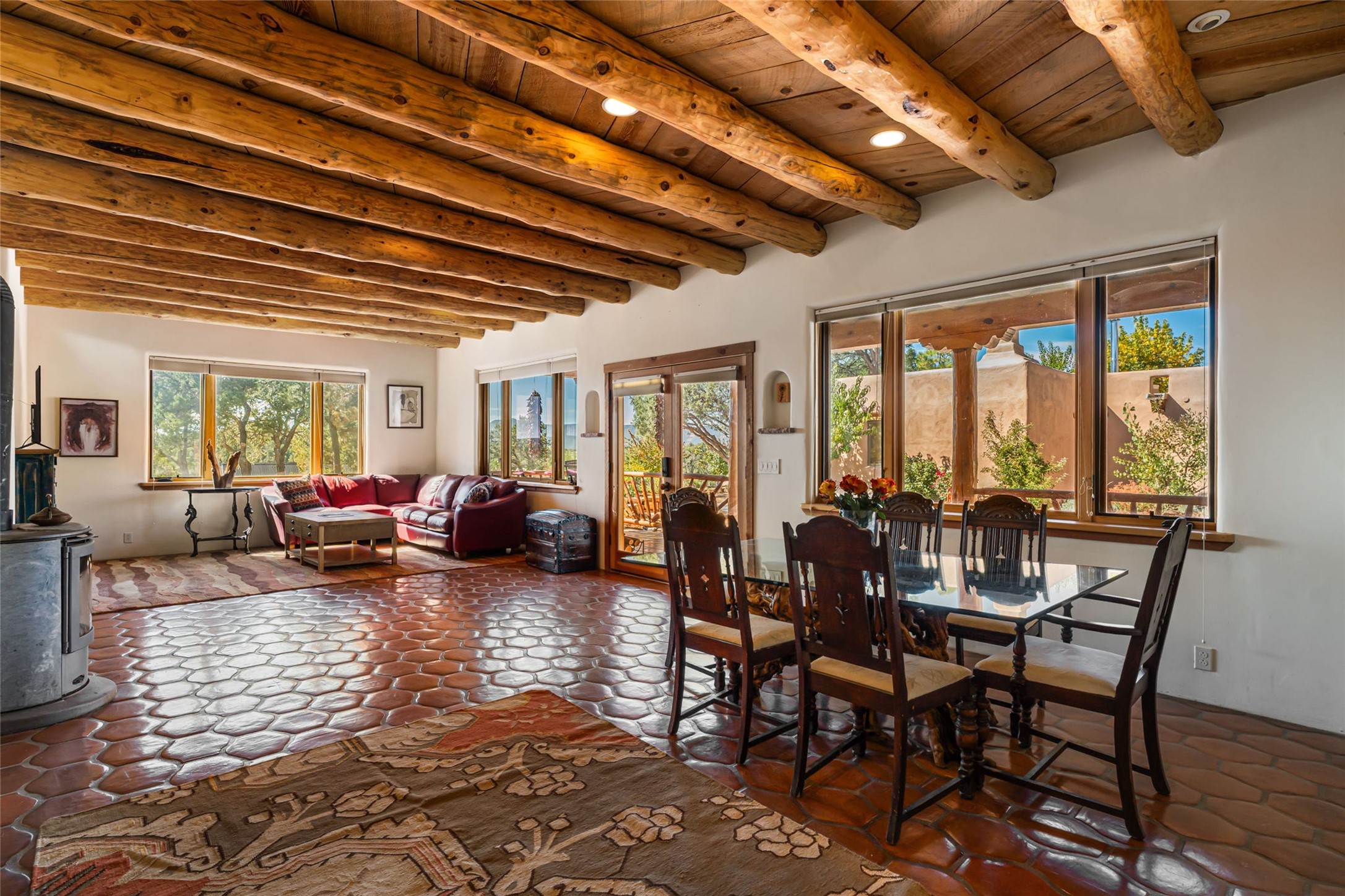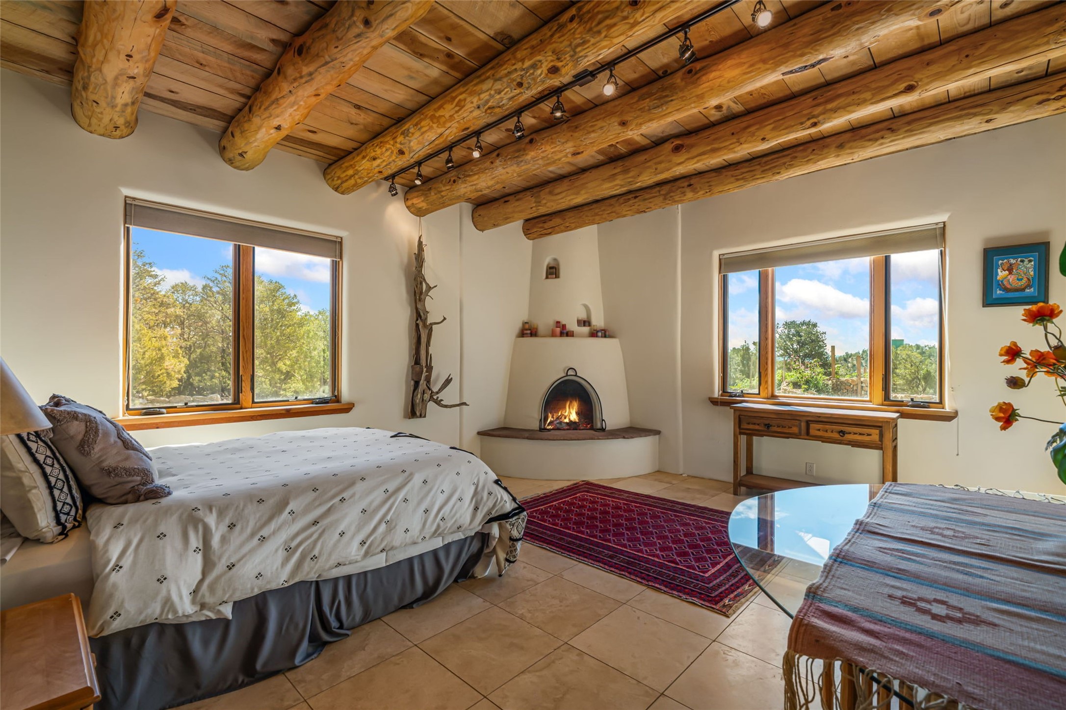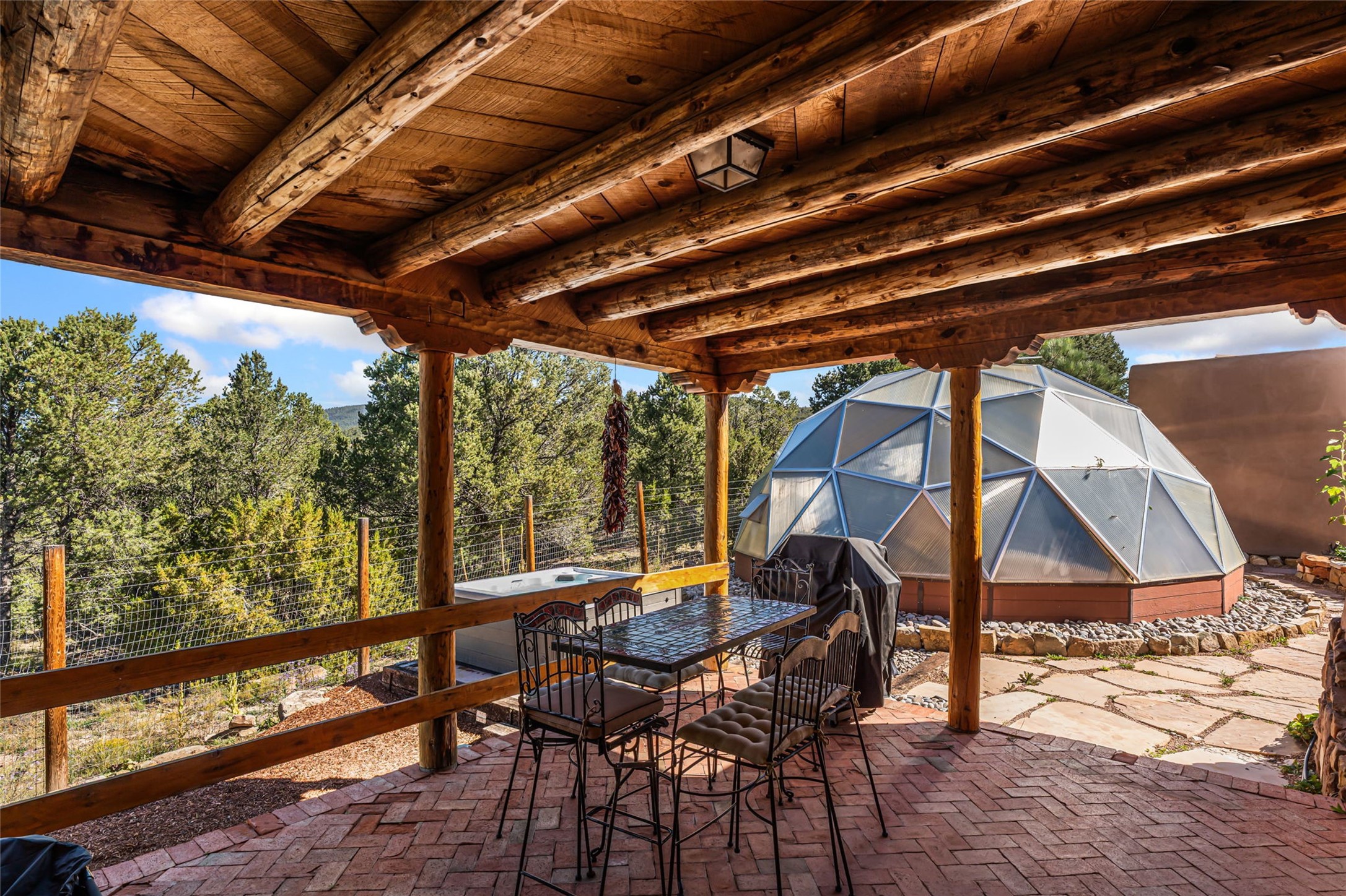 Set on nearly four acres 30 minutes from Santa Fe and only minutes from the Pecos River, 16 Hubbard Hill offers a profound and immediate sense of peace. The property overlooks serene Monastery Lake and borders more than one thousand acres of land belonging to the Benedictine Monastery, creating extraordinary privacy and an uninterrupted natural backdrop. This extraordinary estate was originally the personal residence and apex creation of renowned custom builder Richard Roybal, a true Northern New Mexico artisan whose craftsmanship is visible in every detail. Hand inlaid wood floors, sculpted stonework, vigas and latillas, aspen and willow ceilings and generous windows create a warm, soulful environment filled with natural light. The home has been thoughtfully expanded and impeccably maintained ever since, evolving into a property that supports both refined living and meaningful self-reliance.The current owners have continued this legacy with significant upgrades designed for long-term comfort and sustainability. A powerful solar system with a three-plus-day battery backup provides dependable energy independence. Improvements to water and power systems were completed with durability and ease of living in mind. New fruit trees and hundreds of berry plants complement the existing mature plantings, contributing to a landscape that functions as a flourishing food forest. Landscaping throughout the property has been refined to minimize maintenance, maximize automation and support a thriving ecosystem for humans, birds and bees. A private gate marks the entrance to the estate, and the grounds are fully fenced to accommodate dogs, making the land as welcoming as it is expansive.One of the most exceptional features of the estate is the expansive detached garage and south-facing studio, where dramatic glass garage doors fill the space with natural light. This luminous building is ideal for an artist, maker, healer or collector and functions beautifully as a workshop, gallery, creative studio or retreat space.The greenhouse beautifully supports a lifestyle of intentional, sustainable living. It includes a large hydroponic water enclosure, solar-operated fans, automated roof ventilation and raised beds with full drip irrigation, all designed for maximum growing efficiency and year-round cultivation.The fully appointed guest house is a complete home of its own, not a simple casita. High ceilings and large windows create an airy, spacious feel, while thoughtfully placed skylights bring in abundant natural light. Heated tile floors throughout add comfort and warmth, and the full amenities offer exceptional flexibility for hosting, multigenerational living or generating rental income.With approximately eight thousand square feet of living and studio space, exceptional craftsmanship, modern enhancements and a landscape that feels both magical and deeply grounding, 16 Hubbard Hill stands as a truly singular offering. It is a home built to endure, expanded with care and aligned with a lifestyle that values beauty, creativity and self-reliance. A rare sanctuary with endless potential.