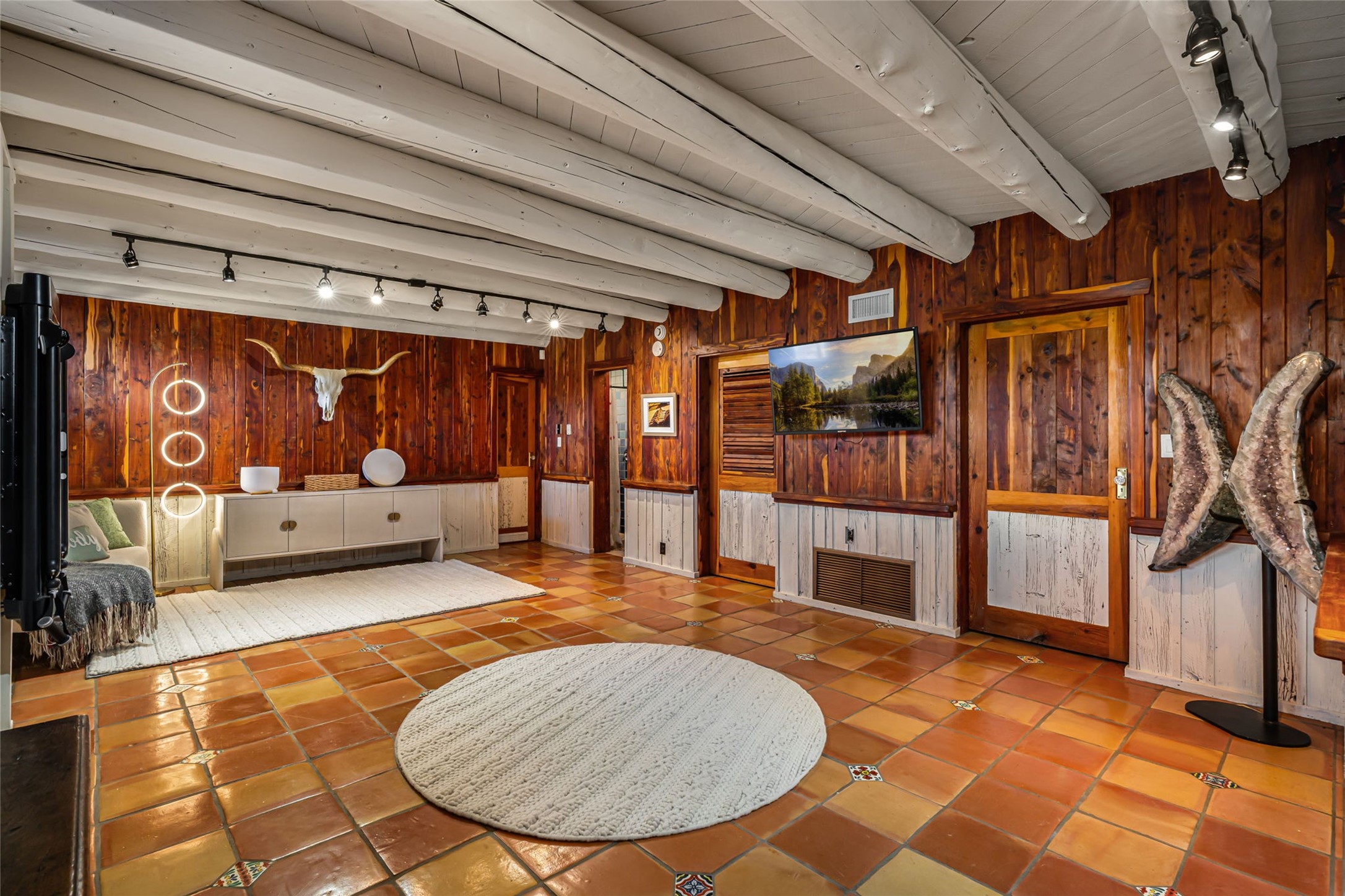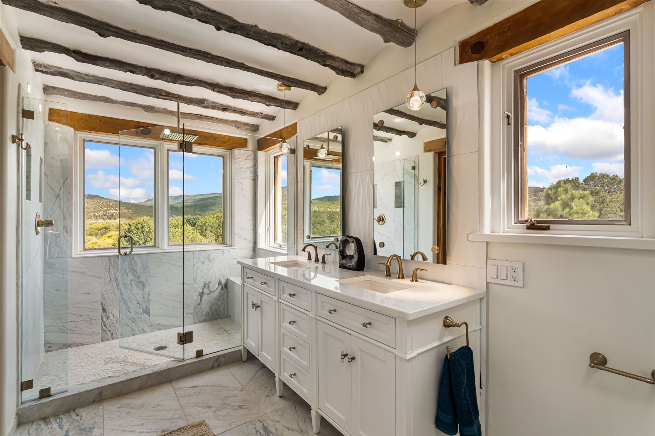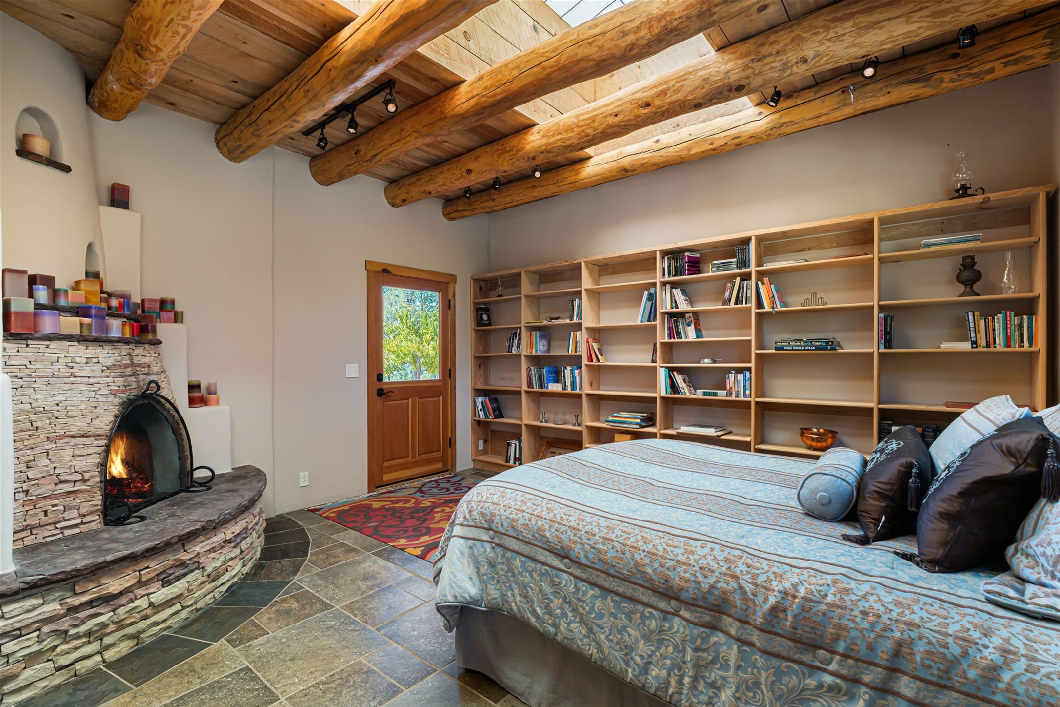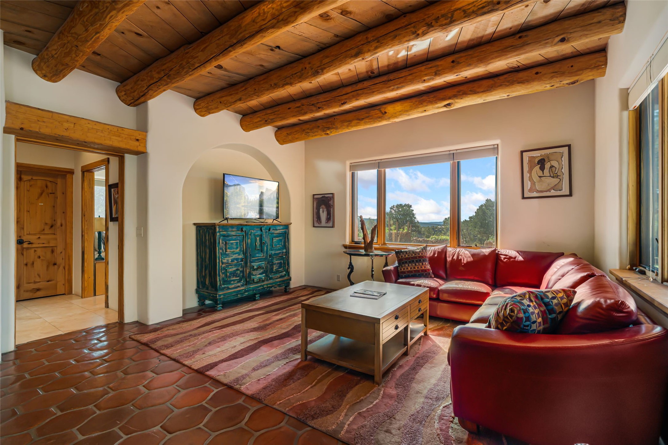Set on nearly four acres 30 minutes from Santa Fe and only minutes from the Pecos River, 16 Hubbard Hill offers a profound and immediate sense of peace. The property overlooks serene Monastery Lake and borders more than one thousand acres of land belonging to the Benedictine Monastery, creating extraordinary privacy and an uninterrupted natural backdrop. This extraordinary estate was originally the personal residence and apex creation of renowned custom builder Richard Roybal, a true Northern New Mexico artisan whose craftsmanship is visible in every detail. Hand inlaid wood floors, sculpted stonework, vigas and latillas, aspen and willow ceilings and generous windows create a warm, soulful environment filled with natural light. The home has been thoughtfully expanded and impeccably maintained ever since, evolving into a property that supports both refined living and meaningful self-reliance.The current owners have continued this legacy with significant upgrades designed for long-term comfort and sustainability. A powerful solar system with a three-plus-day battery backup provides dependable energy independence. Improvements to water and power systems were completed with durability and ease of living in mind. New fruit trees and hundreds of berry plants complement the existing mature plantings, contributing to a landscape that functions as a flourishing food forest. Landscaping throughout the property has been refined to minimize maintenance, maximize automation and support a thriving ecosystem for humans, birds and bees. A private gate marks the entrance to the estate, and the grounds are fully fenced to accommodate dogs, making the land as welcoming as it is expansive.One of the most exceptional features of the estate is the expansive detached garage and south-facing studio, where dramatic glass garage doors fill the space with natural light. This luminous building is ideal for an artist, maker, healer or collector and functions beautifully as a workshop, gallery, creative studio or retreat space.The greenhouse beautifully supports a lifestyle of intentional, sustainable living. It includes a large hydroponic water enclosure, solar-operated fans, automated roof ventilation and raised beds with full drip irrigation, all designed for maximum growing efficiency and year-round cultivation.The fully appointed guest house is a complete home of its own, not a simple casita. High ceilings and large windows create an airy, spacious feel, while thoughtfully placed skylights bring in abundant natural light. Heated tile floors throughout add comfort and warmth, and the full amenities offer exceptional flexibility for hosting, multigenerational living or generating rental income.With approximately eight thousand square feet of living and studio space, exceptional craftsmanship, modern enhancements and a landscape that feels both magical and deeply grounding, 16 Hubbard Hill stands as a truly singular offering. It is a home built to endure, expanded with care and aligned with a lifestyle that values beauty, creativity and self-reliance. A rare sanctuary with endless potential.