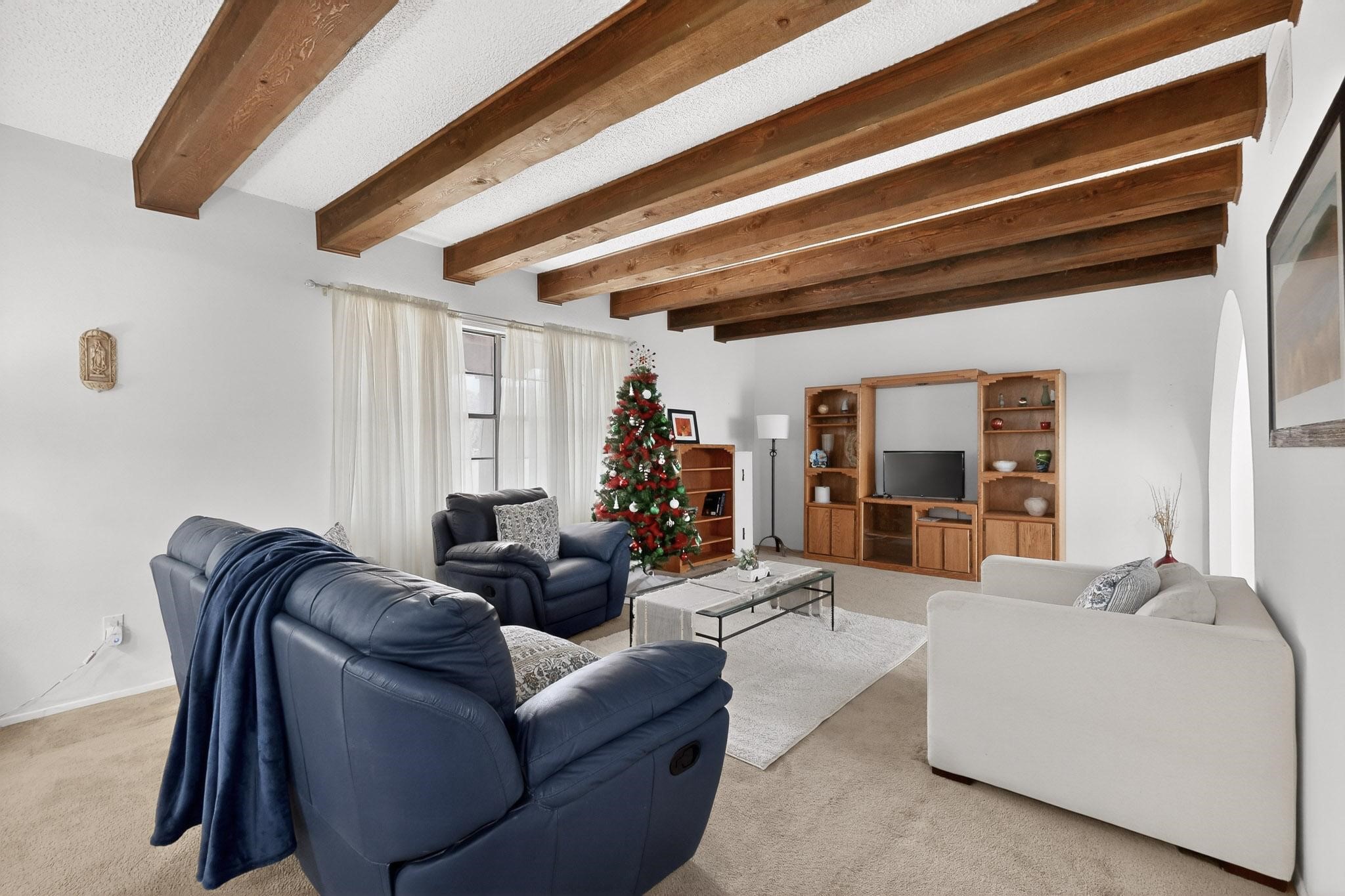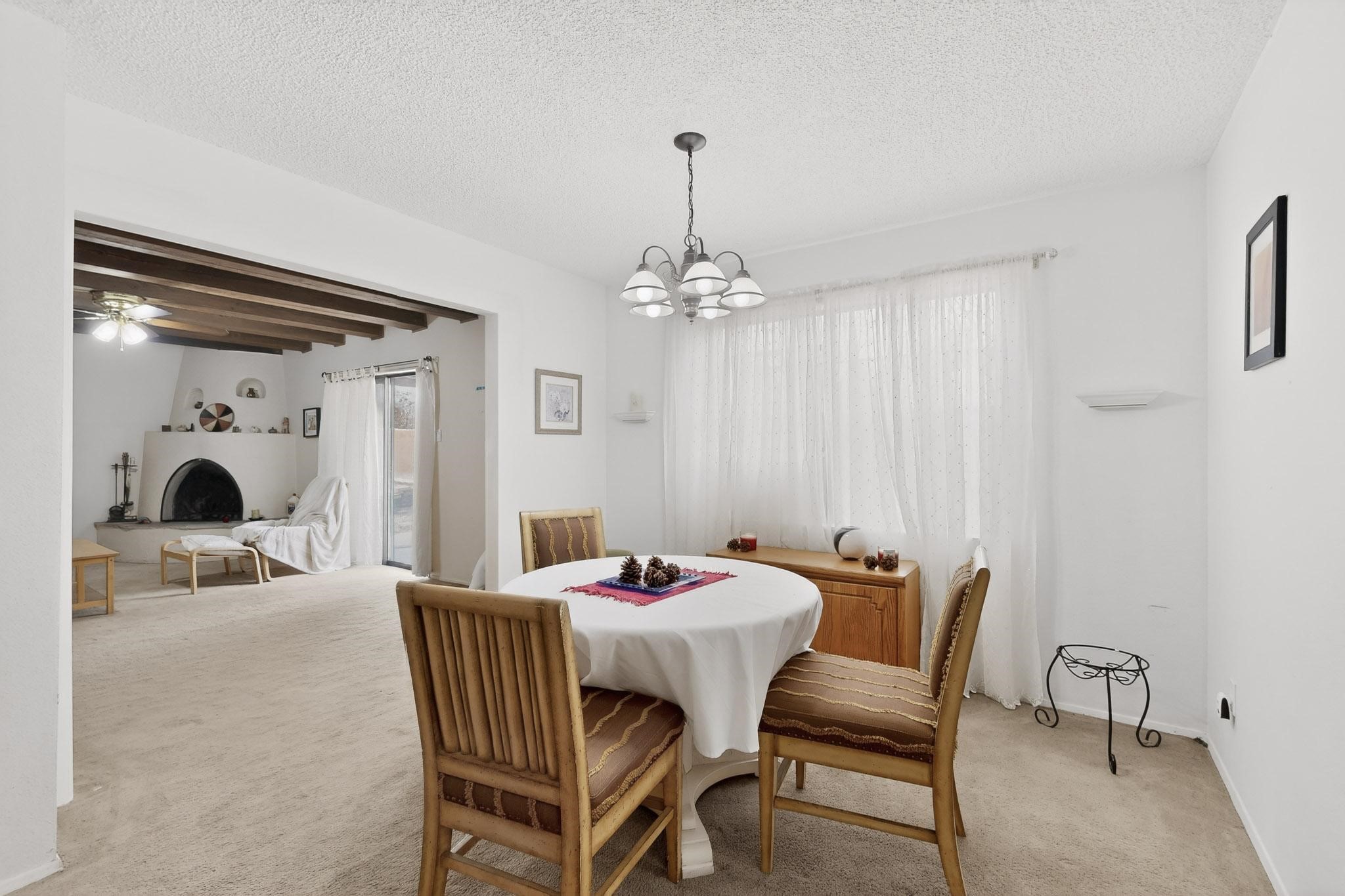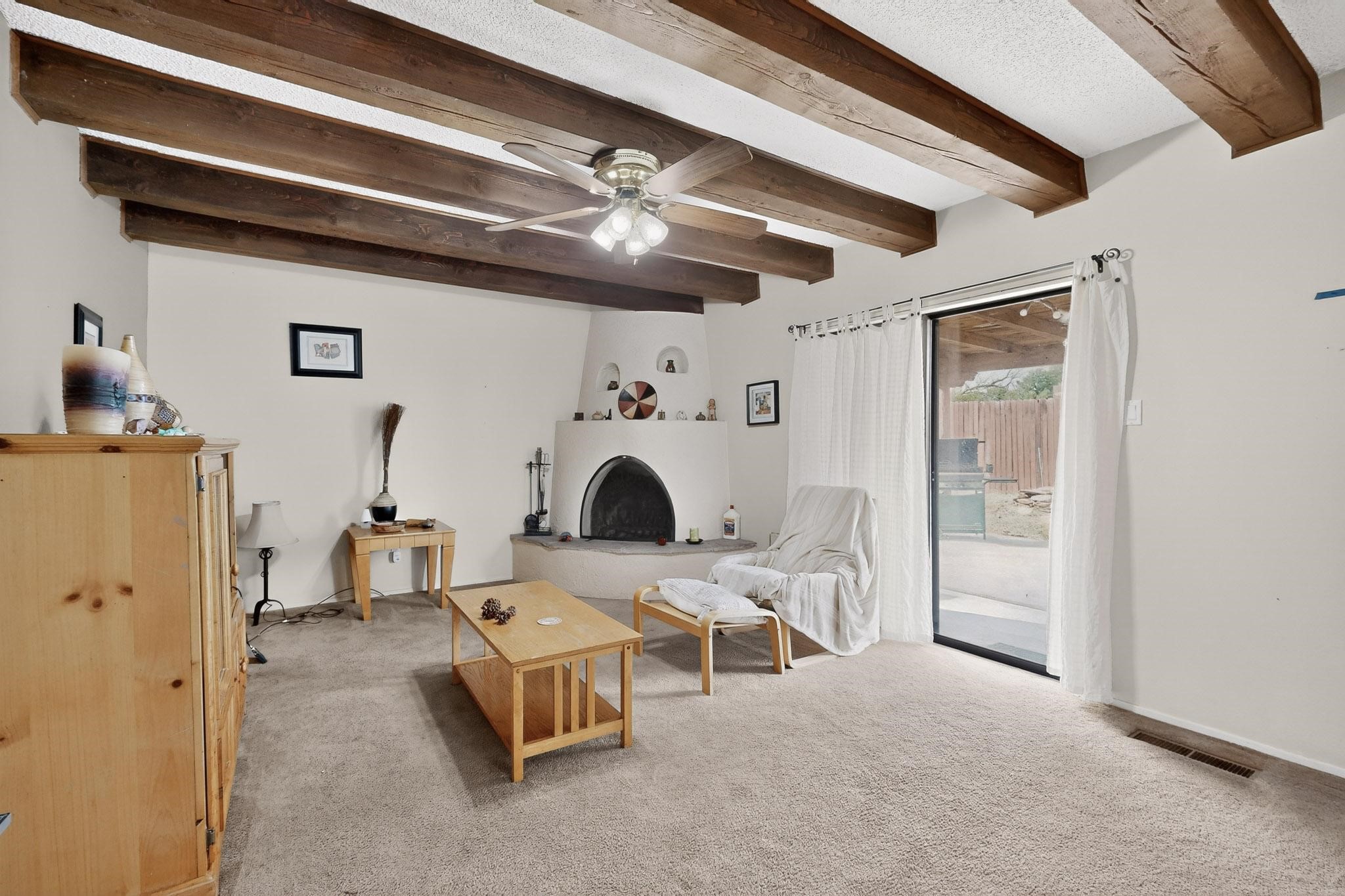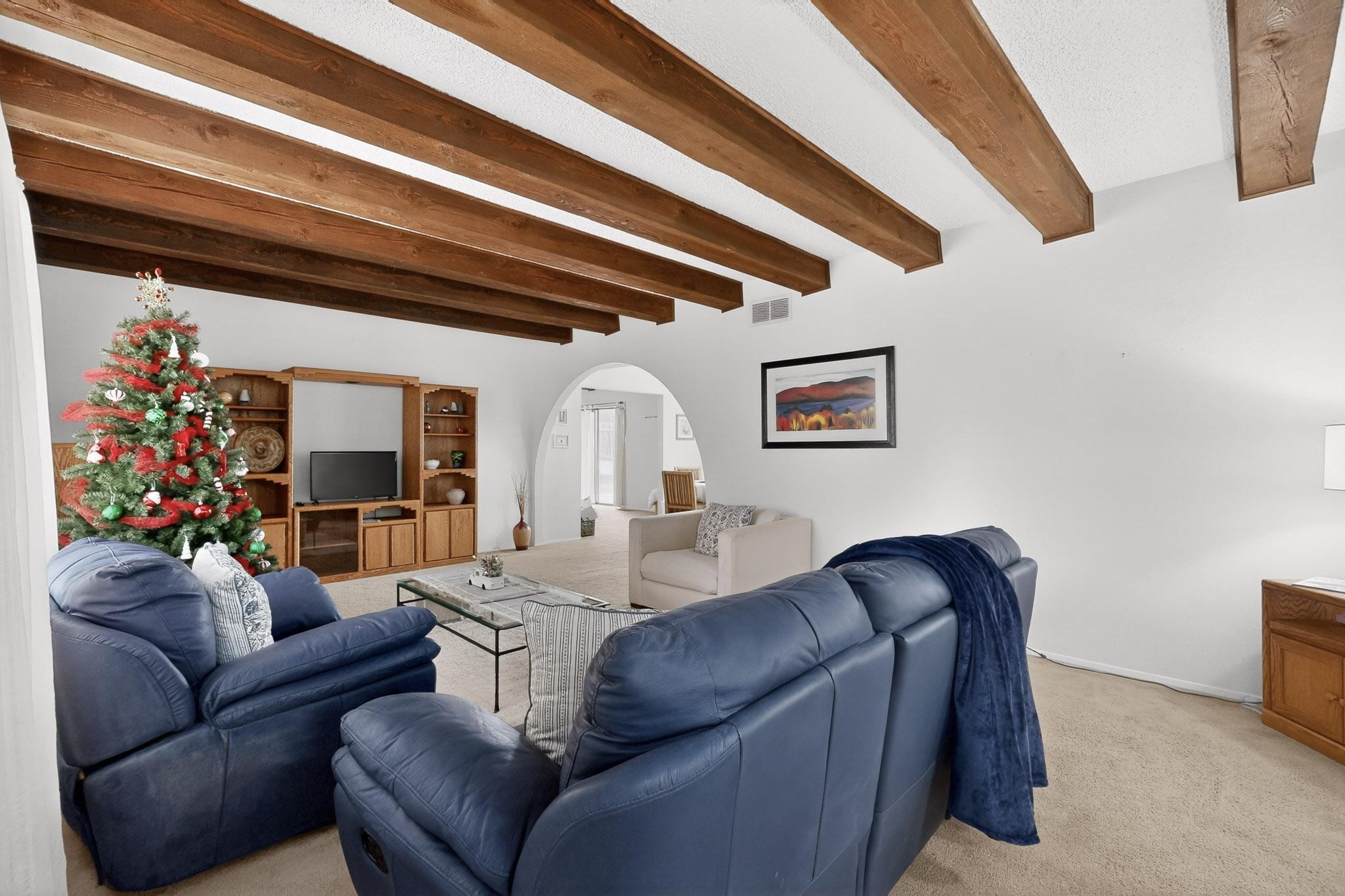 Spacious single level home on large 1/3rd acre corner location in well established Via Caballero II subdivision. This contemporary pueblo style 3 bedroom, 2 bath home features a large living room and a secondary family room with a corner kiva fireplace for cosy winters. There is a formal dining room, a breakfast bar and nook in the country kitchen, and a patio door leading out to the portal and garden ideal for summer and winter entertaining. The main bedroom suite is separated from the guest bedrooms by a hallway for privacy. One of the guest bedrooms was set up for an office. The home has some interior popcorn ceilings that may contain some asbestos which was customarily used at the time of construction. A large 2 car garage also includes a separate boiler for heat-condition unknown, and plenty of storage. There is also a precautionary lead paint addendum although the home was built later than 1978. This home has been much loved and is waiting for a new owner to bring it up to date and to it's former glory.
