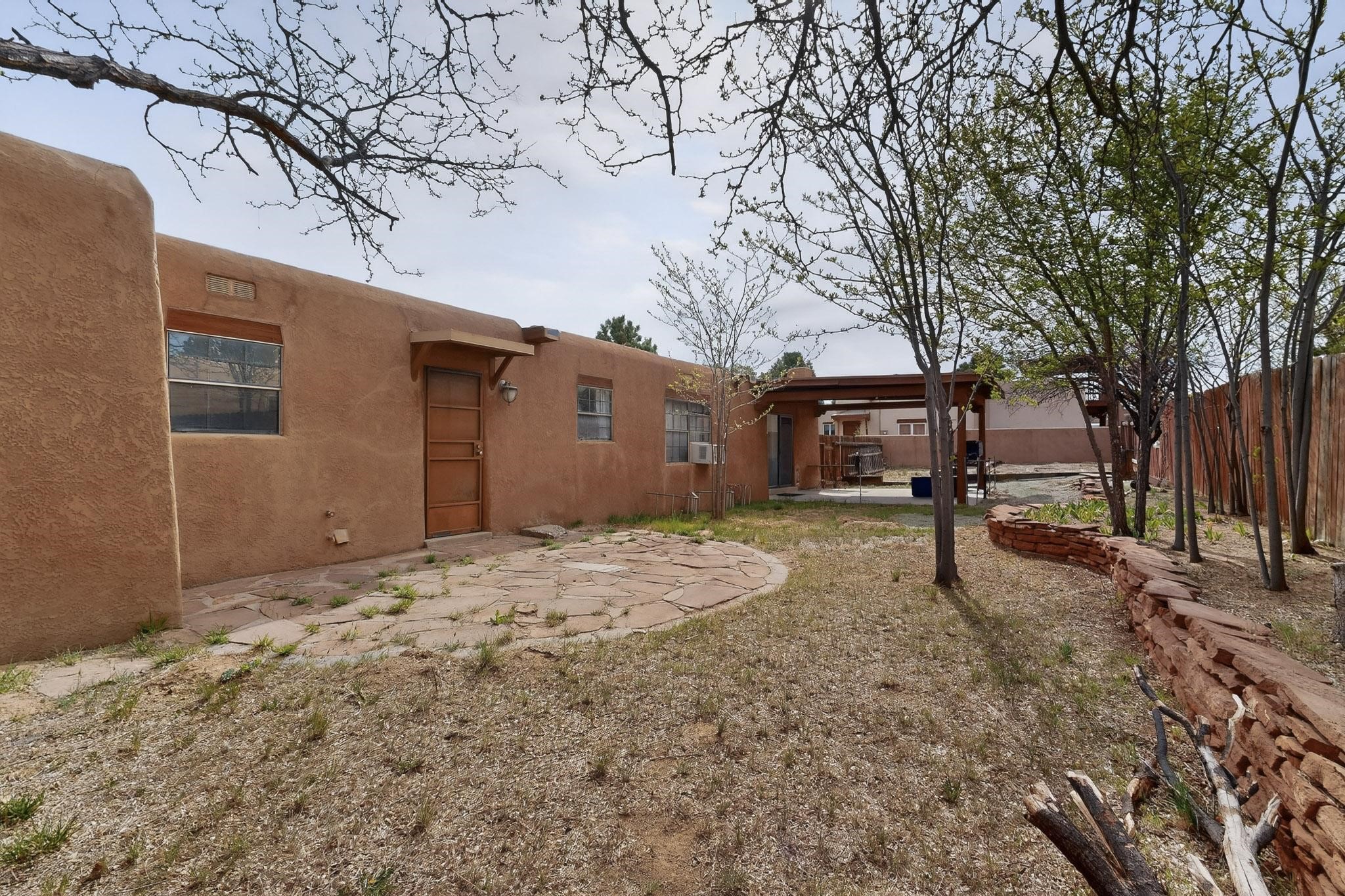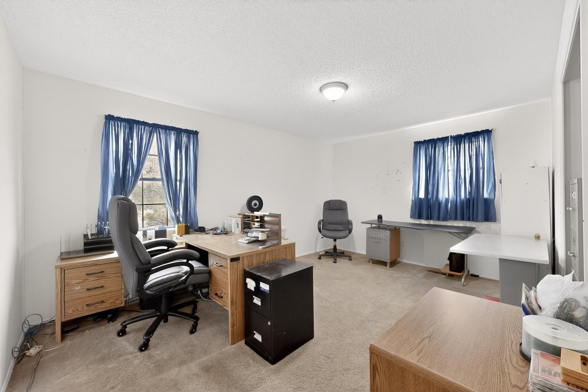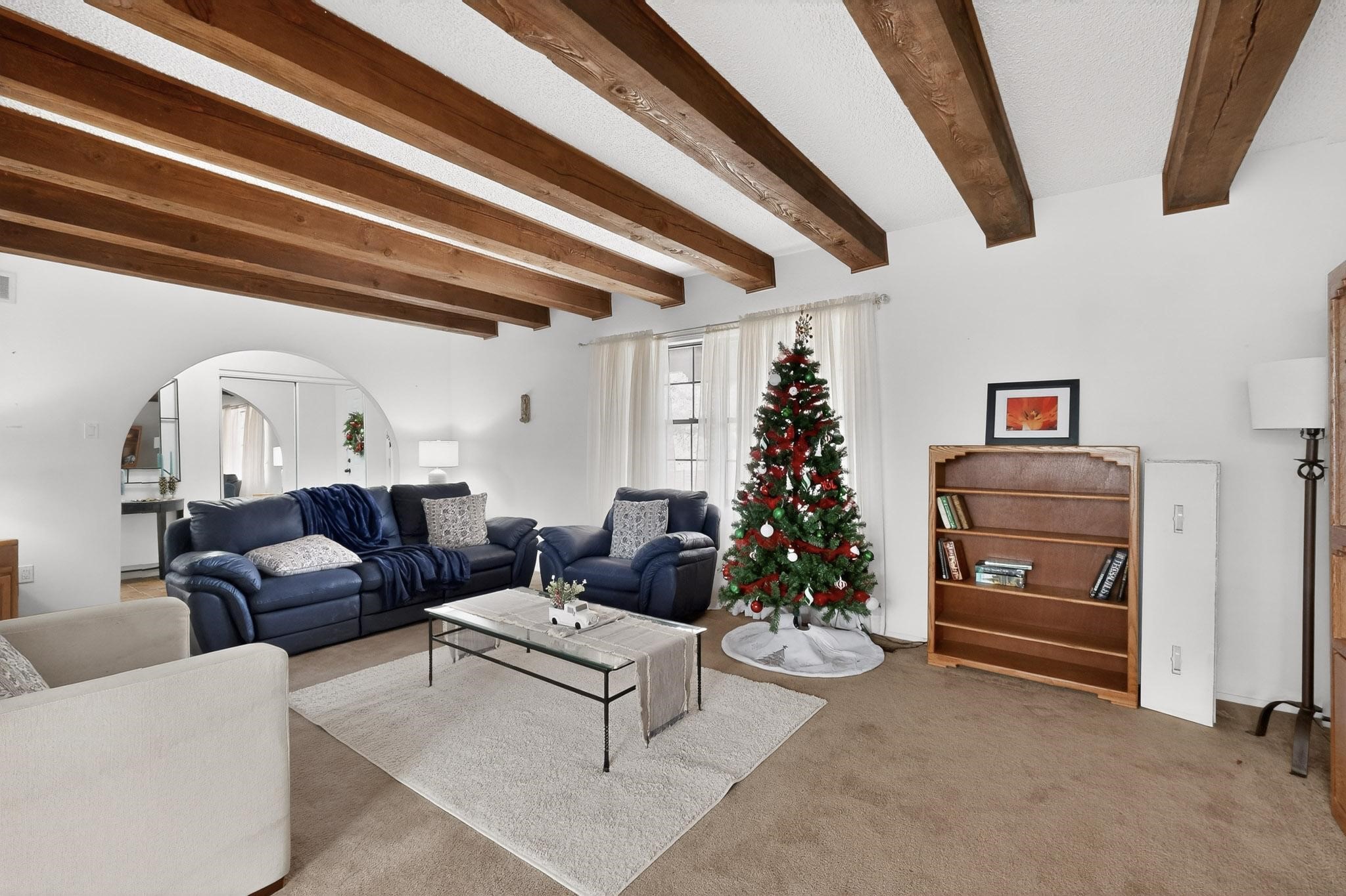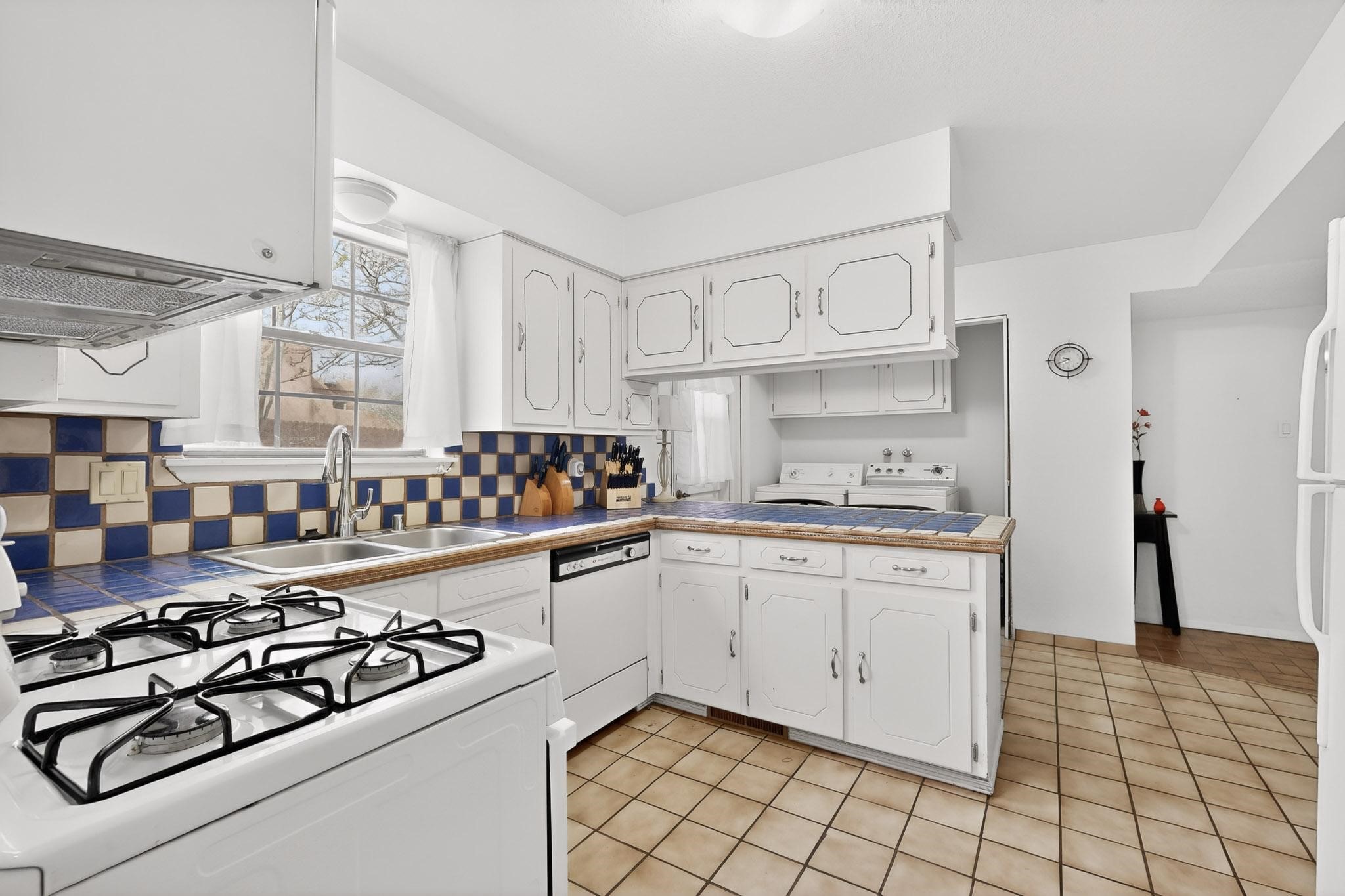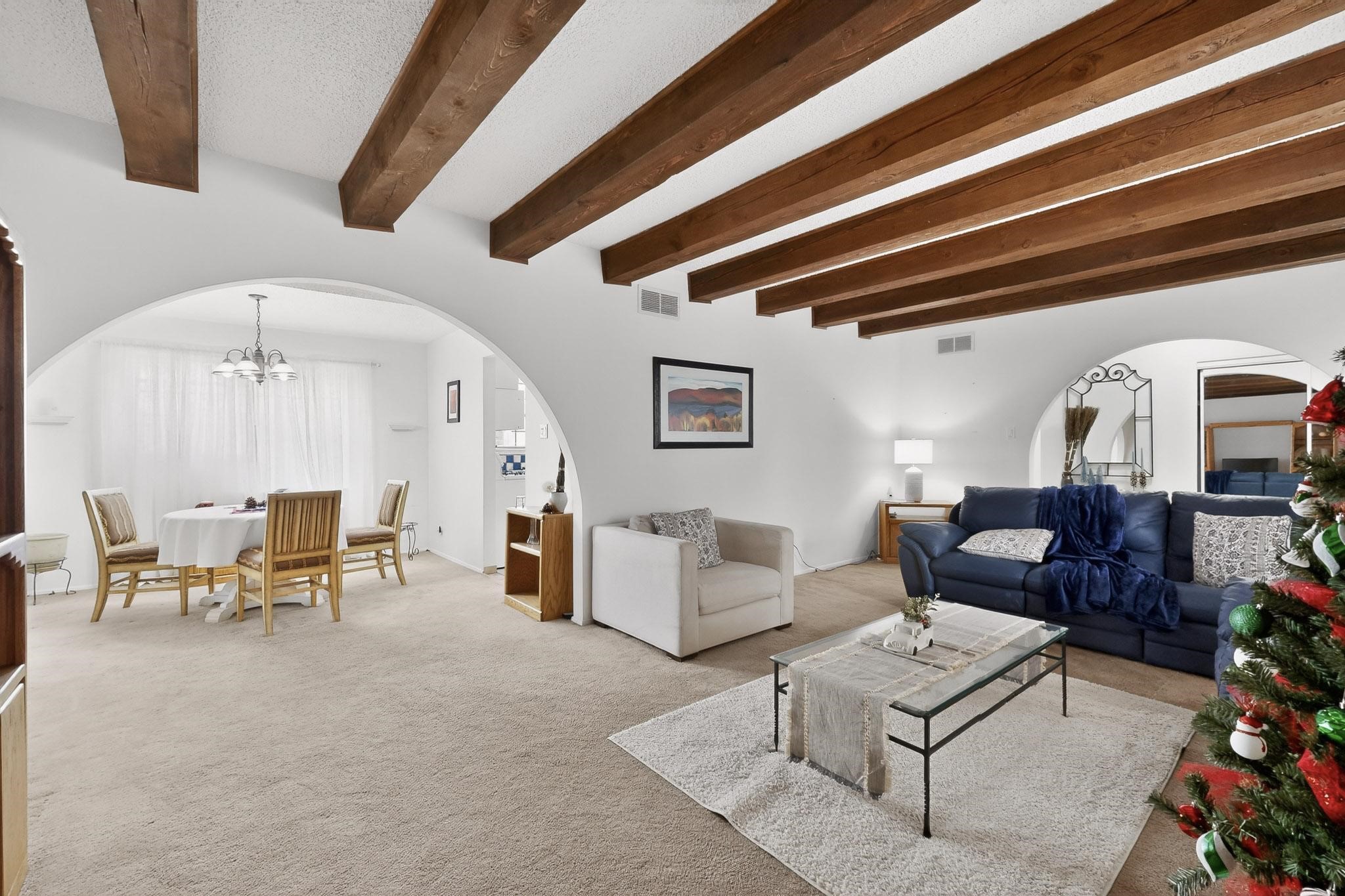 Spacious single level home on large 1/3rd acre corner location in well established Via Caballero II subdivision. This contemporary pueblo style 3 bedroom, 2 bath home features a large living room and a secondary family room with a corner kiva fireplace for cosy winters. There is a formal dining room, a breakfast bar and nook in the country kitchen, and a patio door leading out to the portal and garden ideal for summer and winter entertaining. The main bedroom suite is separated from the guest bedrooms by a hallway for privacy. One of the guest bedrooms was set up for an office. The home has some interior popcorn ceilings that may contain some asbestos which was customarily used at the time of construction. A large 2 car garage also includes a separate boiler for heat-condition unknown, and plenty of storage. There is also a precautionary lead paint addendum although the home was built later than 1978. This home has been much loved and is waiting for a new owner to bring it up to date and to it's former glory.