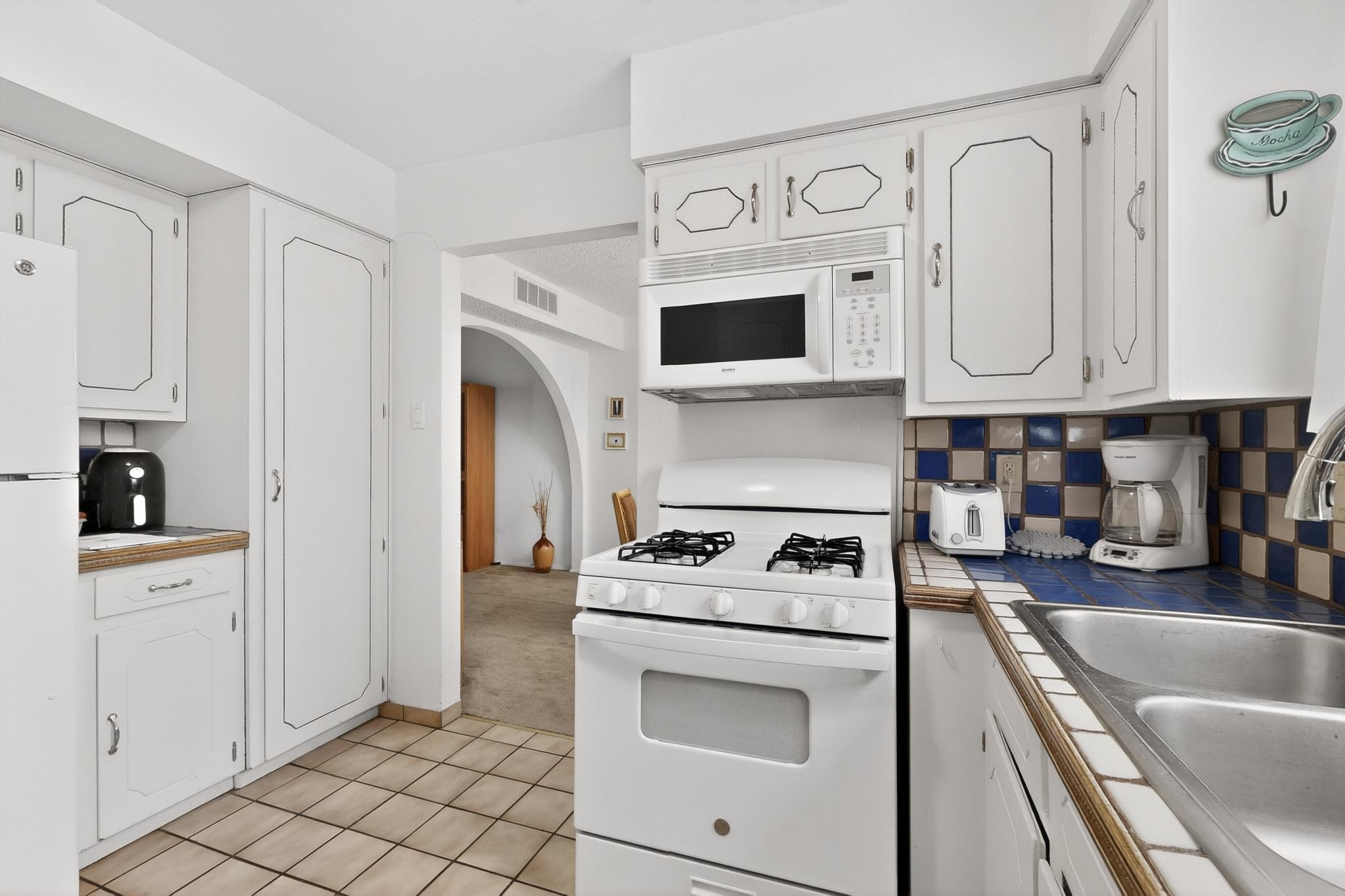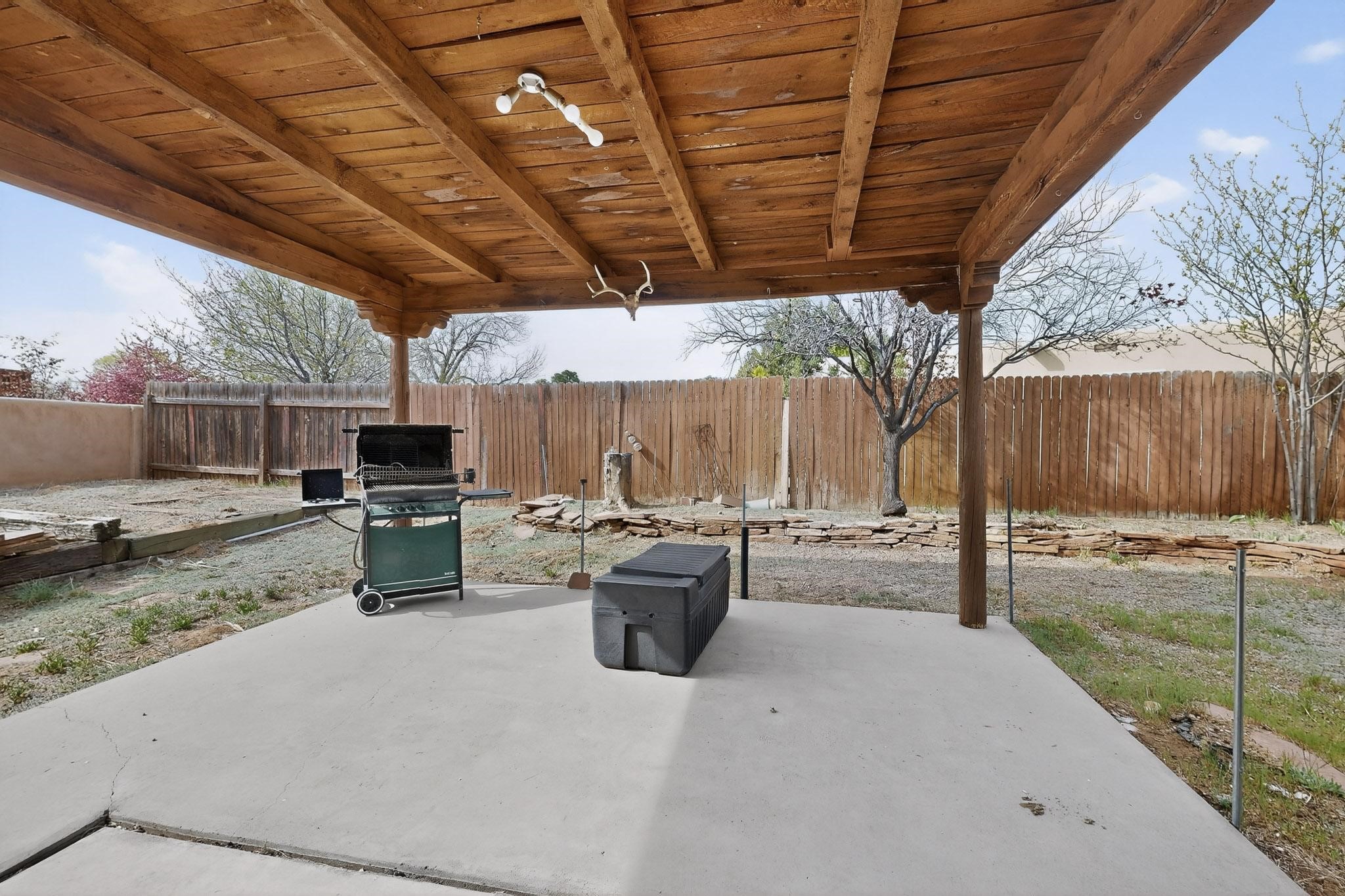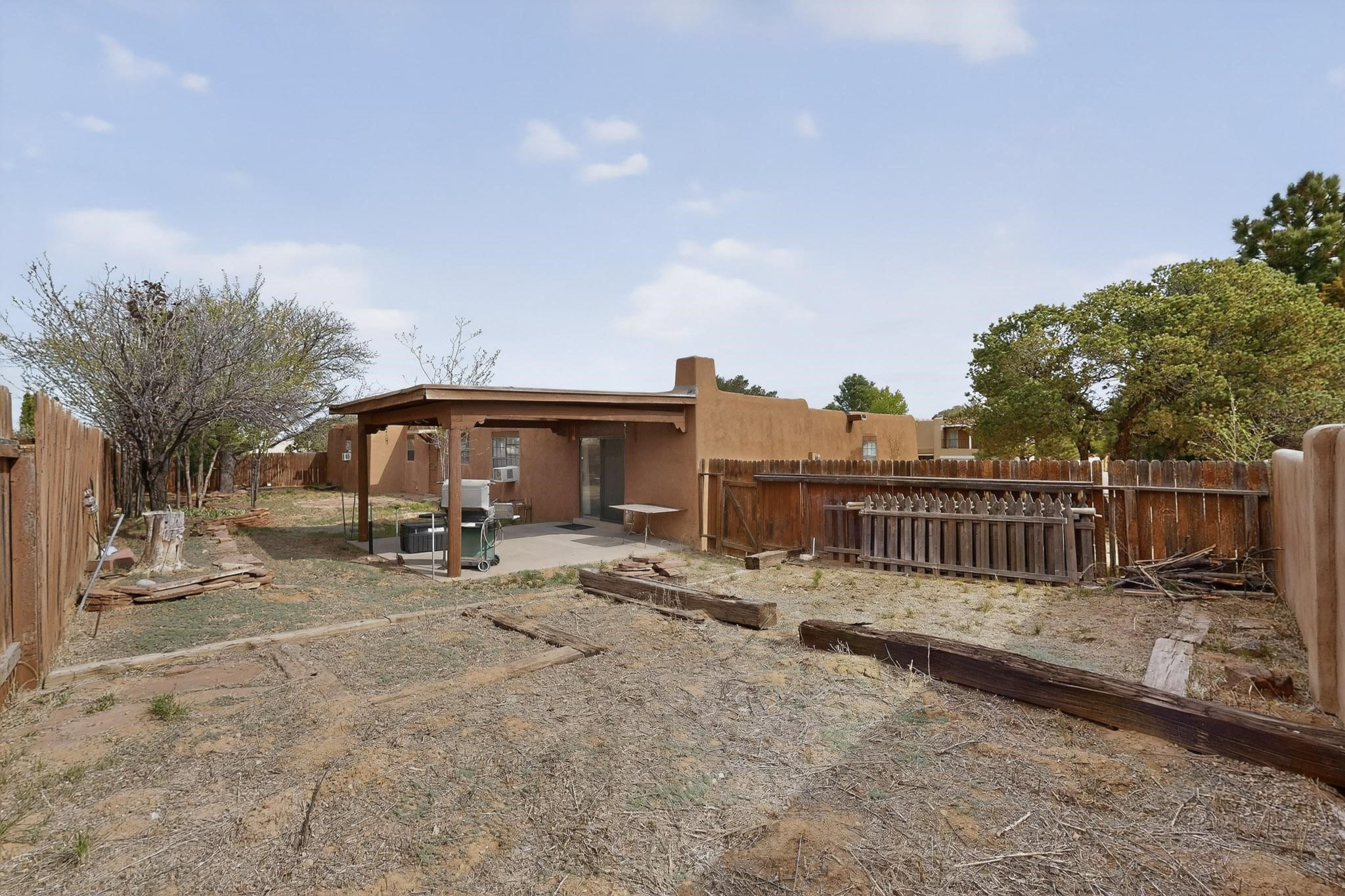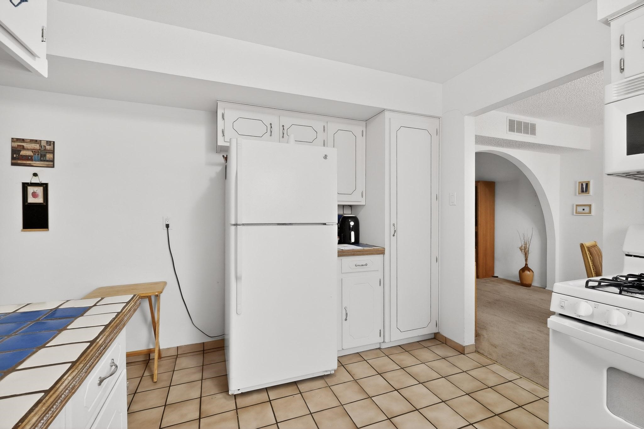 Spacious single level home on large 1/3rd acre corner location in well established Via Caballero II subdivision. This contemporary pueblo style 3 bedroom, 2 bath home features a large living room and a secondary family room with a corner kiva fireplace for cosy winters. There is a formal dining room, a breakfast bar and nook in the country kitchen, and a patio door leading out to the portal and garden ideal for summer and winter entertaining. The main bedroom suite is separated from the guest bedrooms by a hallway for privacy. One of the guest bedrooms was set up for an office. The home has some interior popcorn ceilings that may contain some asbestos which was customarily used at the time of construction. A large 2 car garage also includes a separate boiler for heat-condition unknown, and plenty of storage. There is also a precautionary lead paint addendum although the home was built later than 1978. This home has been much loved and is waiting for a new owner to bring it up to date and to it's former glory.