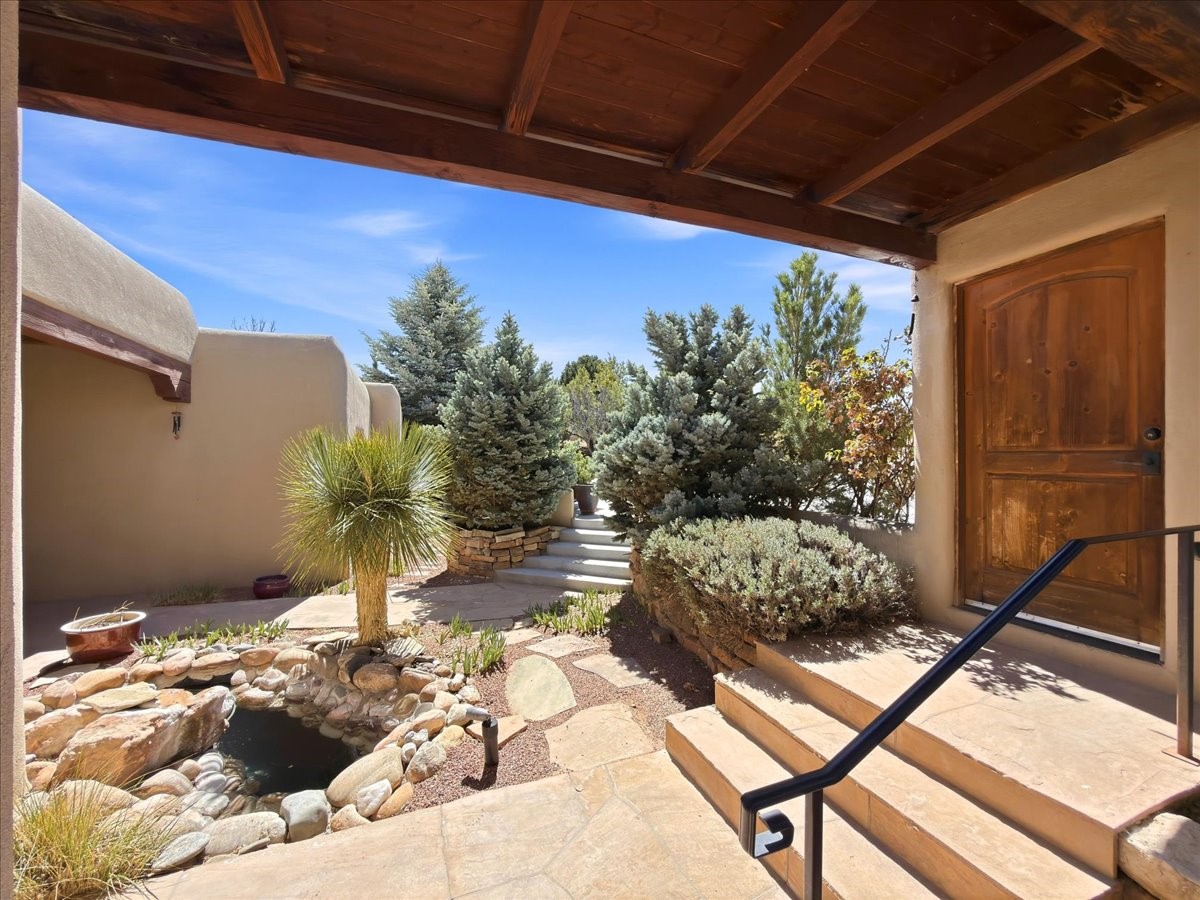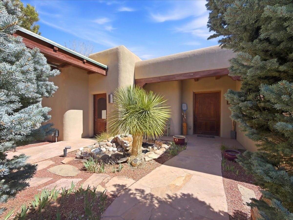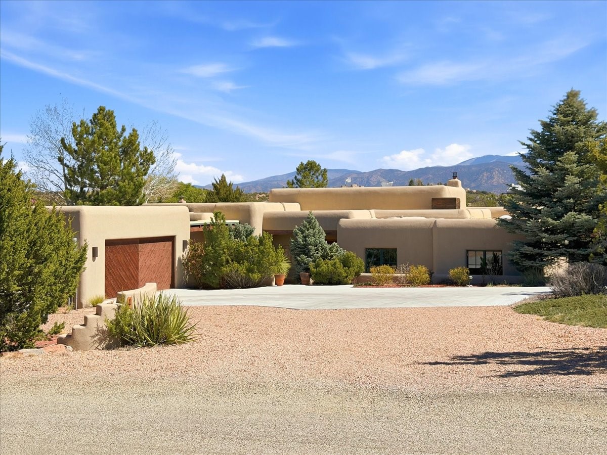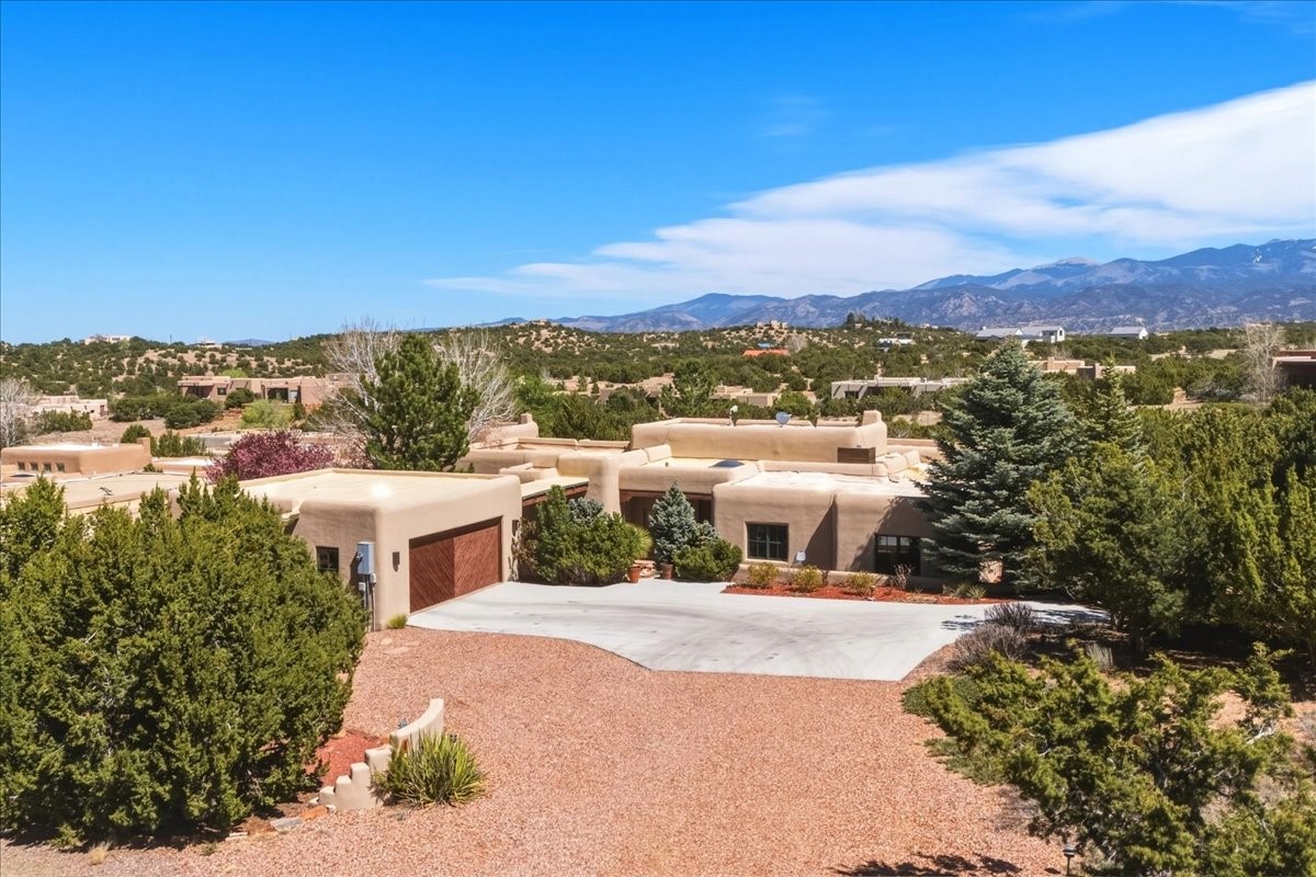 This builder's showcase home, featured in Santa Fe's Parade of Homes, is ideally situated within the highly sought-after Heartstone community. Spanning approximately 2,558 square feet, this thoughtfully designed, energy-efficient residence offers expansive interiors, breathtaking mountain views, and an authentic Santa Fe lifestyle.The single-level floor plan balances beauty, comfort, and functionality, featuring an oversized primary suite, two additional bedrooms, 2.5 baths, and generously proportioned kitchen, living, and dining spaces. Filled with natural light, the home is designed for both everyday living and effortless entertaining, with quality craftsmanship evident in every detail.Distinctive features include vigas and paneled ceilings, diamond-finish plaster walls in the main living areas, custom cabinetry and doors, and a traditional wood-burning kiva fireplace. Recent upgrades include an energy-efficient tankless heating and hot water system installed in late 2025. Outdoor spaces are equally inviting, with a flagstone entry accented by a pond and waterfall, a walled flower garden, fruit trees, and a paved parking area.Heartstone is known for its spacious half-acre homesites centered around a 48-acre meadow and community house. Residents enjoy direct access to the La Tierra Trails, offering over 25 miles of scenic paths for hiking and cycling. The community house provides gathering spaces, including fitness and media rooms, a dining area for events, and a guest suite. Additional benefits include shared wells maintained by the HOA and low dues.Located just minutes from the Santa Fe Plaza, Canyon Road, world-class dining, museums, and the Santa Fe Opera, this well-maintained, move-in-ready home presents a rare opportunity to own a refined mountain-view property in one of Santa Fe's most desirable communities.