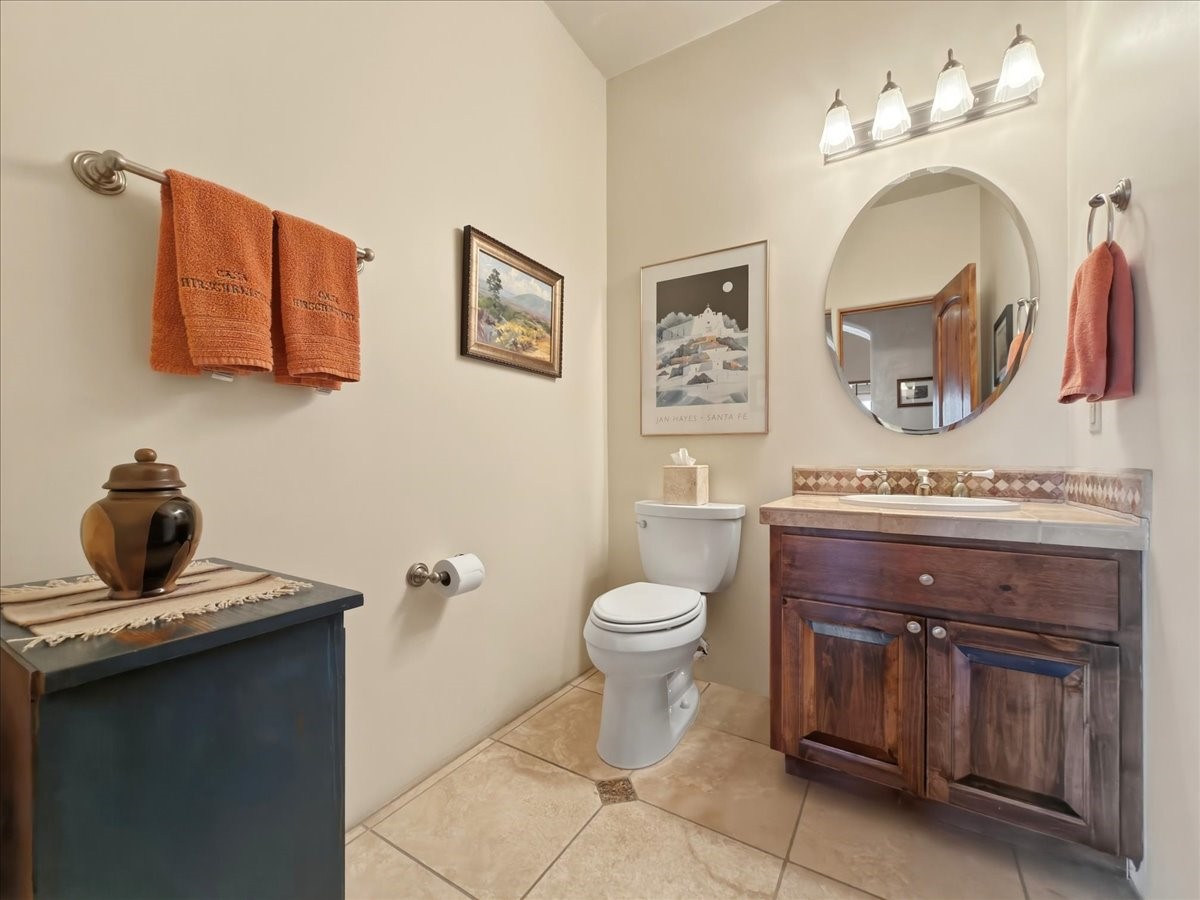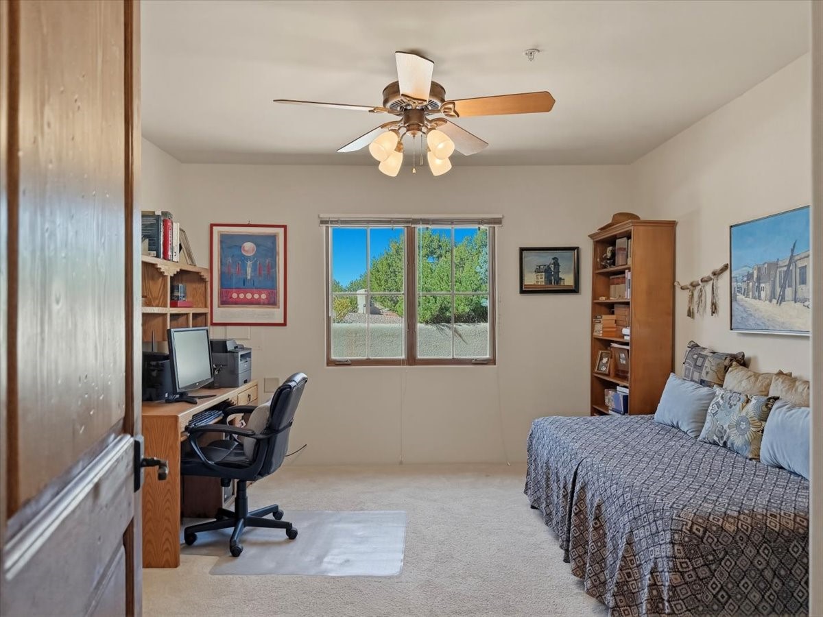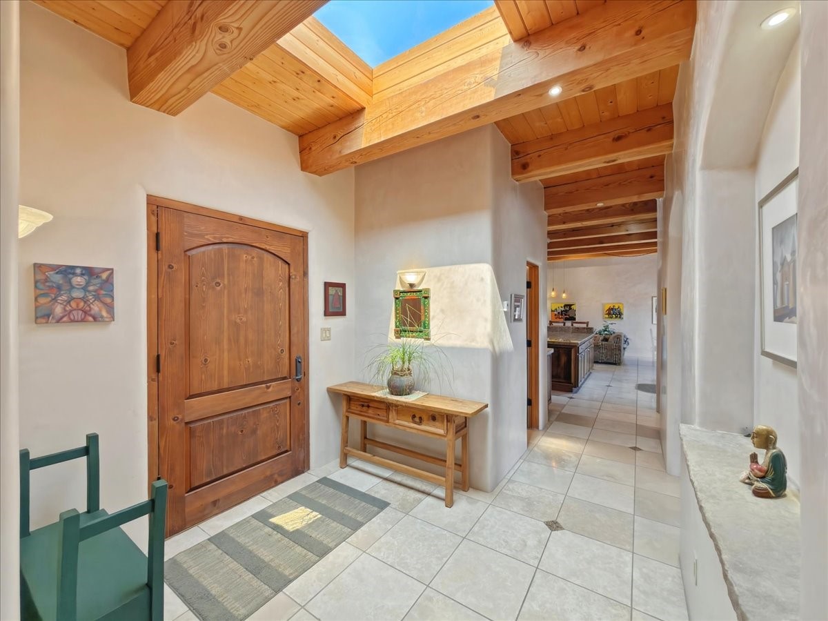 This builder's showcase home, featured in Santa Fe's Parade of Homes, is ideally situated within the highly sought-after Heartstone community. Spanning approximately 2,558 square feet, this thoughtfully designed, energy-efficient residence offers expansive interiors, breathtaking mountain views, and an authentic Santa Fe lifestyle.The single-level floor plan balances beauty, comfort, and functionality, featuring an oversized primary suite, two additional bedrooms, 2.5 baths, and generously proportioned kitchen, living, and dining spaces. Filled with natural light, the home is designed for both everyday living and effortless entertaining, with quality craftsmanship evident in every detail.Distinctive features include vigas and paneled ceilings, diamond-finish plaster walls in the main living areas, custom cabinetry and doors, and a traditional wood-burning kiva fireplace. Recent upgrades include an energy-efficient tankless heating and hot water system installed in late 2025. Outdoor spaces are equally inviting, with a flagstone entry accented by a pond and waterfall, a walled flower garden, fruit trees, and a paved parking area.Heartstone is known for its spacious half-acre homesites centered around a 48-acre meadow and community house. Residents enjoy direct access to the La Tierra Trails, offering over 25 miles of scenic paths for hiking and cycling. The community house provides gathering spaces, including fitness and media rooms, a dining area for events, and a guest suite. Additional benefits include shared wells maintained by the HOA and low dues.Located just minutes from the Santa Fe Plaza, Canyon Road, world-class dining, museums, and the Santa Fe Opera, this well-maintained, move-in-ready home presents a rare opportunity to own a refined mountain-view property in one of Santa Fe's most desirable communities.