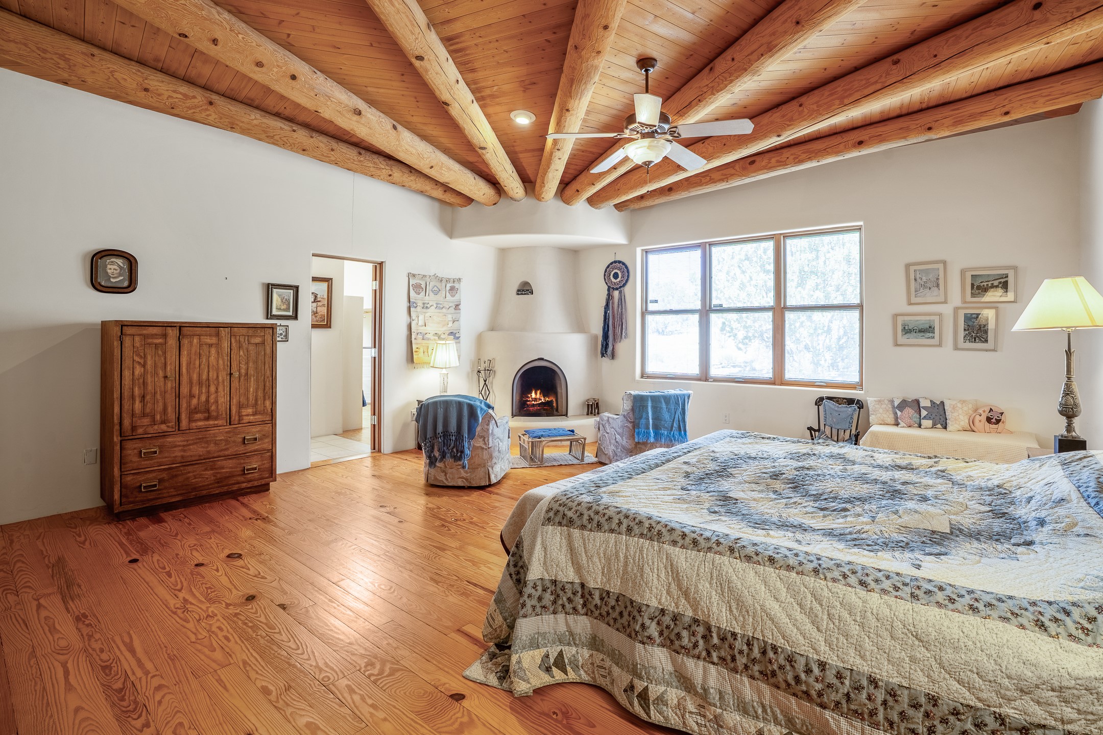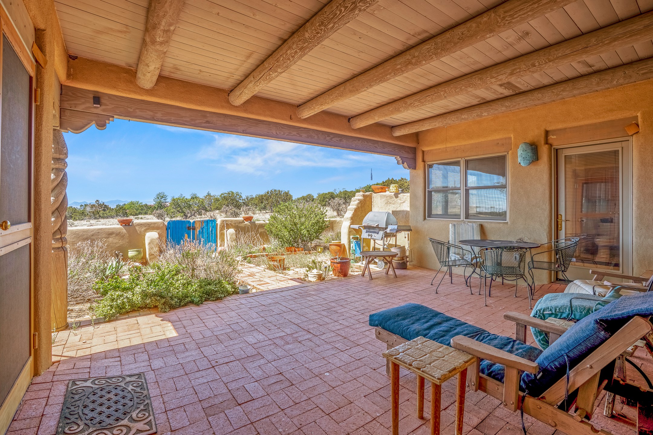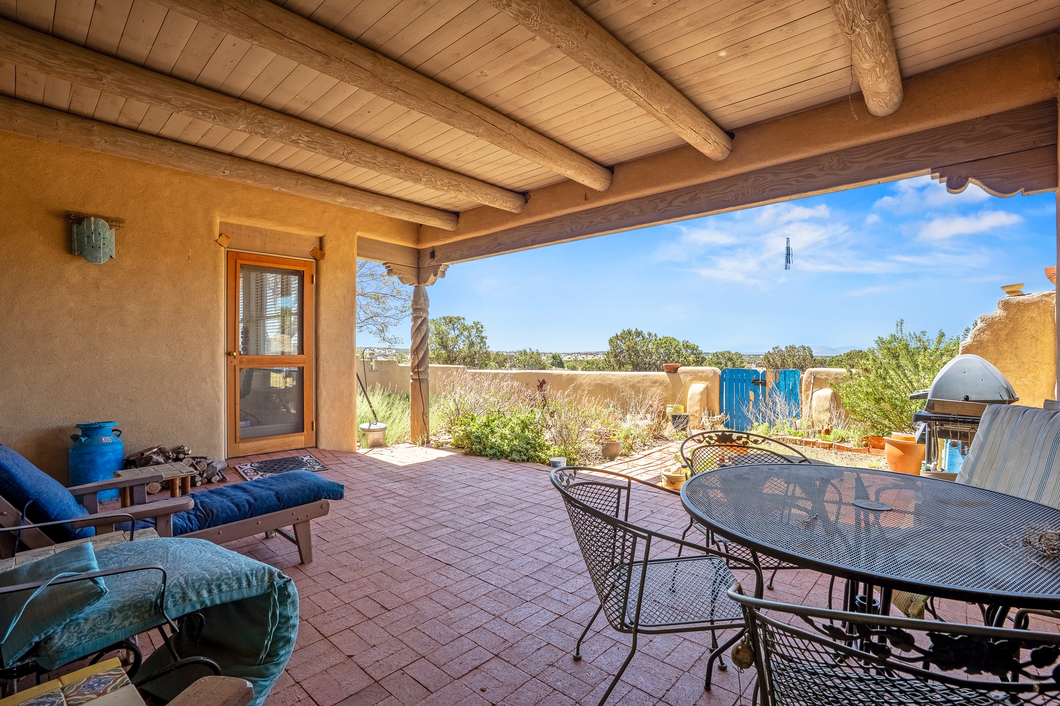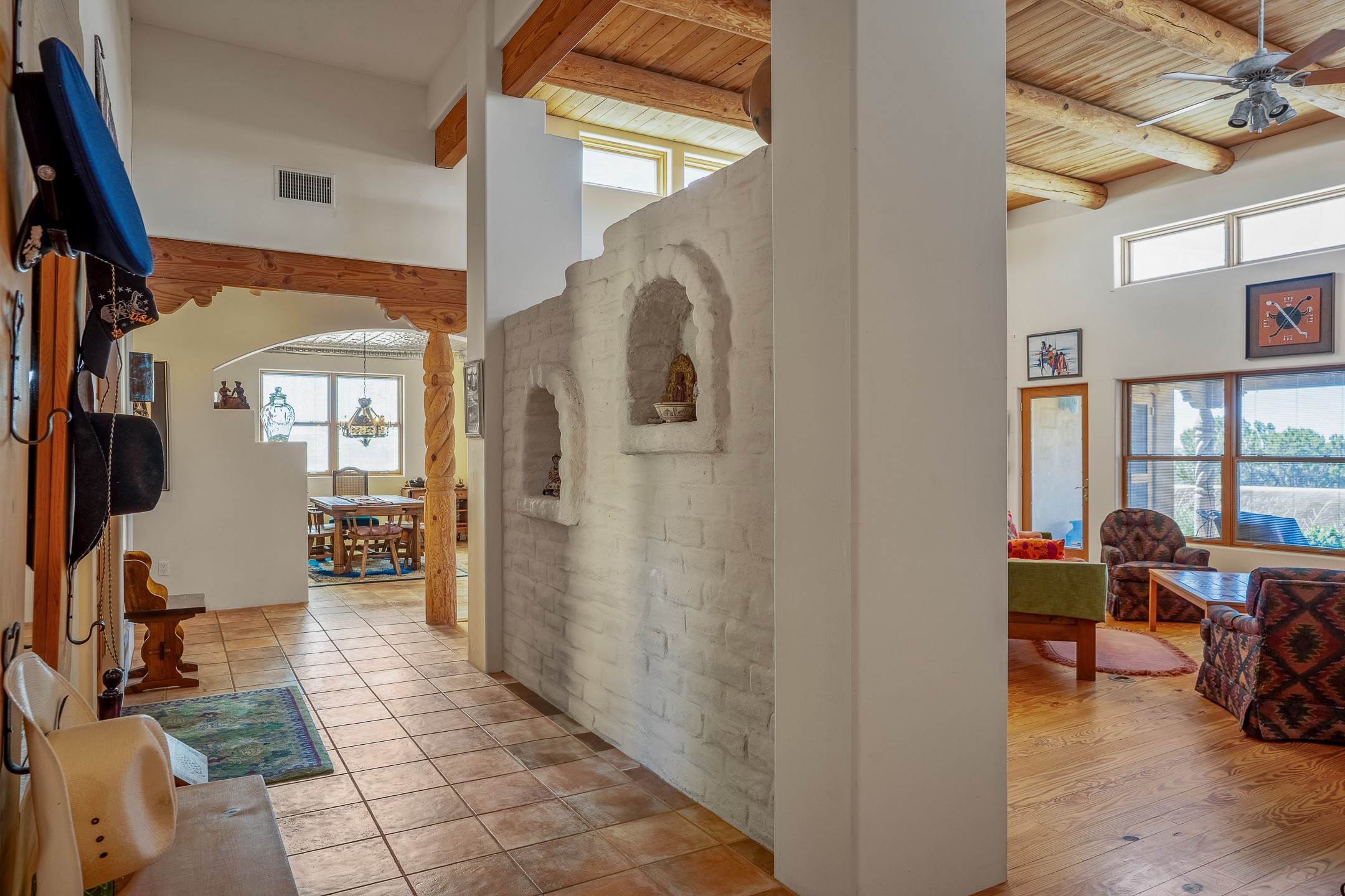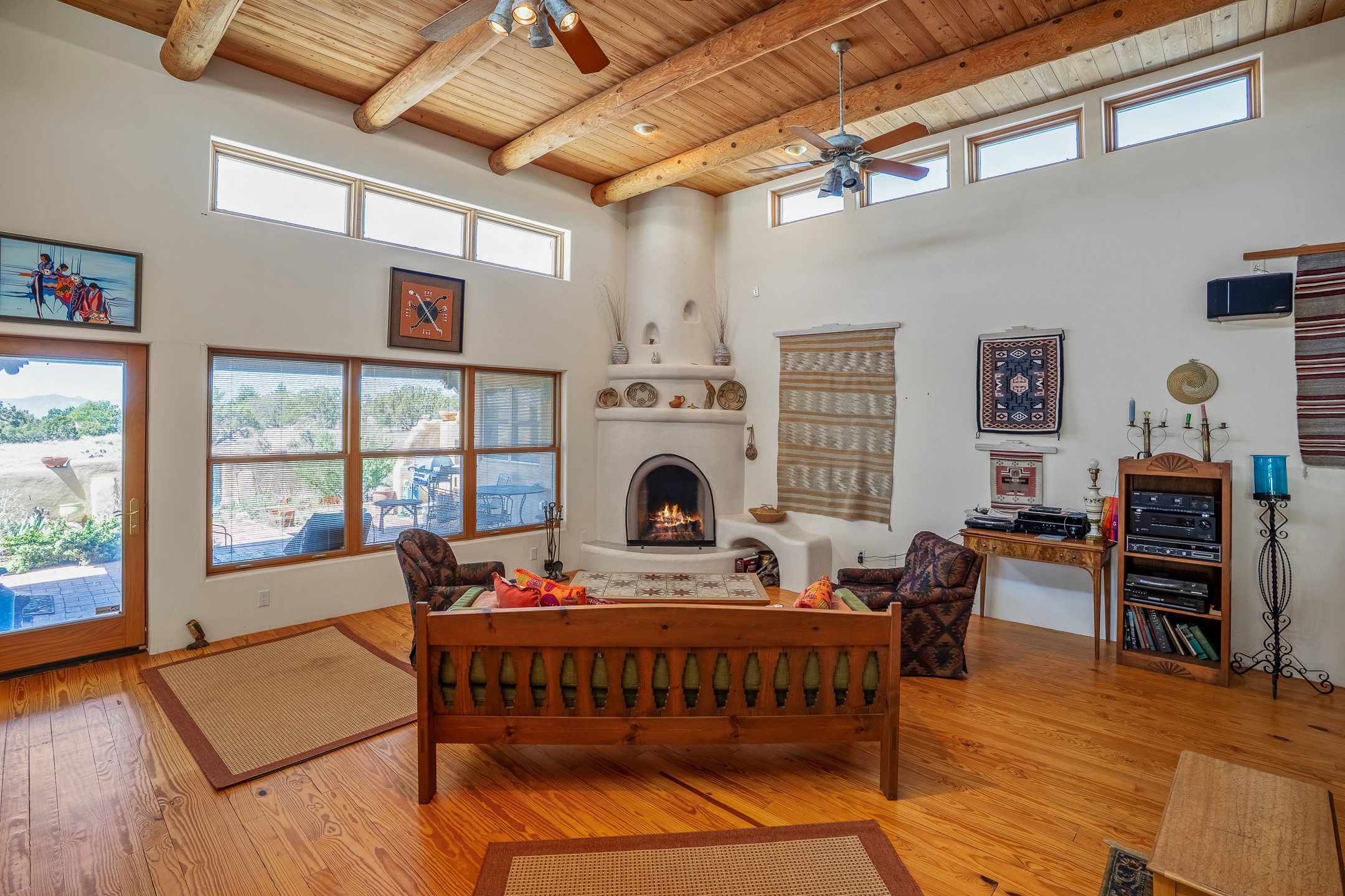 Experience unparalleled Southwestern living on five pristine acres in the exclusive Tierra de Casta area. This expansive estate offers over 4,000 square feet of meticulously designed living space, blending grand scale with the intimate warmth of traditional New Mexican architecture. Authentic Southwestern Design including High ceilings adorned with rustic vigas, tongue-and-groove accents, and hand-crafted finishes. The Primary Suite is a true retreat featuring a cozy Kiva fireplace, a spa-inspired ensuite with a jetted tub, and a custom walk-in shower. The Versatile Floor Plan Includes 2 add'l bedrooms with private ensuite baths, plus a large flexible den--ideal for a home office, library, or fourth bedroom. Well designed Kitchen with a central island and a dining room featuring an exquisite stamped tin ceiling. A bright sunroom opens to a rear portal, perfect for taking in the legendary New Mexico sunsets and western views. Situated on a lush 5-acre lot, this property provides the privacy and serenity of rural living yet near to all Eldorado Amenities and only a short drive to Santa Fe's historic Plaza. Whether you are entertaining in the grand great room or enjoying the quiet beauty of the high desert, this home is a masterpiece of comfort and quality.