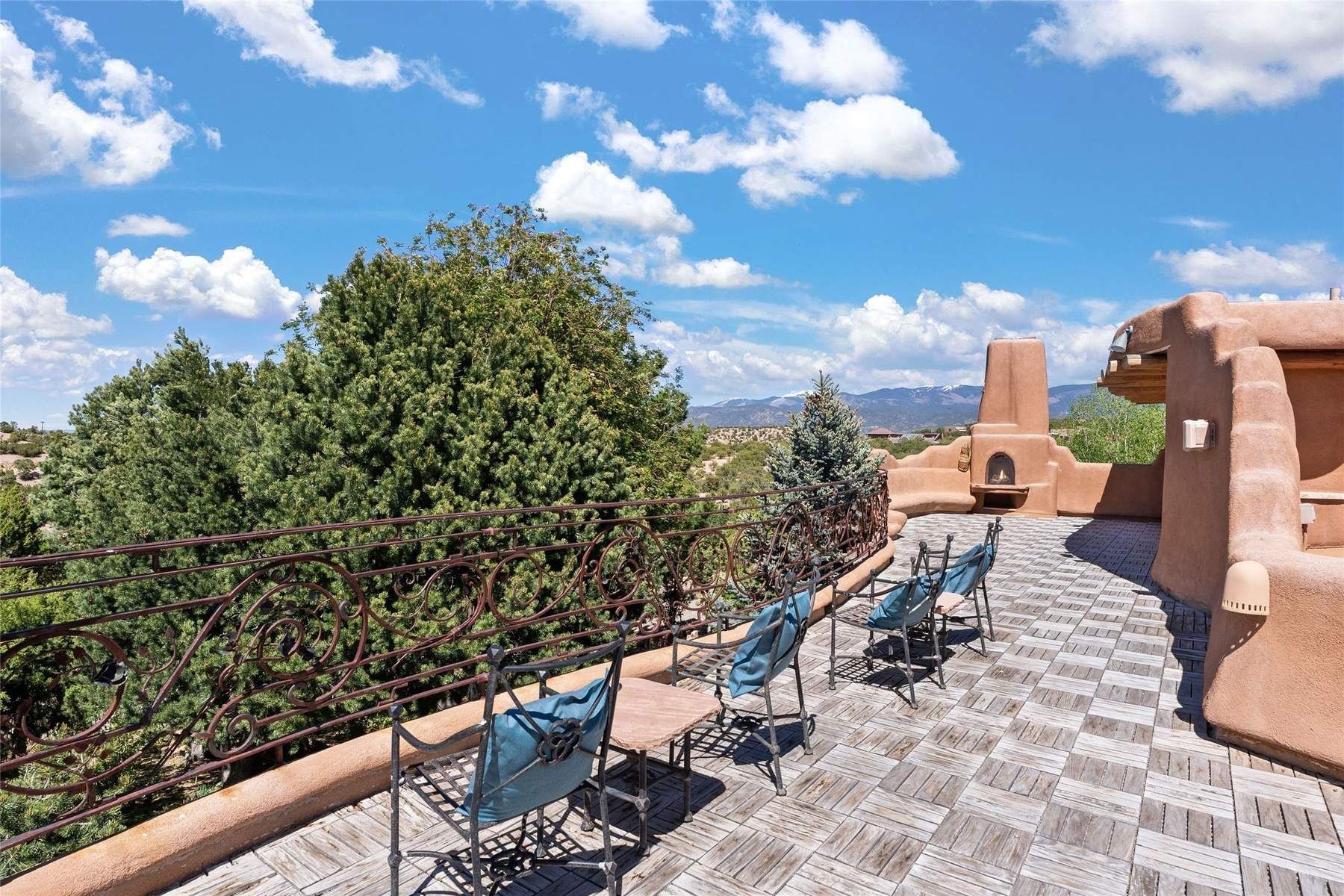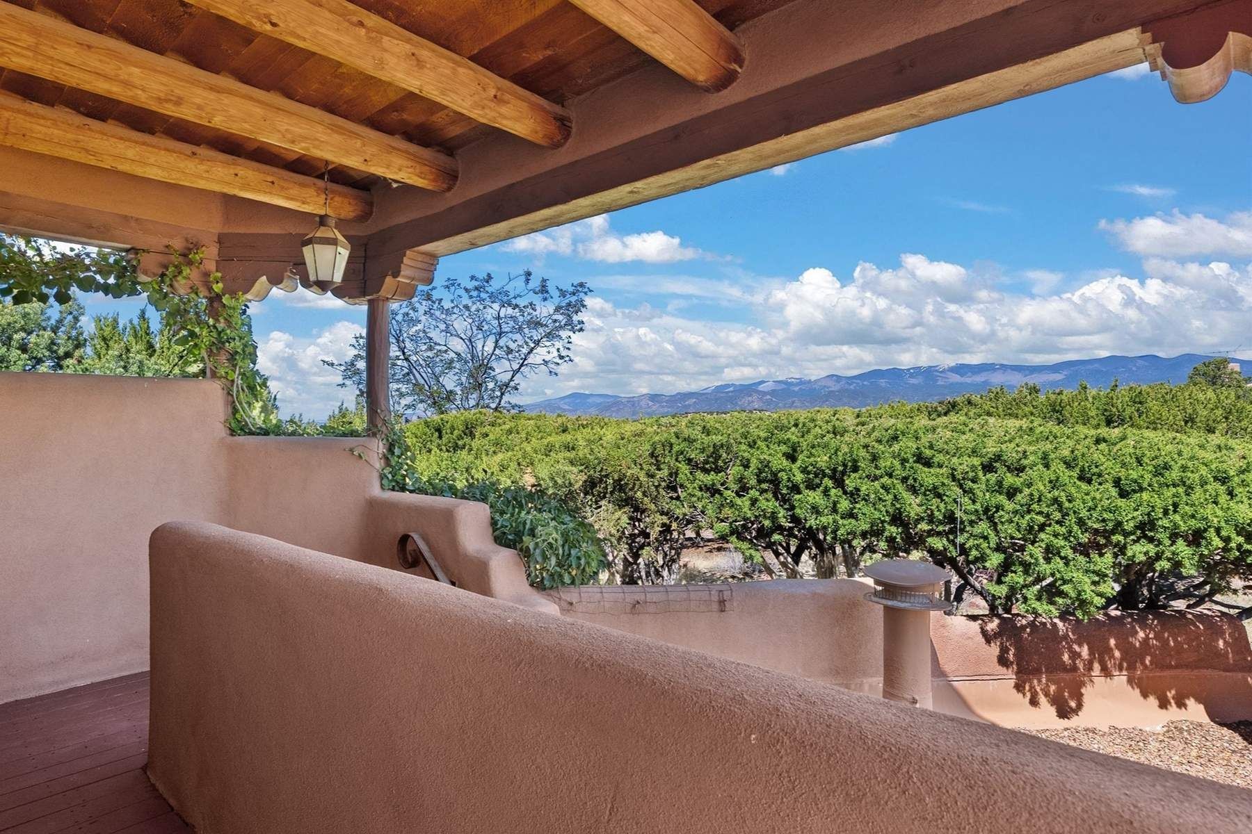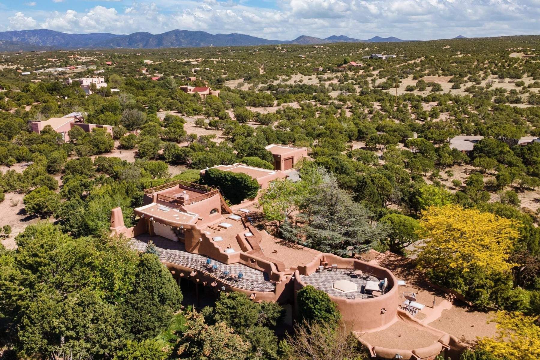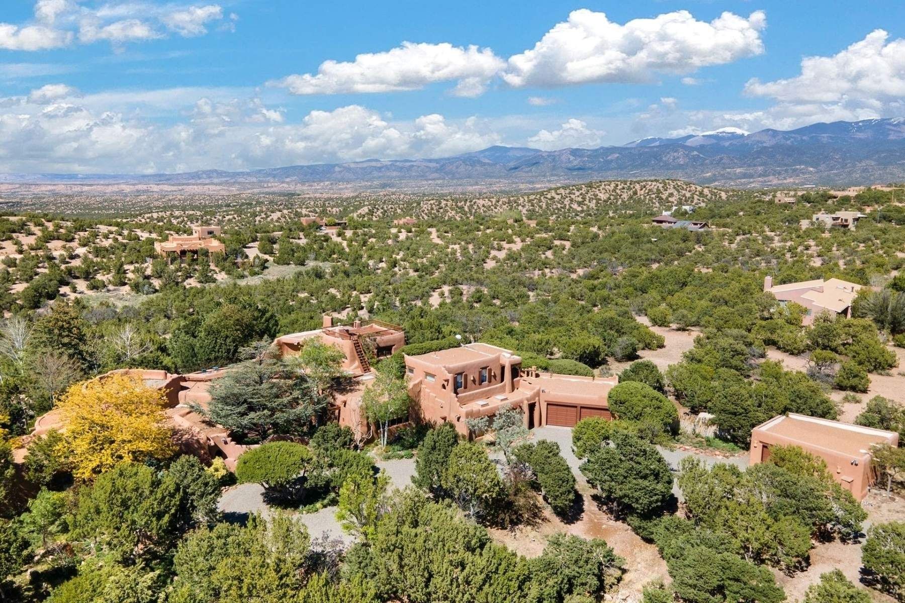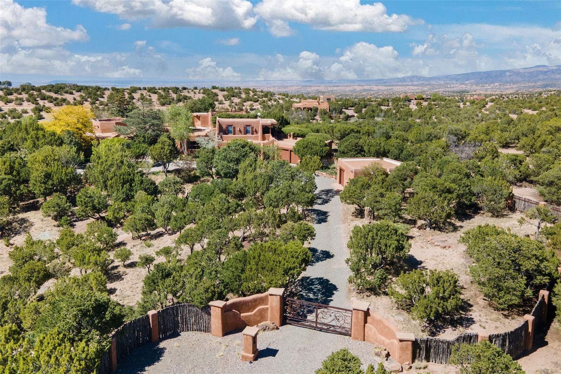 ADOBE ROSE *** Privately situated, this Santa Fe-style estate offers expansive views, layered outdoor spaces and authentic architectural detail throughout. A landscaped courtyard leads into interiors with curved adobe walls, Saltillo tile floors, carved doors and multiple kiva fireplaces.The circular living room with tiered beamed ceiling opens to a west-facing portal and the dining room connects directly to the courtyard. The kitchen flows to a covered portal with built-in grill, cabinetry, dual sinks and seating for entertaining.Upstairs, a bright office with built-ins and powder room opens to a rooftop deck with mountain views, kiva fireplace and additional seating areas. The primary suite includes a fireplace sitting area, private garden with heated wading pool and outdoor shower and a bath with soaking tub and steam shower.Two additional bedrooms, flexible bonus spaces and a separate casita with kitchen and bath provide comfortable accommodations. The grounds feature winding paths, gardens, koi pond and multiple patios. Two-car garage plus detached third garage with studio/workspace.