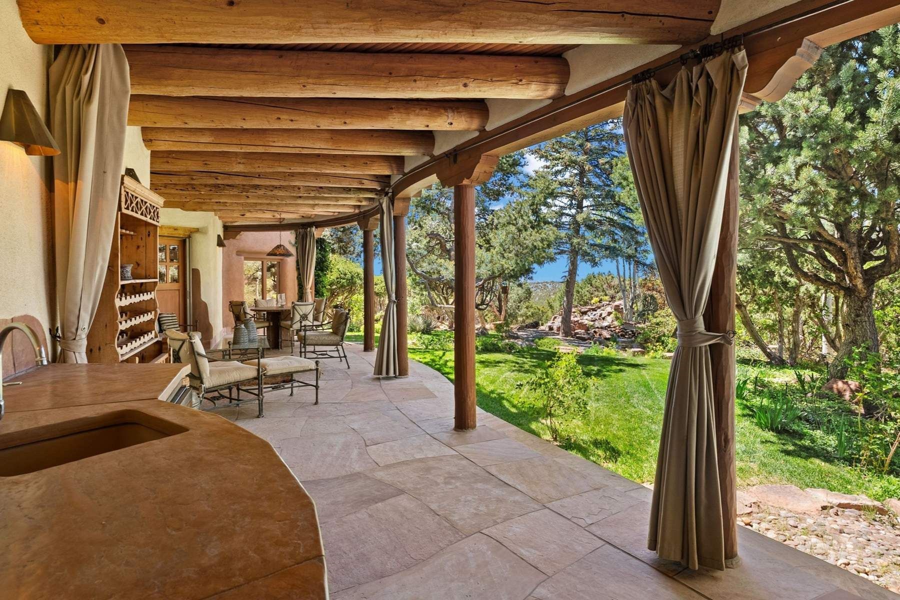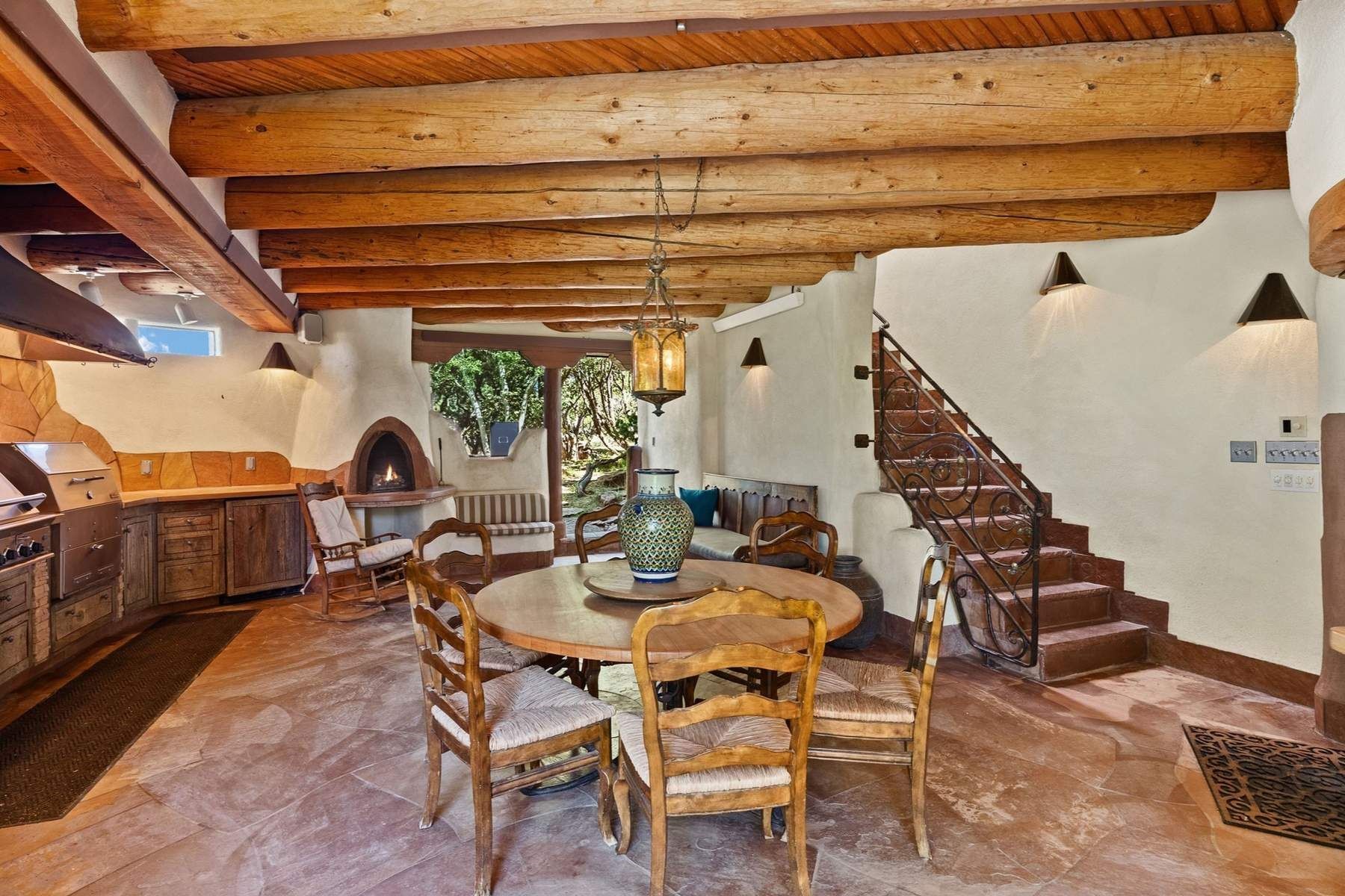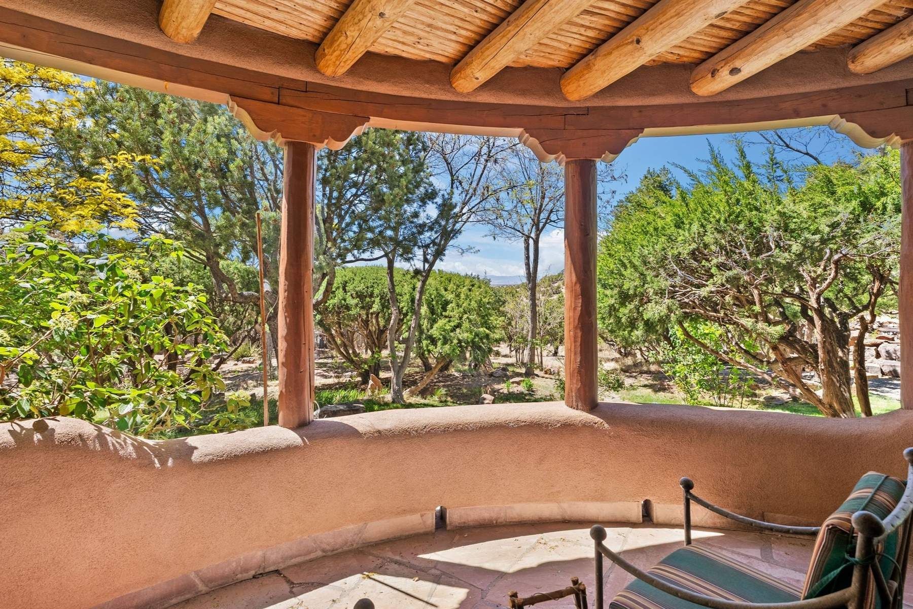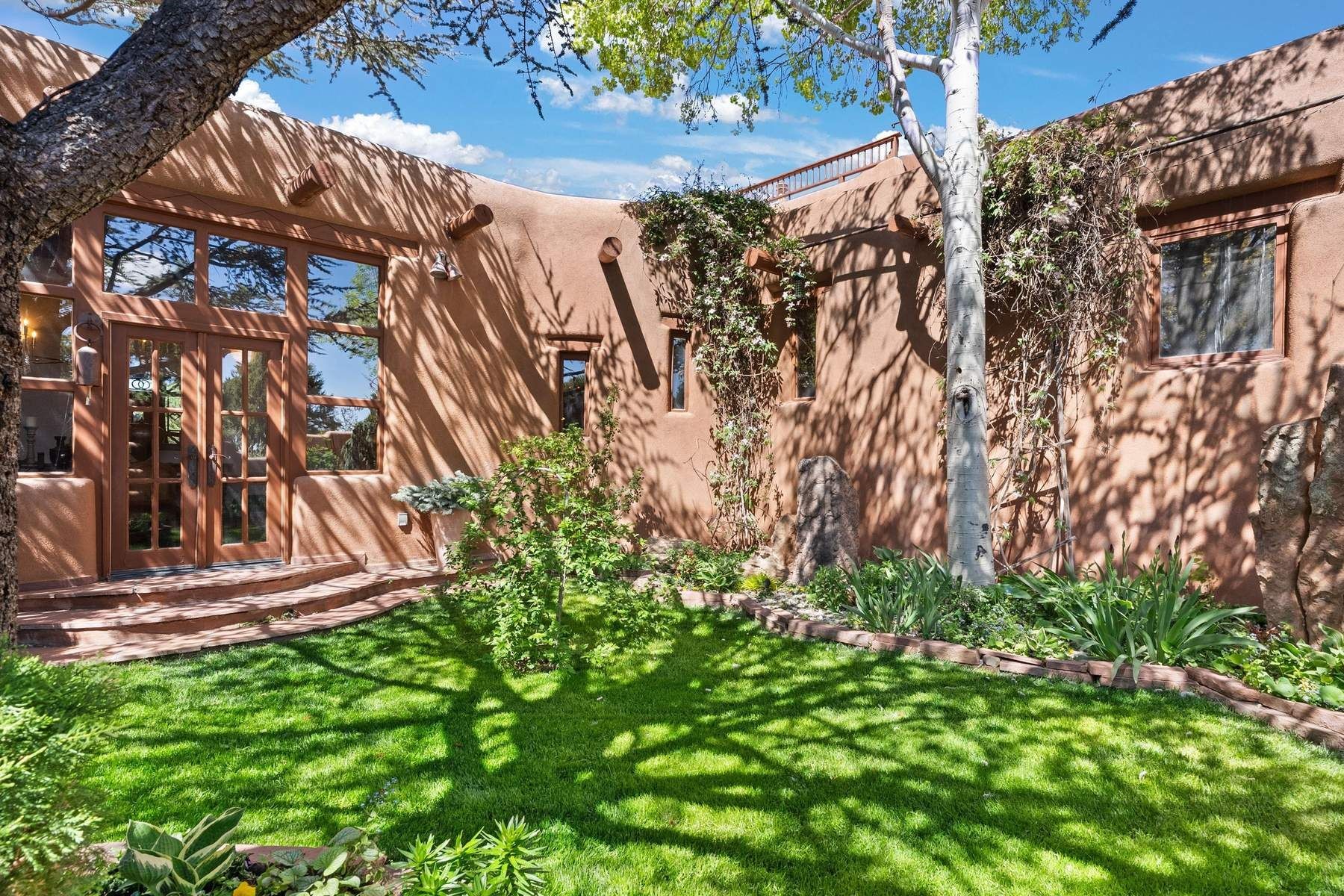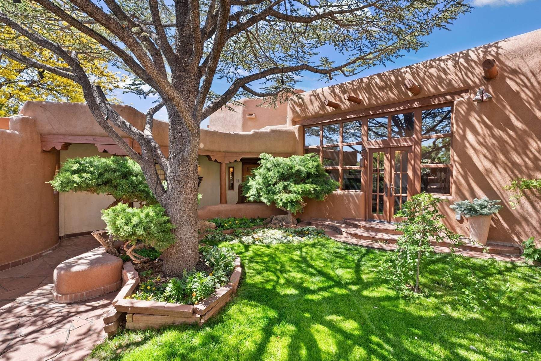 ADOBE ROSE *** Privately situated, this Santa Fe-style estate offers expansive views, layered outdoor spaces and authentic architectural detail throughout. A landscaped courtyard leads into interiors with curved adobe walls, Saltillo tile floors, carved doors and multiple kiva fireplaces.The circular living room with tiered beamed ceiling opens to a west-facing portal and the dining room connects directly to the courtyard. The kitchen flows to a covered portal with built-in grill, cabinetry, dual sinks and seating for entertaining.Upstairs, a bright office with built-ins and powder room opens to a rooftop deck with mountain views, kiva fireplace and additional seating areas. The primary suite includes a fireplace sitting area, private garden with heated wading pool and outdoor shower and a bath with soaking tub and steam shower.Two additional bedrooms, flexible bonus spaces and a separate casita with kitchen and bath provide comfortable accommodations. The grounds feature winding paths, gardens, koi pond and multiple patios. Two-car garage plus detached third garage with studio/workspace.