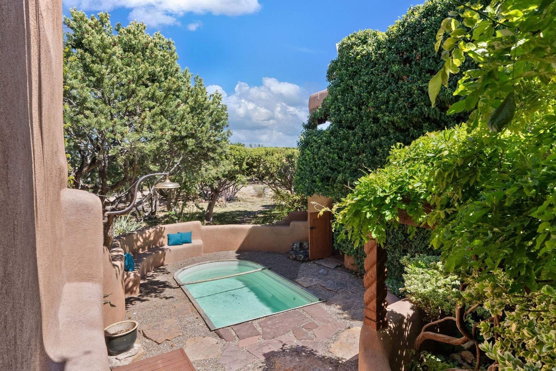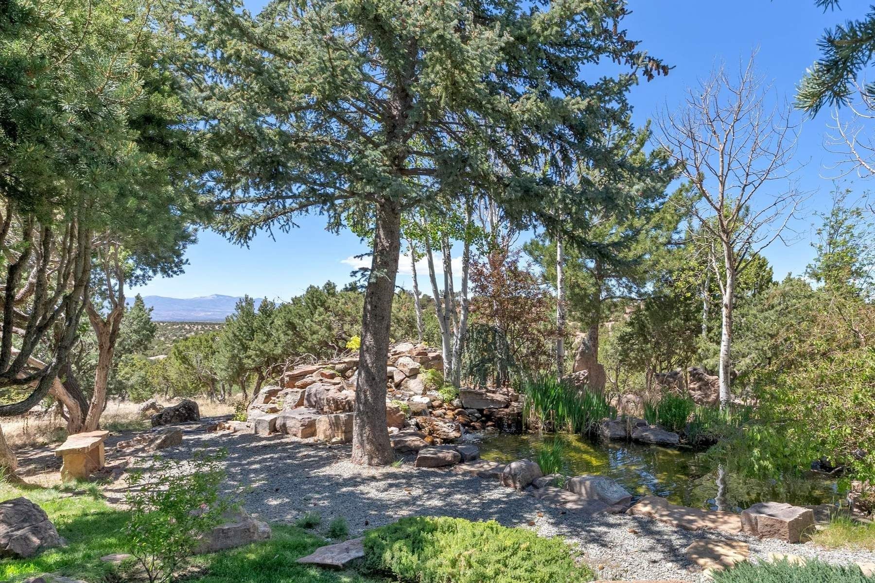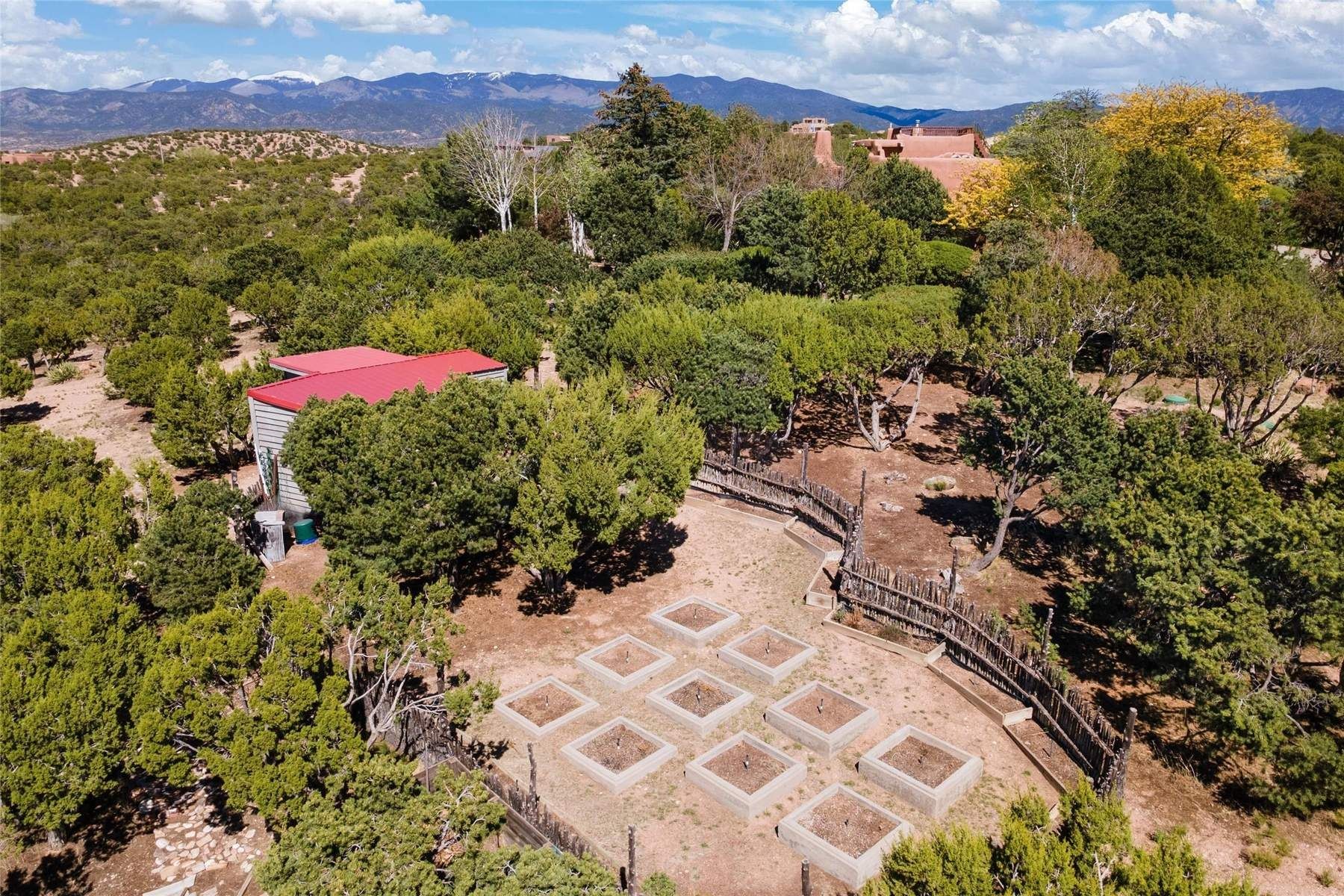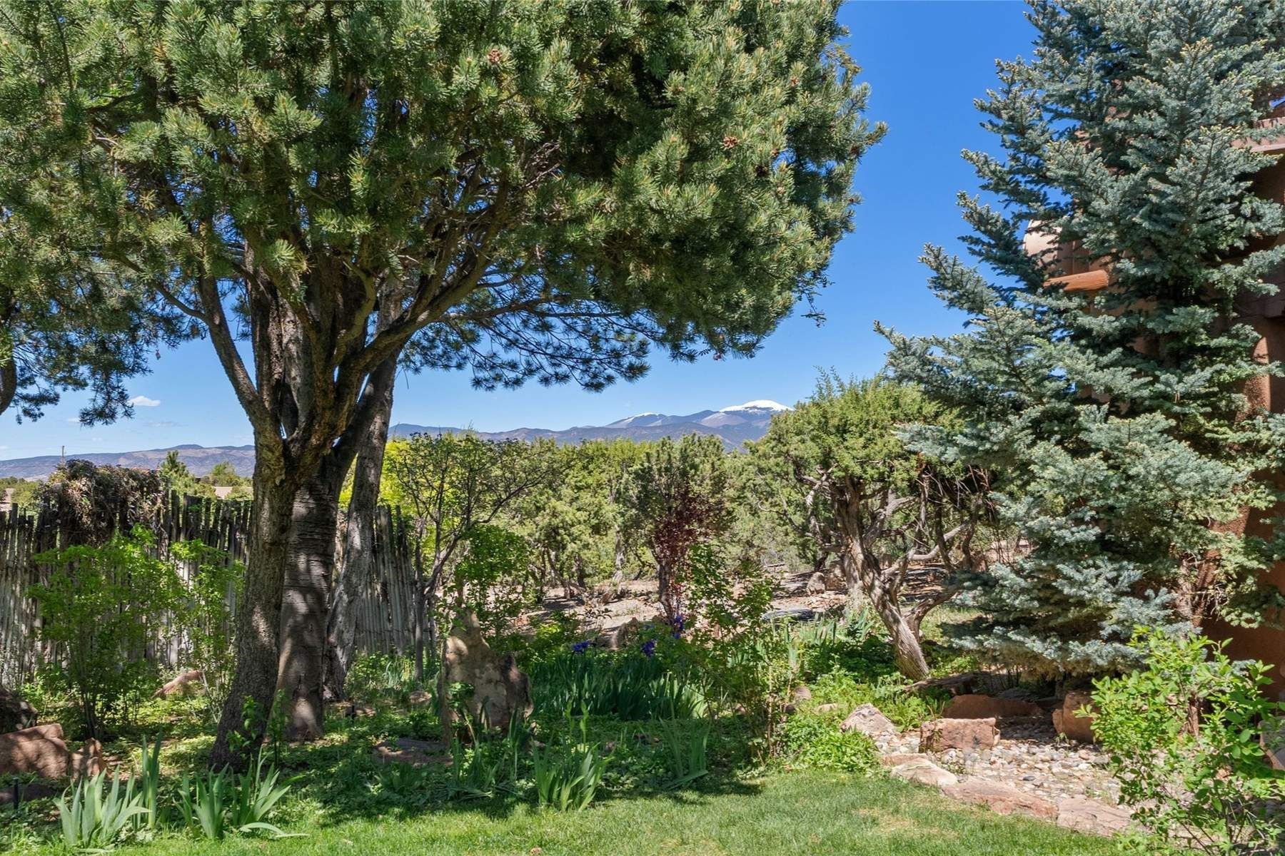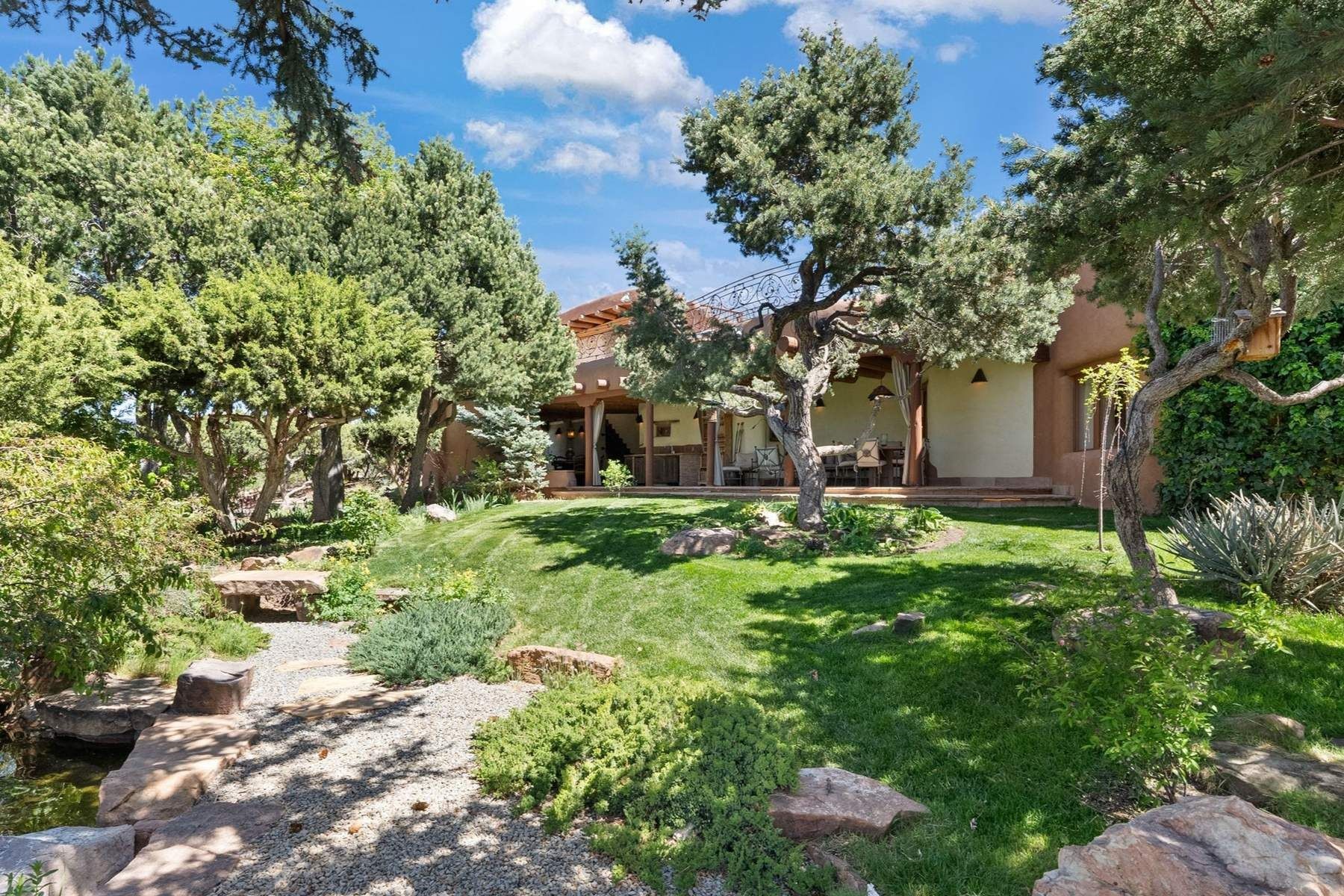 ADOBE ROSE *** Privately situated, this Santa Fe-style estate offers expansive views, layered outdoor spaces and authentic architectural detail throughout. A landscaped courtyard leads into interiors with curved adobe walls, Saltillo tile floors, carved doors and multiple kiva fireplaces.The circular living room with tiered beamed ceiling opens to a west-facing portal and the dining room connects directly to the courtyard. The kitchen flows to a covered portal with built-in grill, cabinetry, dual sinks and seating for entertaining.Upstairs, a bright office with built-ins and powder room opens to a rooftop deck with mountain views, kiva fireplace and additional seating areas. The primary suite includes a fireplace sitting area, private garden with heated wading pool and outdoor shower and a bath with soaking tub and steam shower.Two additional bedrooms, flexible bonus spaces and a separate casita with kitchen and bath provide comfortable accommodations. The grounds feature winding paths, gardens, koi pond and multiple patios. Two-car garage plus detached third garage with studio/workspace.