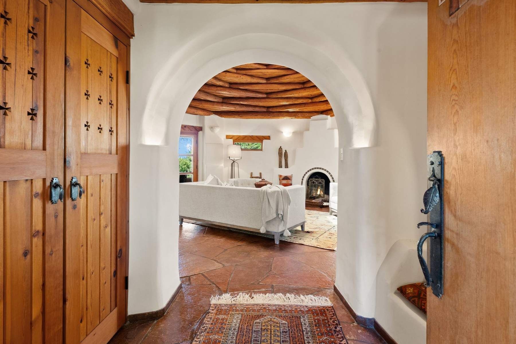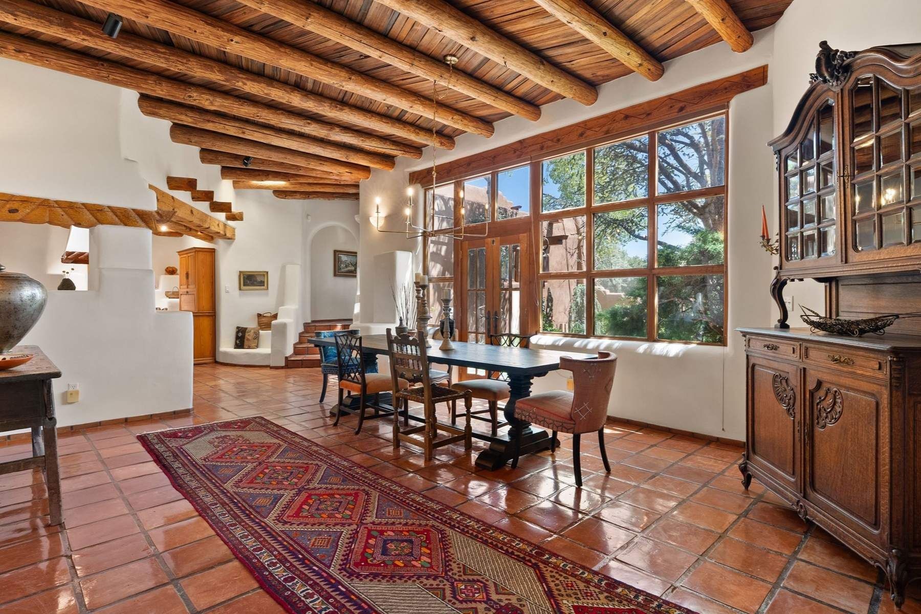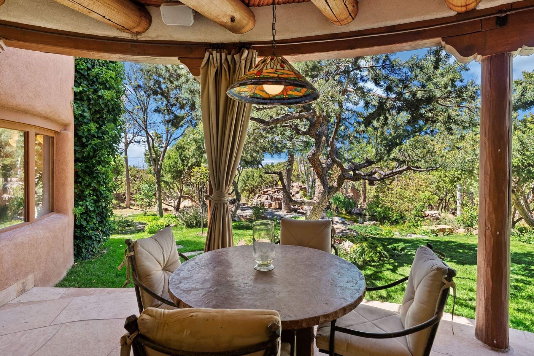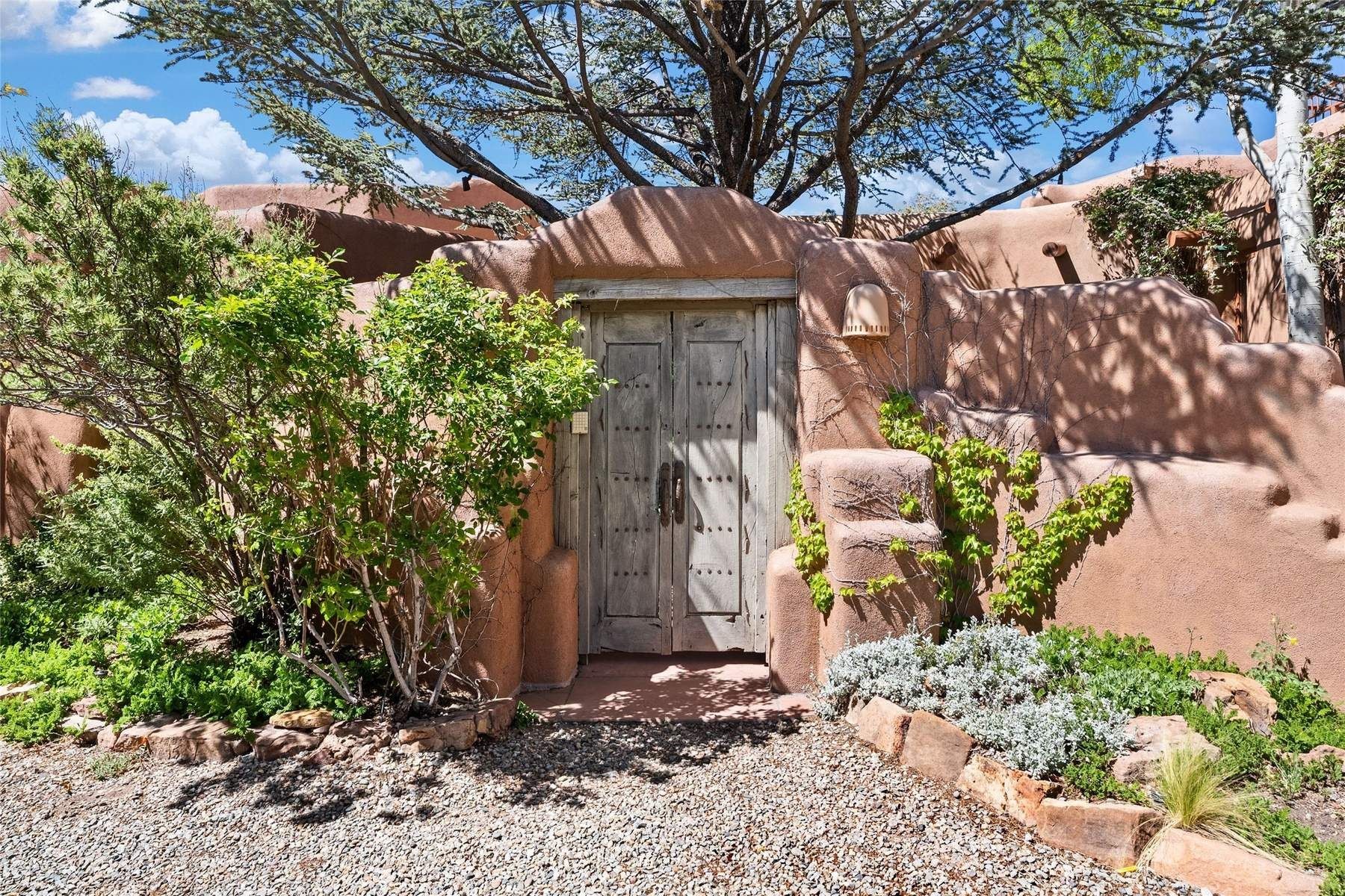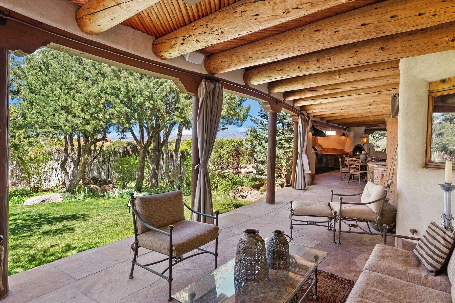 ADOBE ROSE *** Privately situated, this Santa Fe-style estate offers expansive views, layered outdoor spaces and authentic architectural detail throughout. A landscaped courtyard leads into interiors with curved adobe walls, Saltillo tile floors, carved doors and multiple kiva fireplaces.The circular living room with tiered beamed ceiling opens to a west-facing portal and the dining room connects directly to the courtyard. The kitchen flows to a covered portal with built-in grill, cabinetry, dual sinks and seating for entertaining.Upstairs, a bright office with built-ins and powder room opens to a rooftop deck with mountain views, kiva fireplace and additional seating areas. The primary suite includes a fireplace sitting area, private garden with heated wading pool and outdoor shower and a bath with soaking tub and steam shower.Two additional bedrooms, flexible bonus spaces and a separate casita with kitchen and bath provide comfortable accommodations. The grounds feature winding paths, gardens, koi pond and multiple patios. Two-car garage plus detached third garage with studio/workspace.