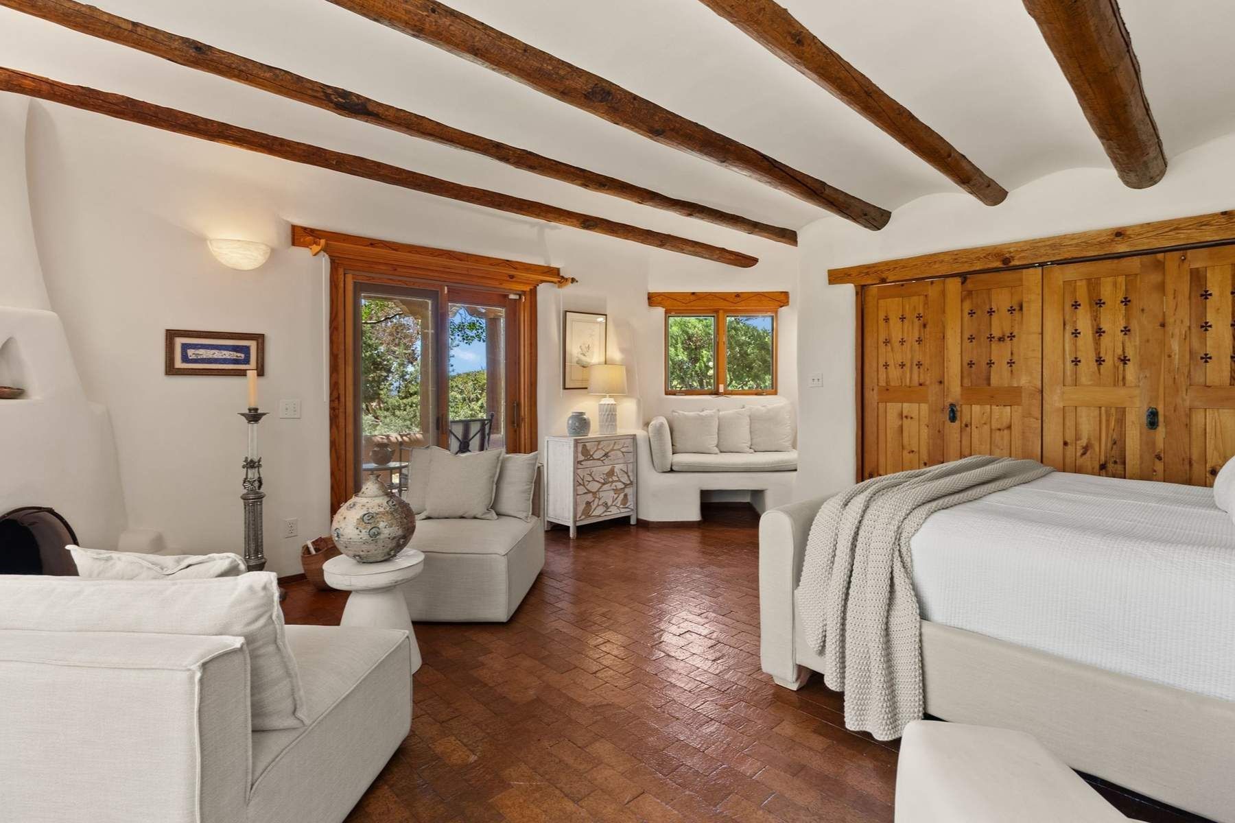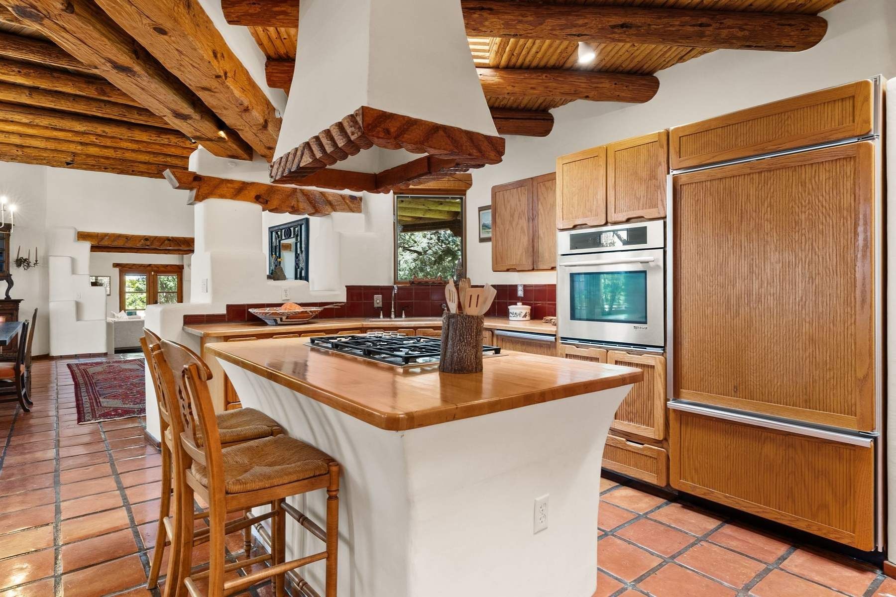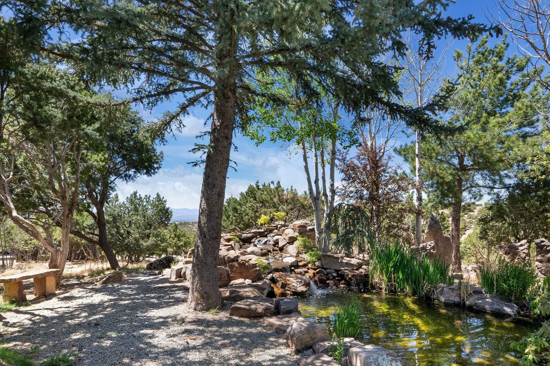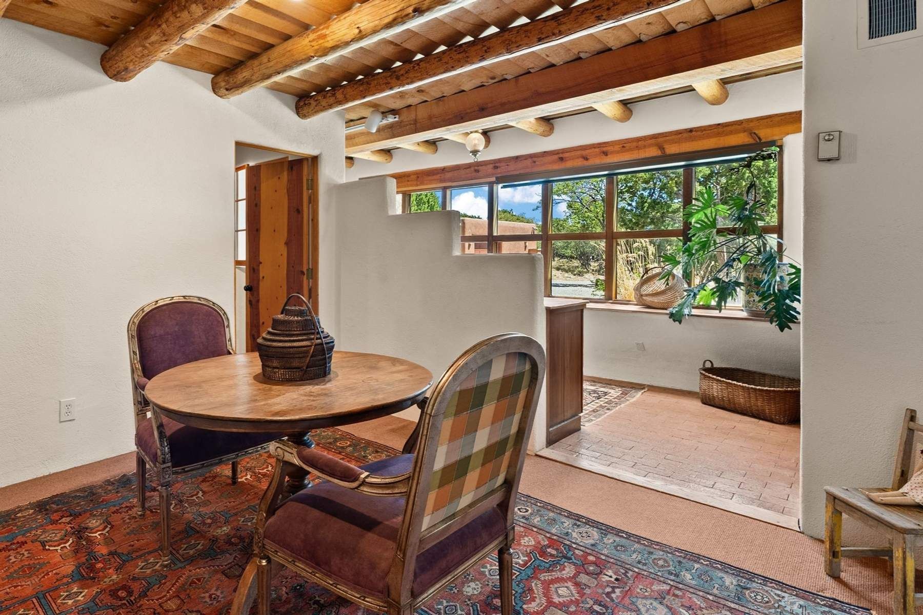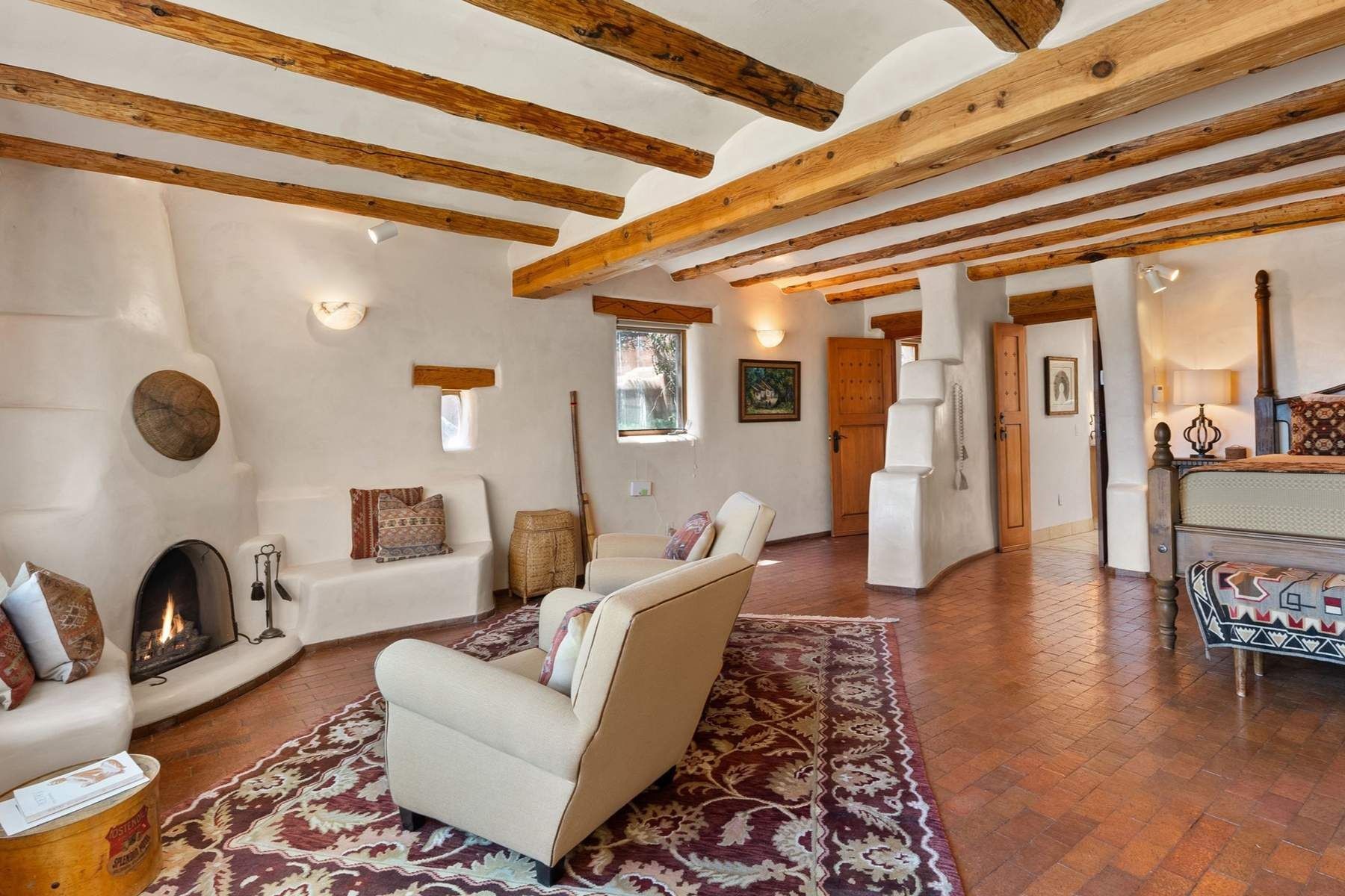 ADOBE ROSE *** Privately situated, this Santa Fe-style estate offers expansive views, layered outdoor spaces and authentic architectural detail throughout. A landscaped courtyard leads into interiors with curved adobe walls, Saltillo tile floors, carved doors and multiple kiva fireplaces.The circular living room with tiered beamed ceiling opens to a west-facing portal and the dining room connects directly to the courtyard. The kitchen flows to a covered portal with built-in grill, cabinetry, dual sinks and seating for entertaining.Upstairs, a bright office with built-ins and powder room opens to a rooftop deck with mountain views, kiva fireplace and additional seating areas. The primary suite includes a fireplace sitting area, private garden with heated wading pool and outdoor shower and a bath with soaking tub and steam shower.Two additional bedrooms, flexible bonus spaces and a separate casita with kitchen and bath provide comfortable accommodations. The grounds feature winding paths, gardens, koi pond and multiple patios. Two-car garage plus detached third garage with studio/workspace.