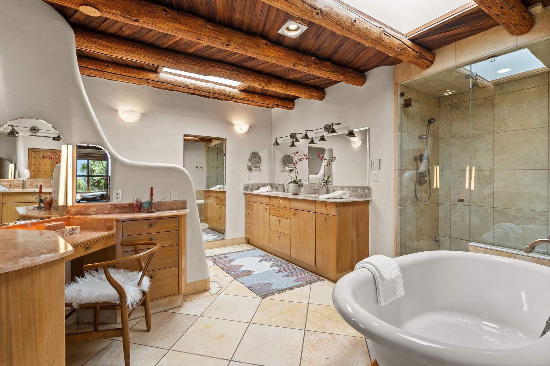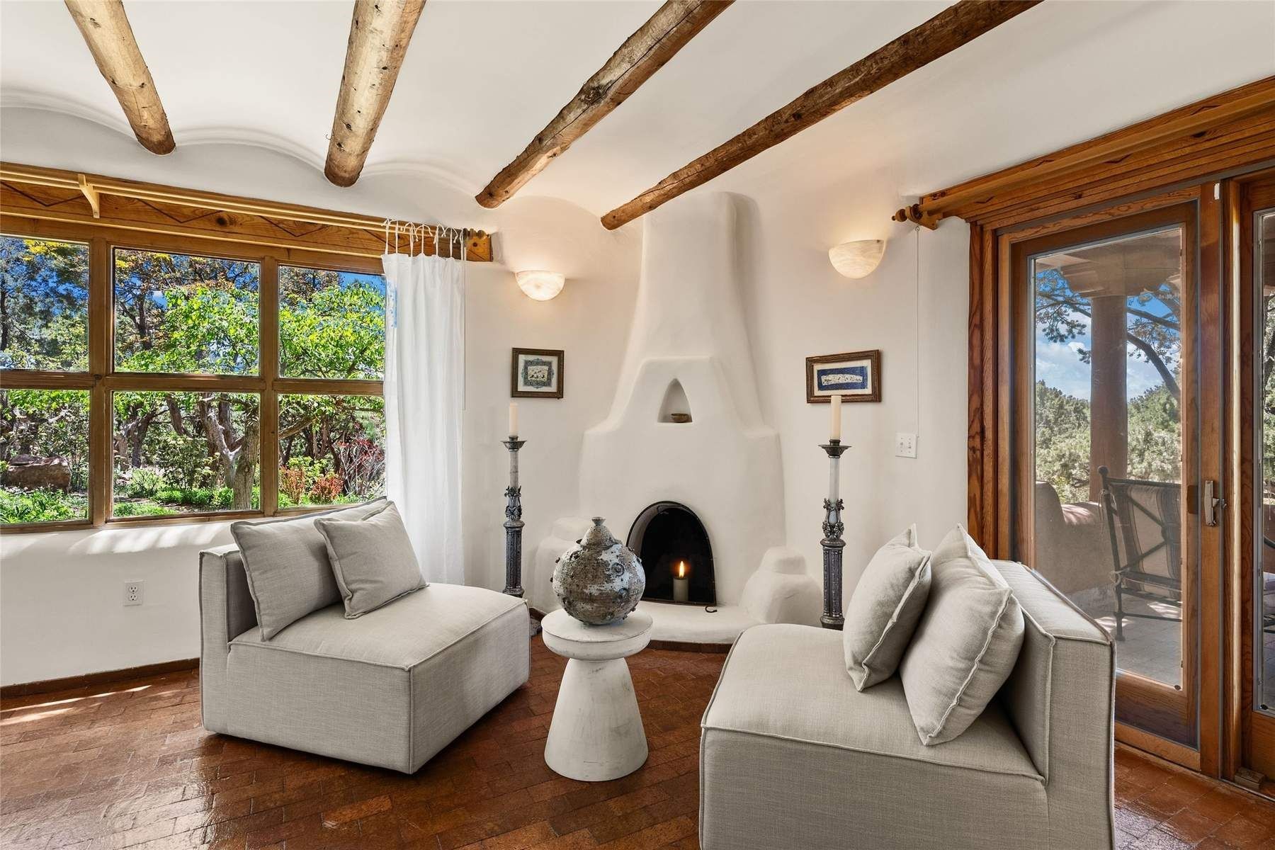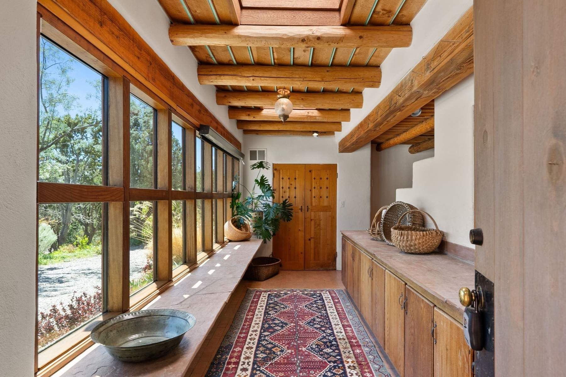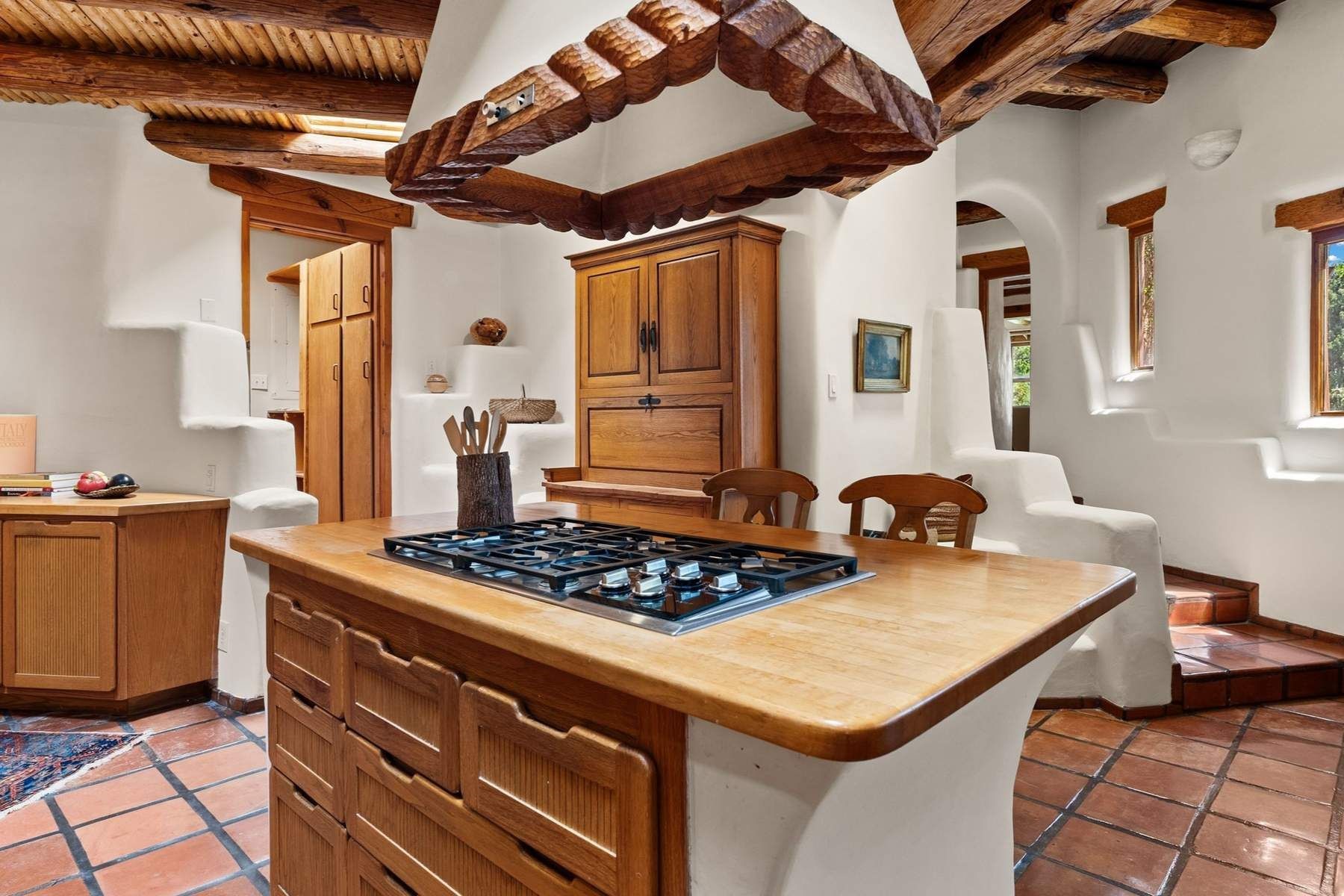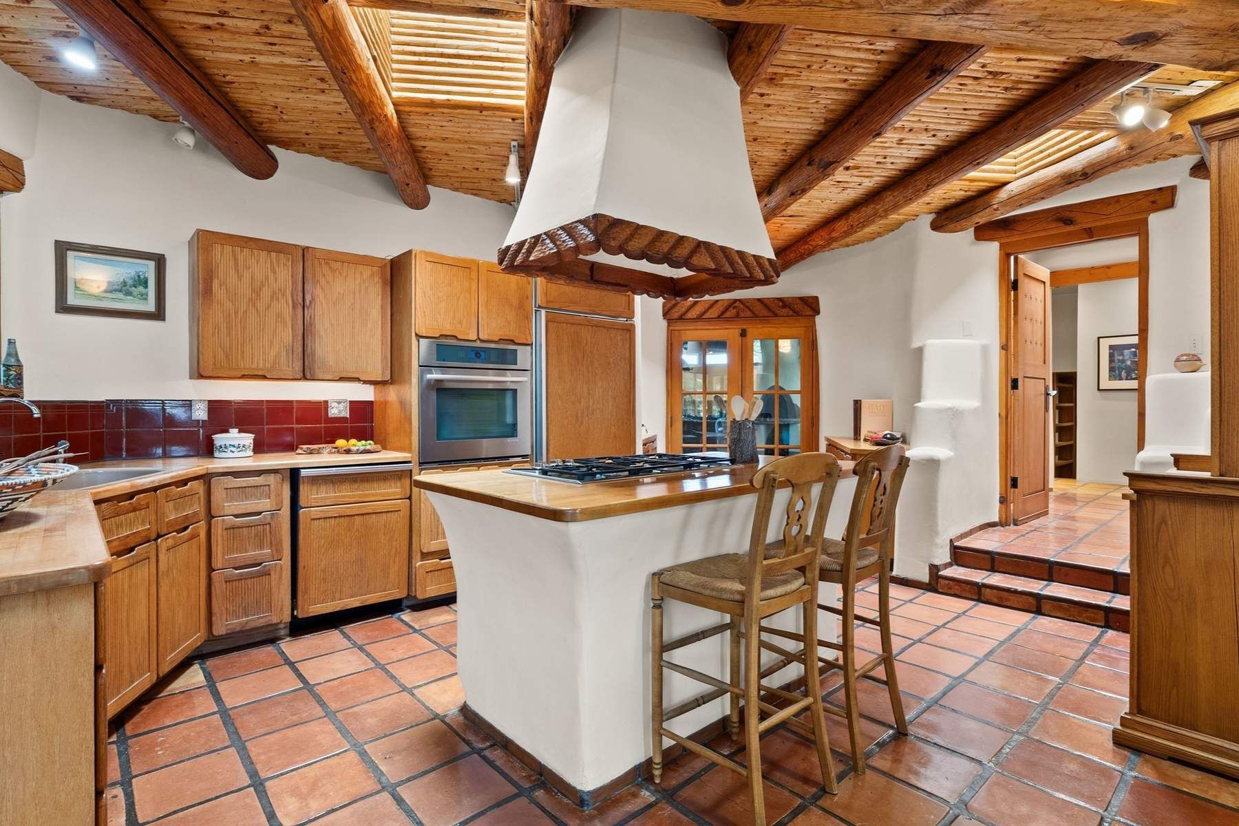 ADOBE ROSE *** Privately situated, this Santa Fe-style estate offers expansive views, layered outdoor spaces and authentic architectural detail throughout. A landscaped courtyard leads into interiors with curved adobe walls, Saltillo tile floors, carved doors and multiple kiva fireplaces.The circular living room with tiered beamed ceiling opens to a west-facing portal and the dining room connects directly to the courtyard. The kitchen flows to a covered portal with built-in grill, cabinetry, dual sinks and seating for entertaining.Upstairs, a bright office with built-ins and powder room opens to a rooftop deck with mountain views, kiva fireplace and additional seating areas. The primary suite includes a fireplace sitting area, private garden with heated wading pool and outdoor shower and a bath with soaking tub and steam shower.Two additional bedrooms, flexible bonus spaces and a separate casita with kitchen and bath provide comfortable accommodations. The grounds feature winding paths, gardens, koi pond and multiple patios. Two-car garage plus detached third garage with studio/workspace.